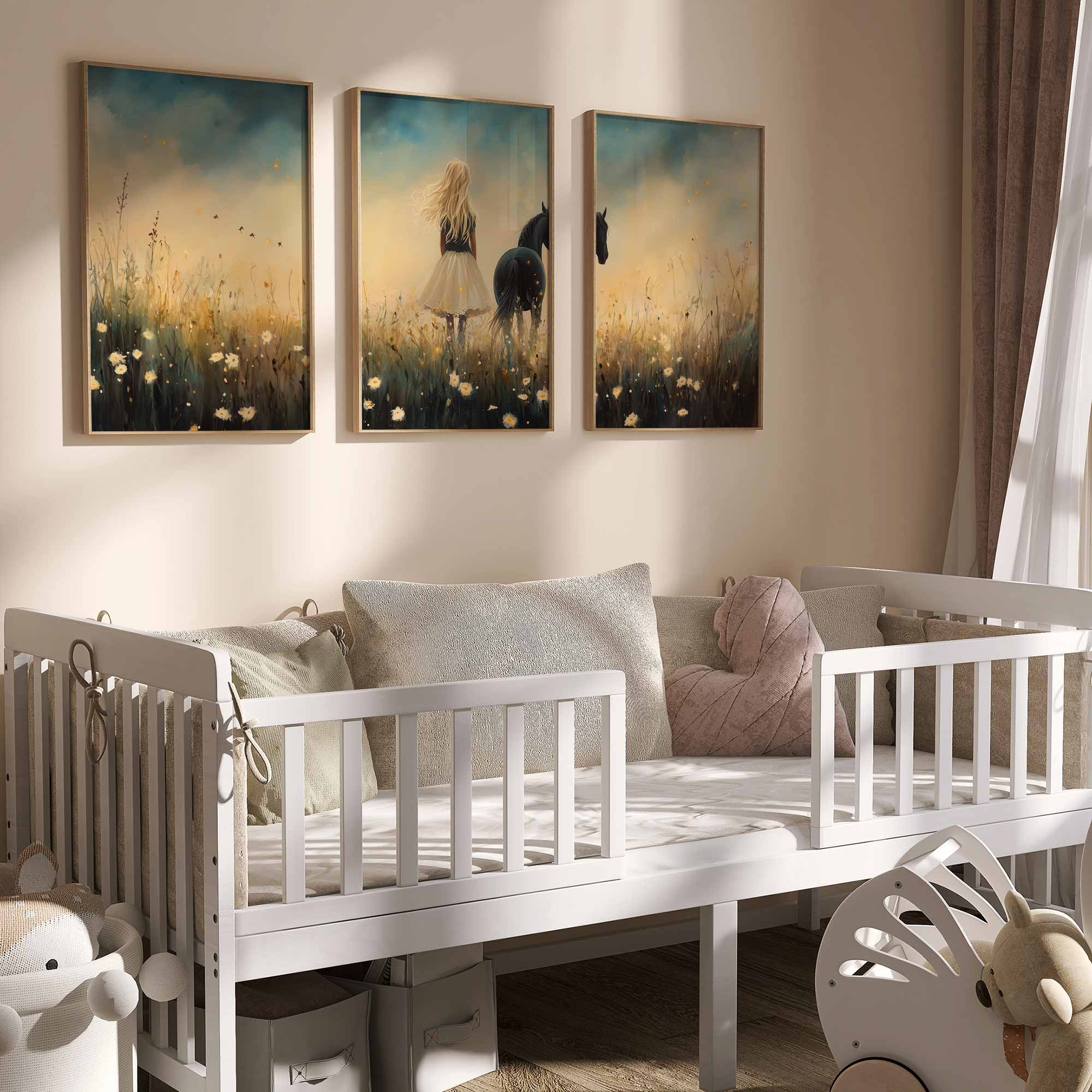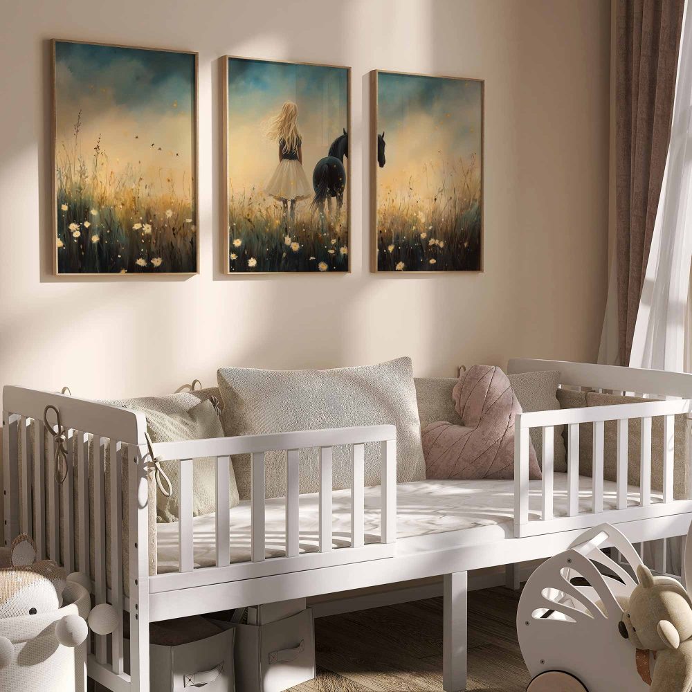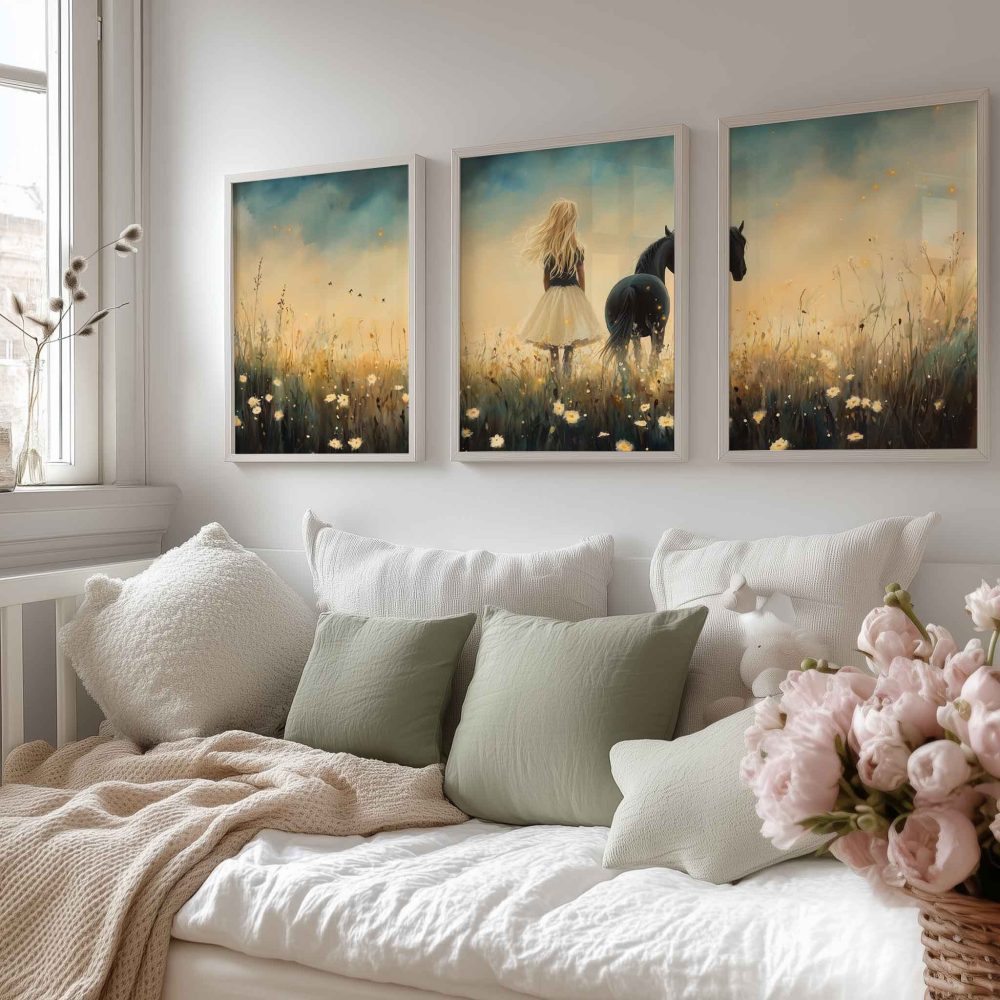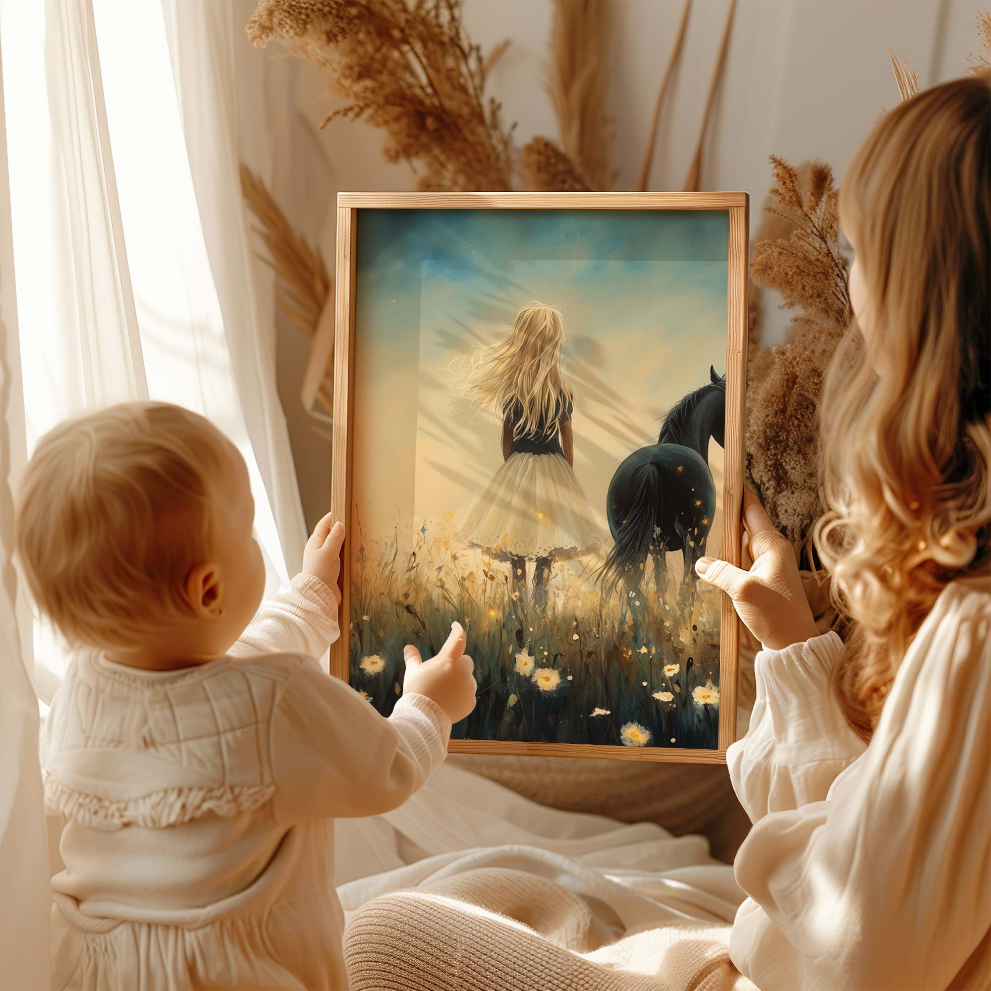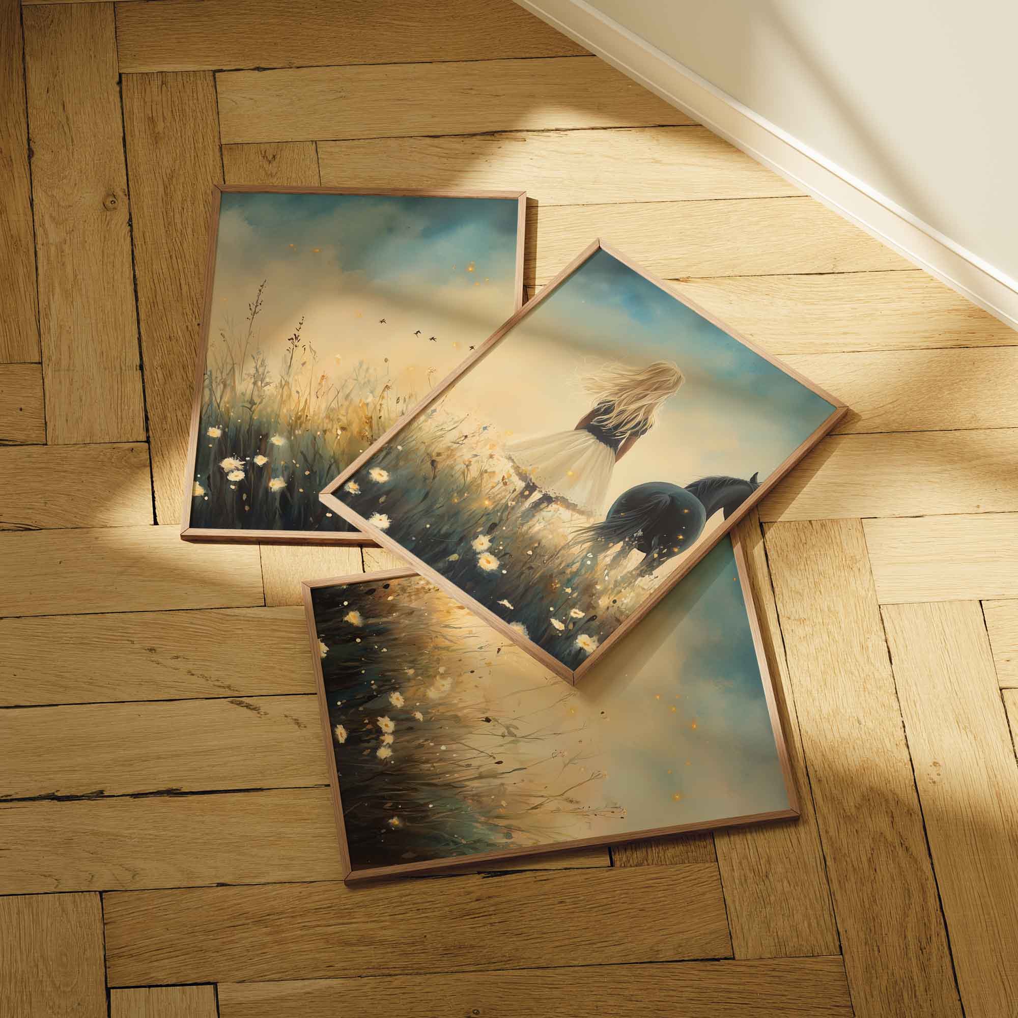 Terug naar collectie / Kinderkamer posters / Bloemen posters / Blonde Droom in Bloemenveld met Zwart Paard