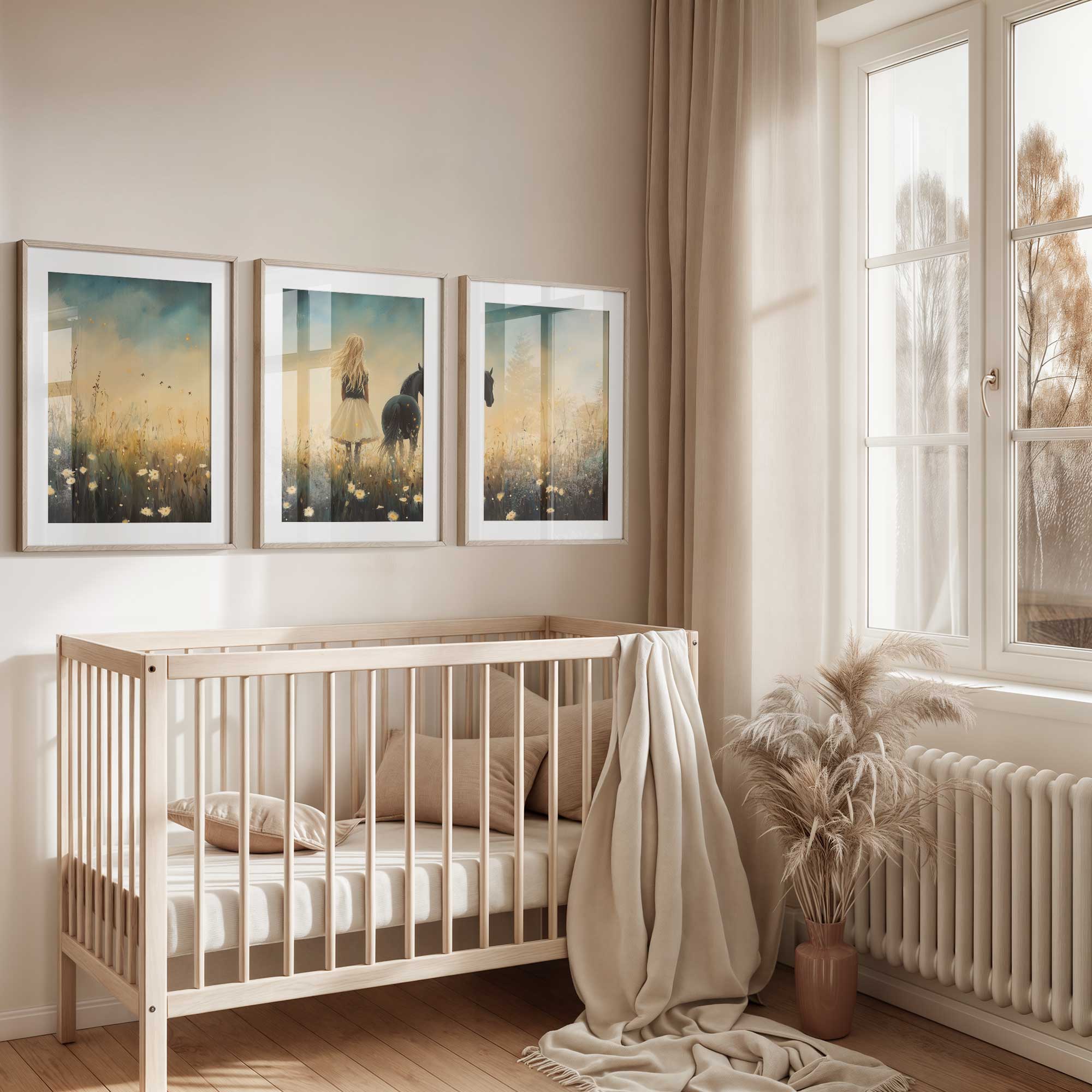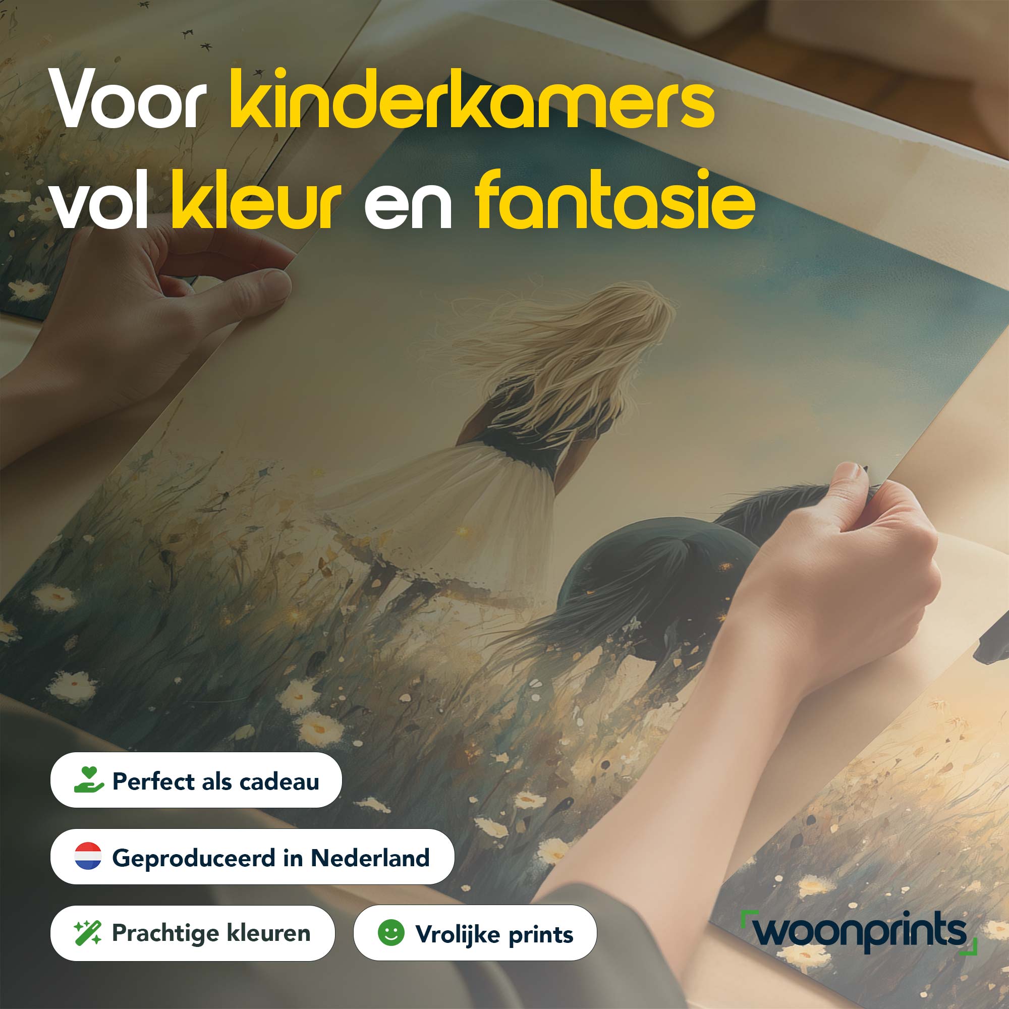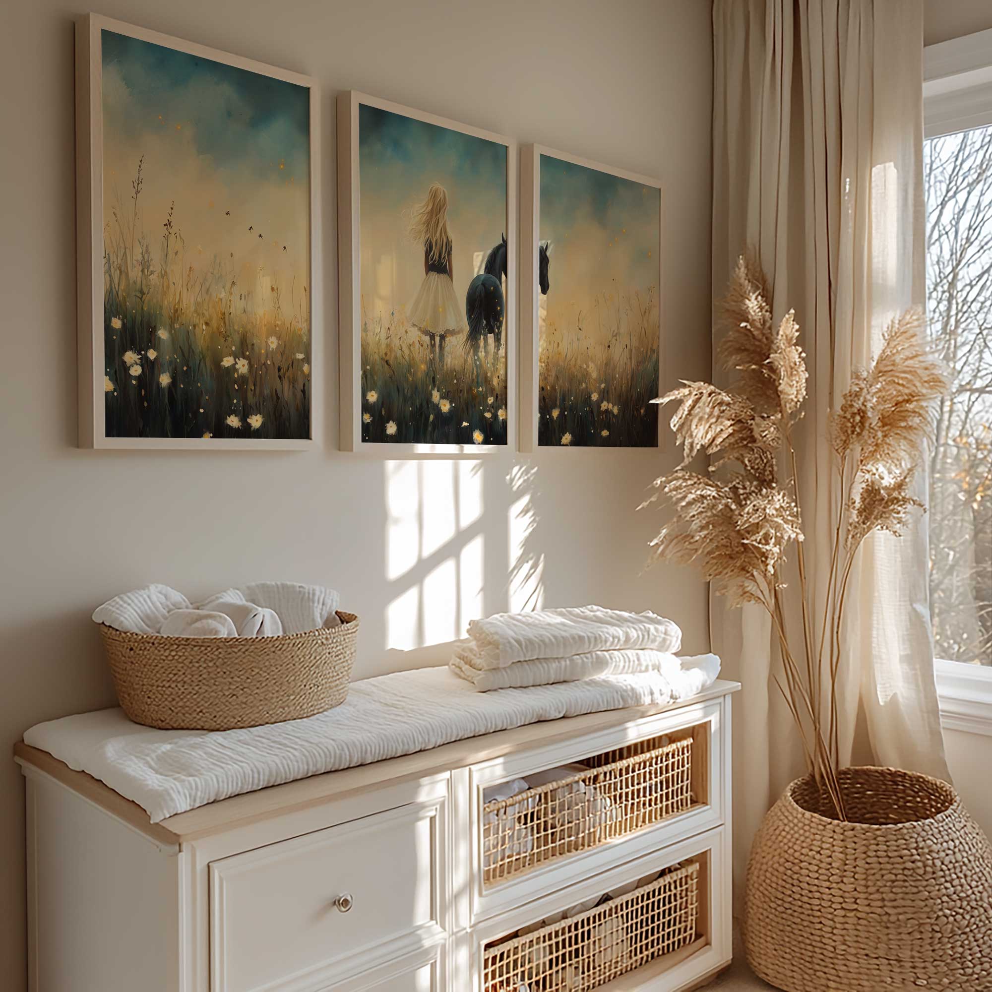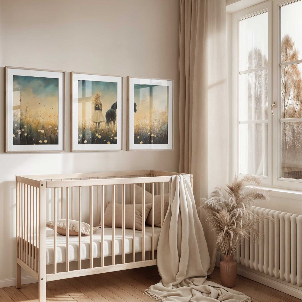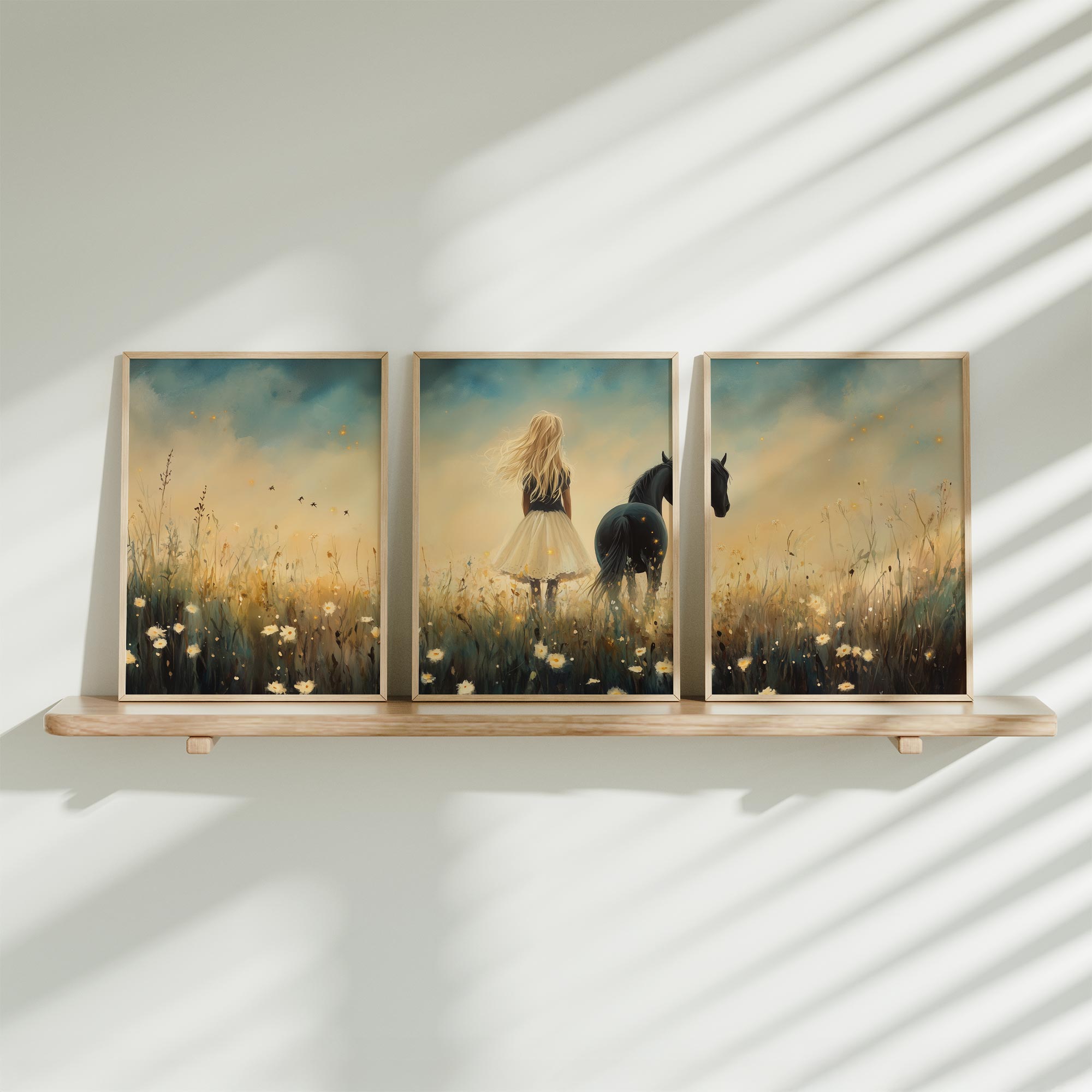Terug naar collectie / Kinderkamer posters / Bloemen posters / Blonde Droom in Bloemenveld met Zwart Paard