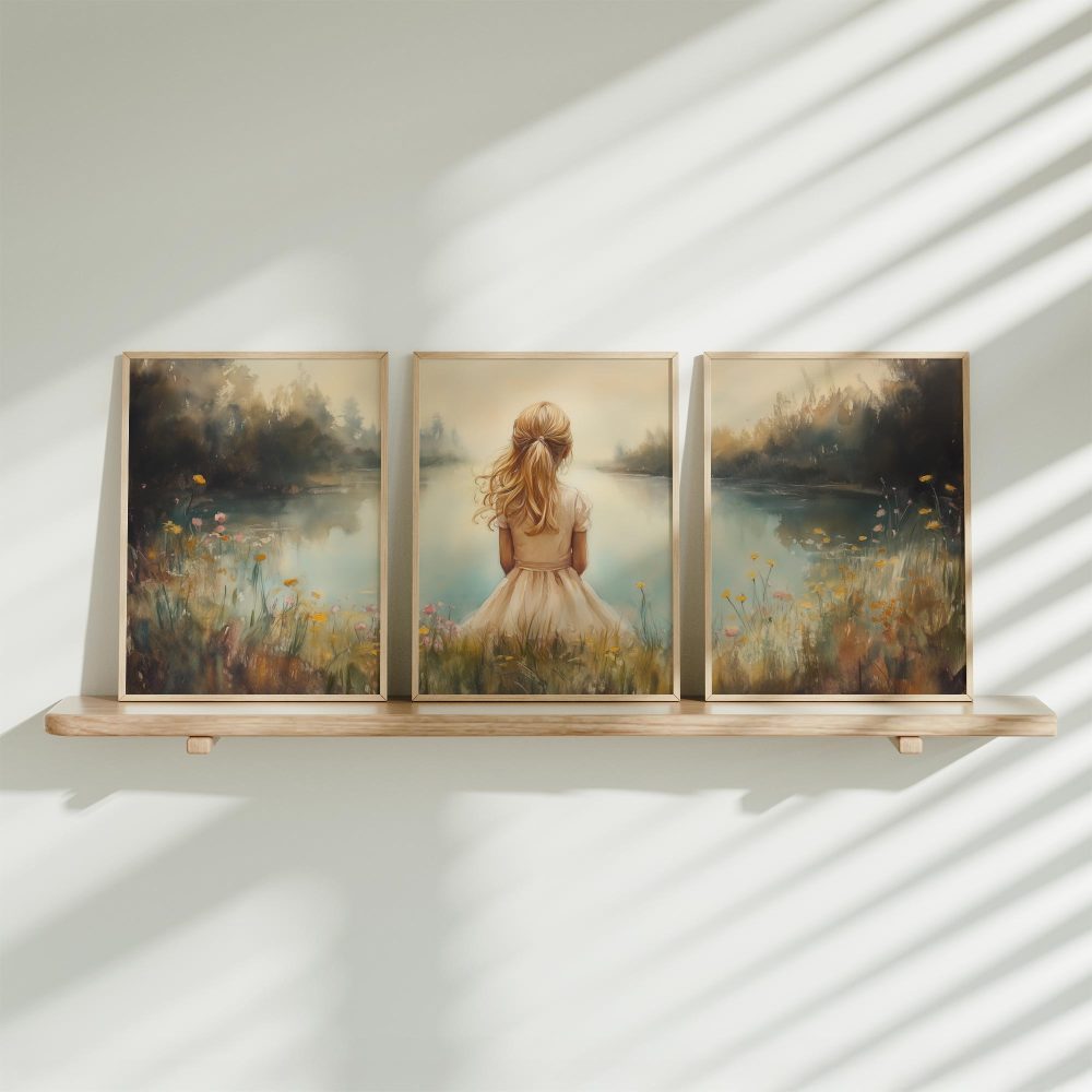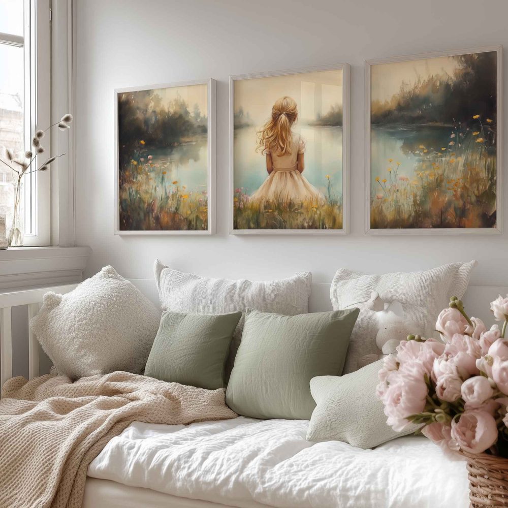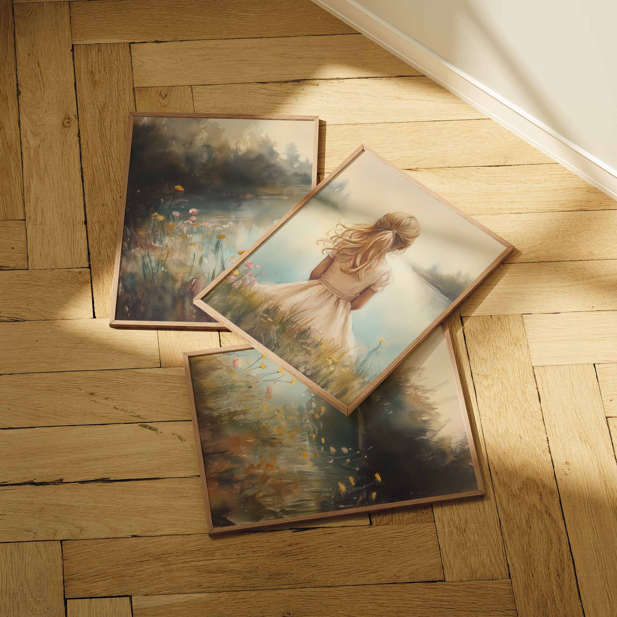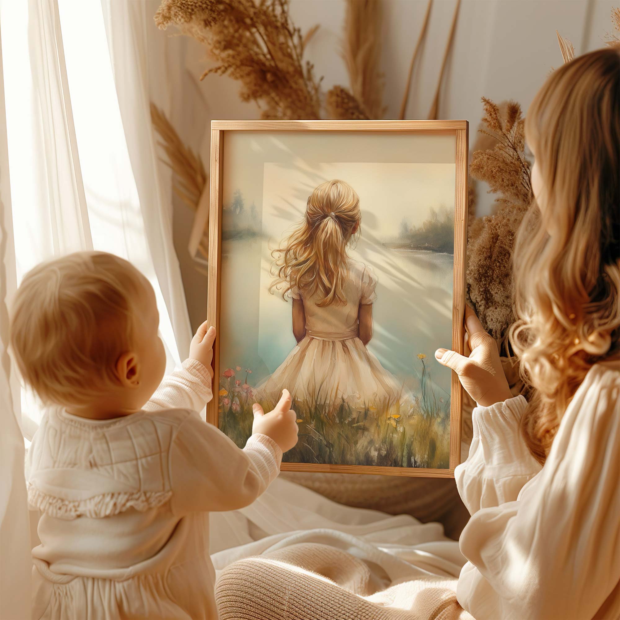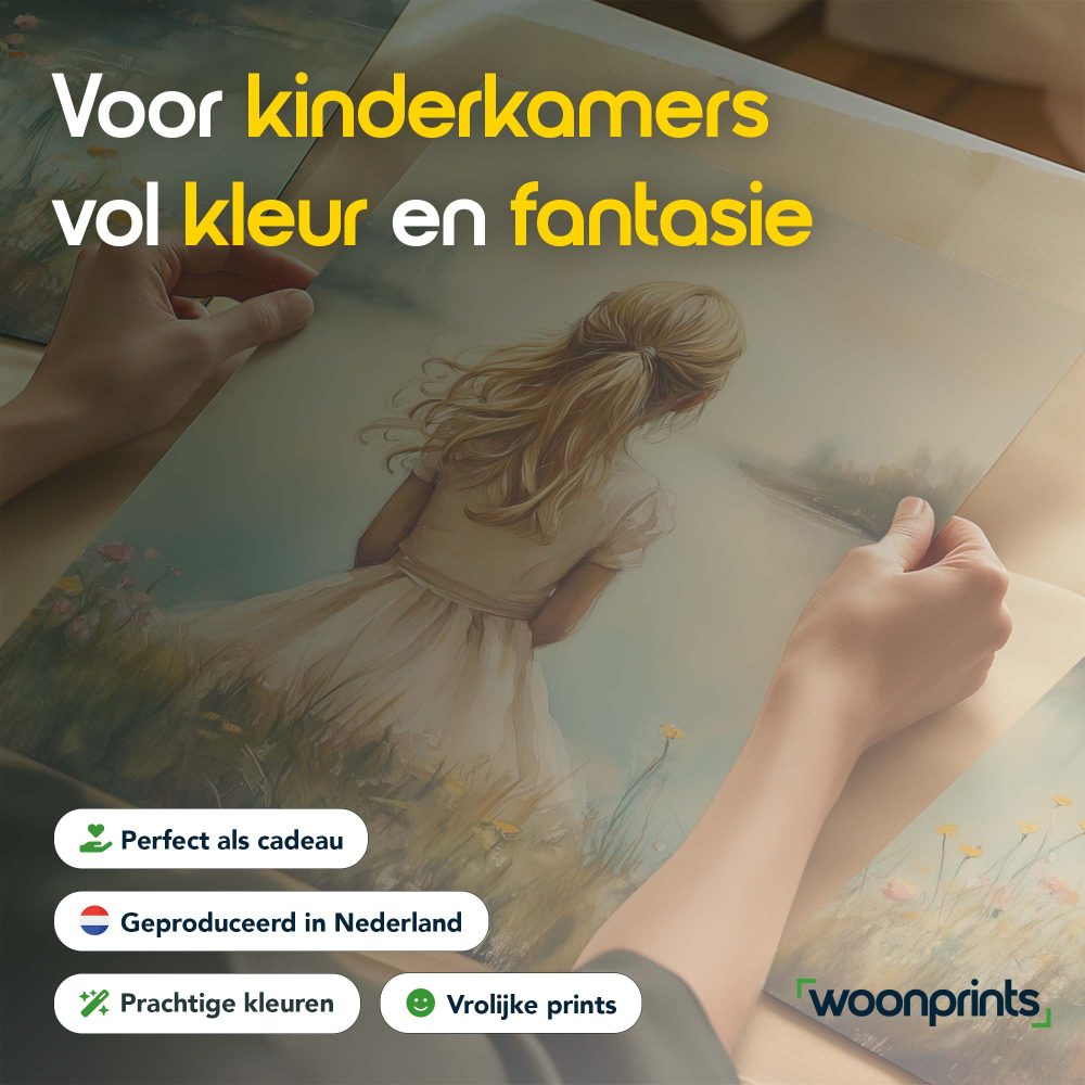 Terug naar collectie / Kinderkamer posters / Bloemen posters / Blonde Meisje in Dromerig Bloemenveld aan het Water
