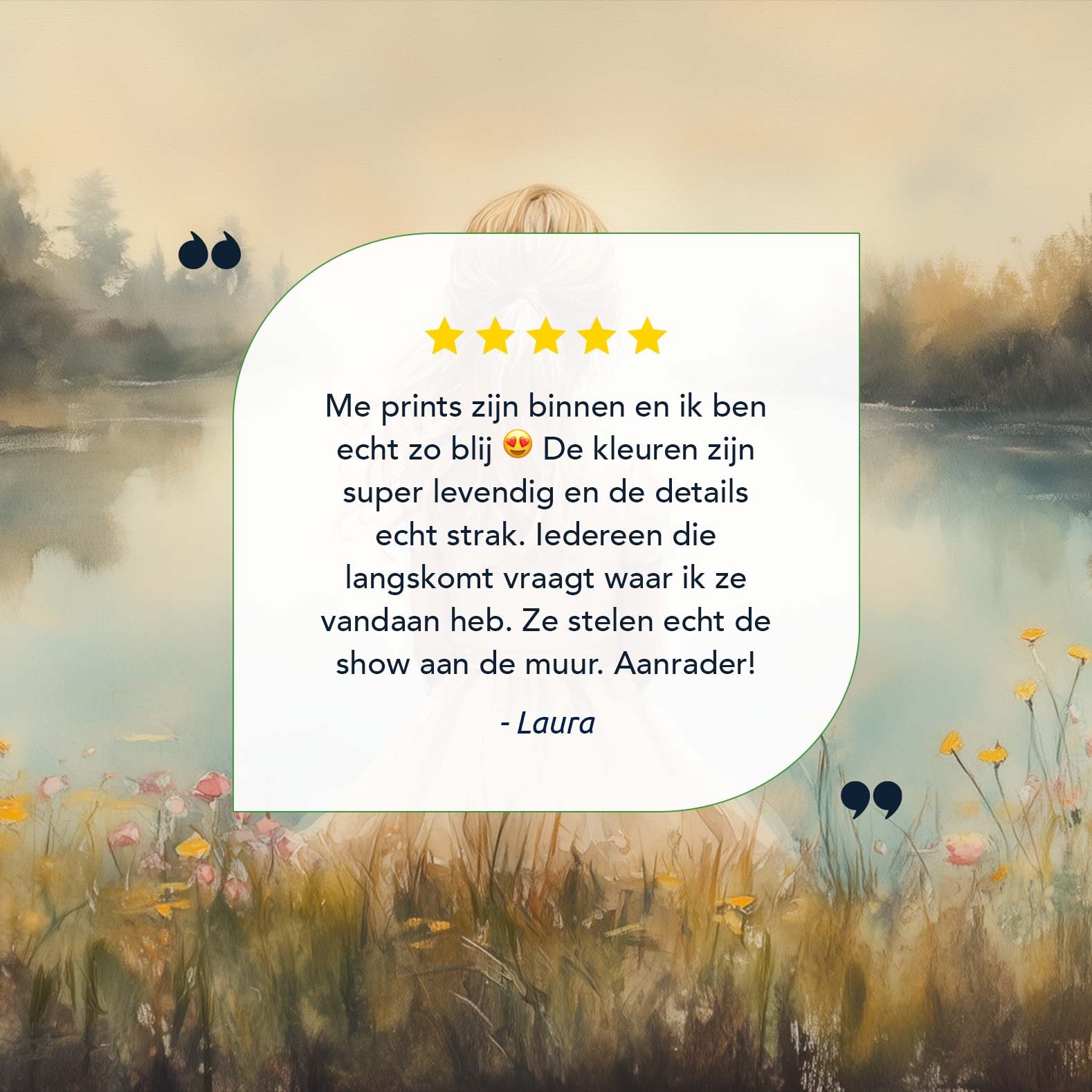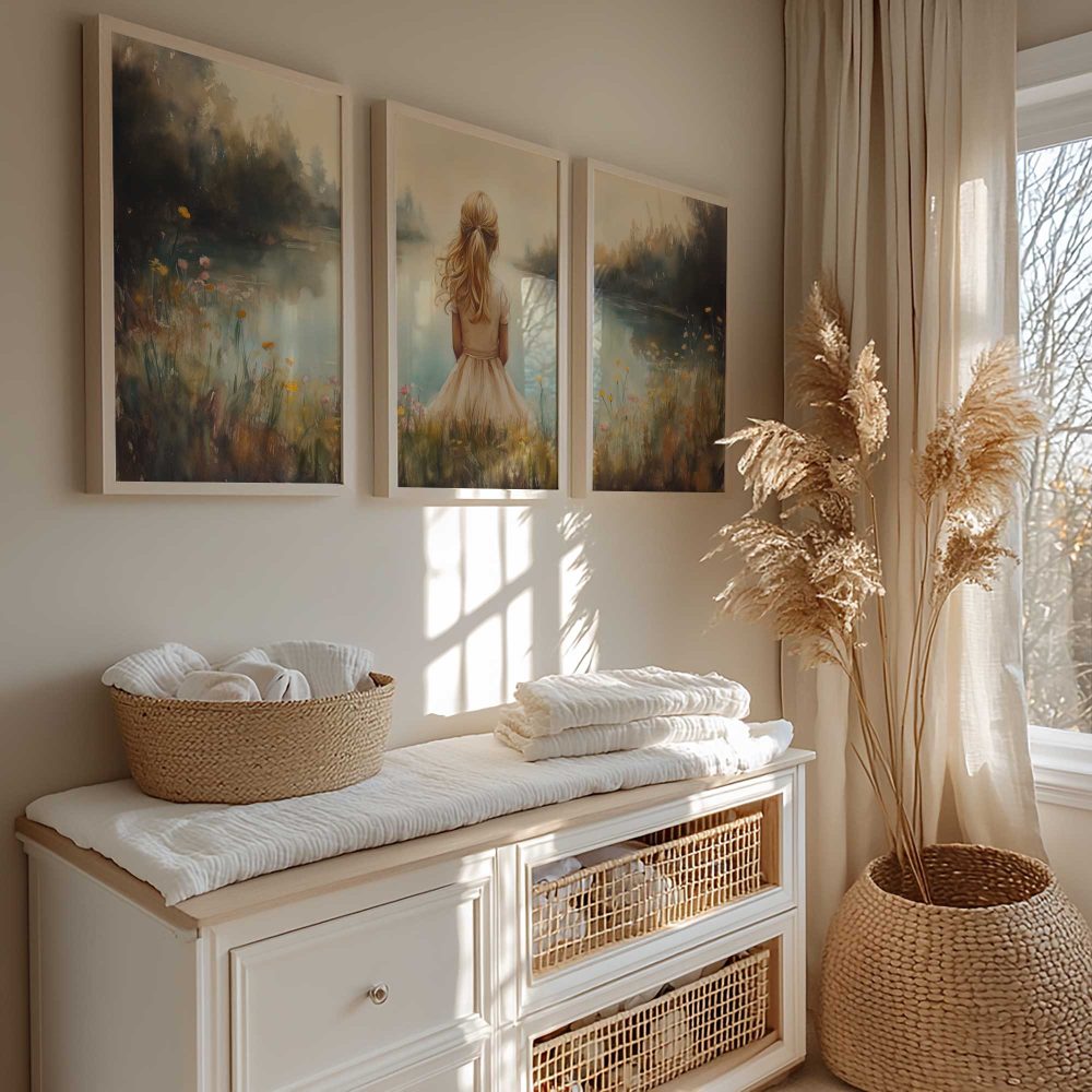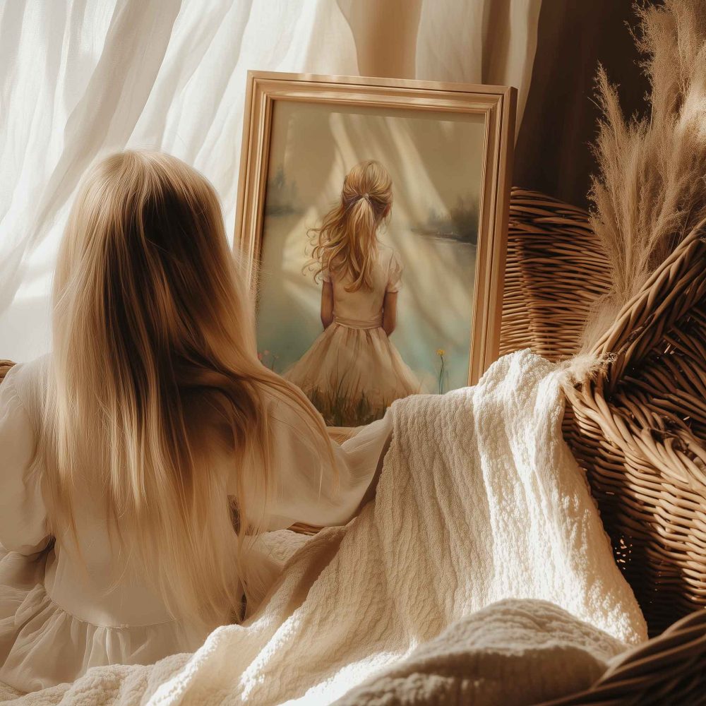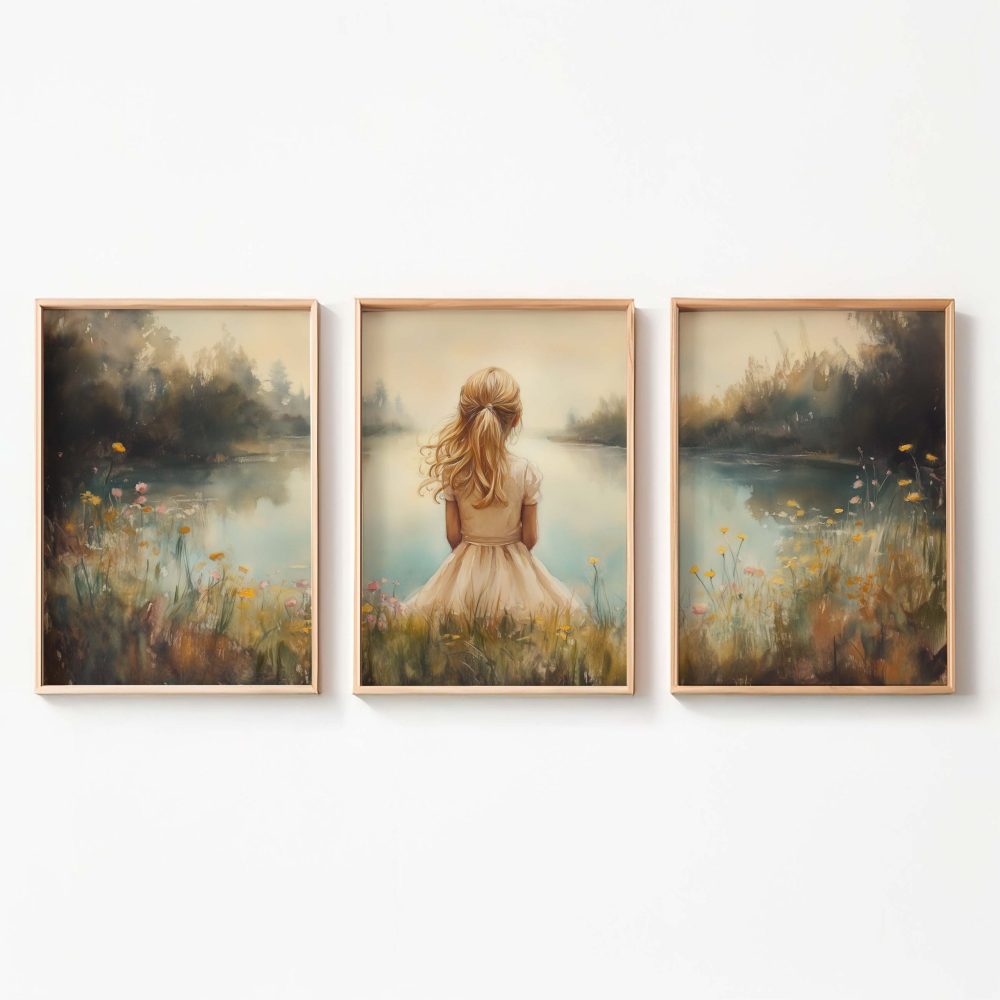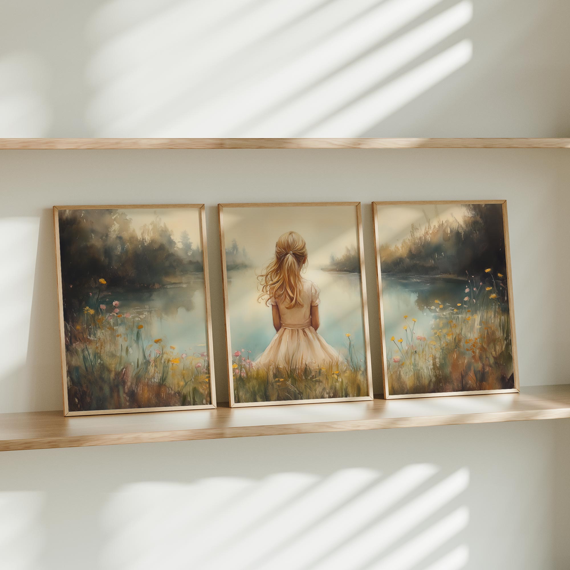 Terug naar collectie / Kinderkamer posters / Bloemen posters / Blonde Meisje in Dromerig Bloemenveld aan het Water