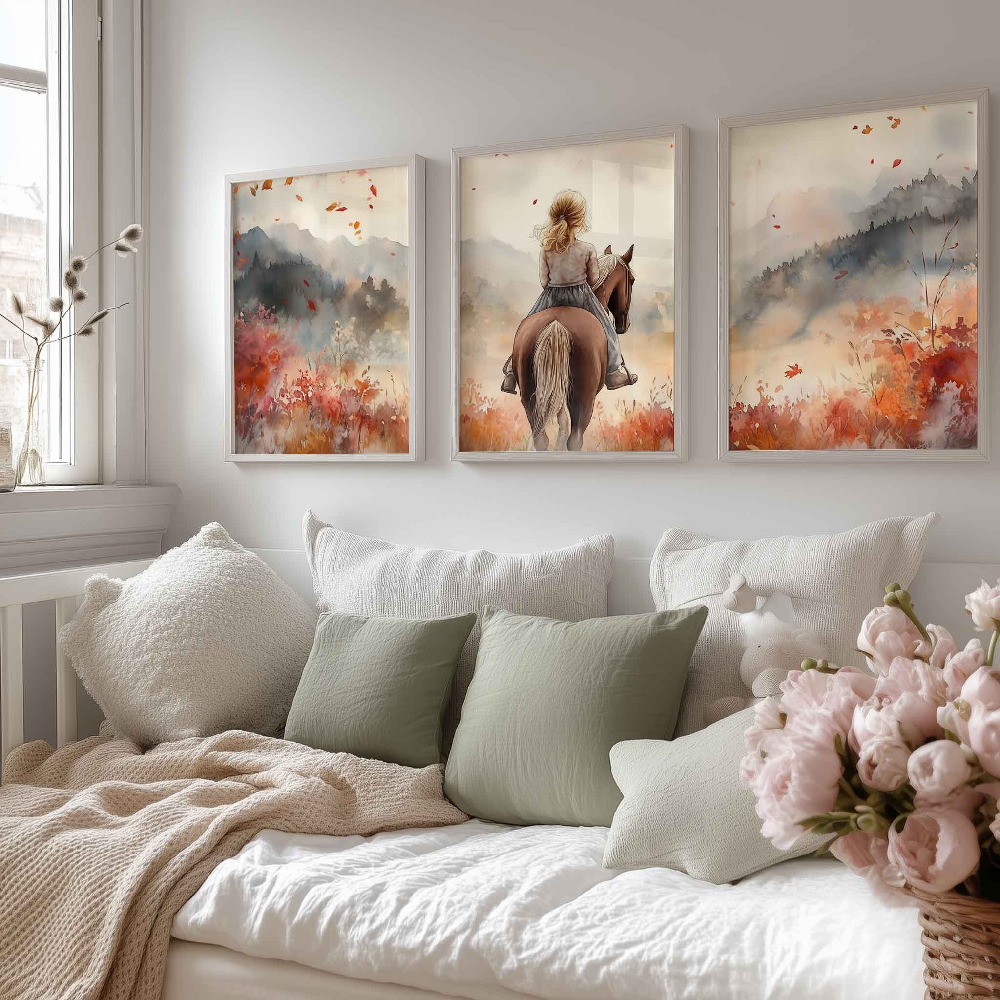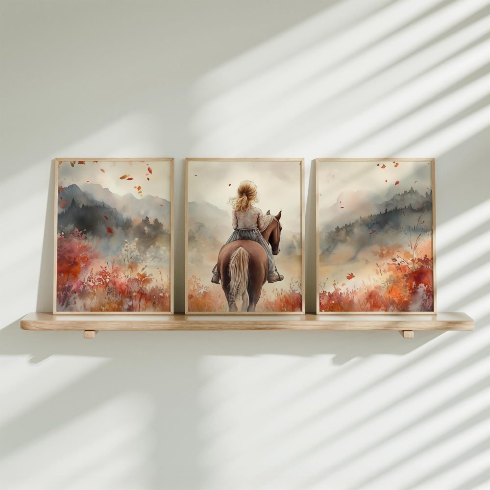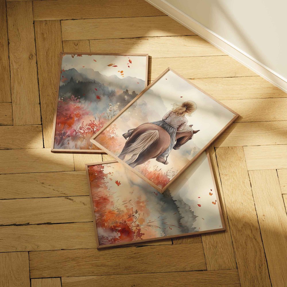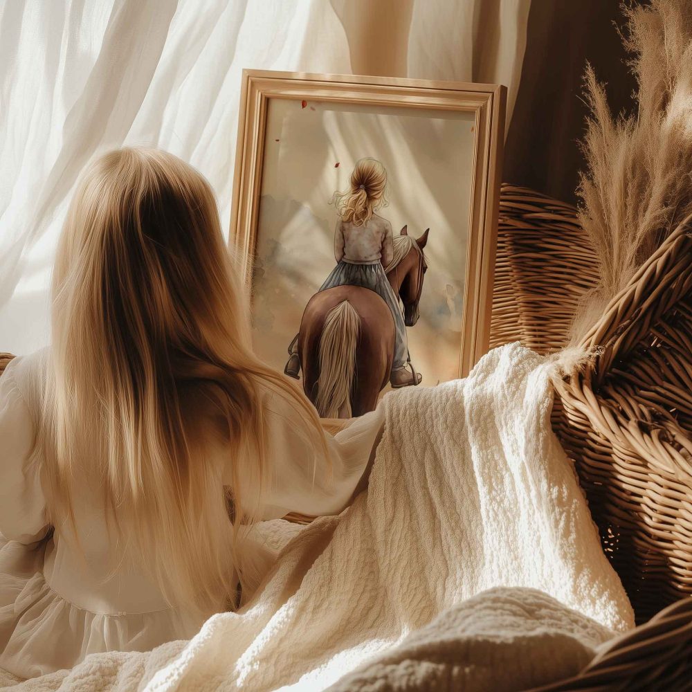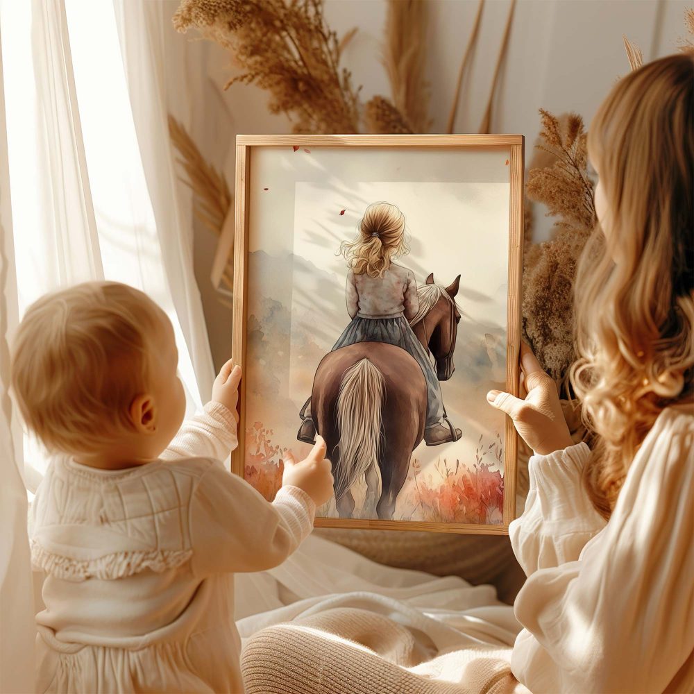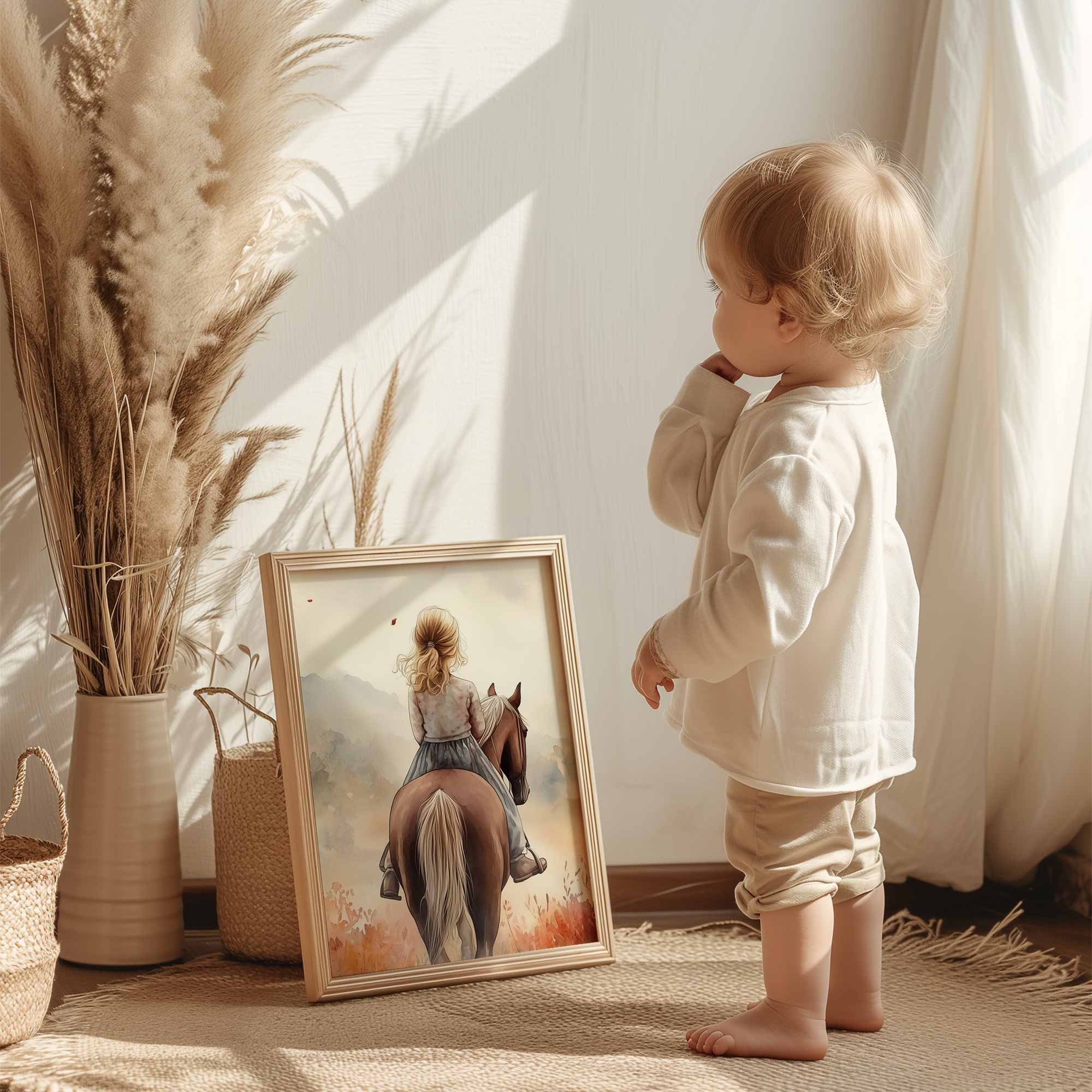 Terug naar collectie / Kinderkamer posters / Bloemen posters / Blonde Meisje op Paard in Bloemenveld – Zachte Aquarel