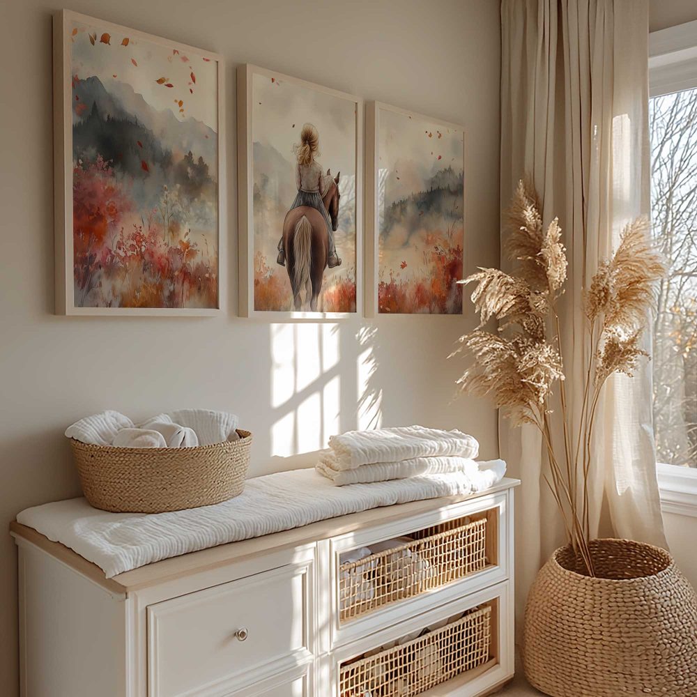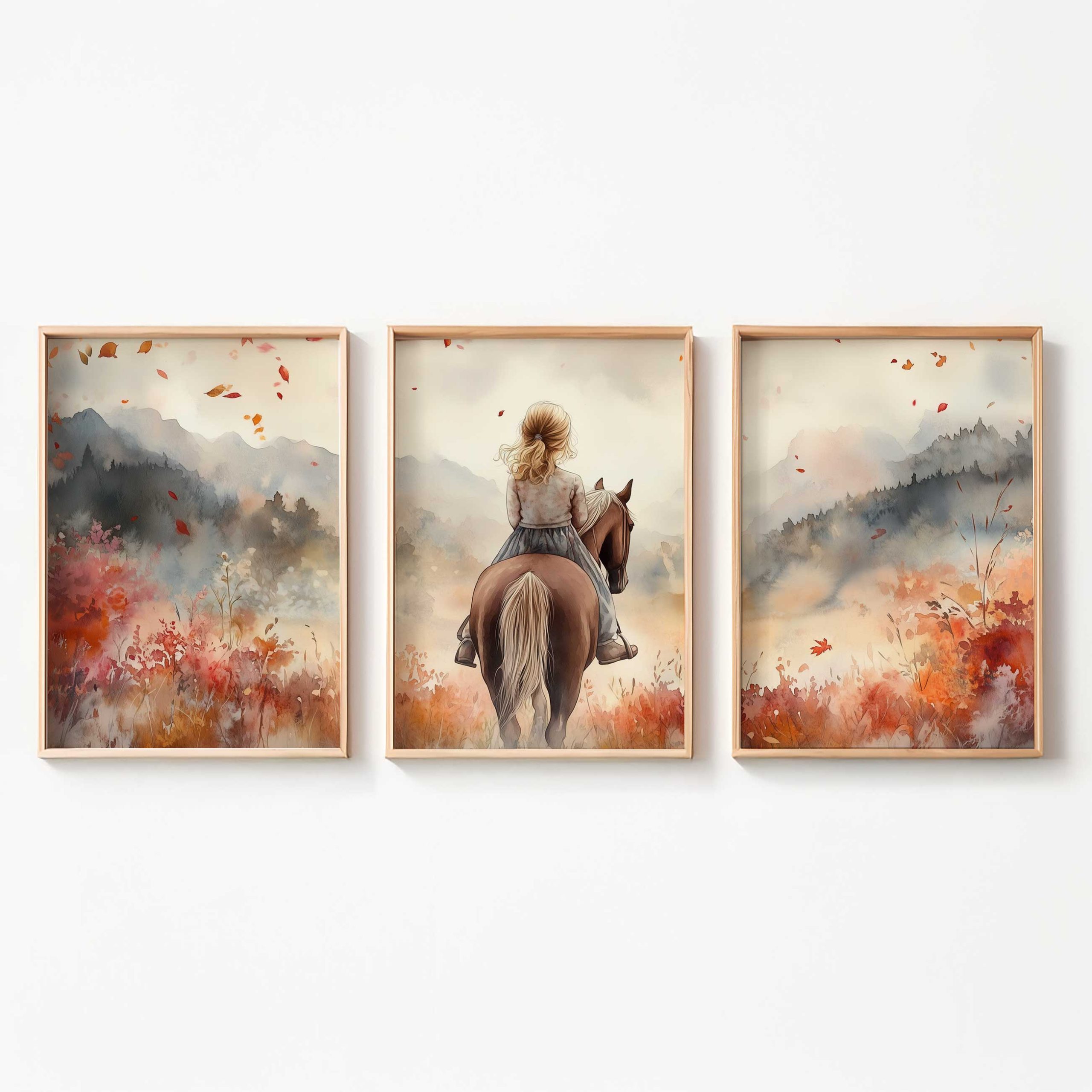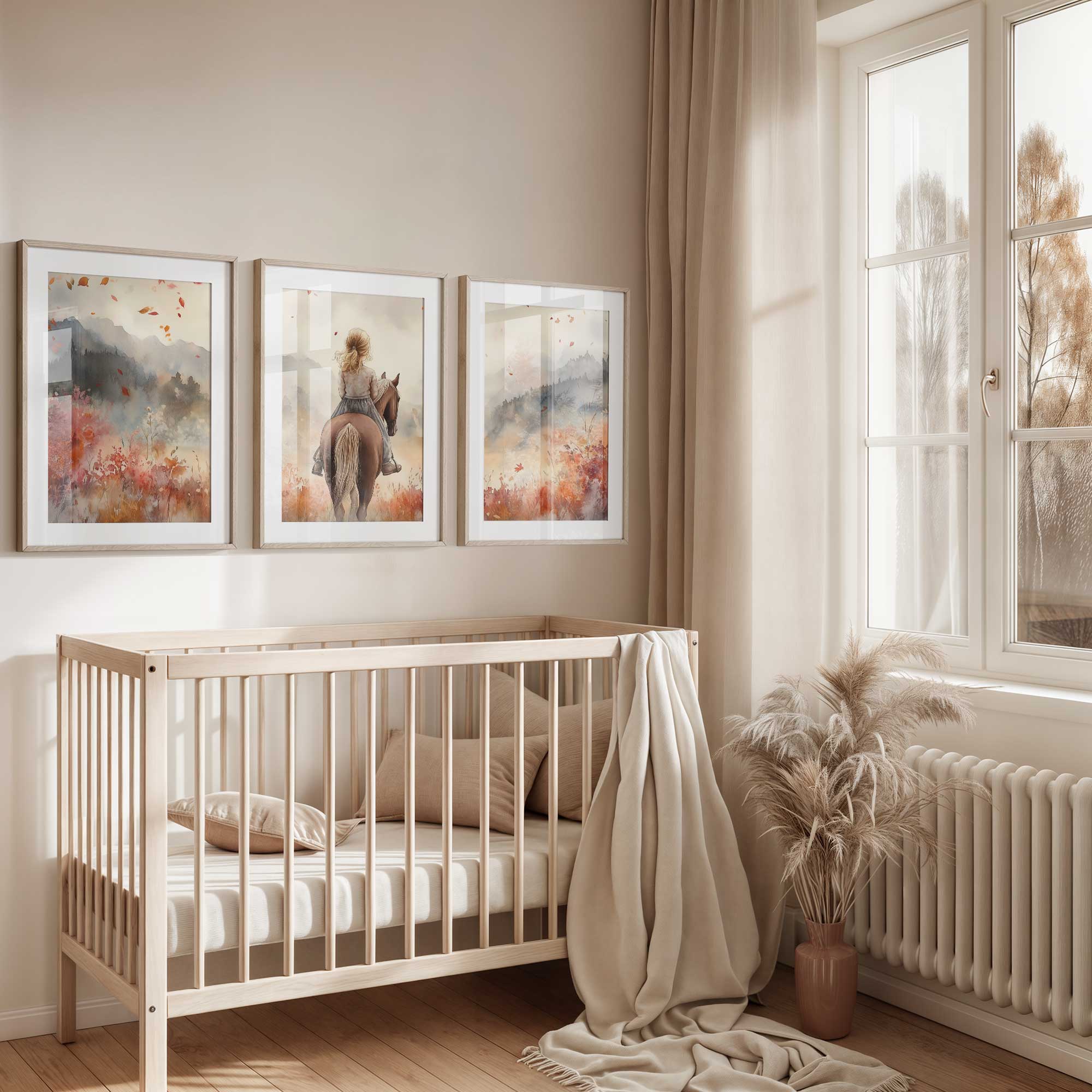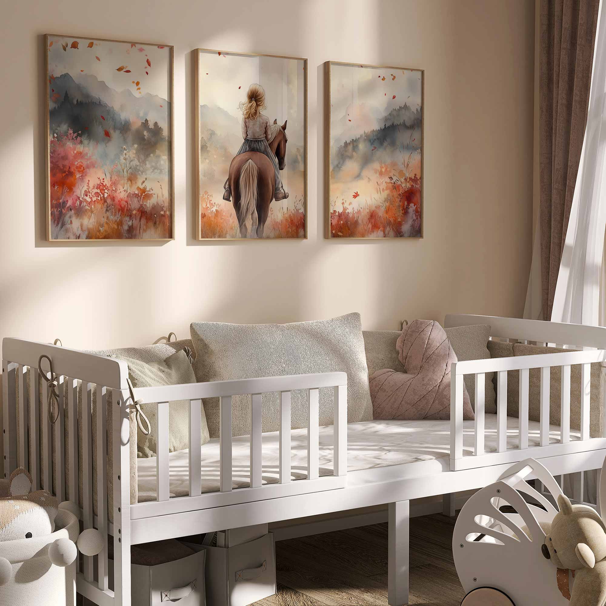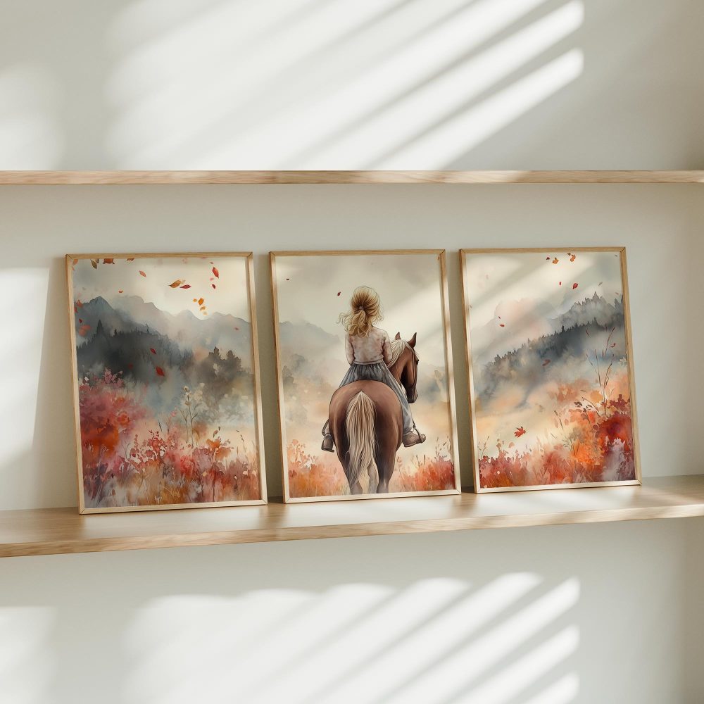 Terug naar collectie / Kinderkamer posters / Bloemen posters / Blonde Meisje op Paard in Bloemenveld – Zachte Aquarel