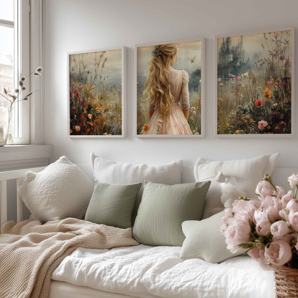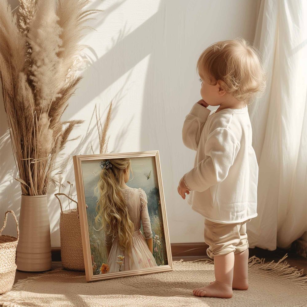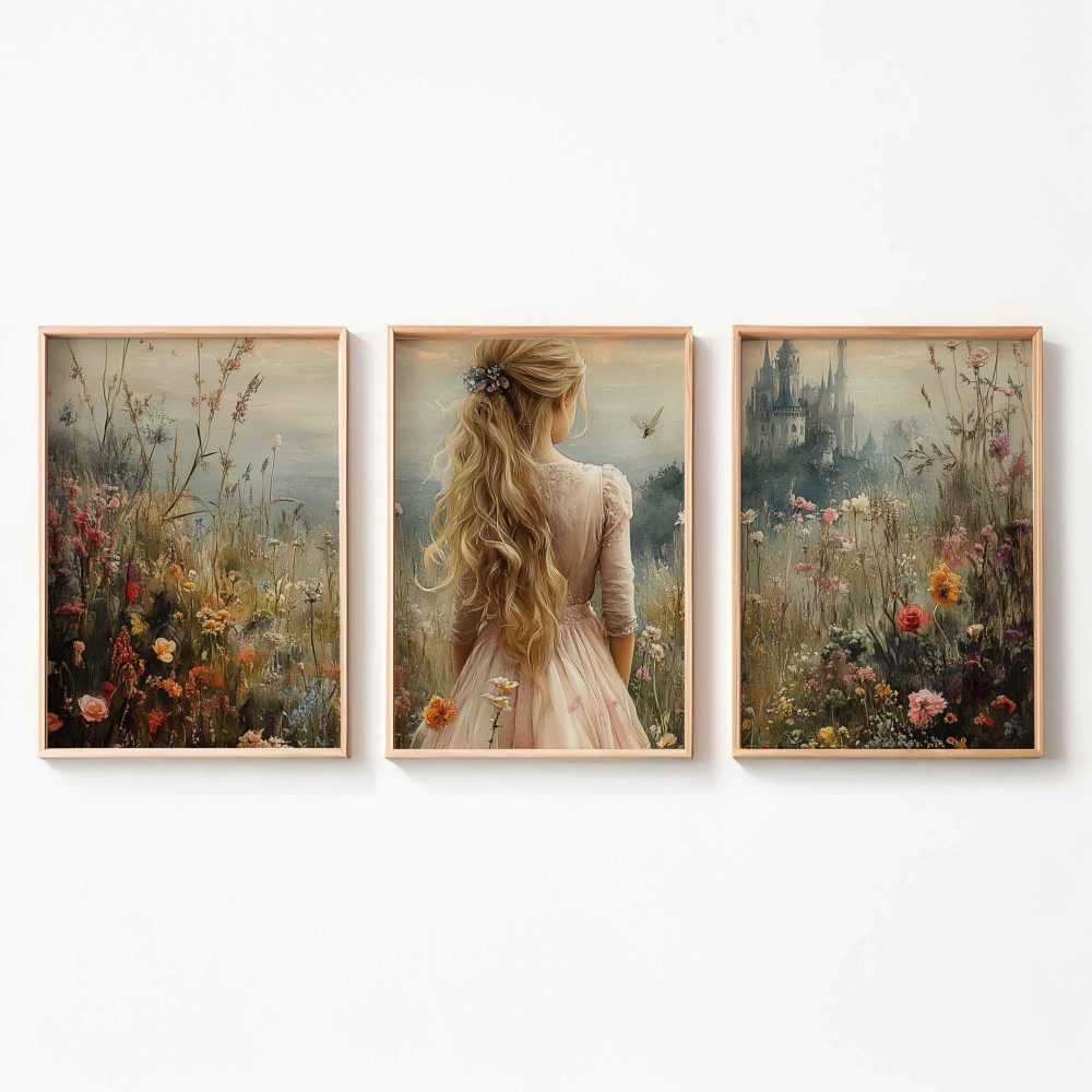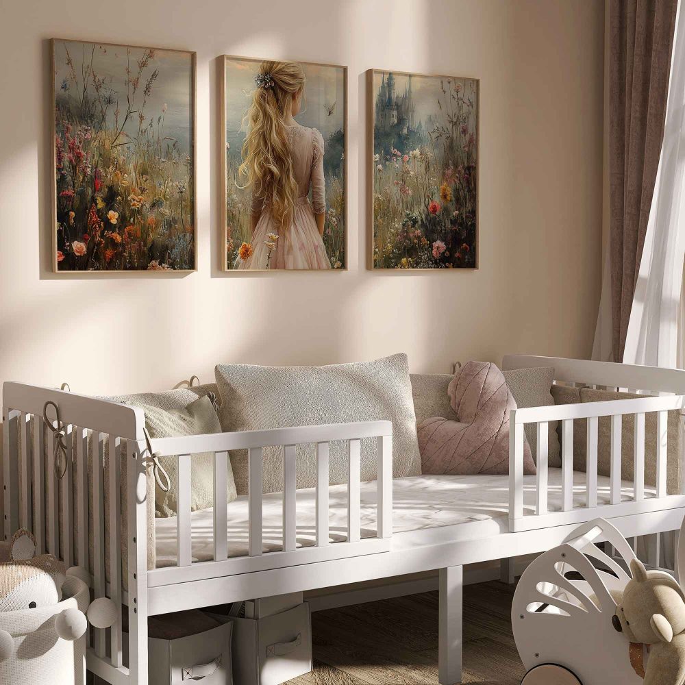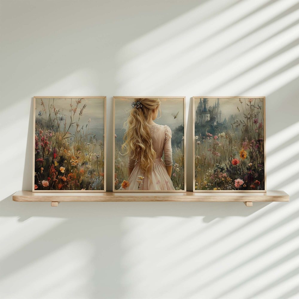 Terug naar collectie / Kinderkamer posters / Bloemen posters / Blonde Prinses in Bloemenveld bij Kasteel