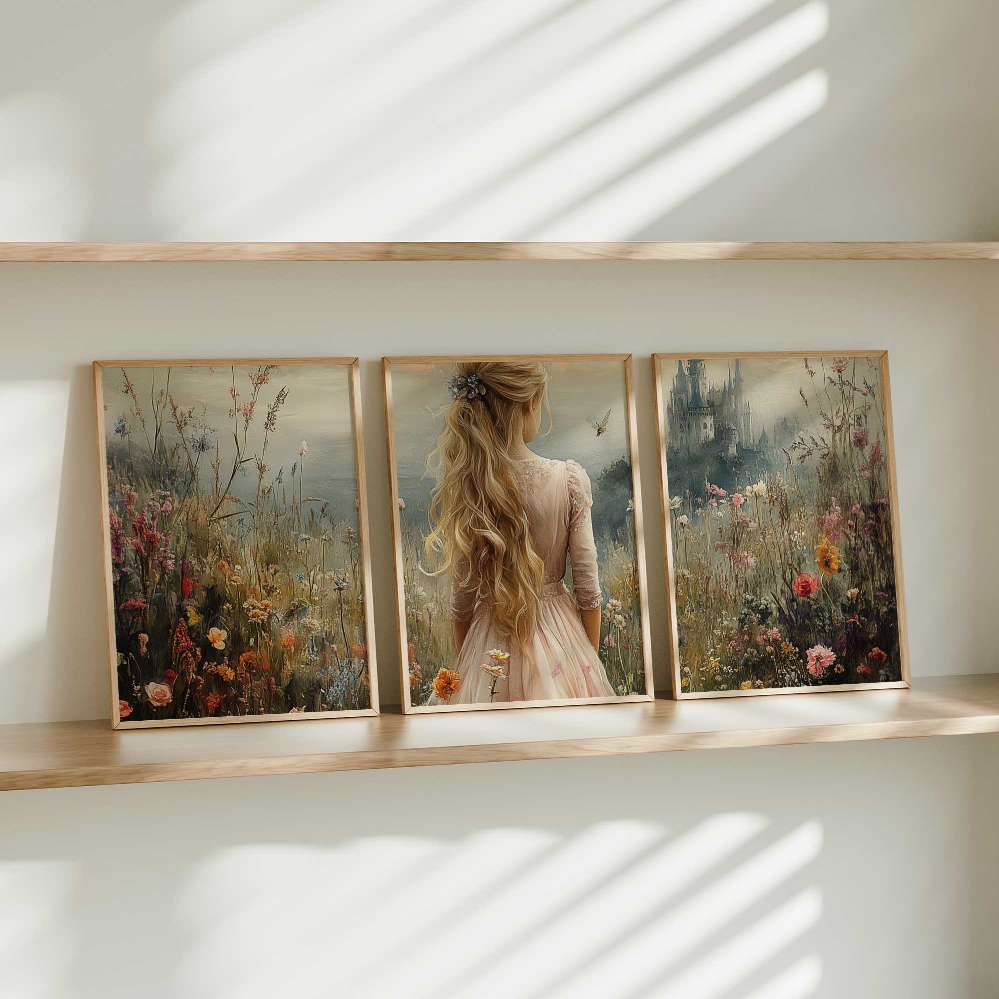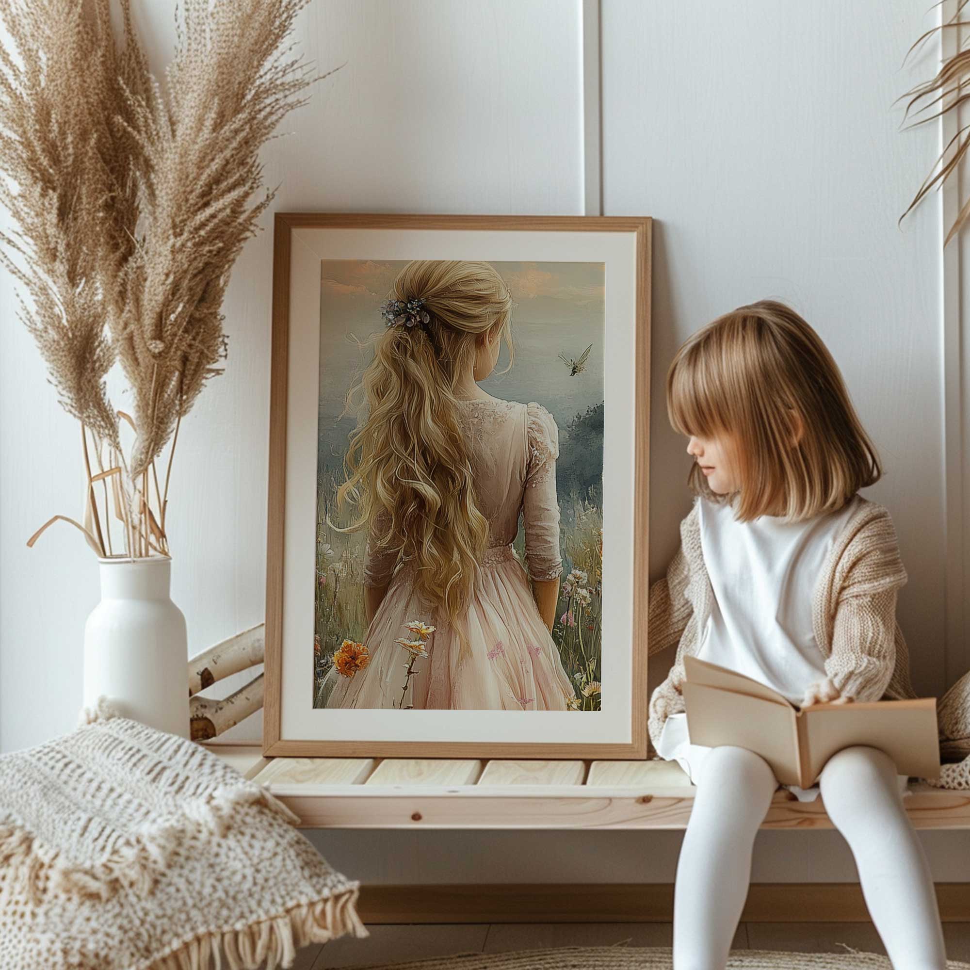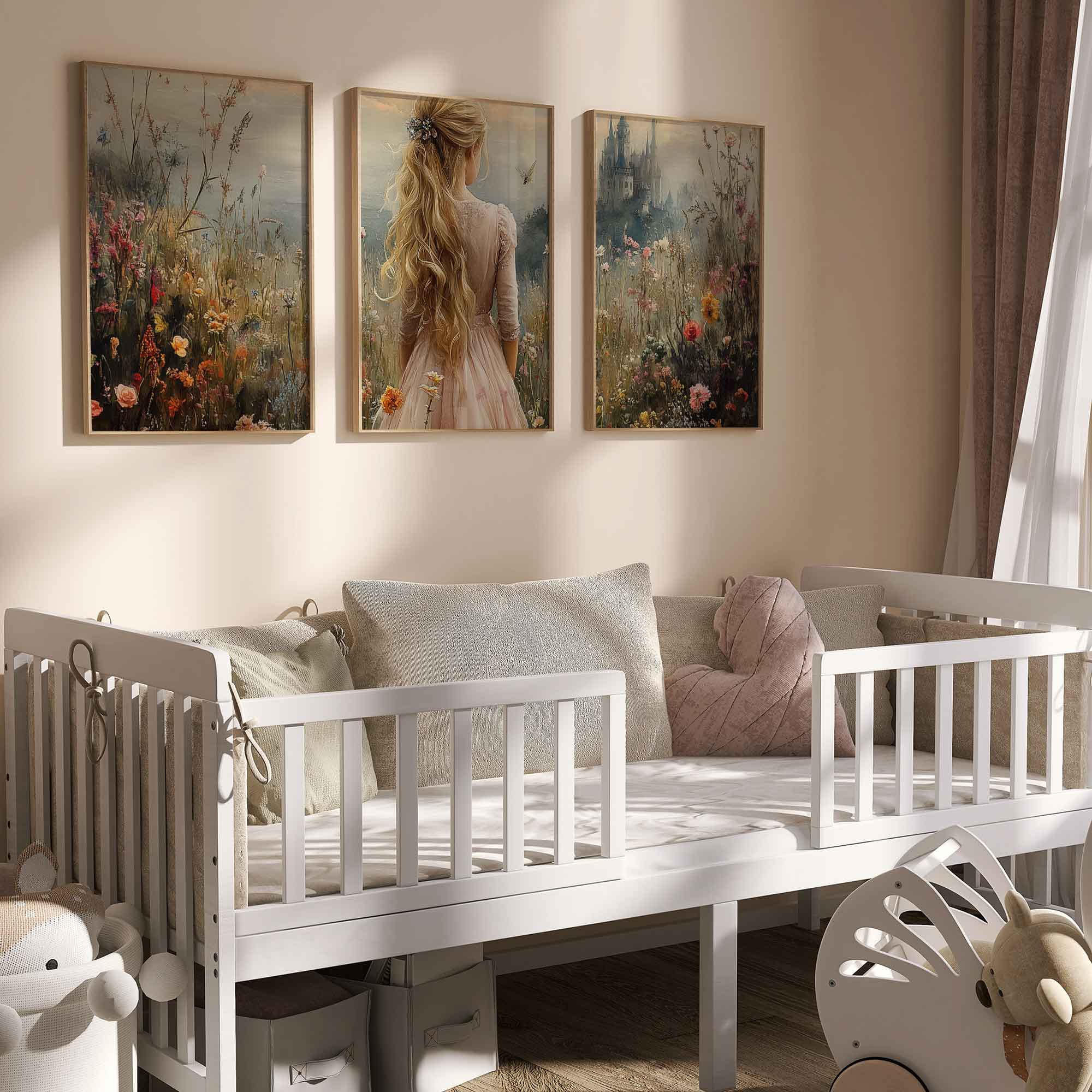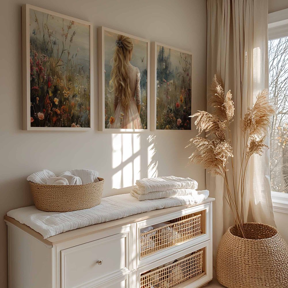 Terug naar collectie / Kinderkamer posters / Bloemen posters / Blonde Prinses in Bloemenveld bij Kasteel