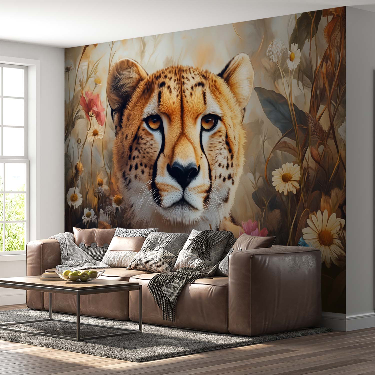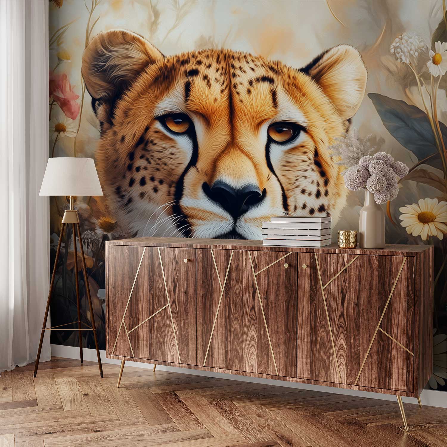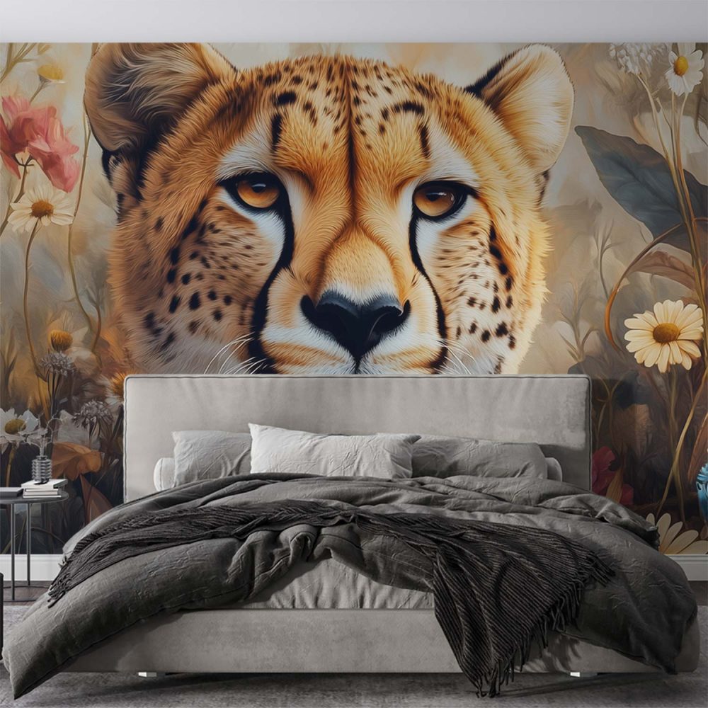 Cheetah in kleurrijke bloemenomgeving behang