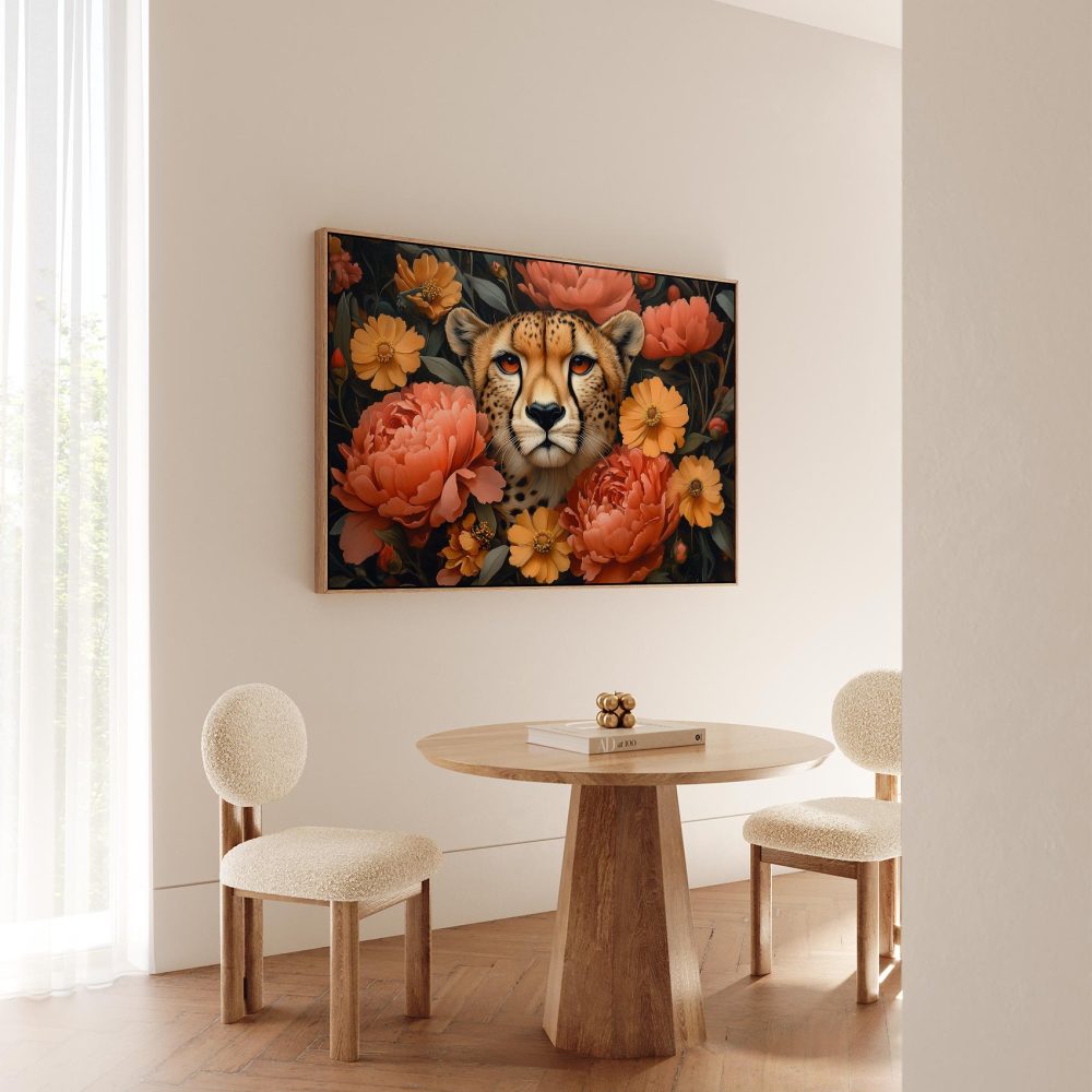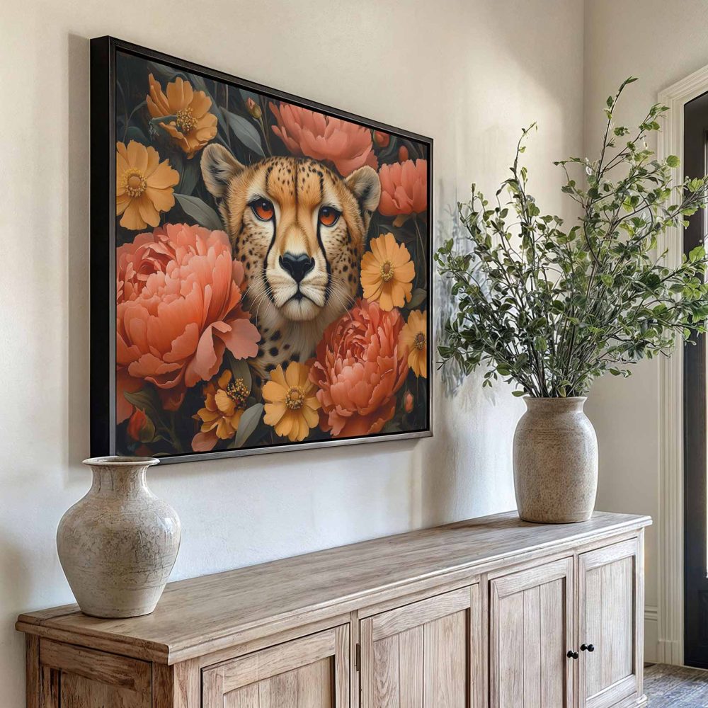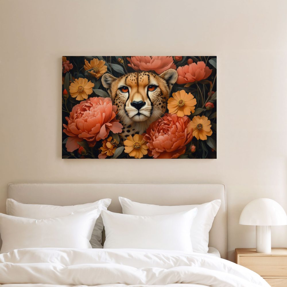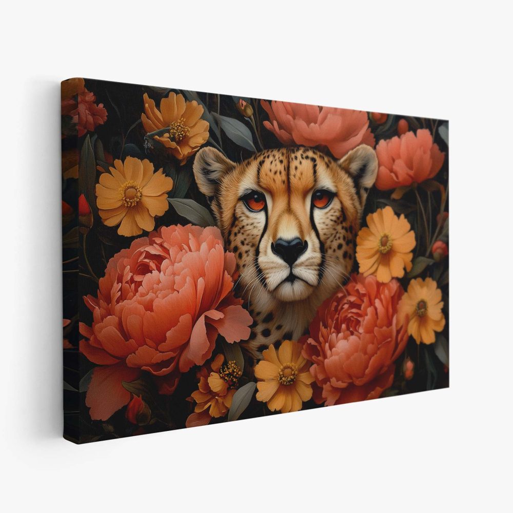 Terug naar collectie / Schilderijen / Bloemen Schilderij / Cheetah omringd door bloemen