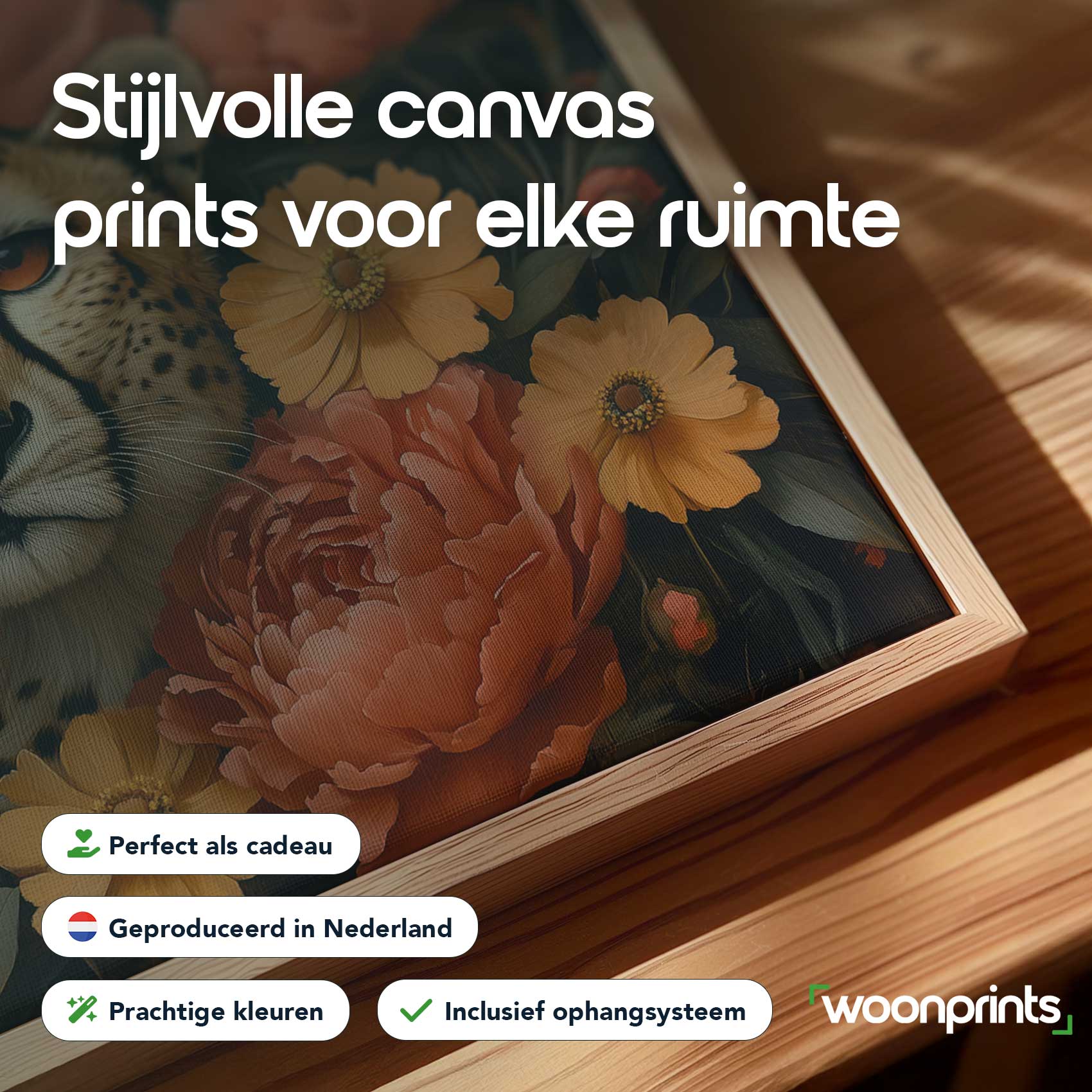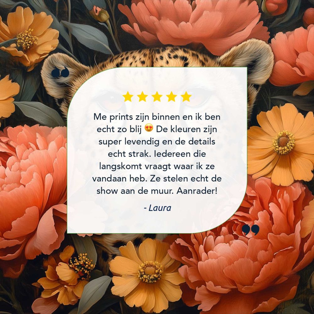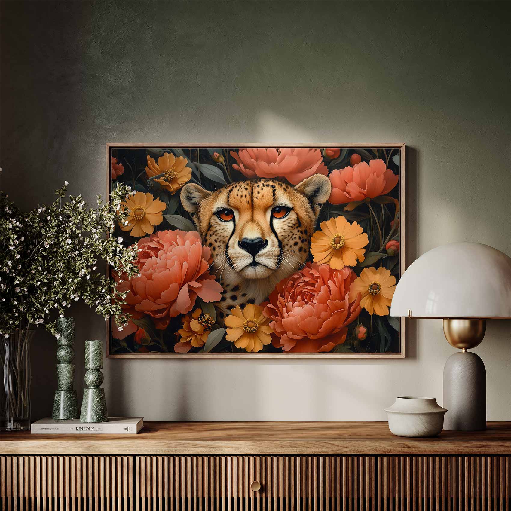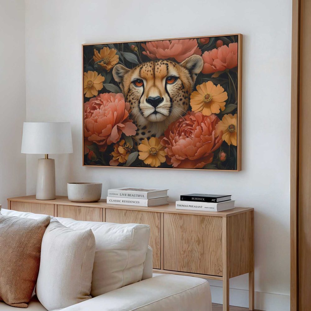 Terug naar collectie / Schilderijen / Bloemen Schilderij / Cheetah omringd door bloemen