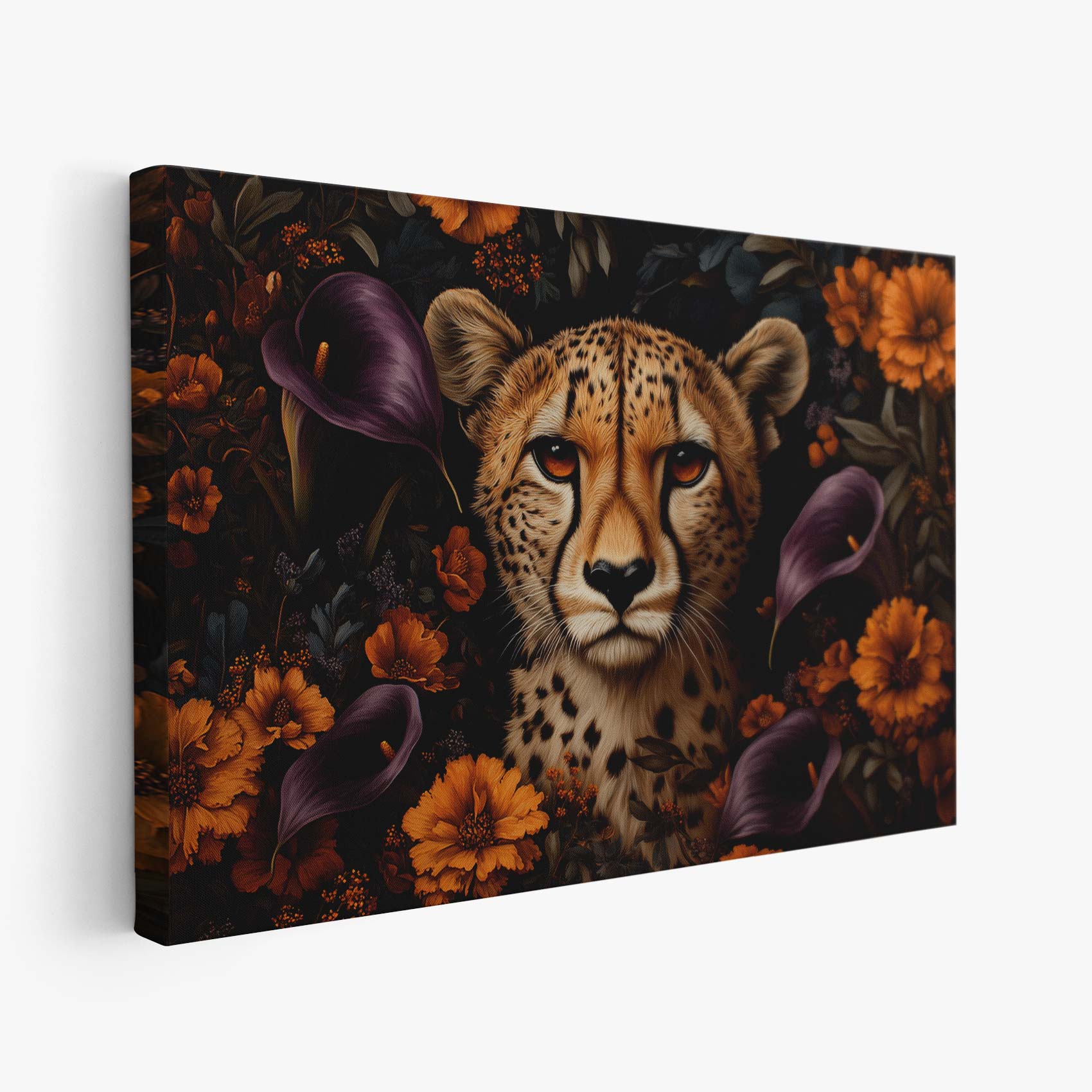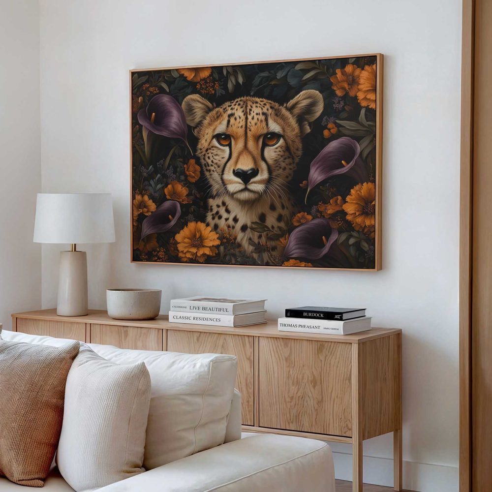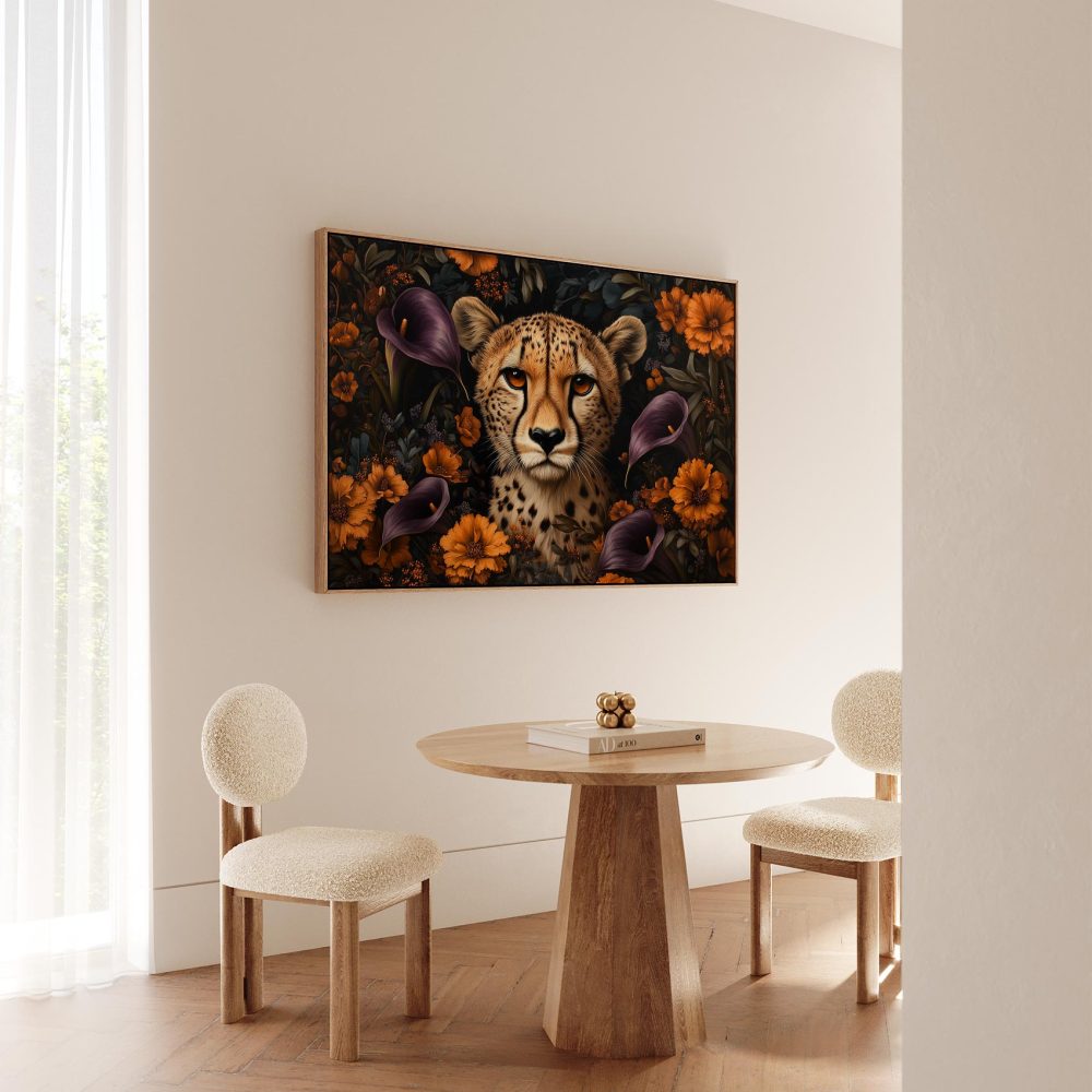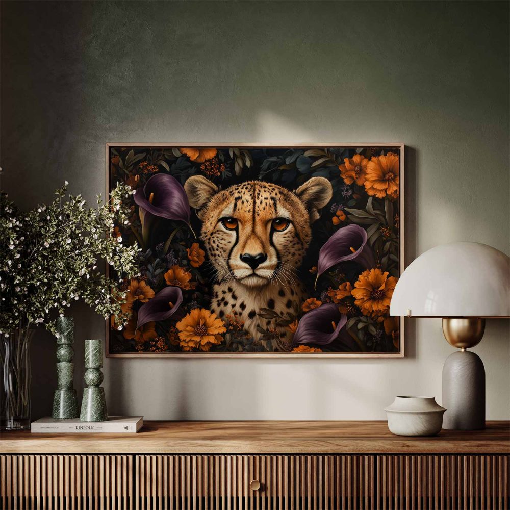 Terug naar collectie / Schilderijen / Bloemen Schilderij / Cheetah tussen kleurrijke bloemen