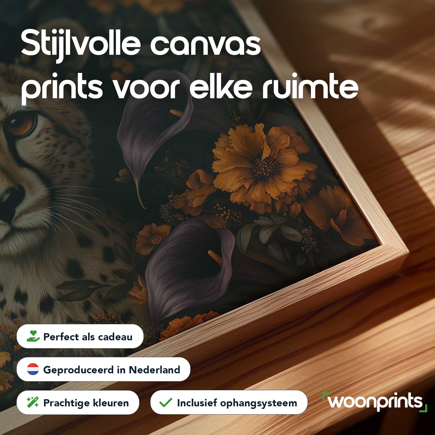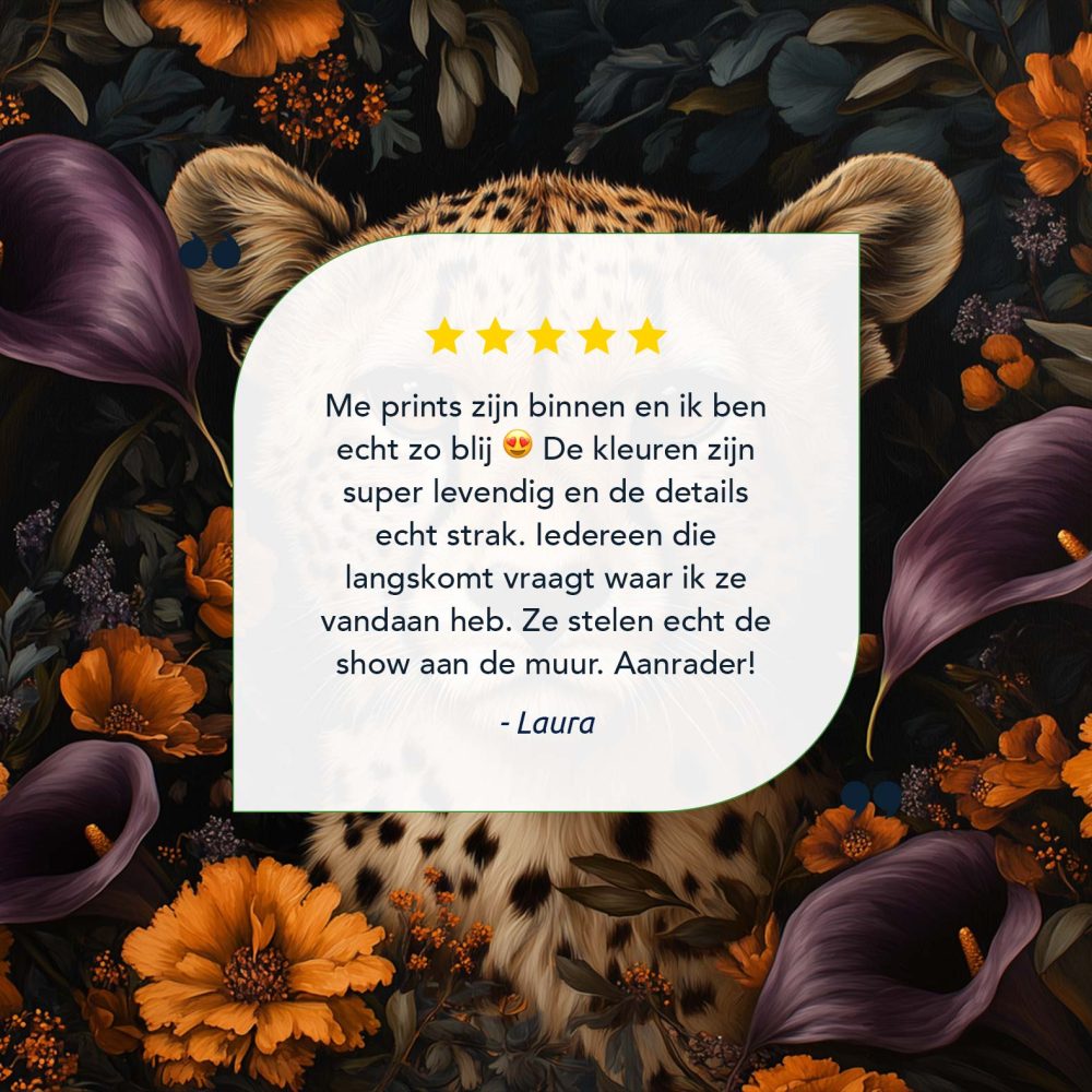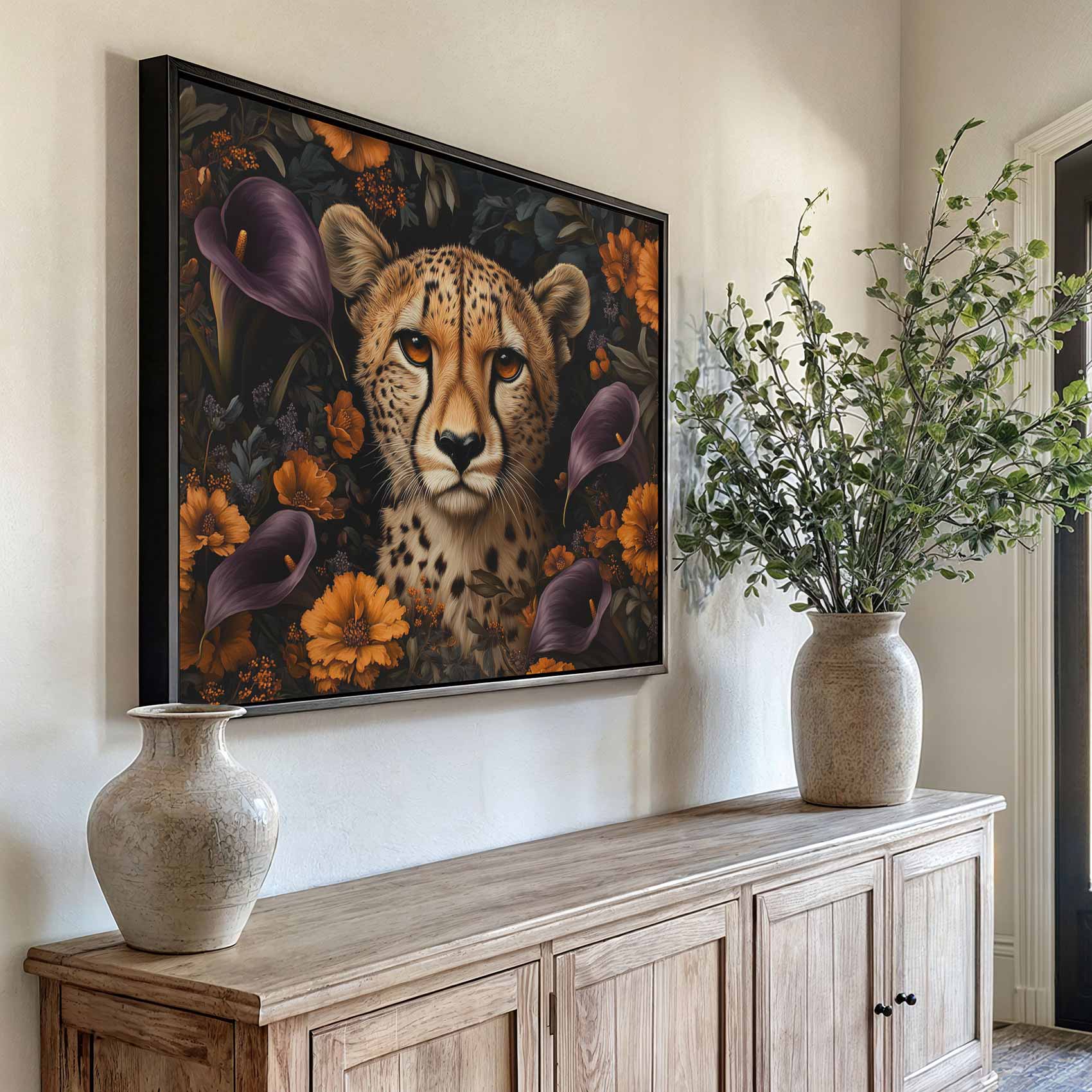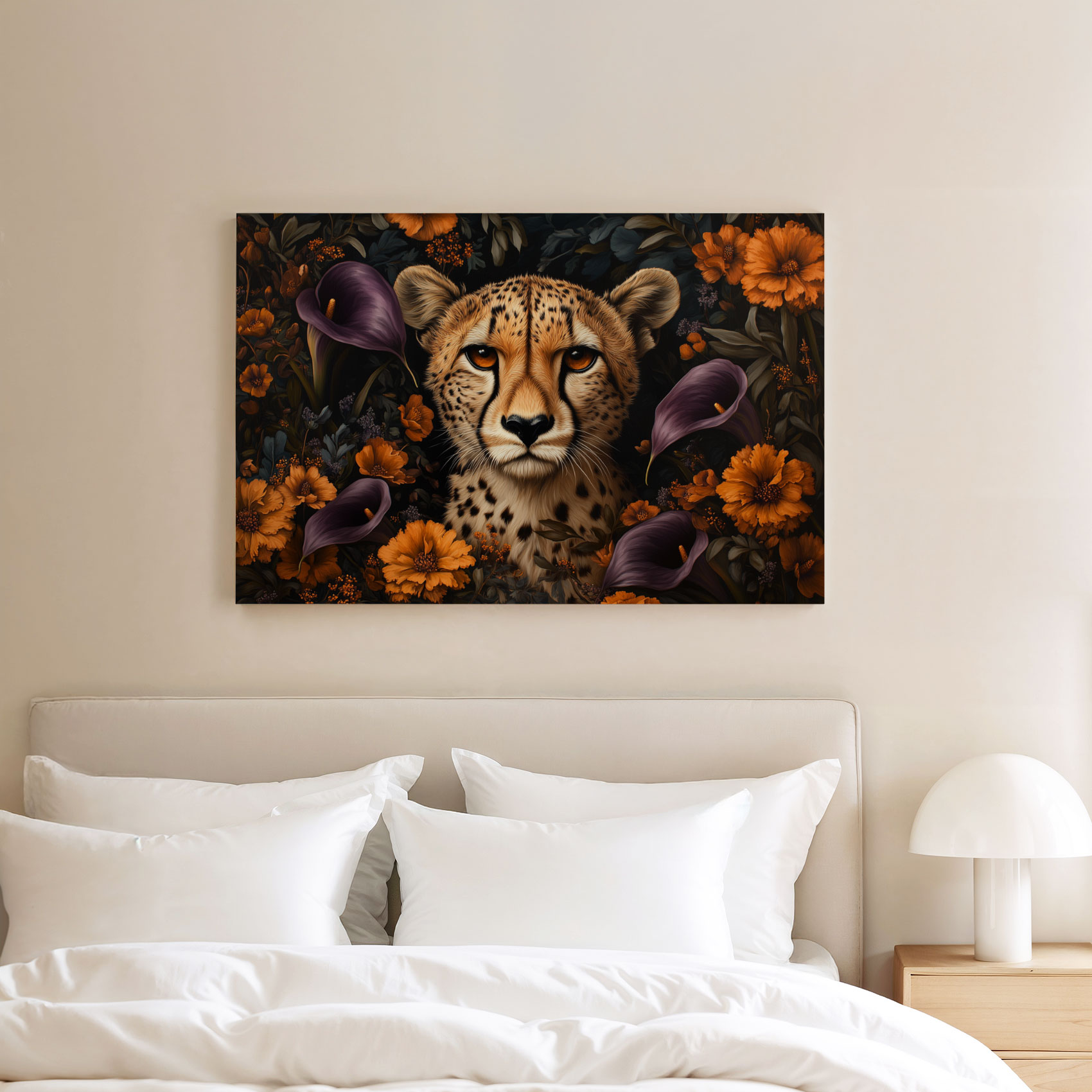 Terug naar collectie / Schilderijen / Bloemen Schilderij / Cheetah tussen kleurrijke bloemen