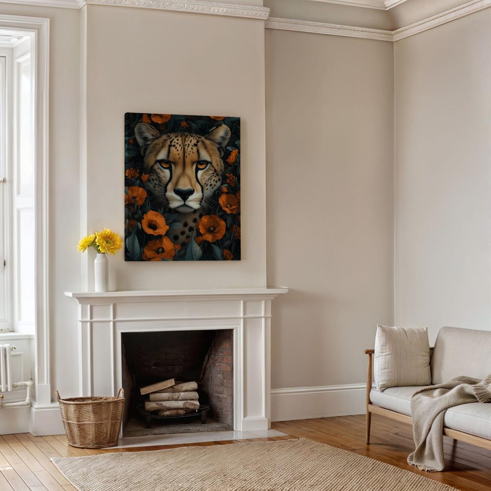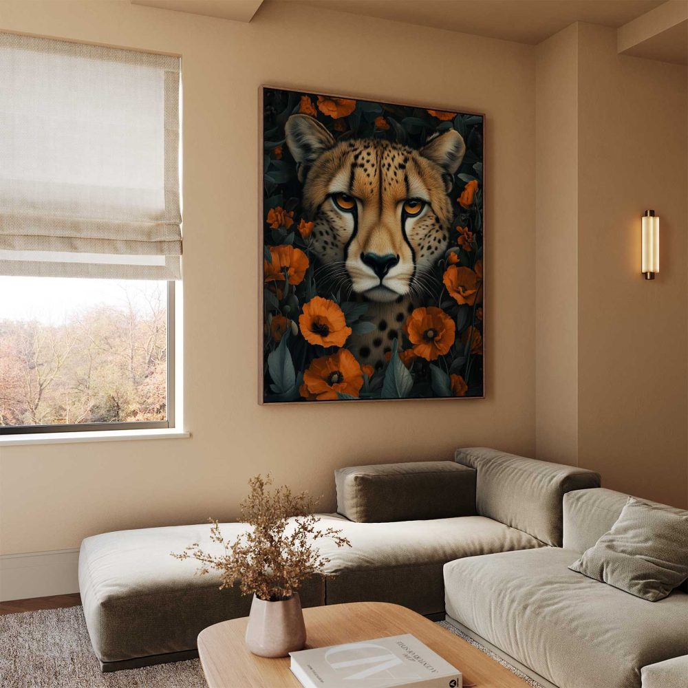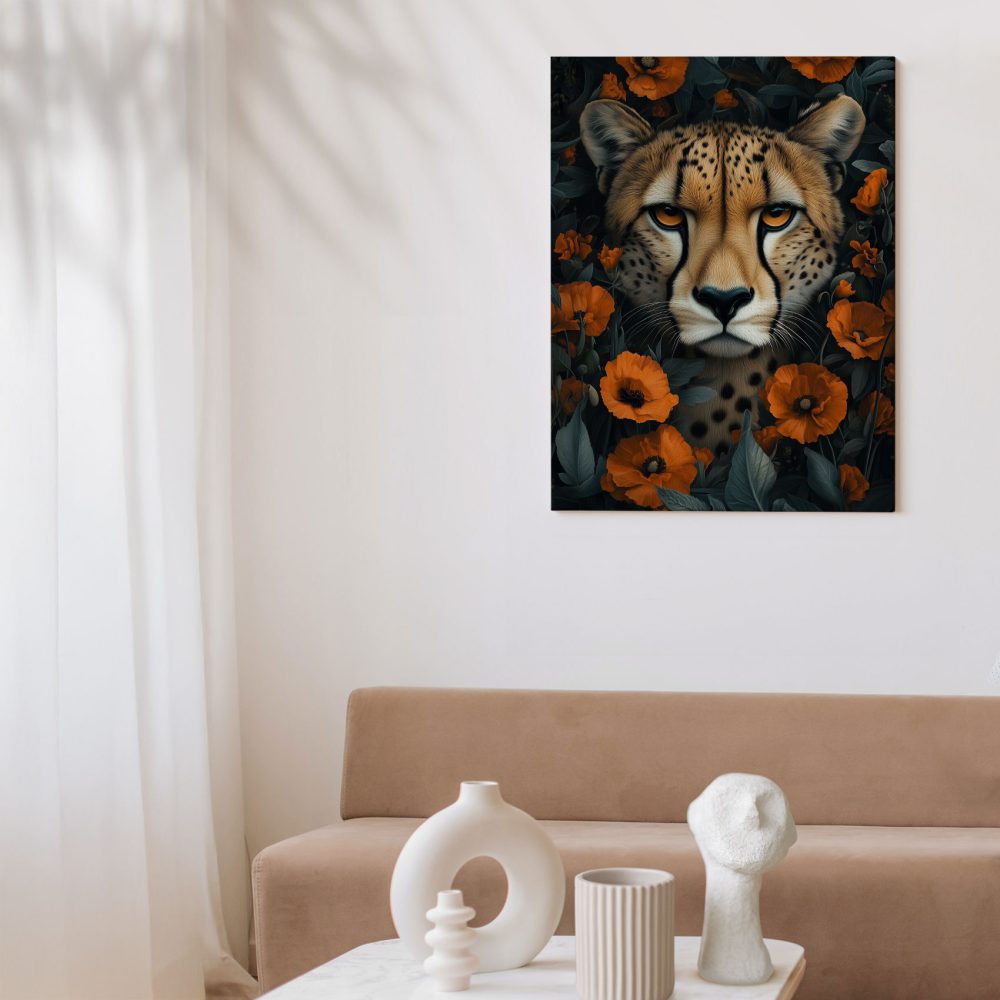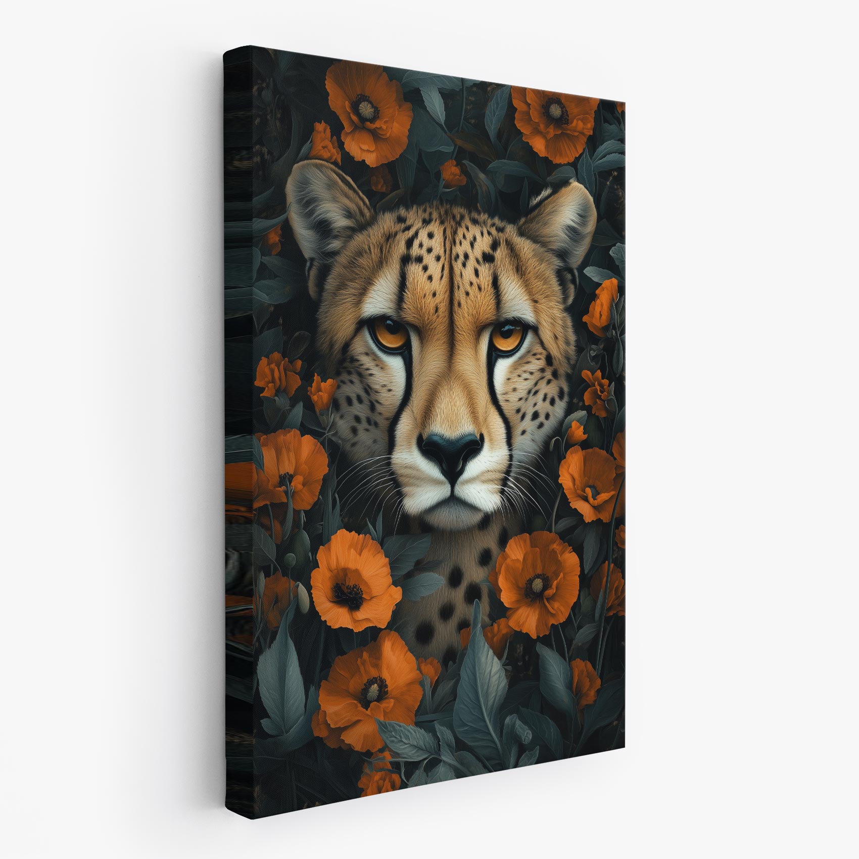 Terug naar collectie / Schilderijen / Bloemen Schilderij / Cheetah tussen oranje bloemen