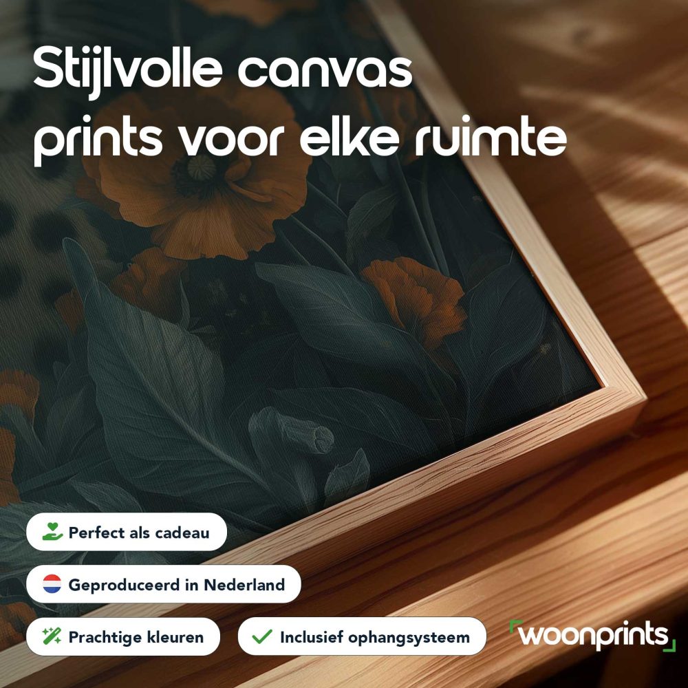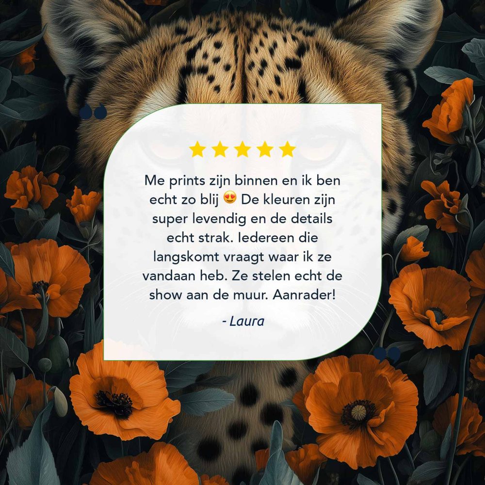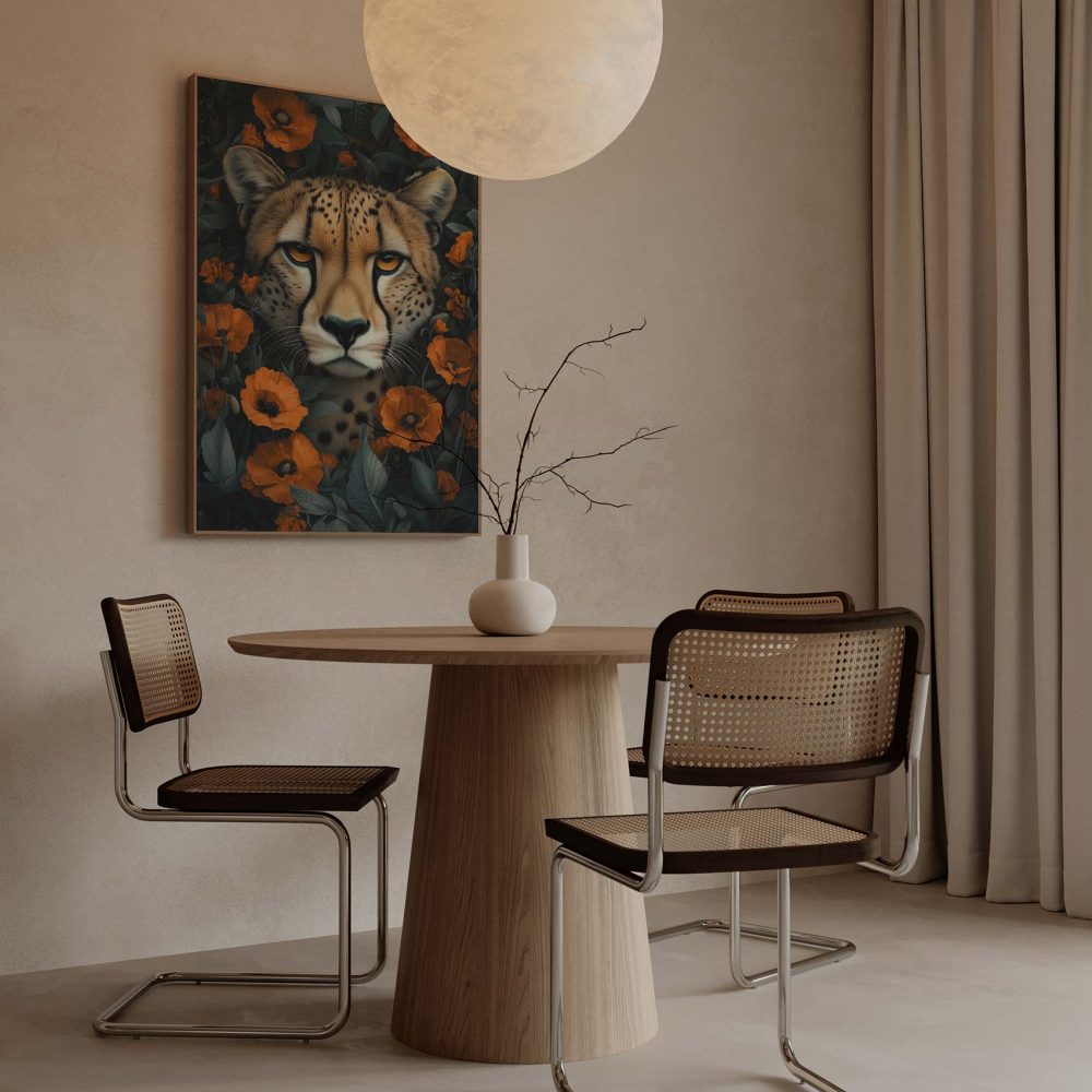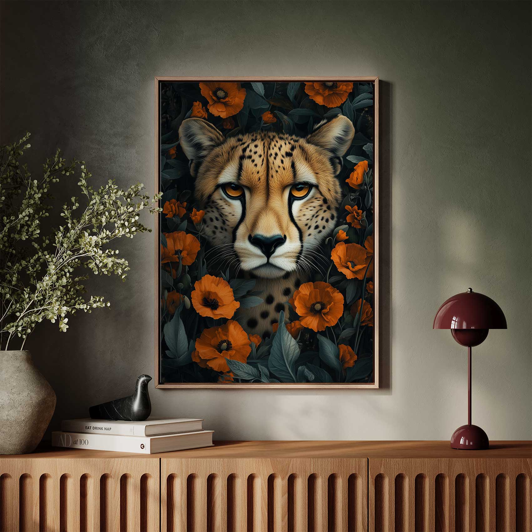 Terug naar collectie / Schilderijen / Bloemen Schilderij / Cheetah tussen oranje bloemen