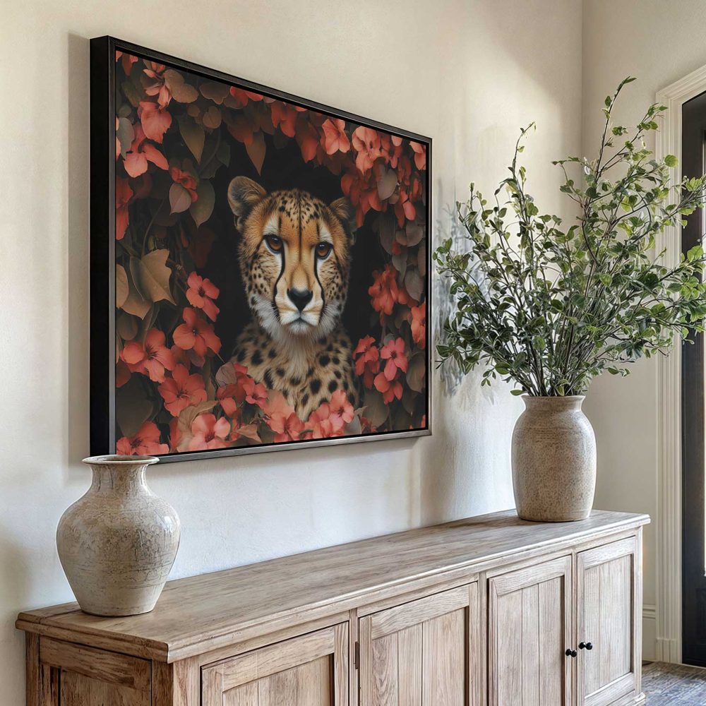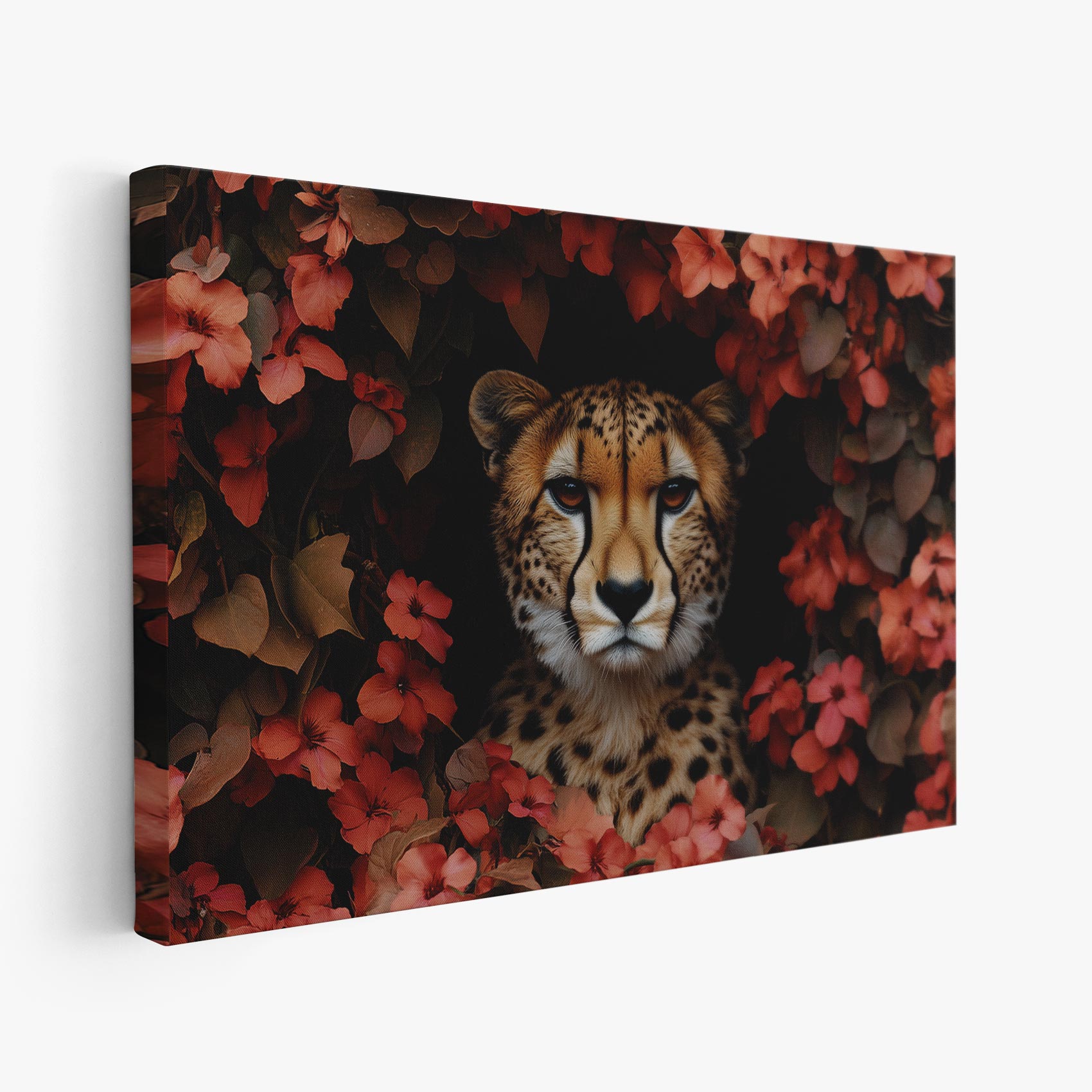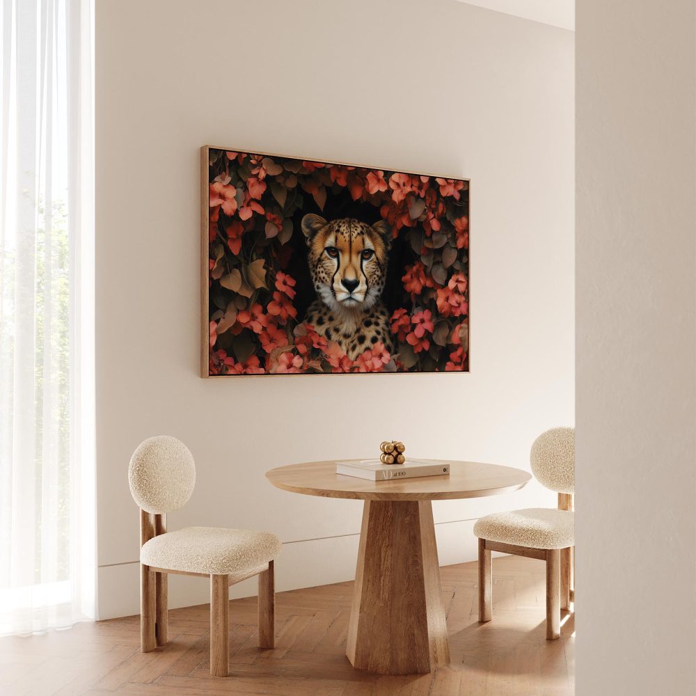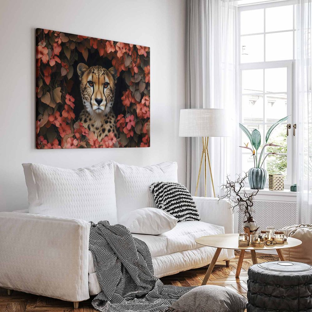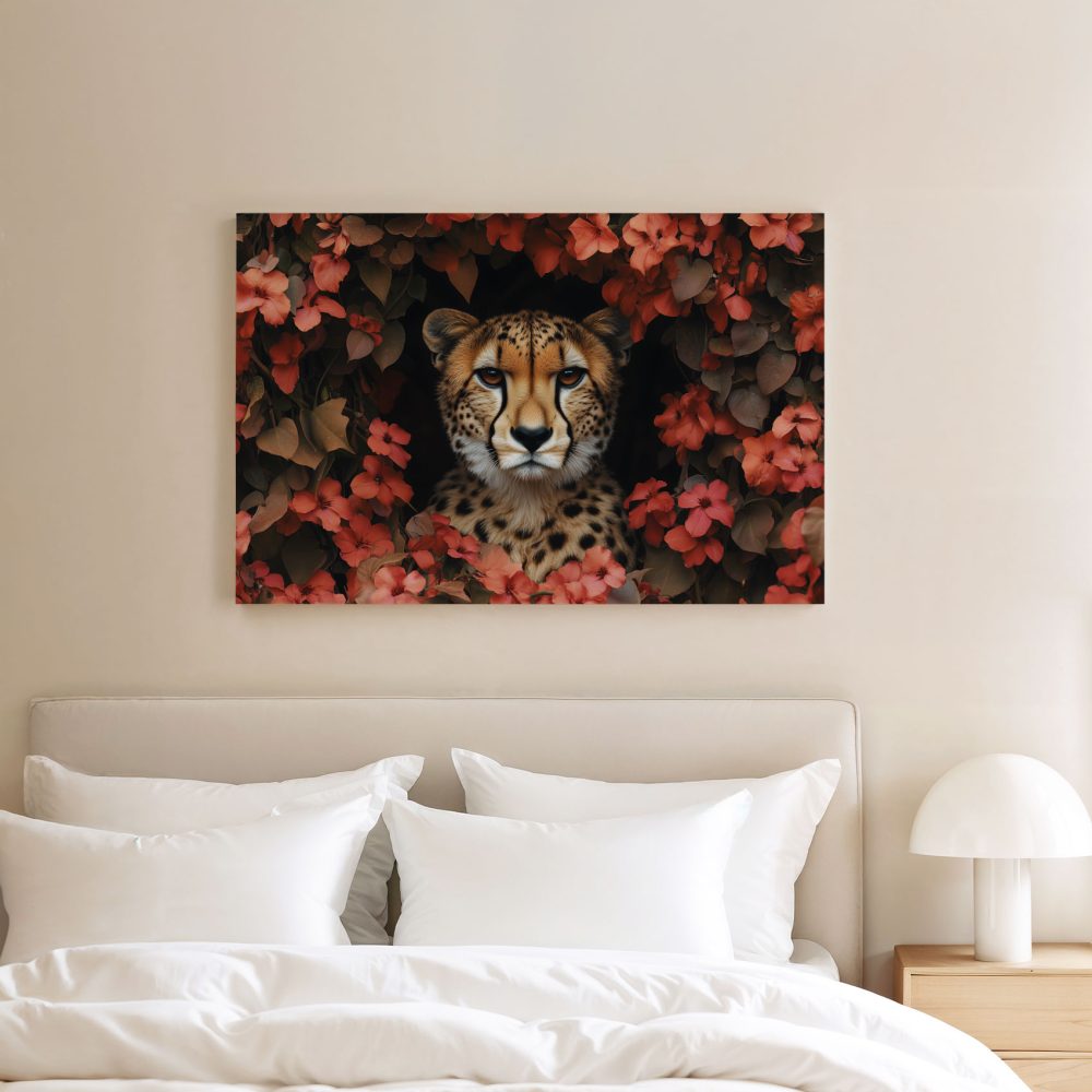 Terug naar collectie / Schilderijen / Bloemen Schilderij / Cheetah tussen rode bloemen
