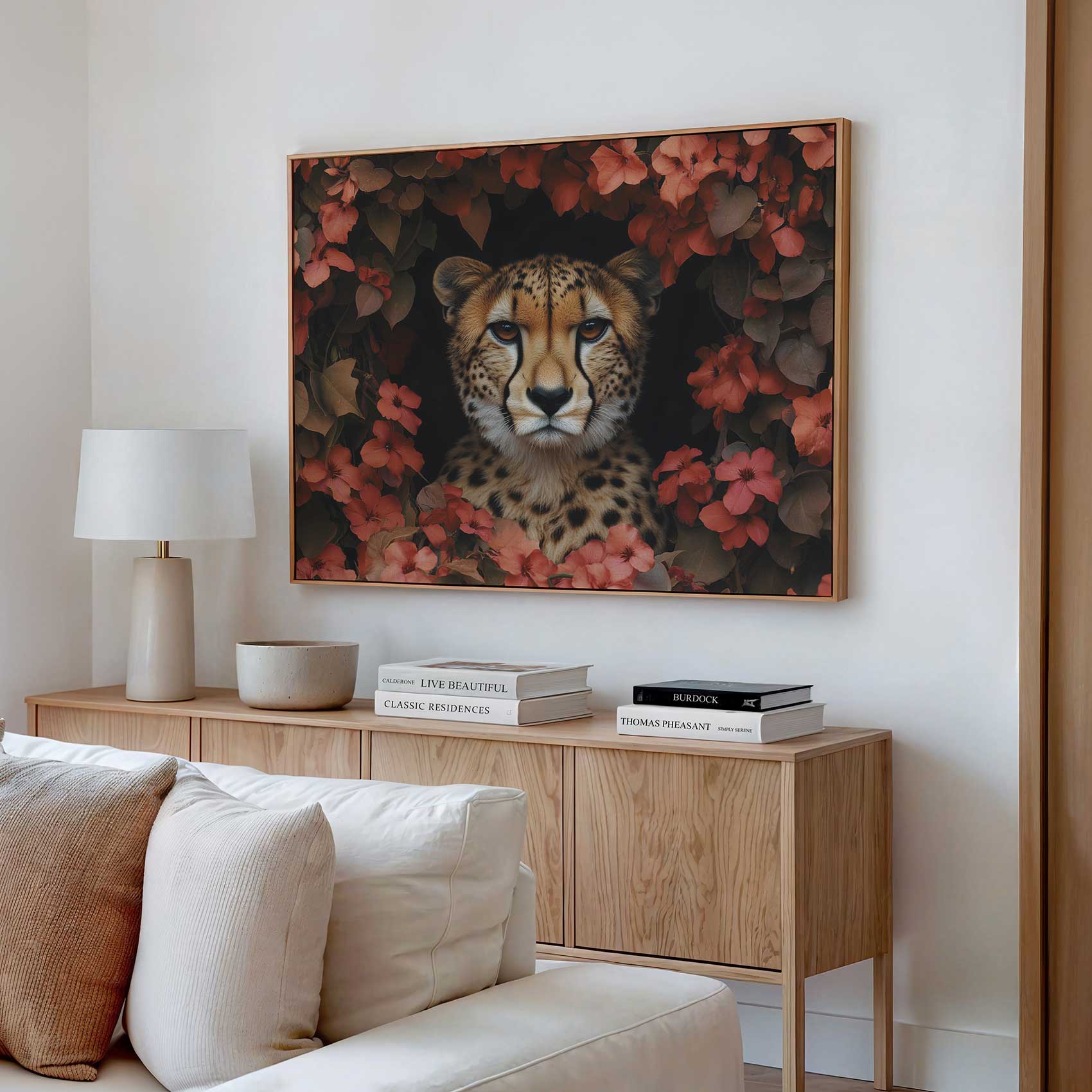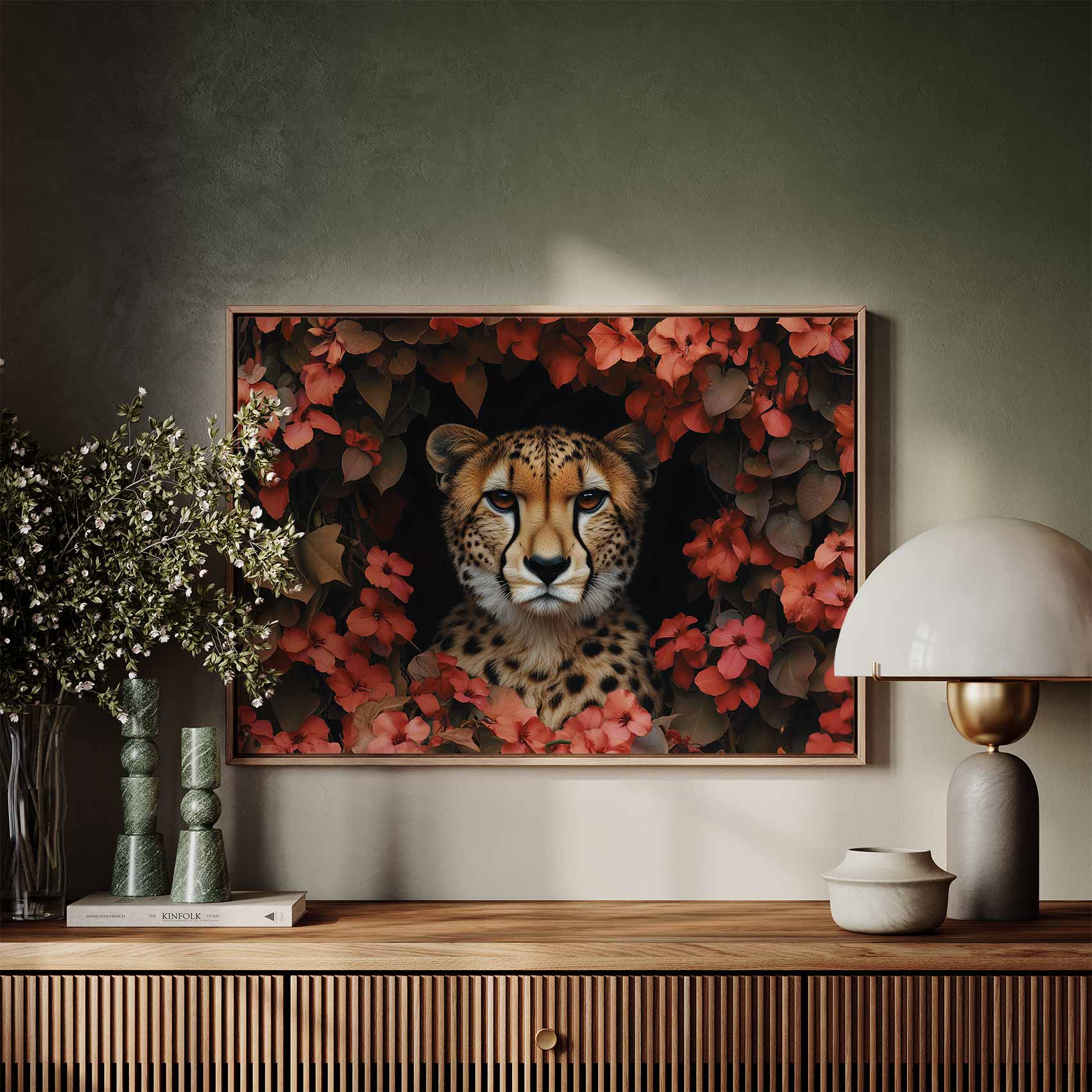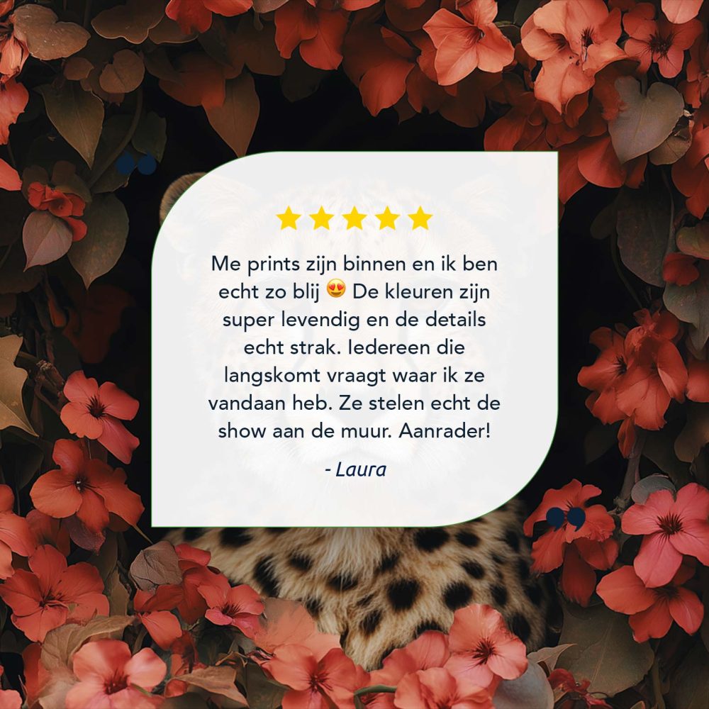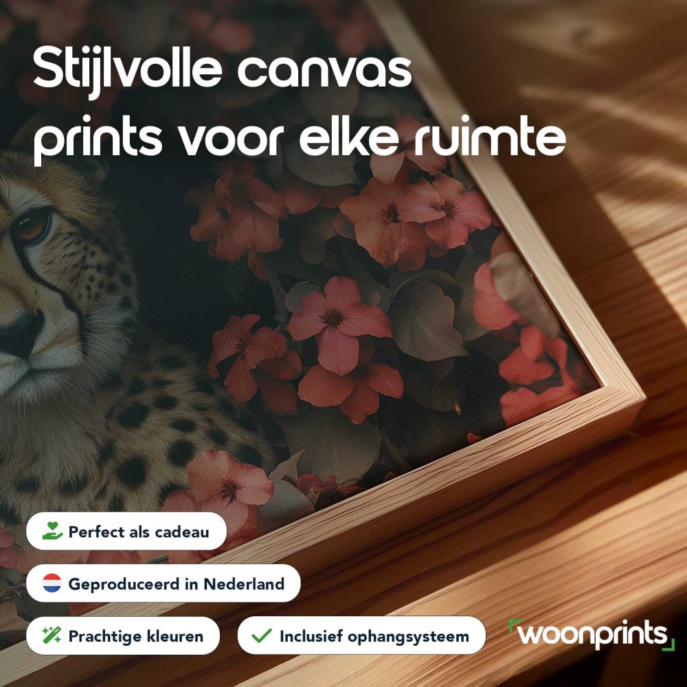 Terug naar collectie / Schilderijen / Bloemen Schilderij / Cheetah tussen rode bloemen