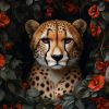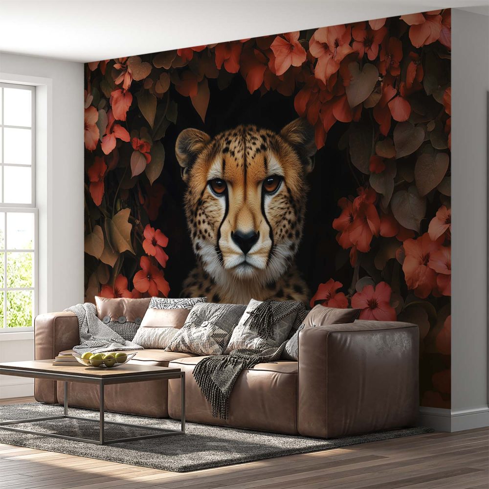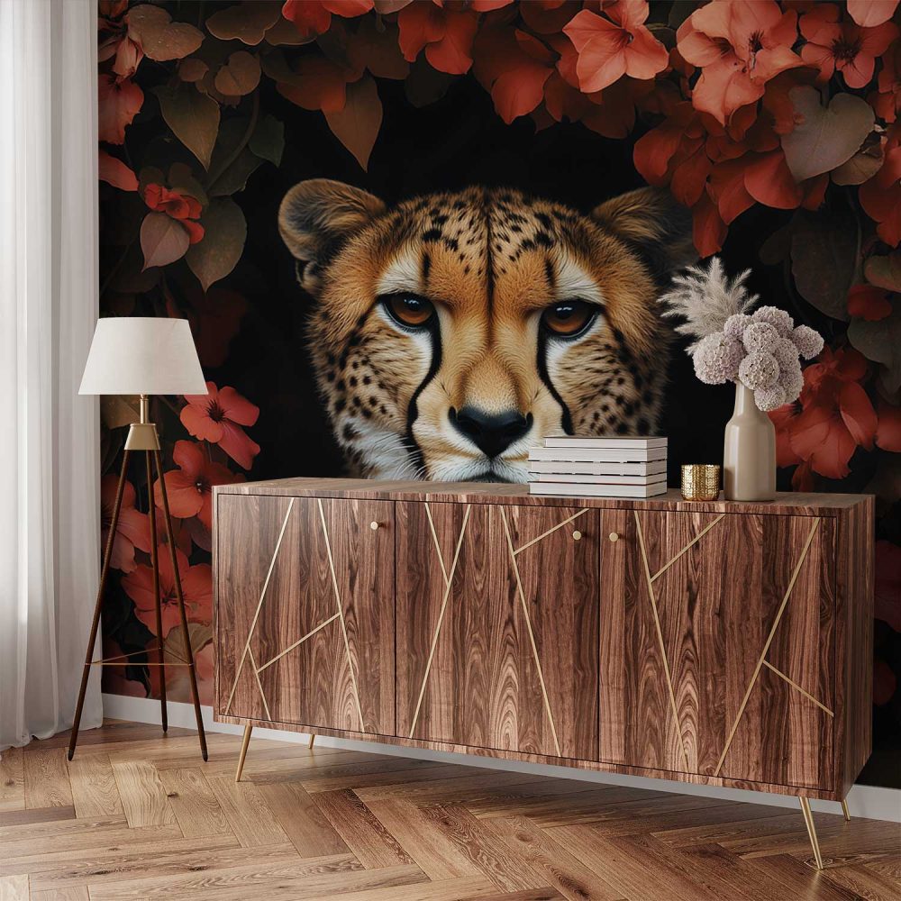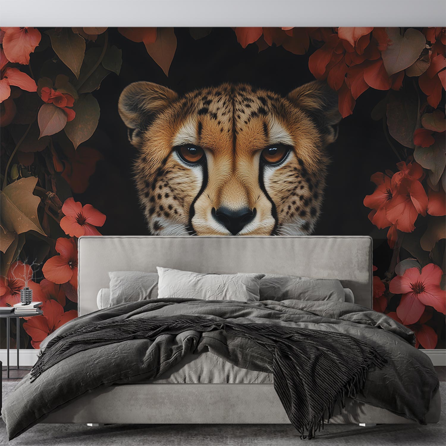 Terug naar collectie / Behang / Cheetah tussen rode bloemen behang