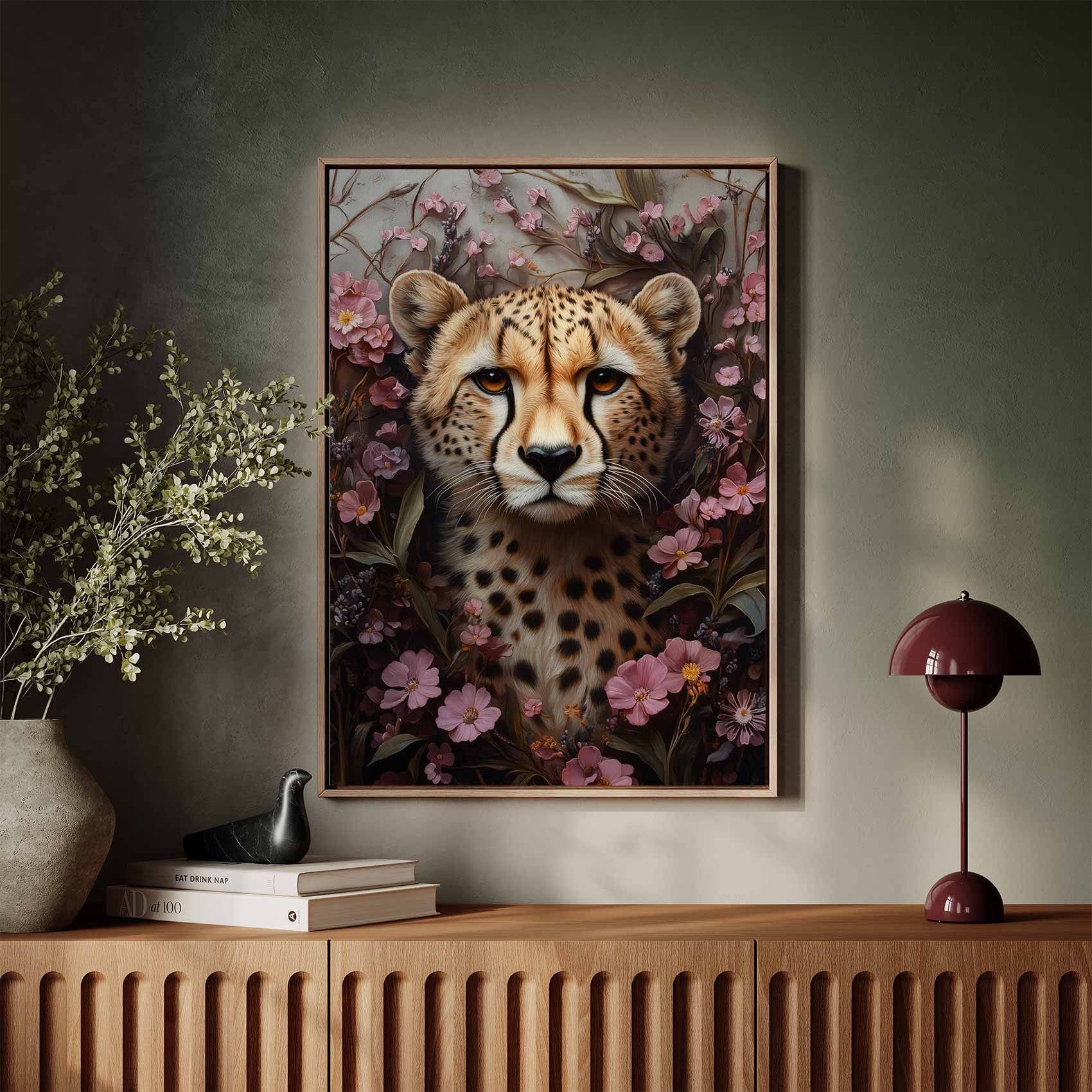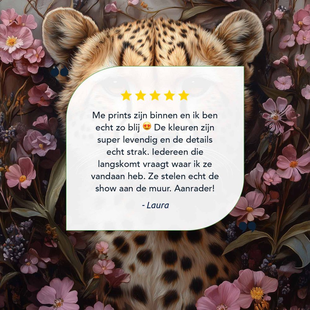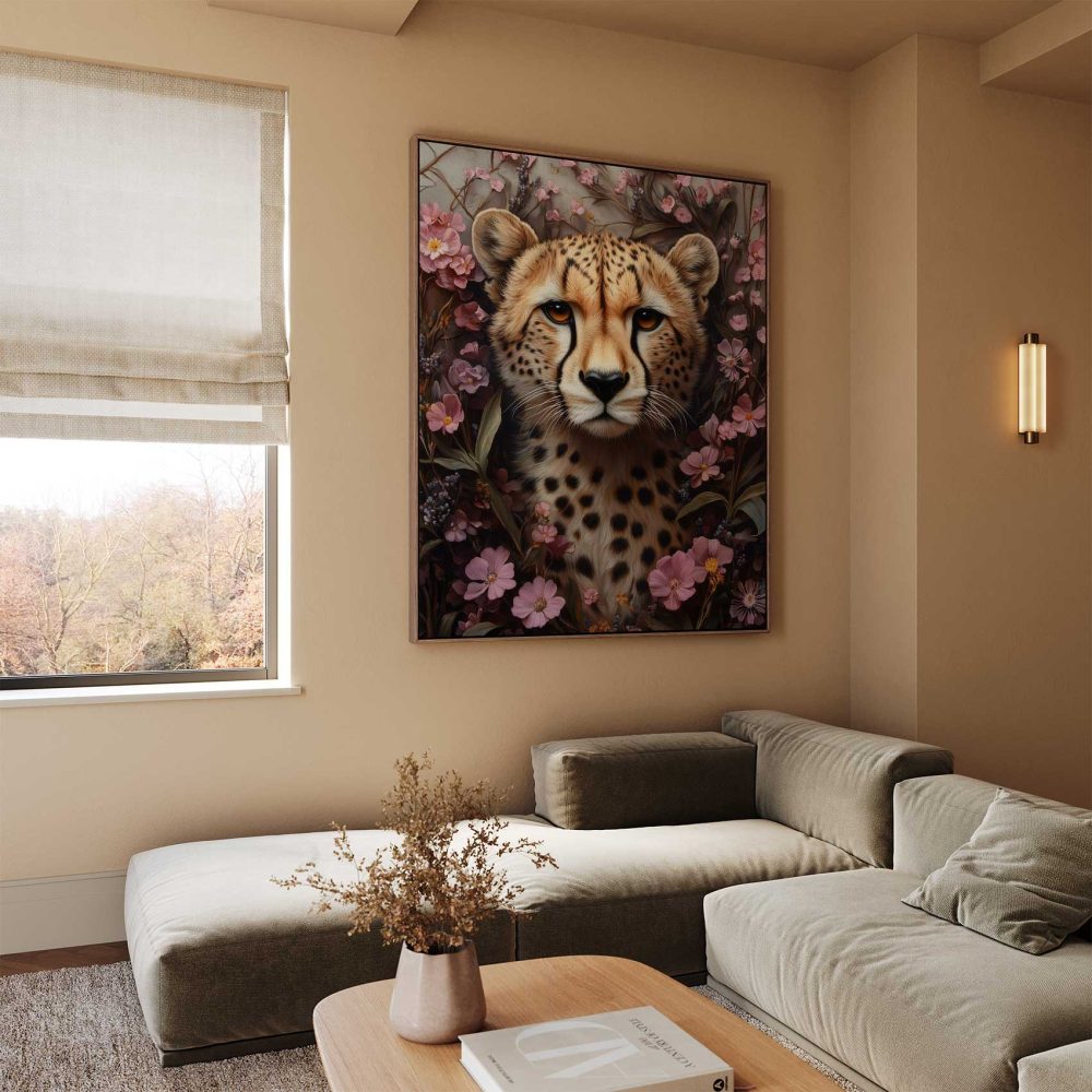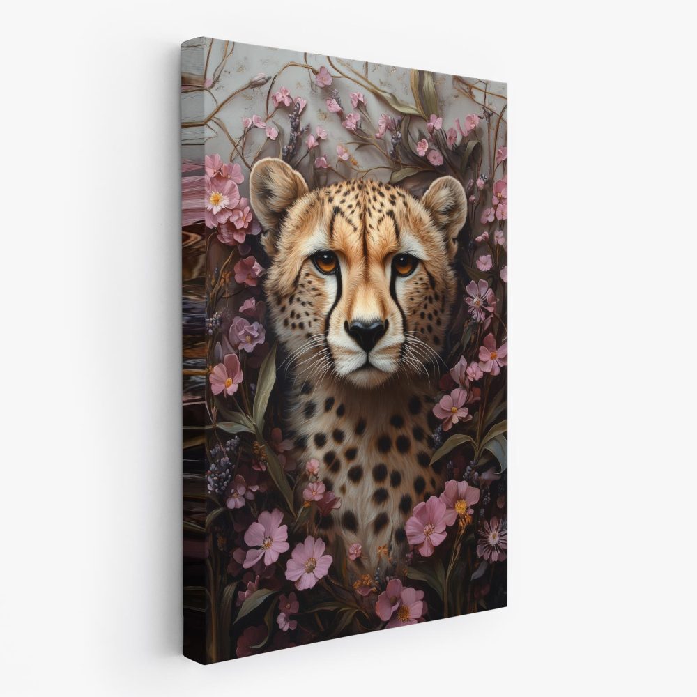 Terug naar collectie / Schilderijen / Bloemen Schilderij / Cheetah tussen roze bloemen
