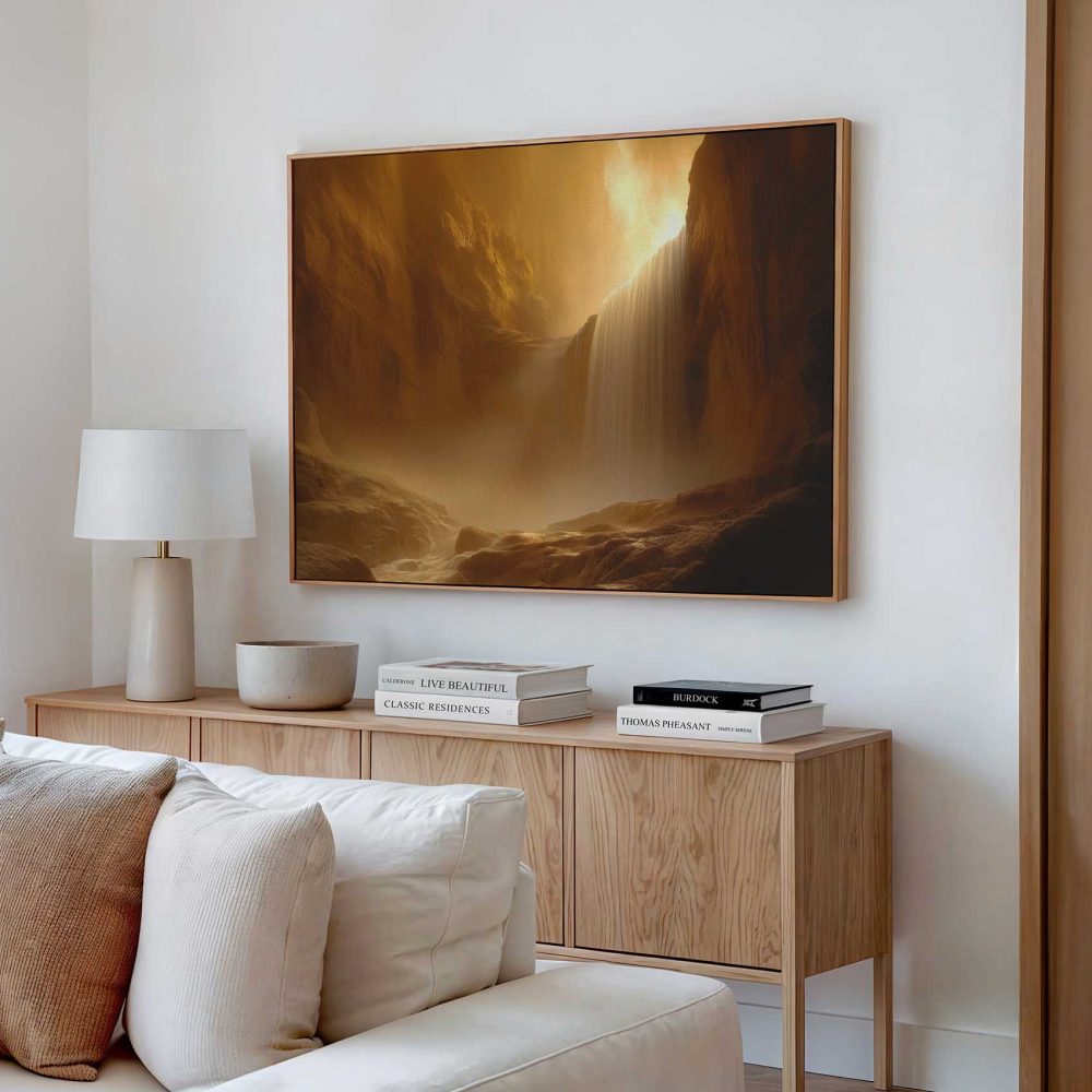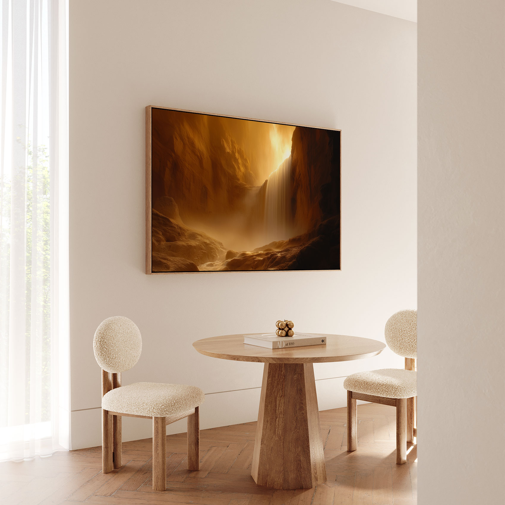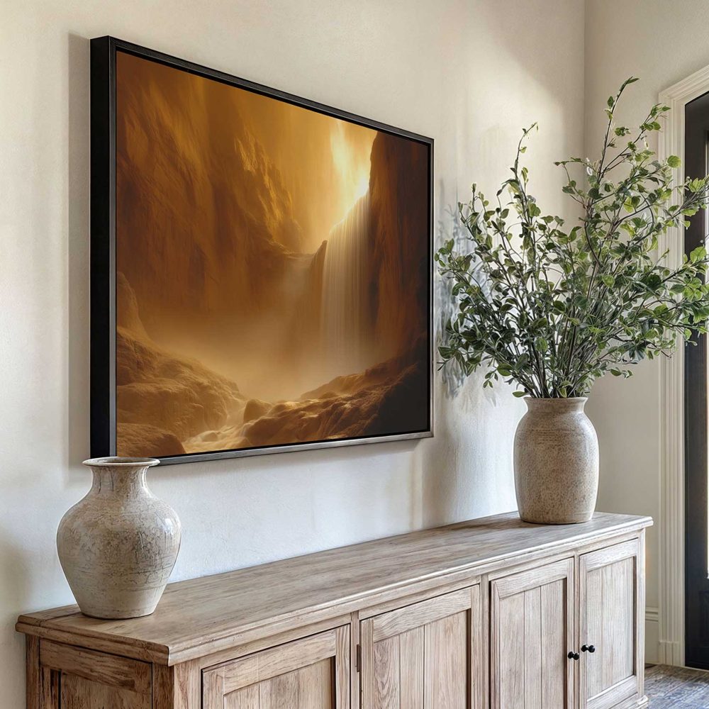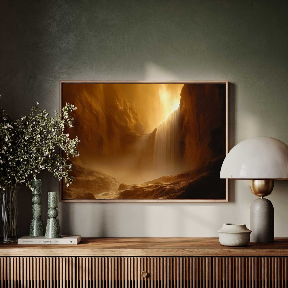 Terug naar collectie / Schilderijen / Bergen Schilderij / Dramatische waterval in oranje gloed