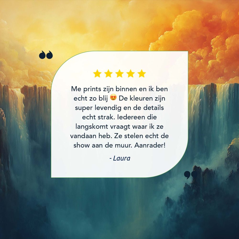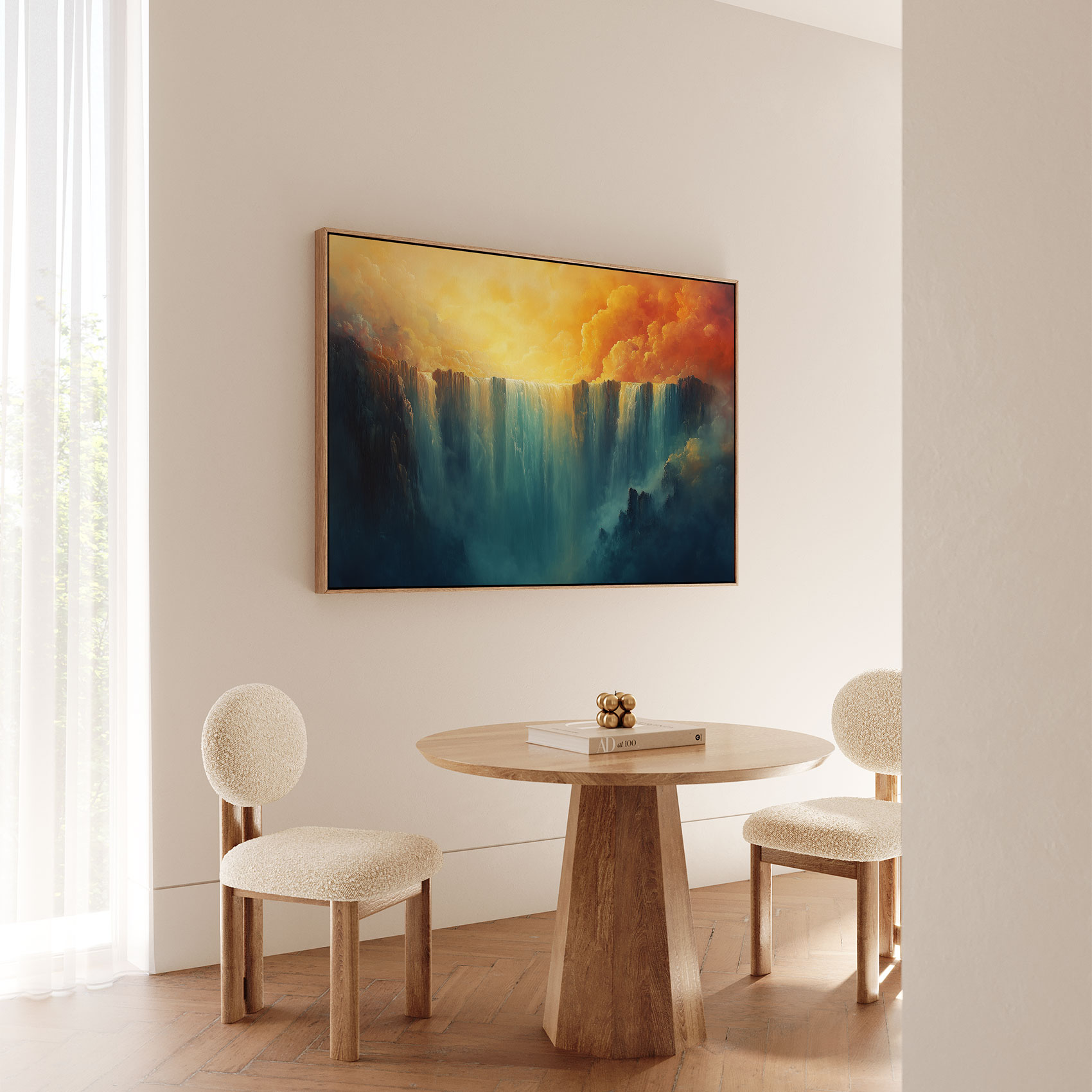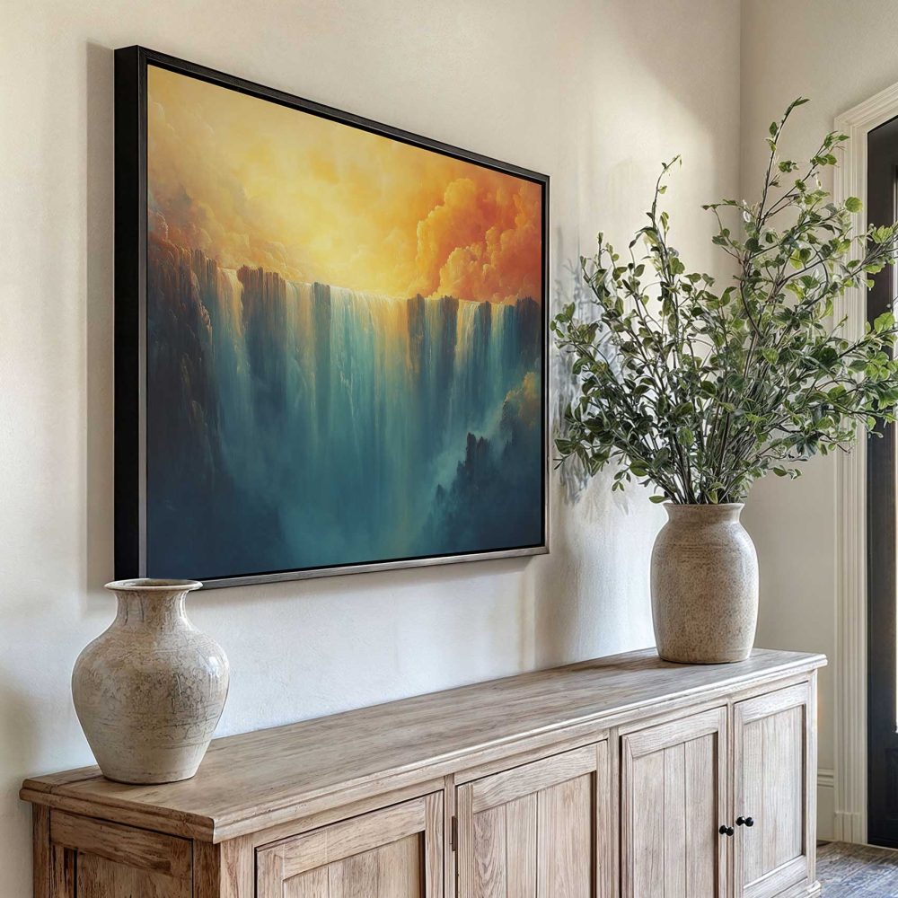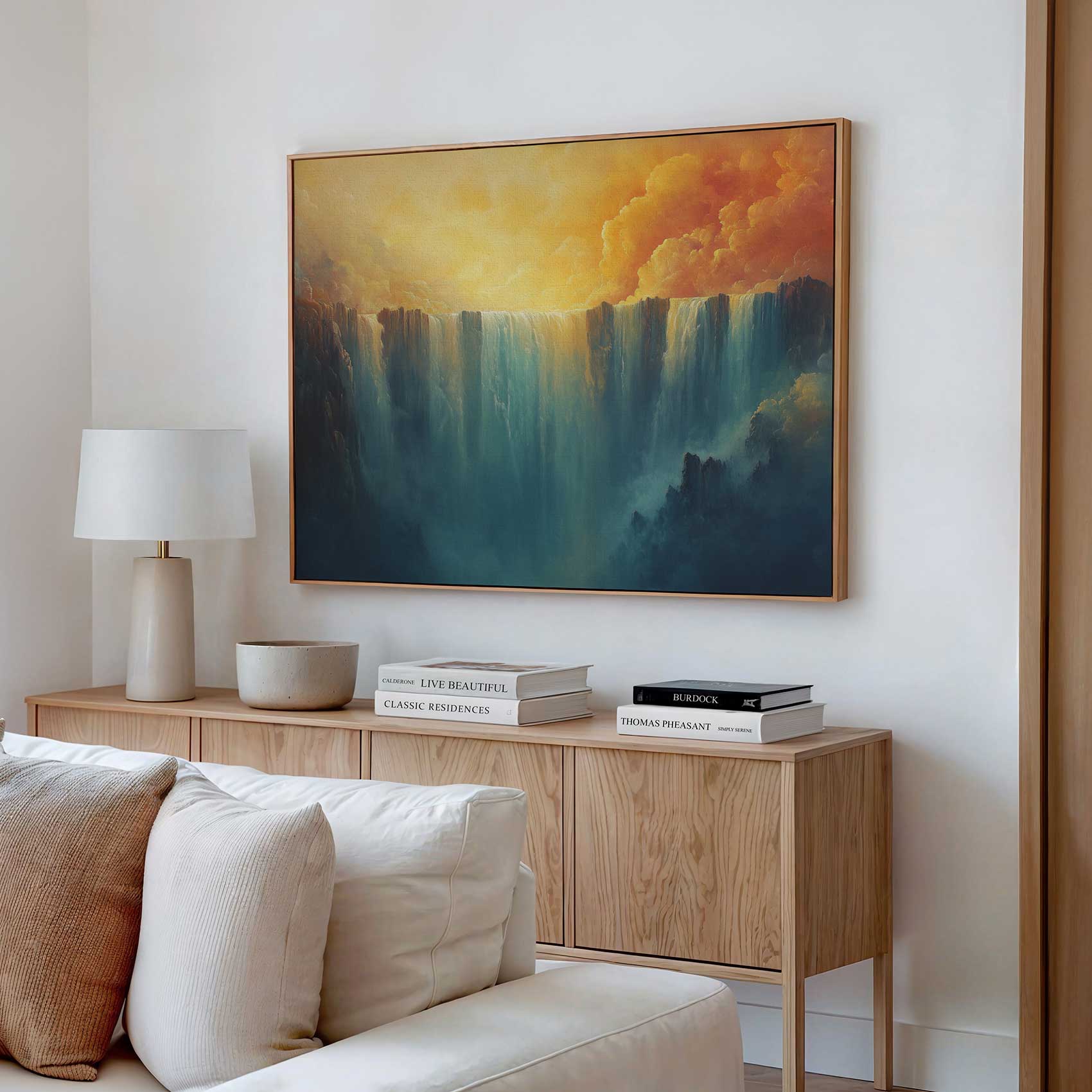 Terug naar collectie / Schilderijen / Bergen Schilderij / Dramatische Waterval Zonsondergang