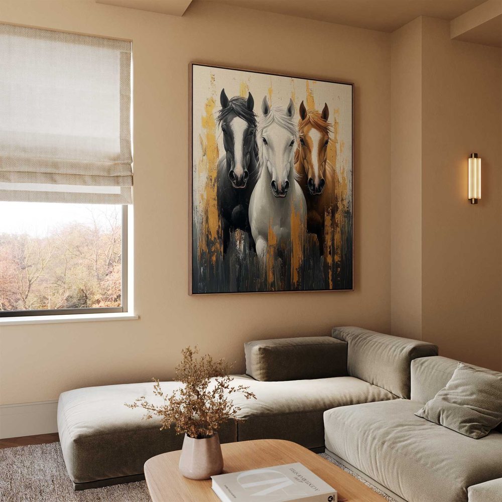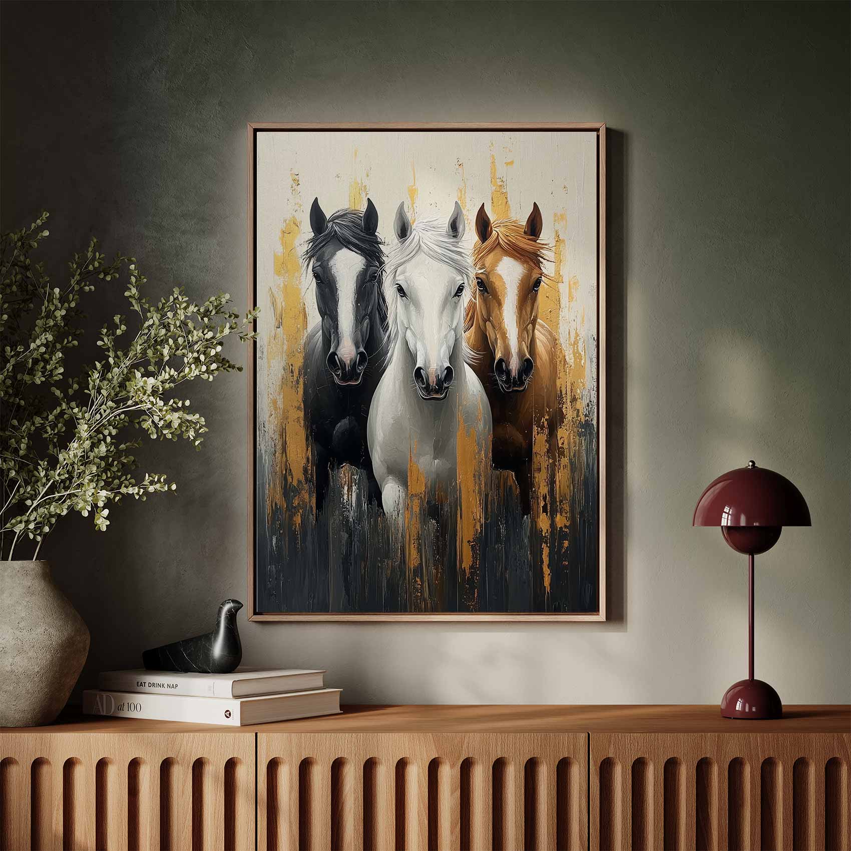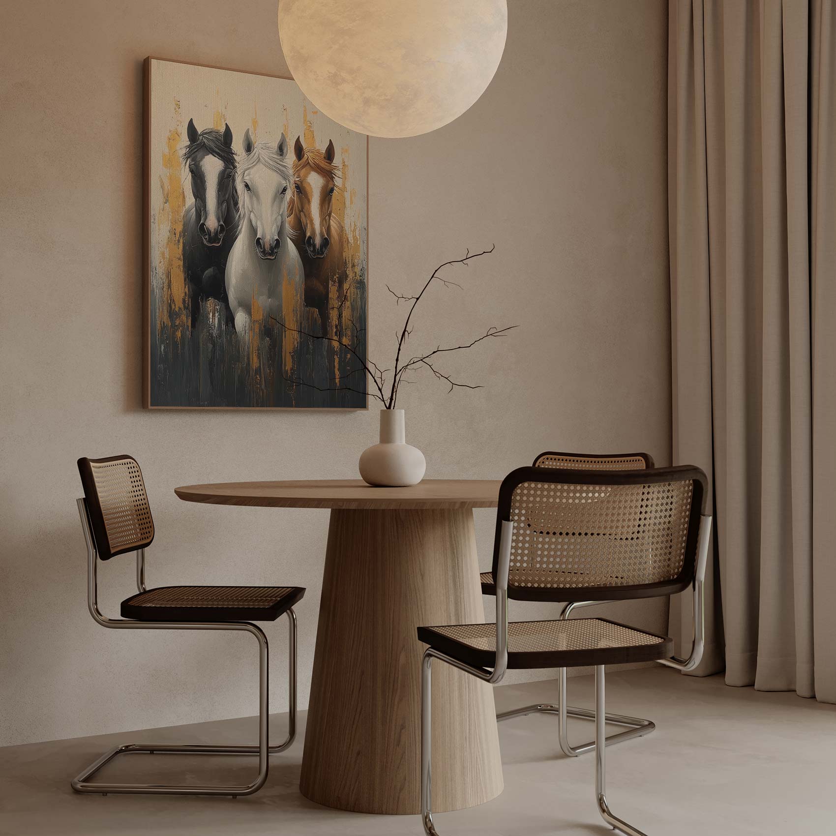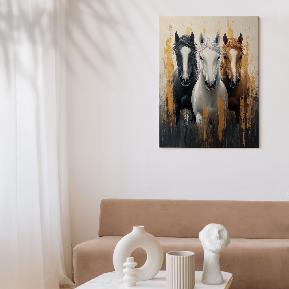 Terug naar collectie / Schilderijen / Dieren Schilderij / Drie elegante paarden in contrast