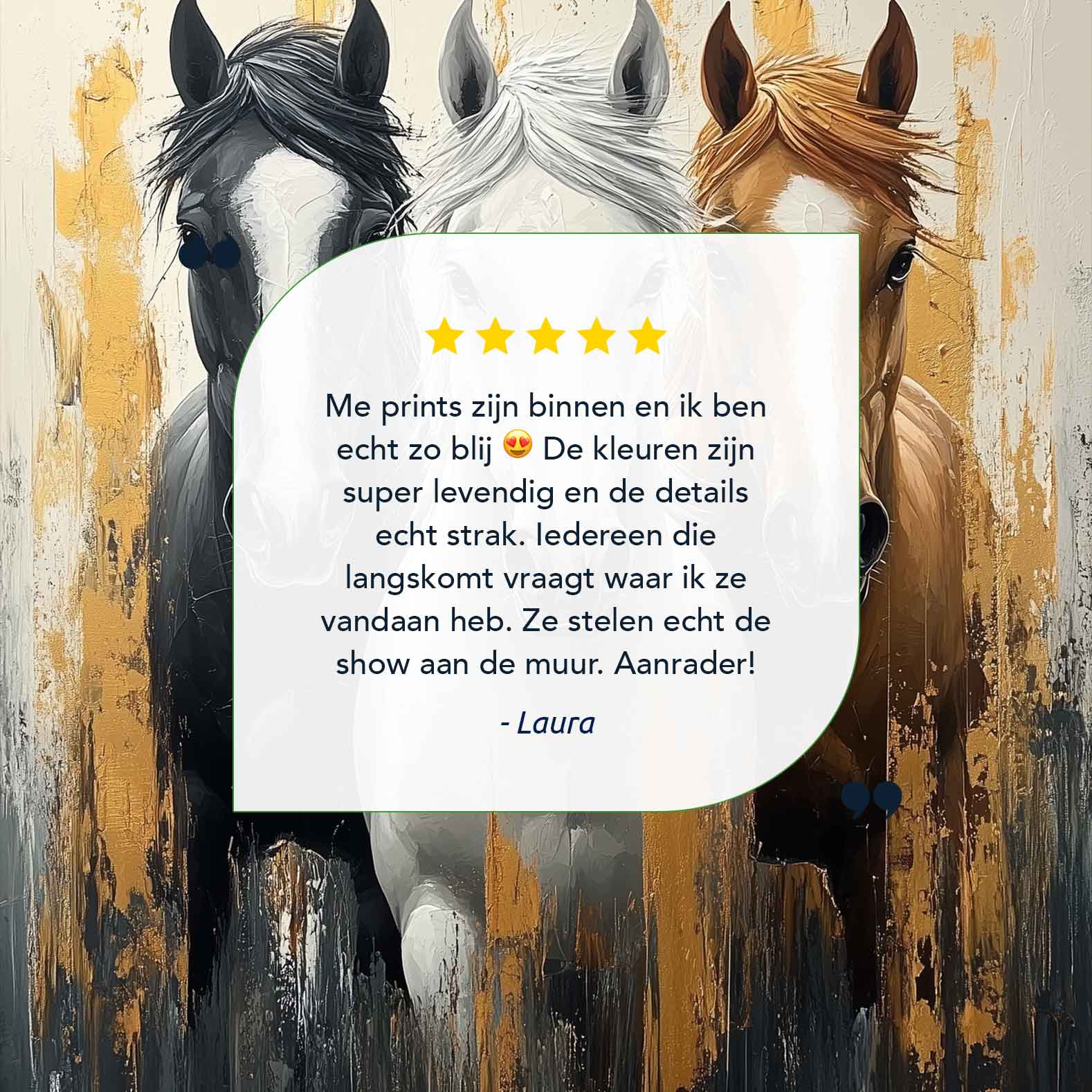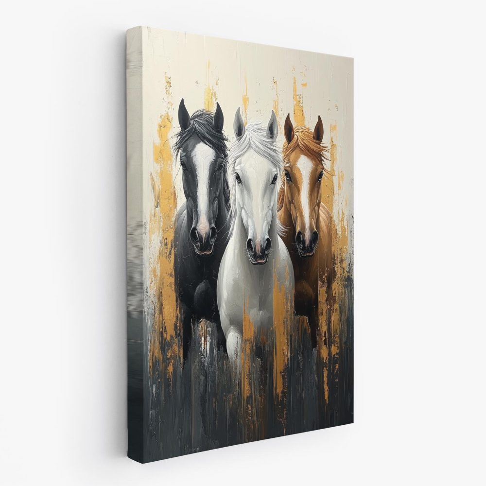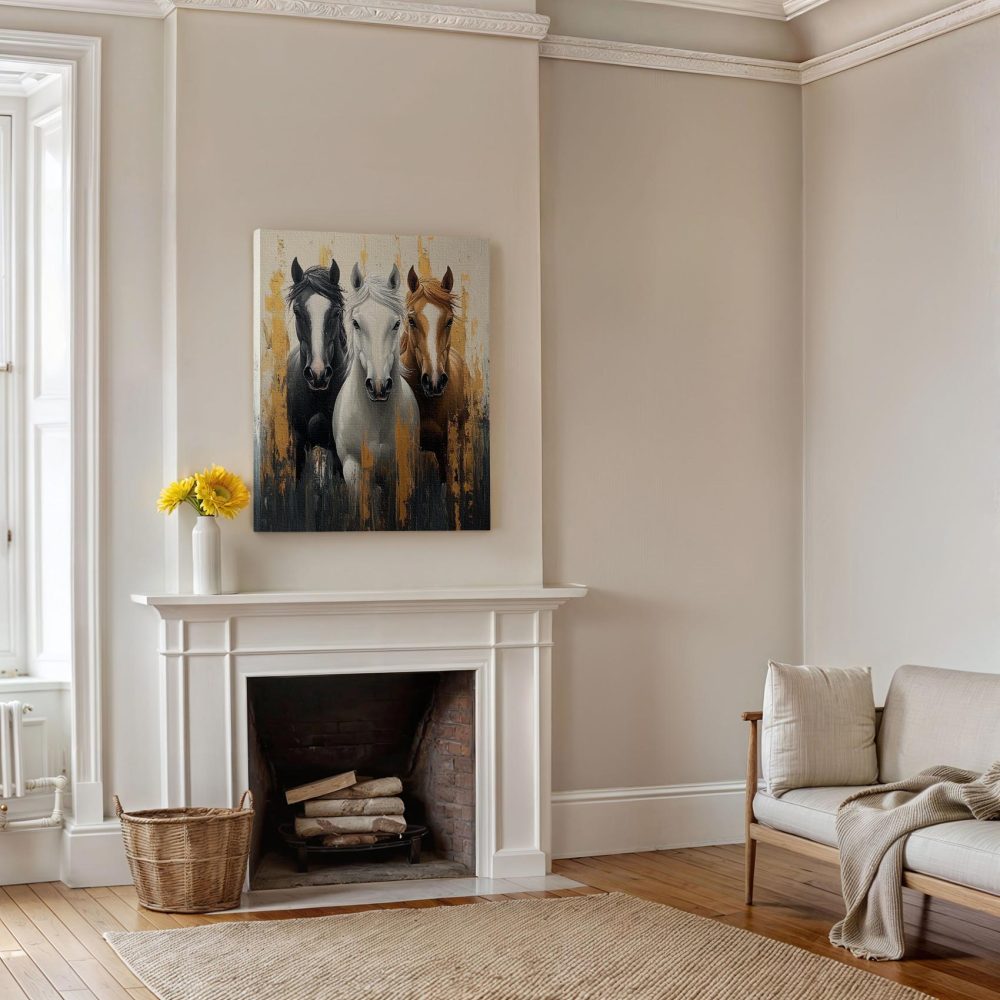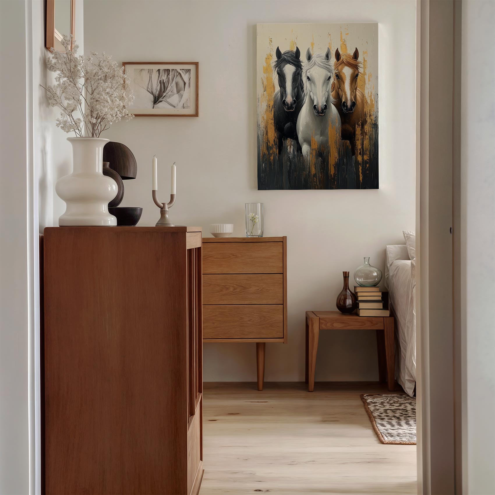 Terug naar collectie / Schilderijen / Dieren Schilderij / Drie elegante paarden in contrast