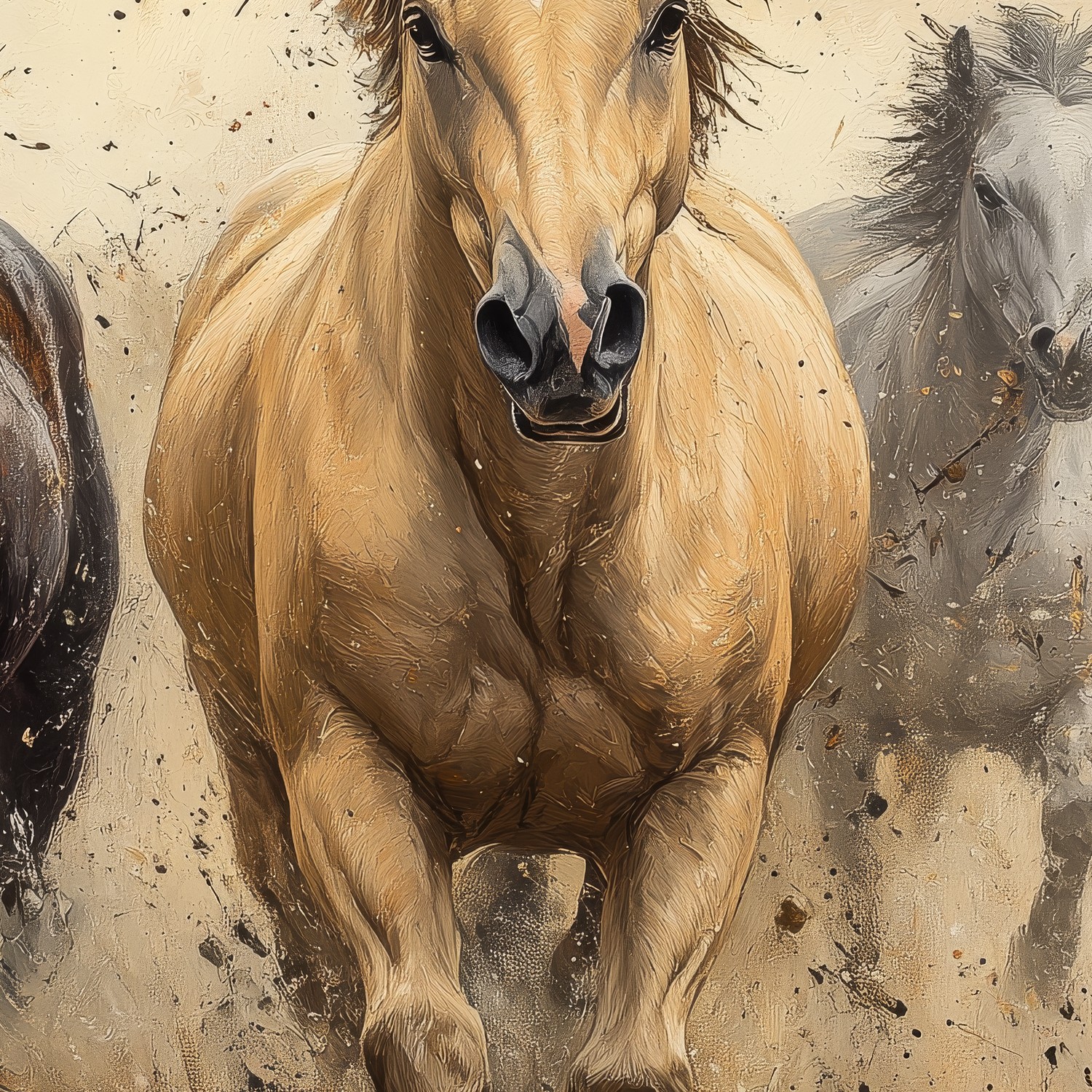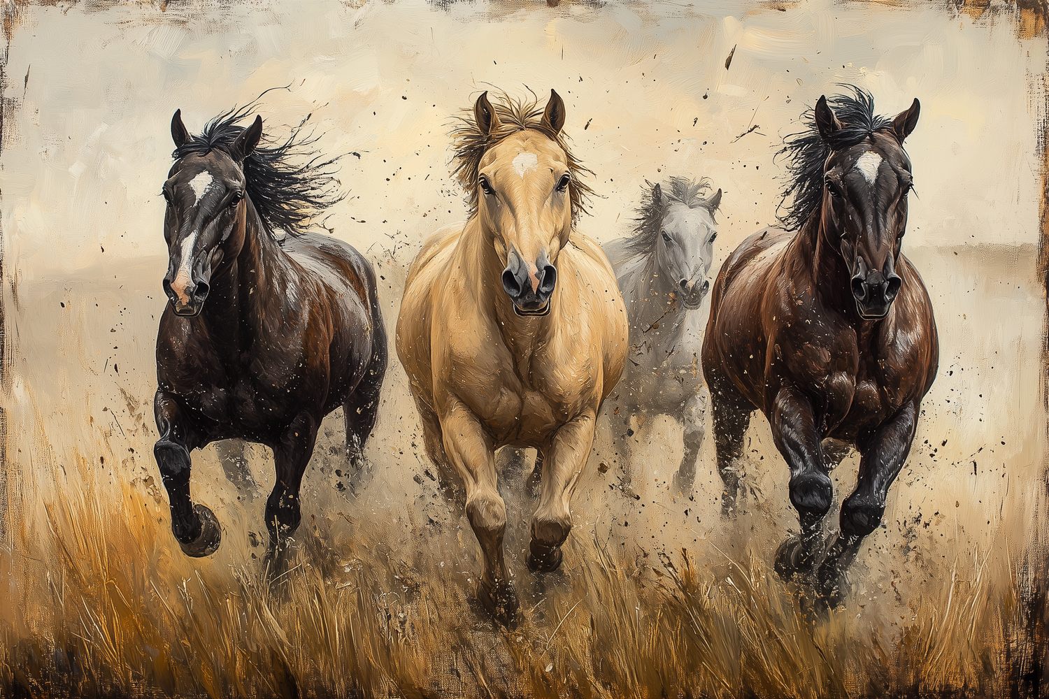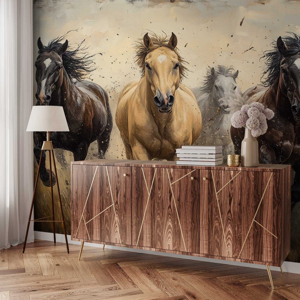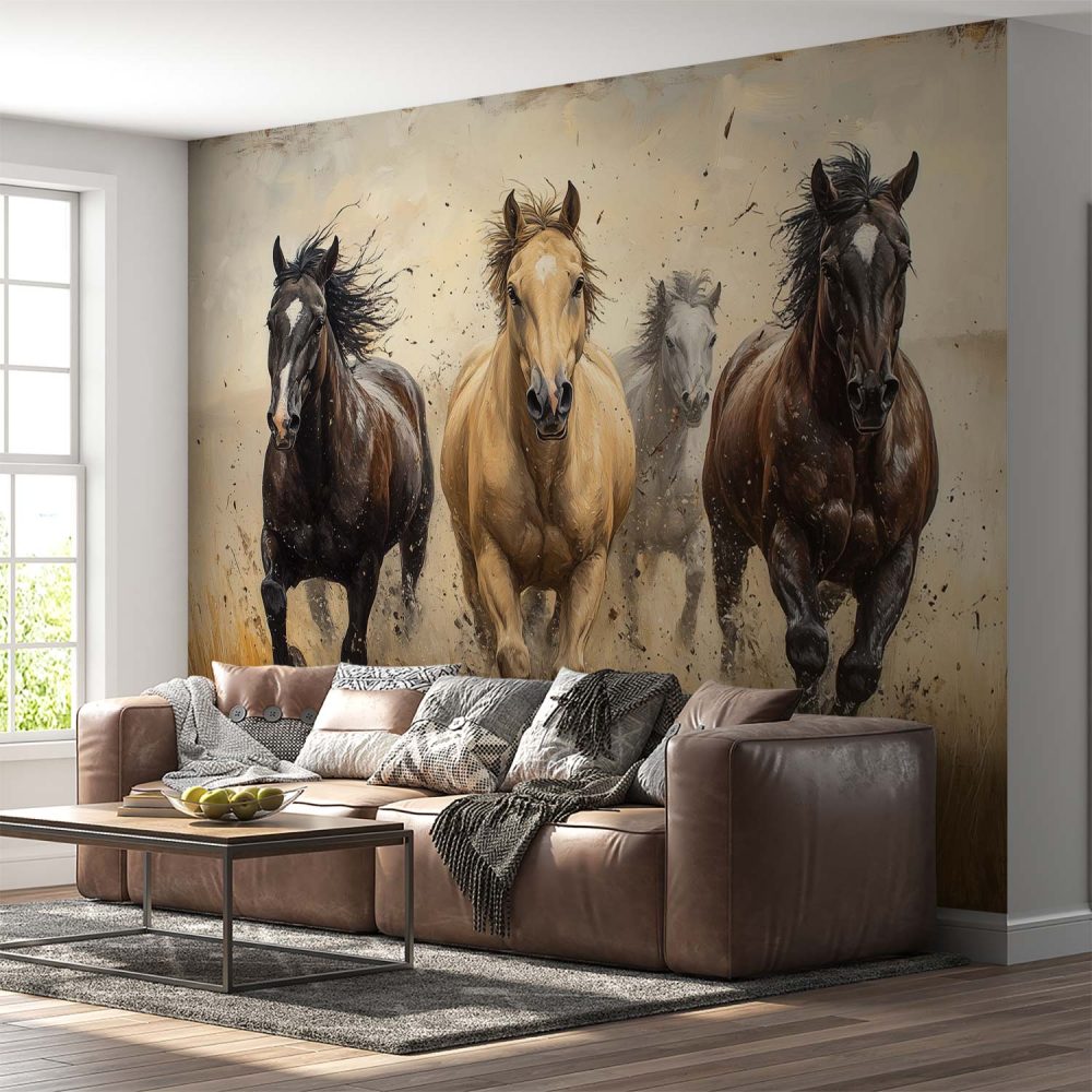 Terug naar collectie / Behang / Drie galopperende paarden in veld behang