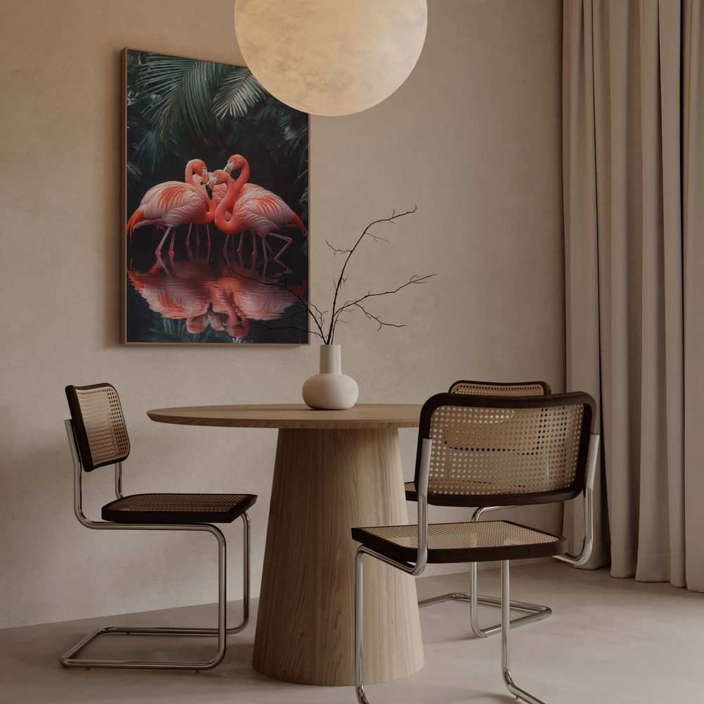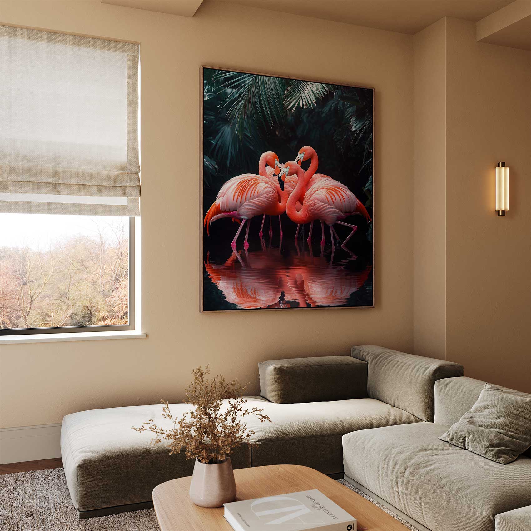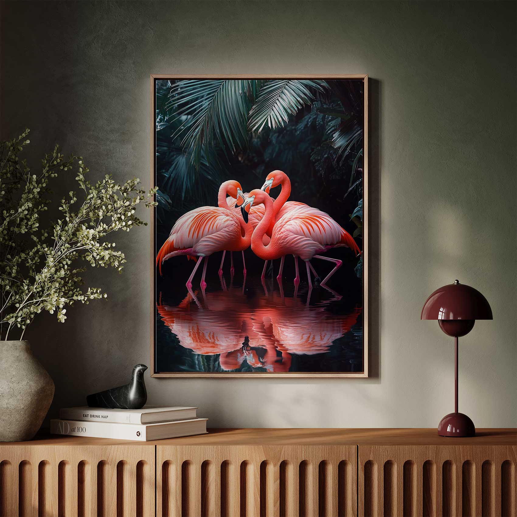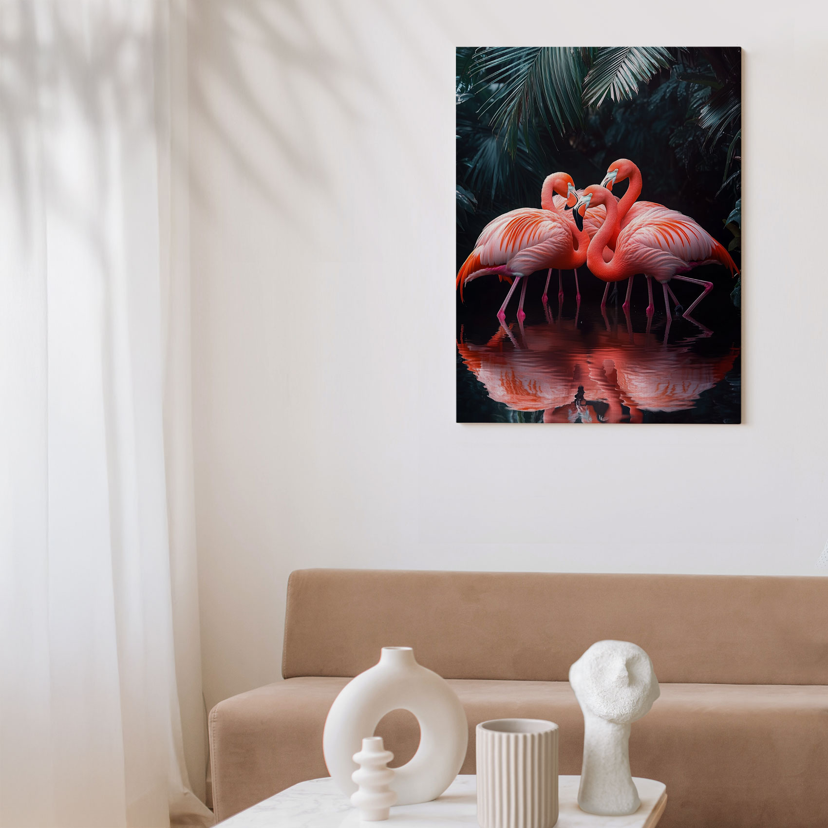 Terug naar collectie / Schilderijen / Bloemen Schilderij / Drie roze flamingo’s in harmonie