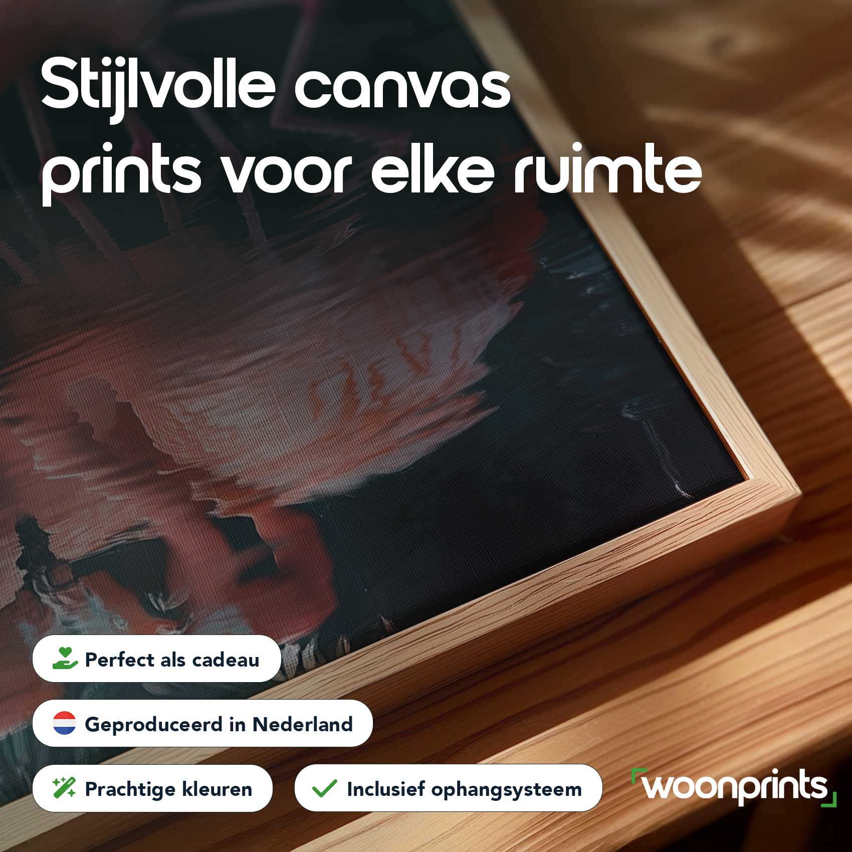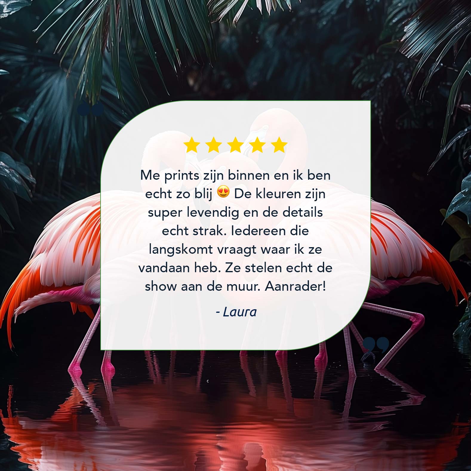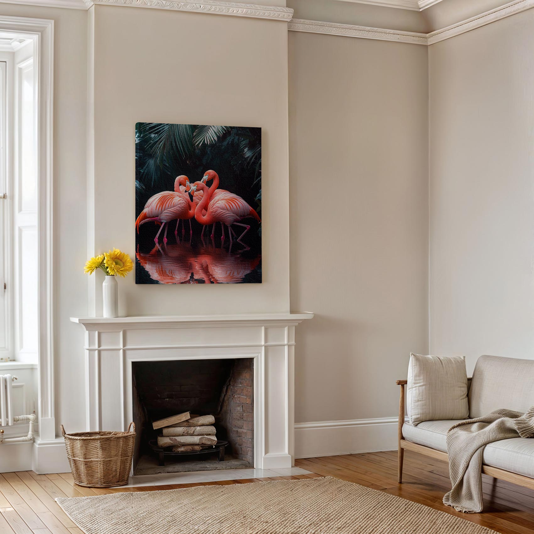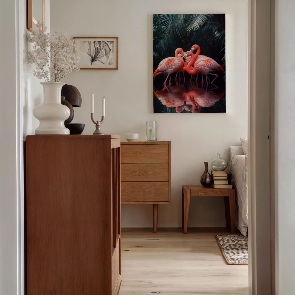 Terug naar collectie / Schilderijen / Bloemen Schilderij / Drie roze flamingo’s in harmonie