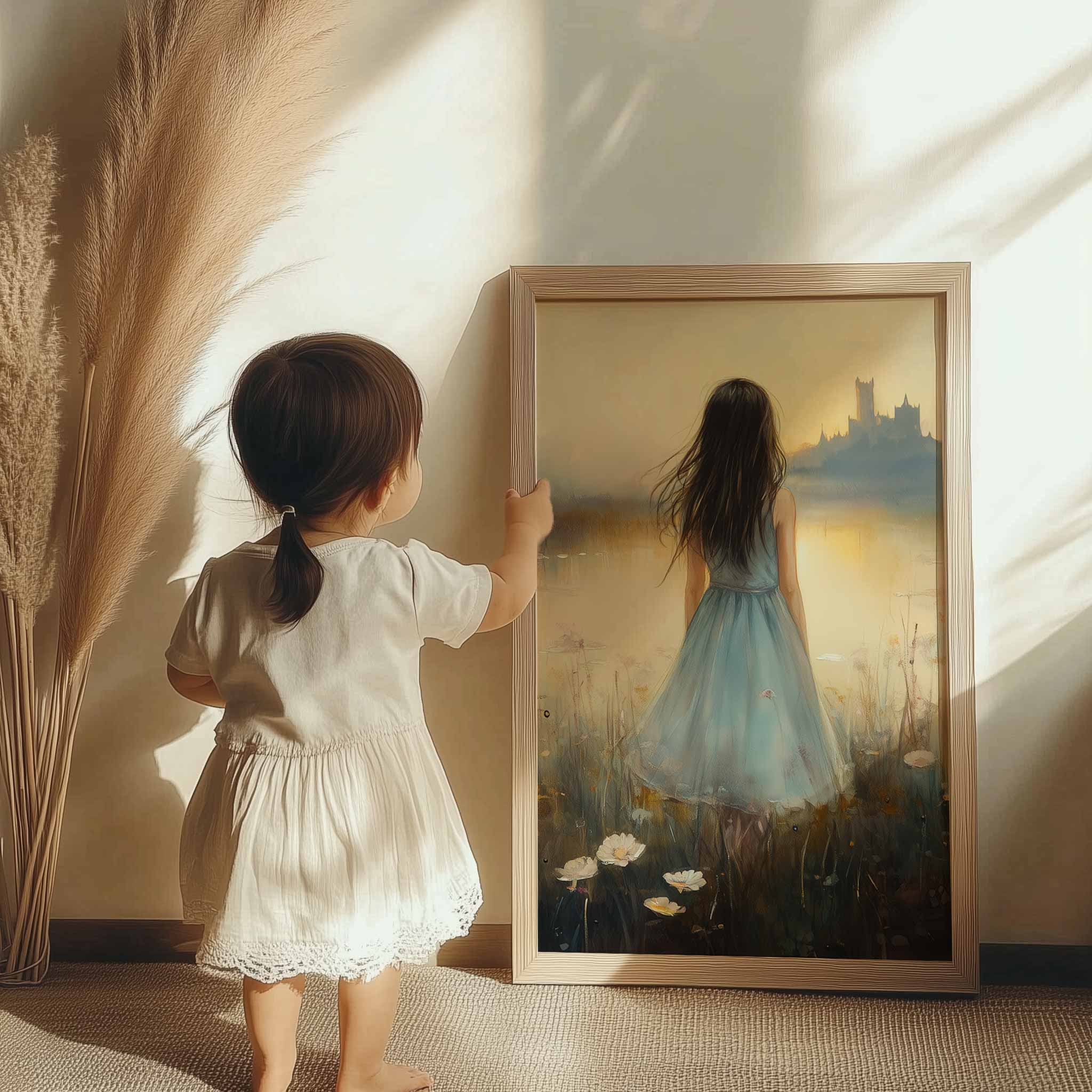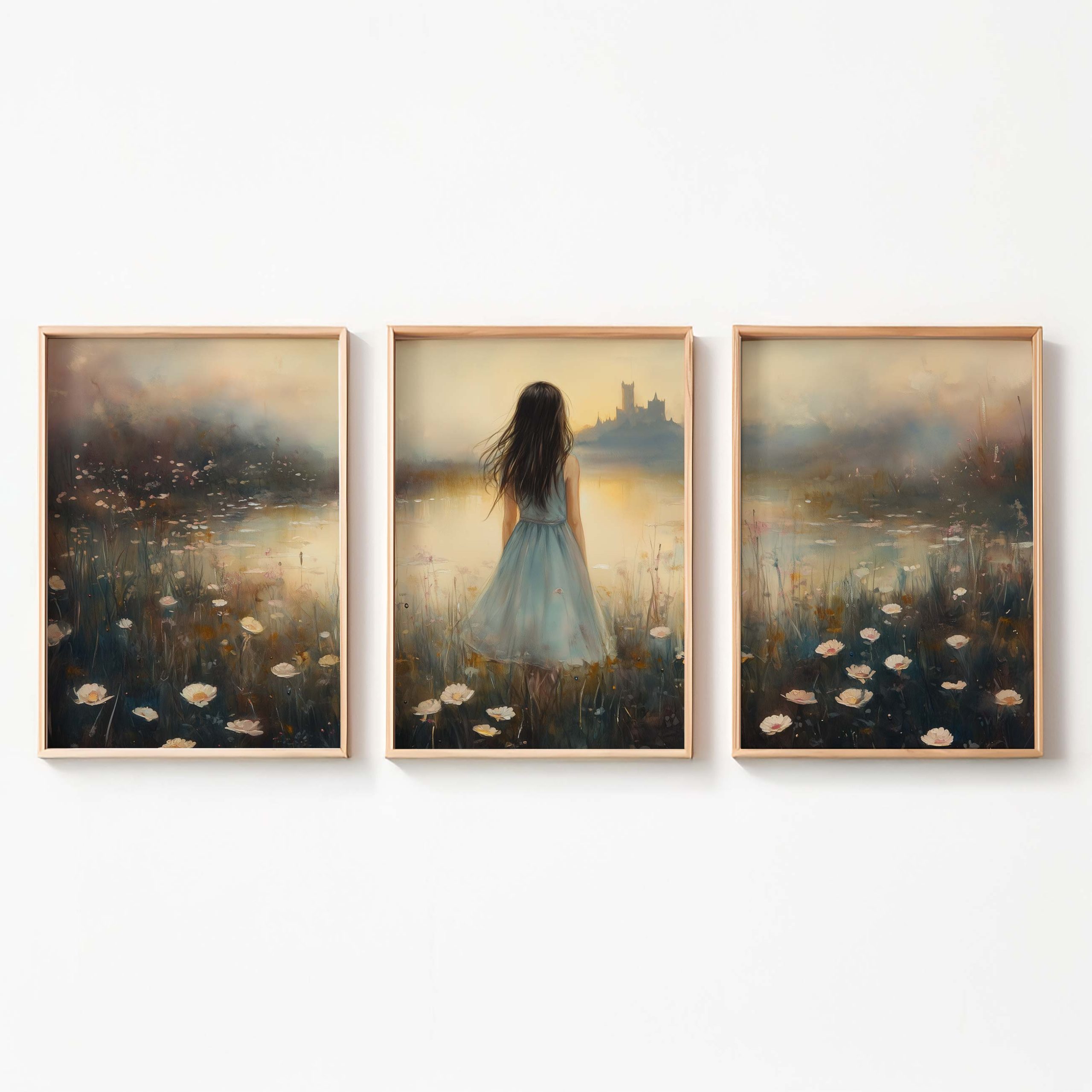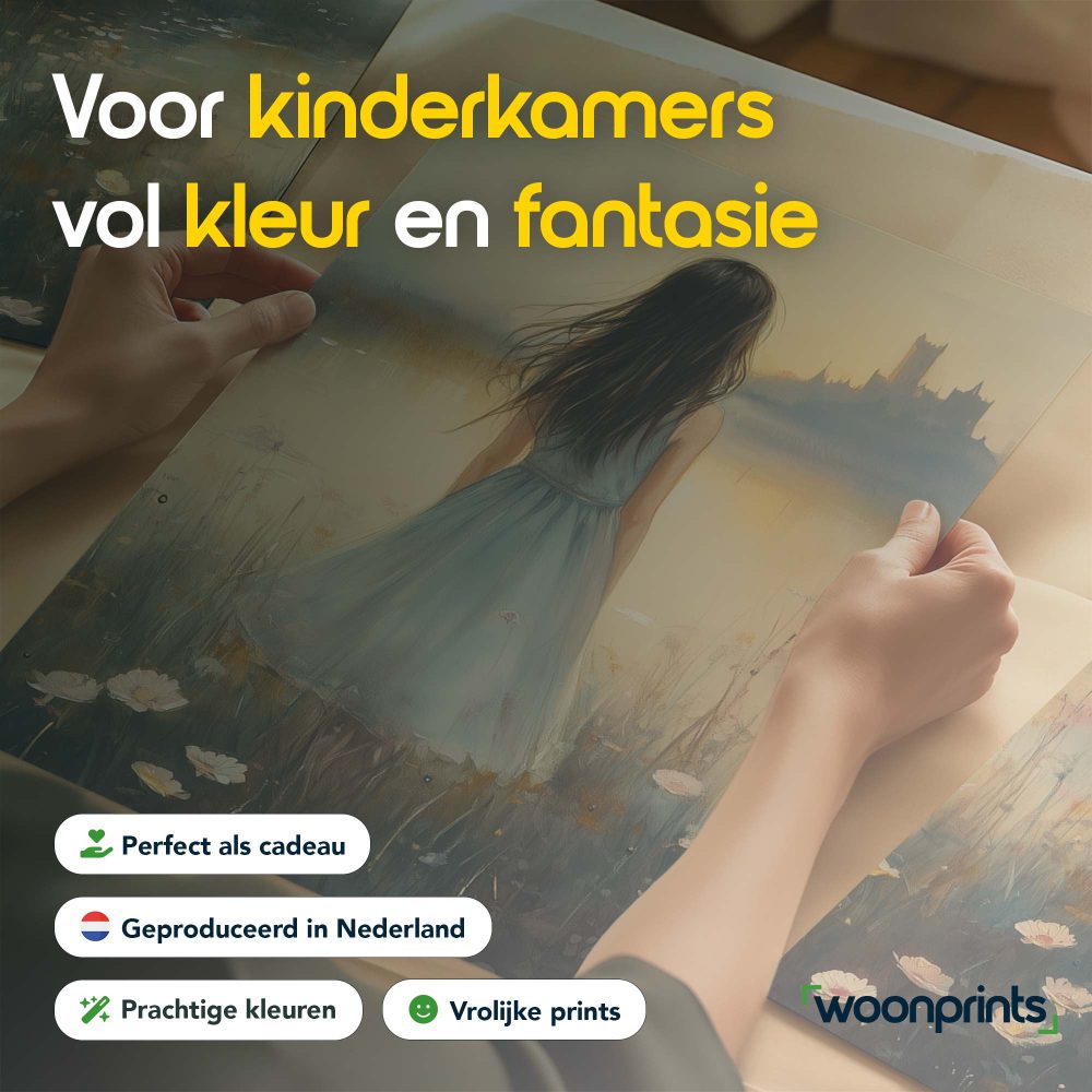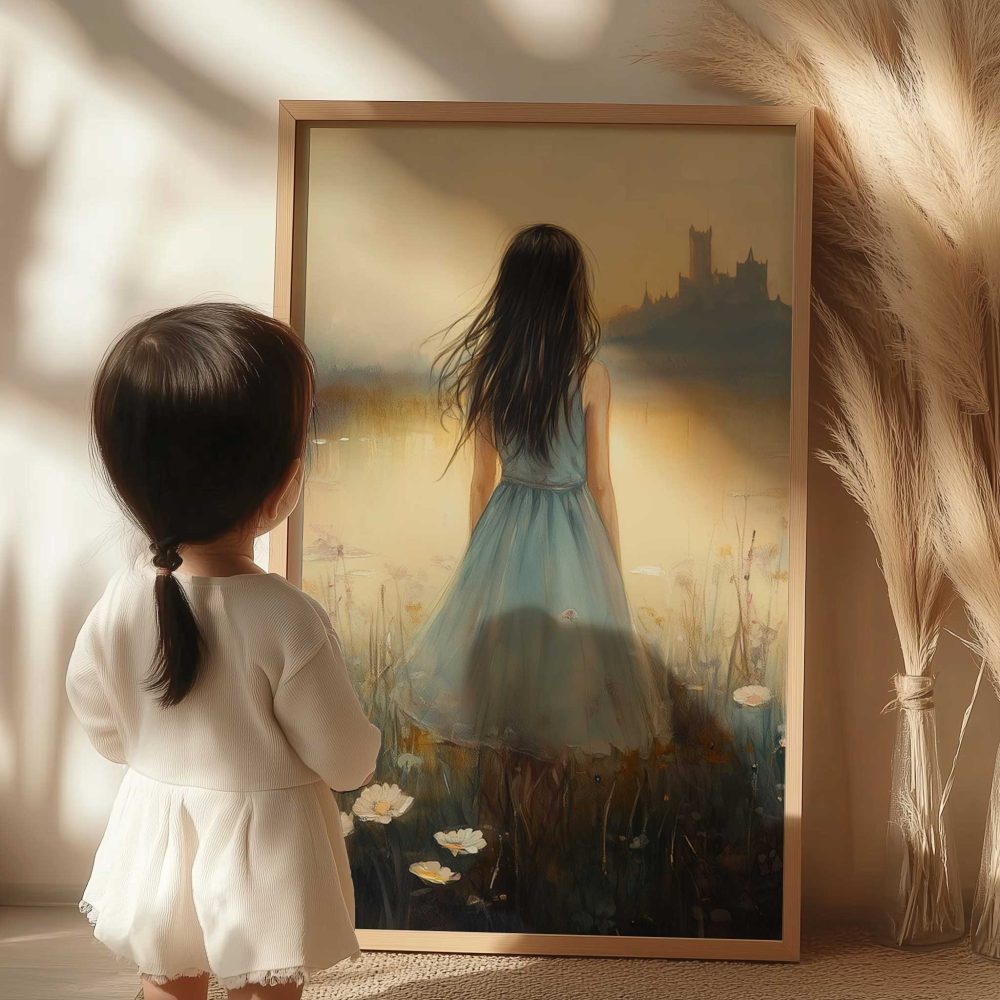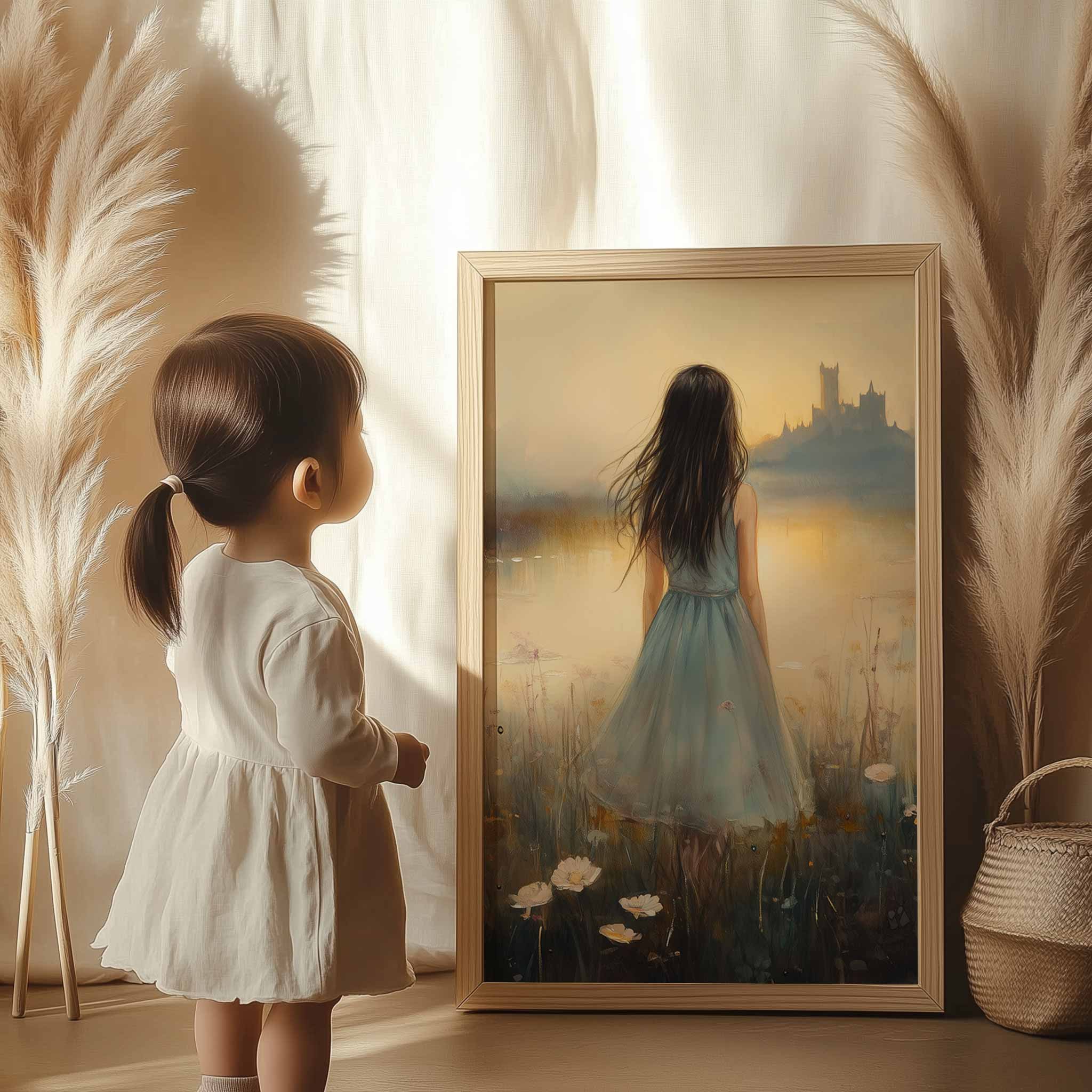 Terug naar collectie / Kinderkamer posters / Bloemen posters / Dromerig bloemenveld met kasteel en blauwe jurk