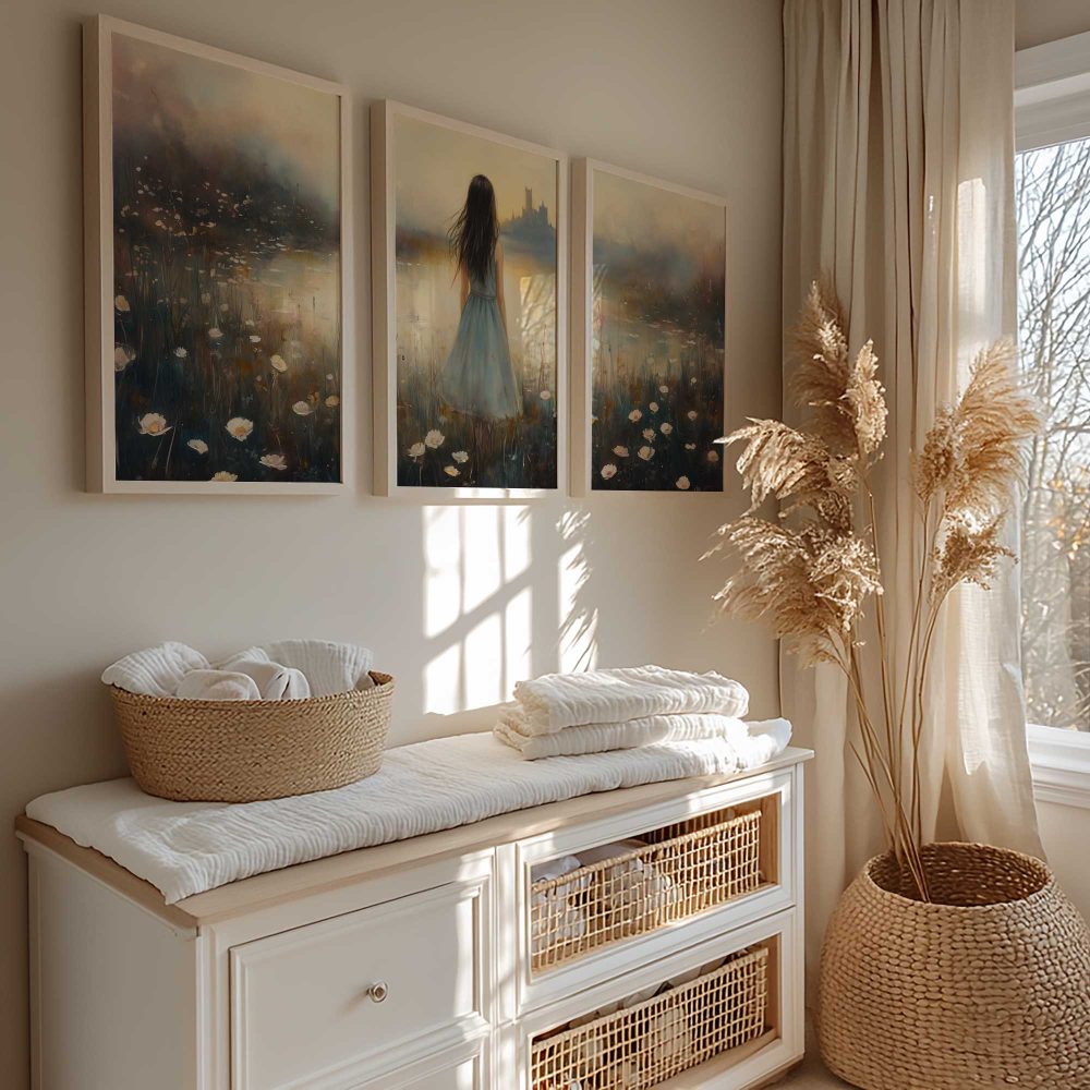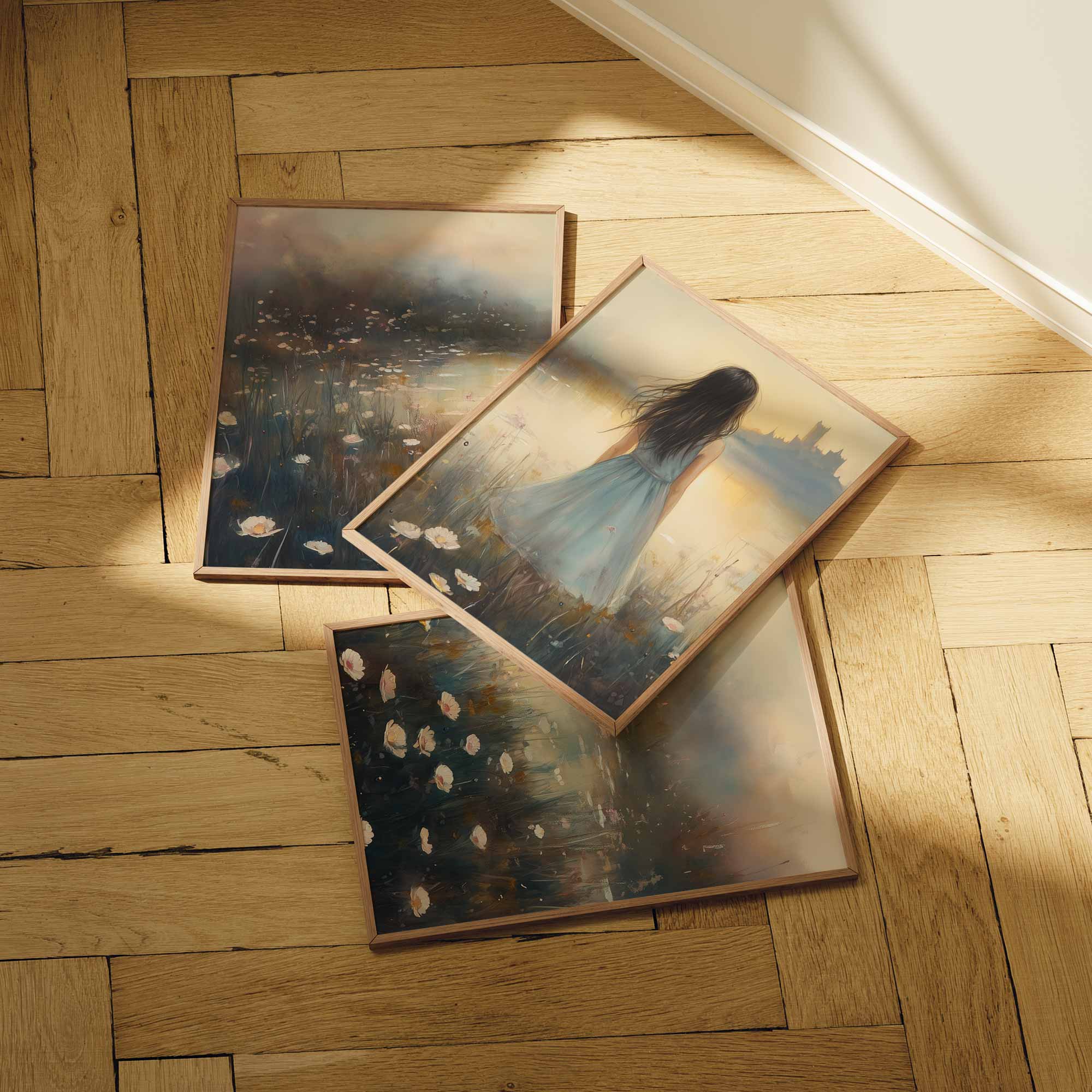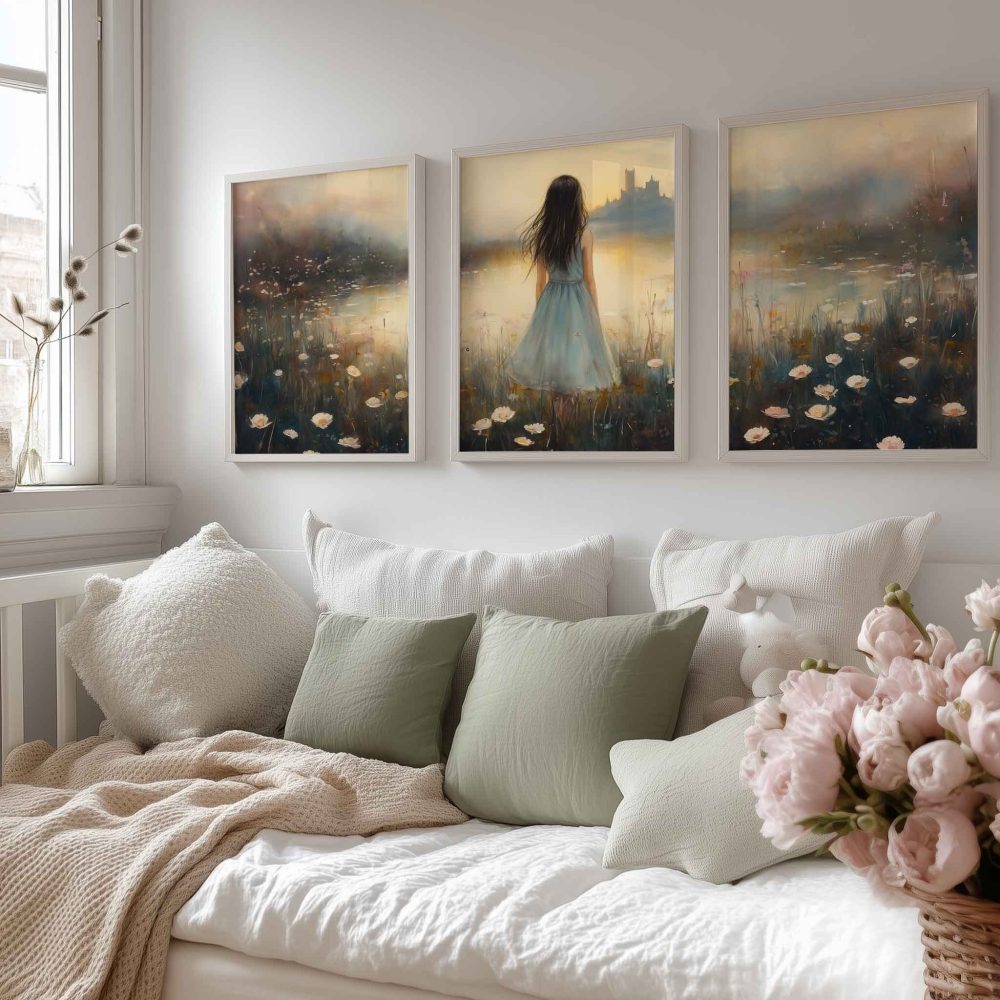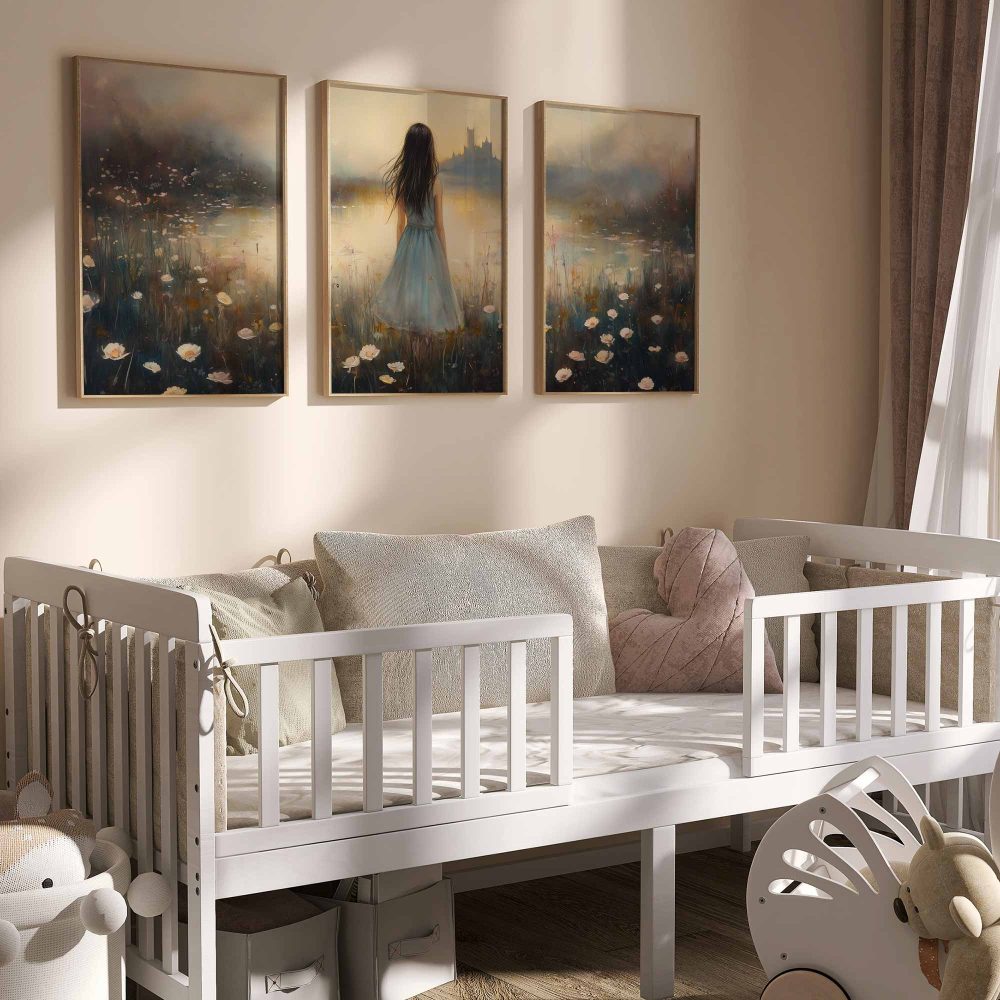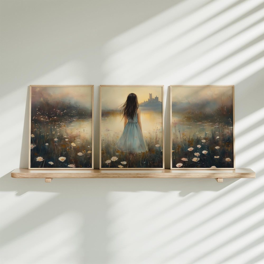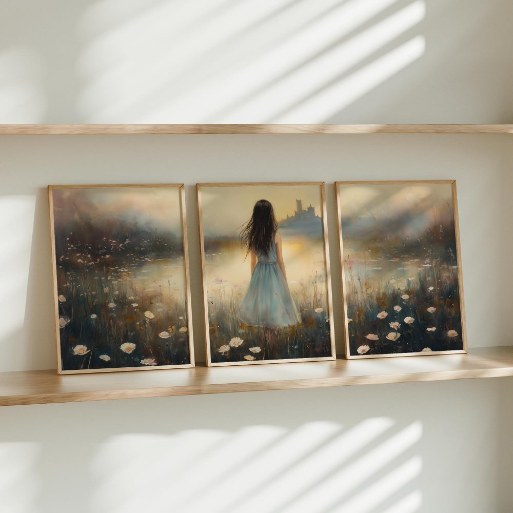 Terug naar collectie / Kinderkamer posters / Bloemen posters / Dromerig bloemenveld met kasteel en blauwe jurk