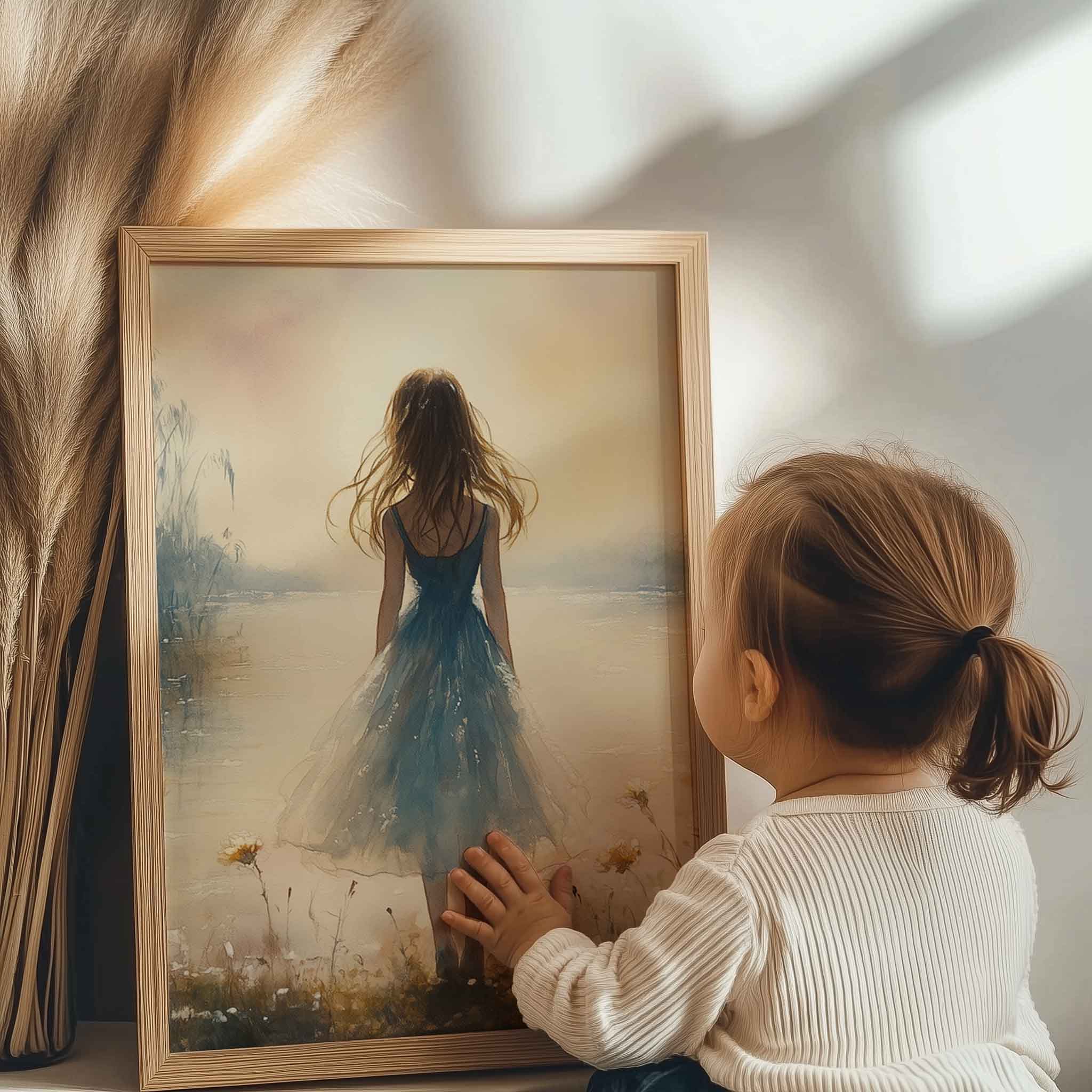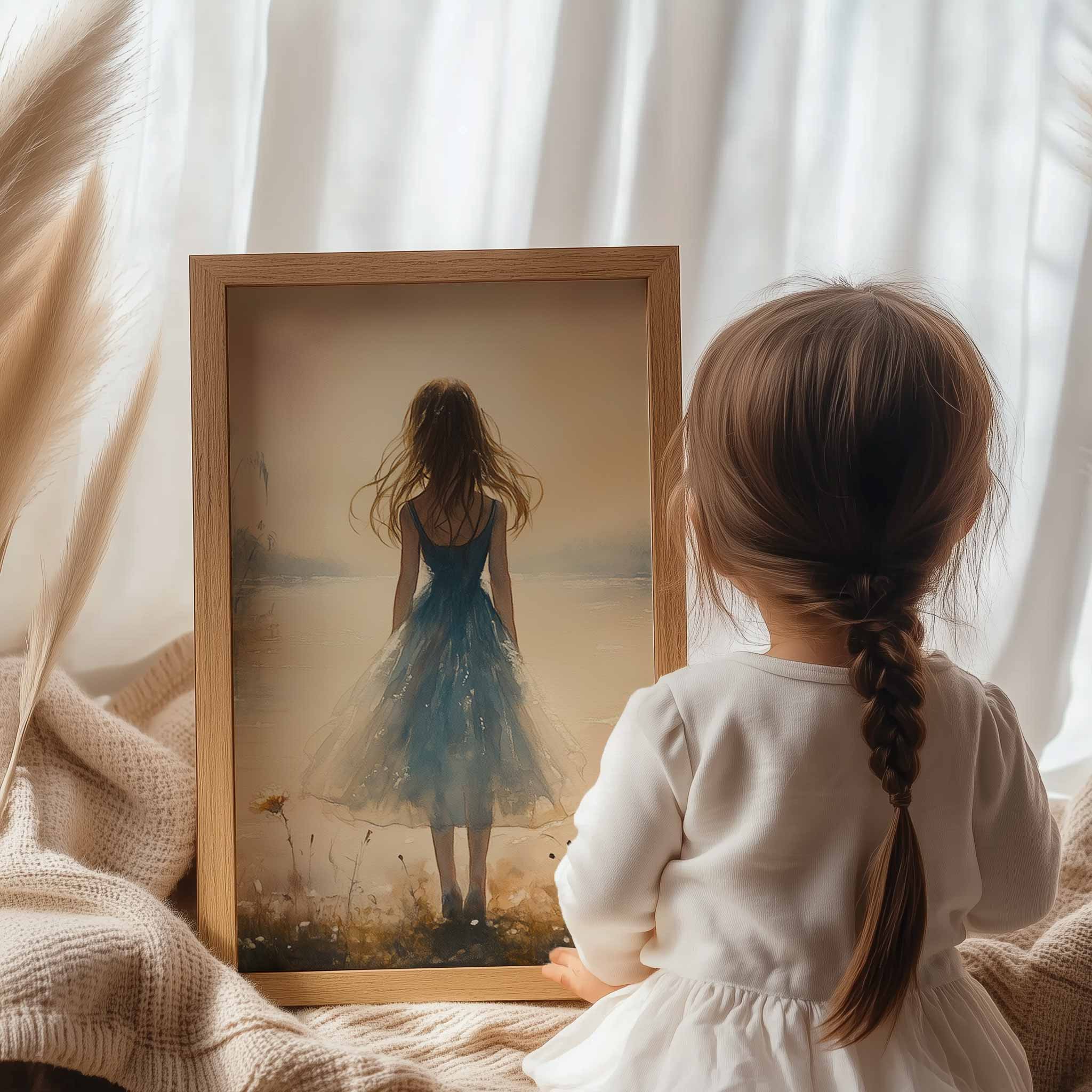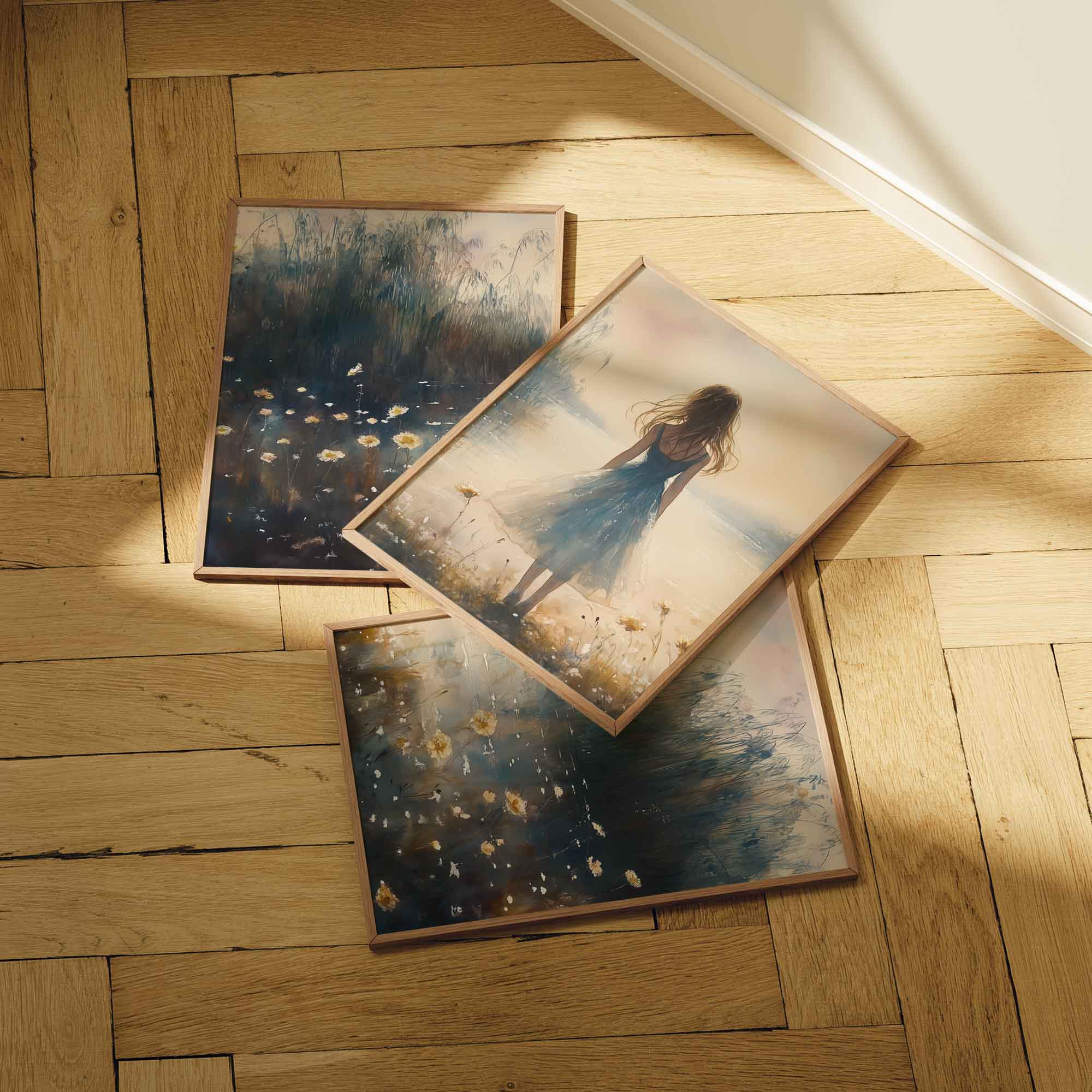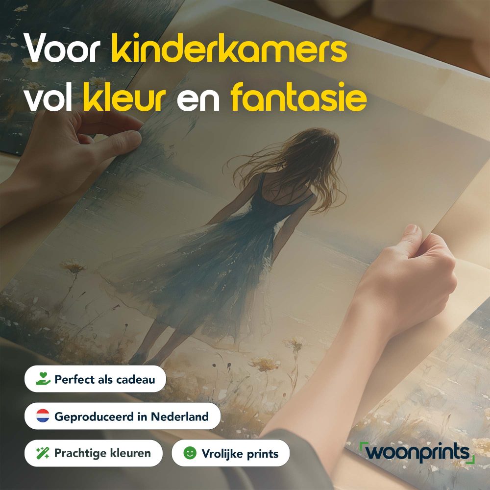 Terug naar collectie / Kinderkamer posters / Bloemen posters / Dromerig bloemenveld met vrouw in blauwe jurk