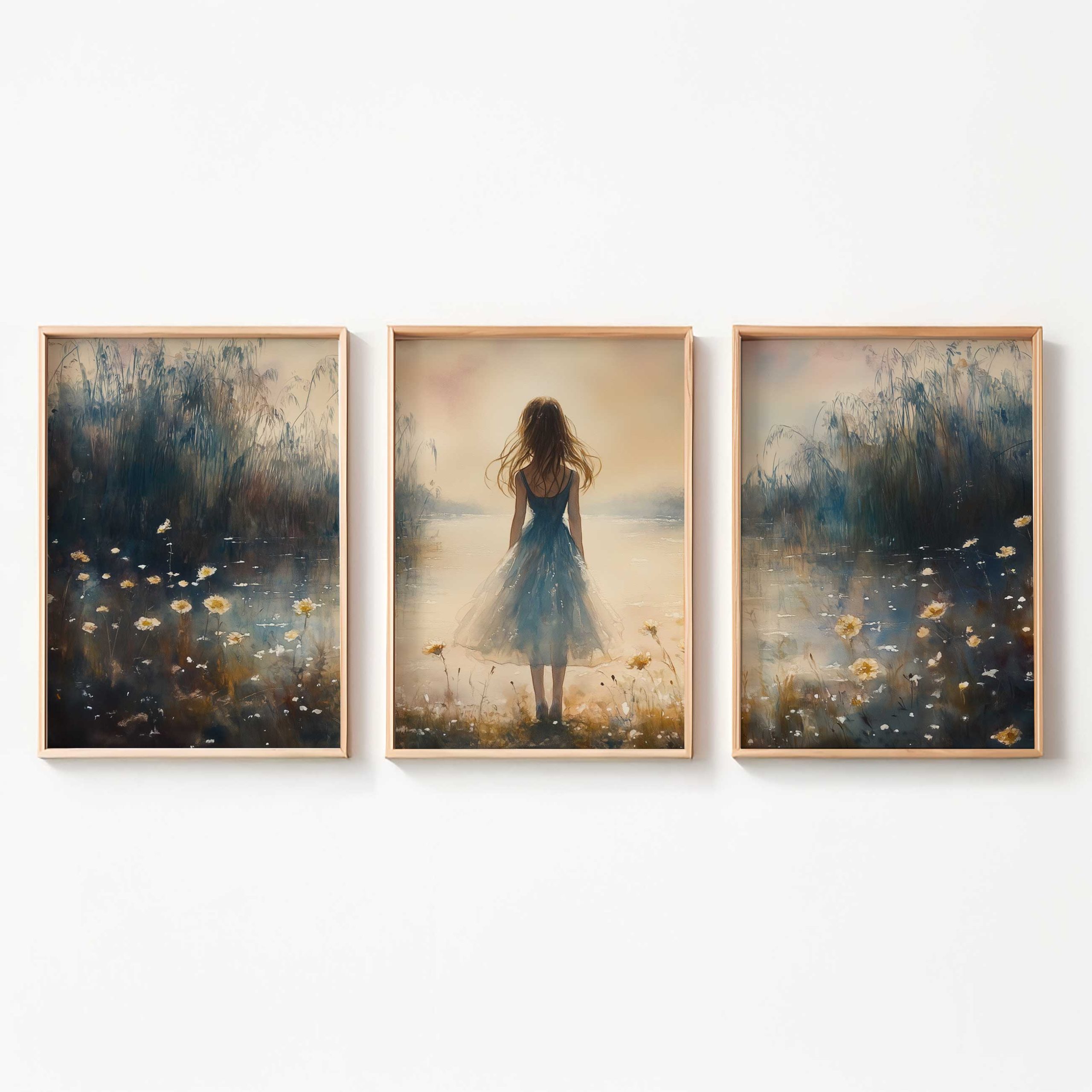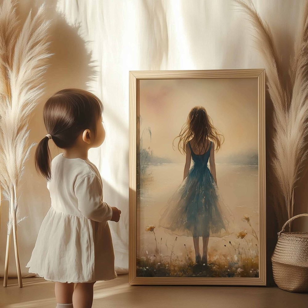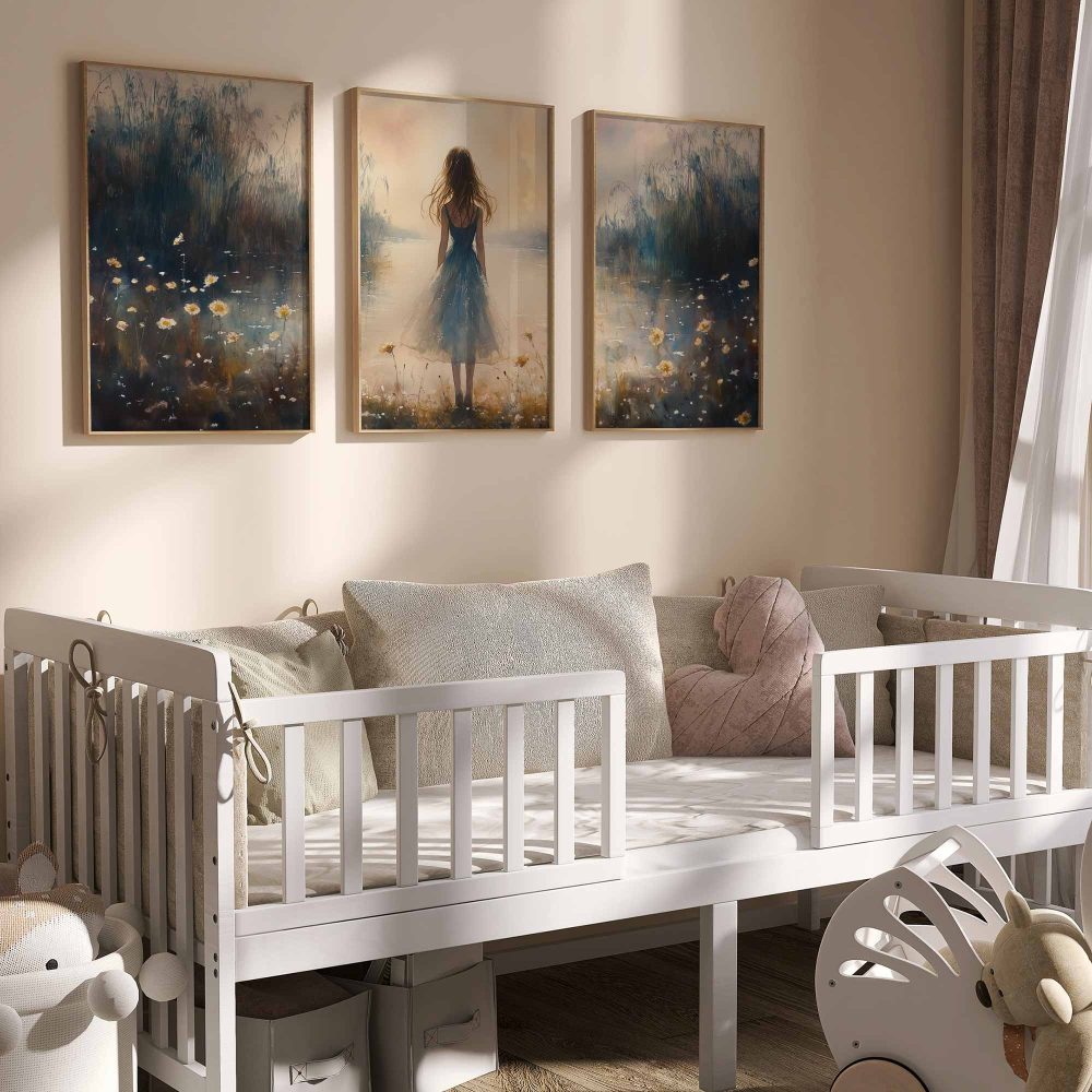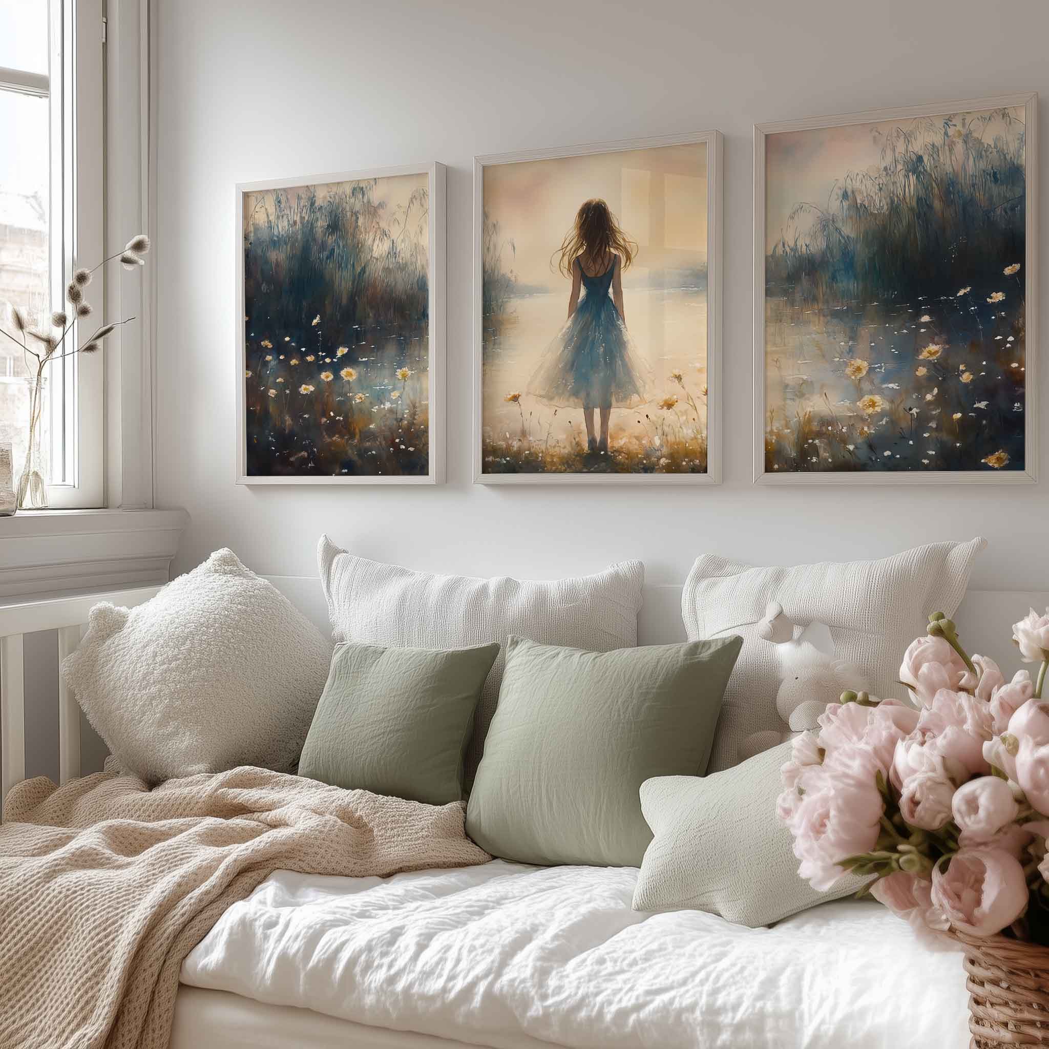 Terug naar collectie / Kinderkamer posters / Bloemen posters / Dromerig bloemenveld met vrouw in blauwe jurk