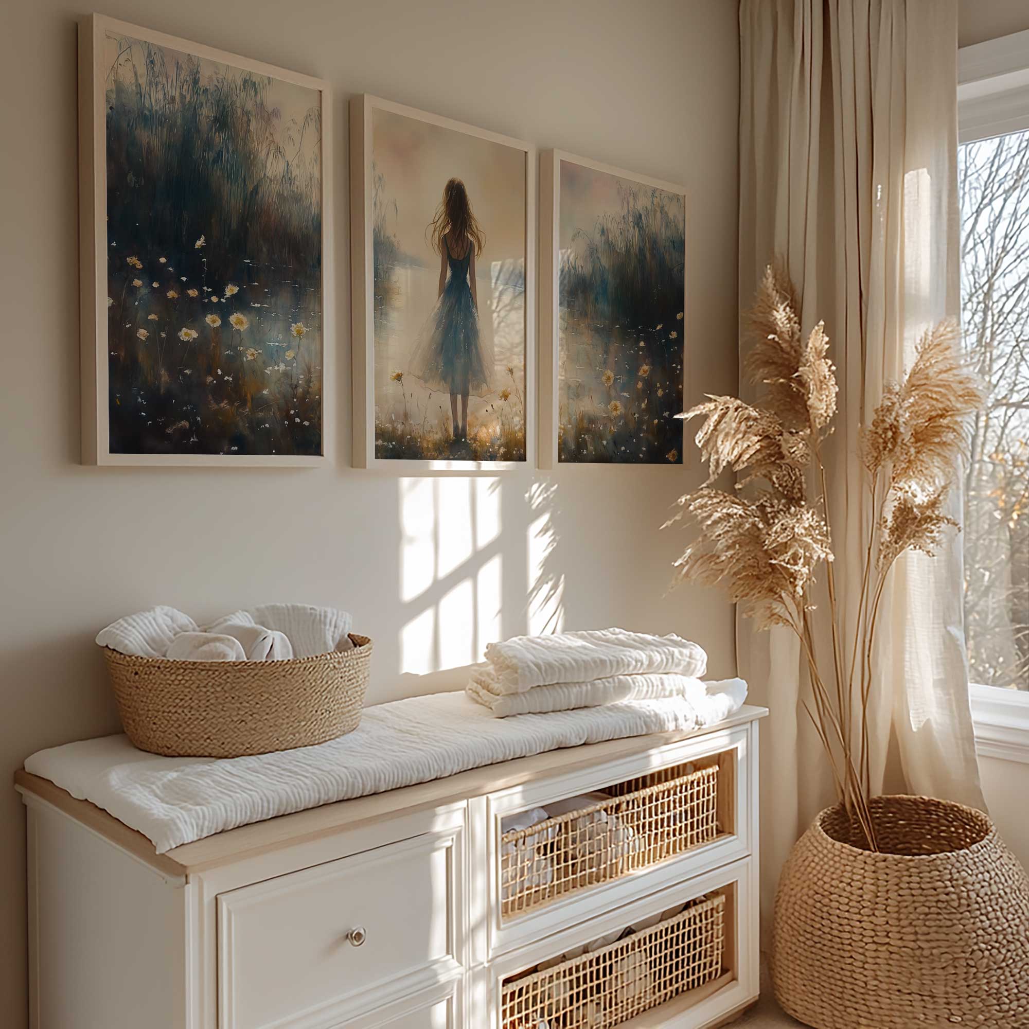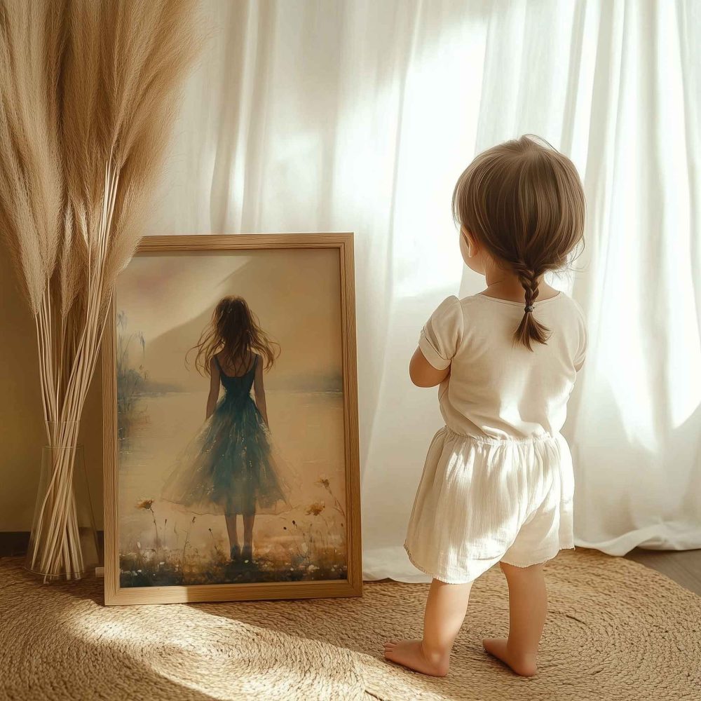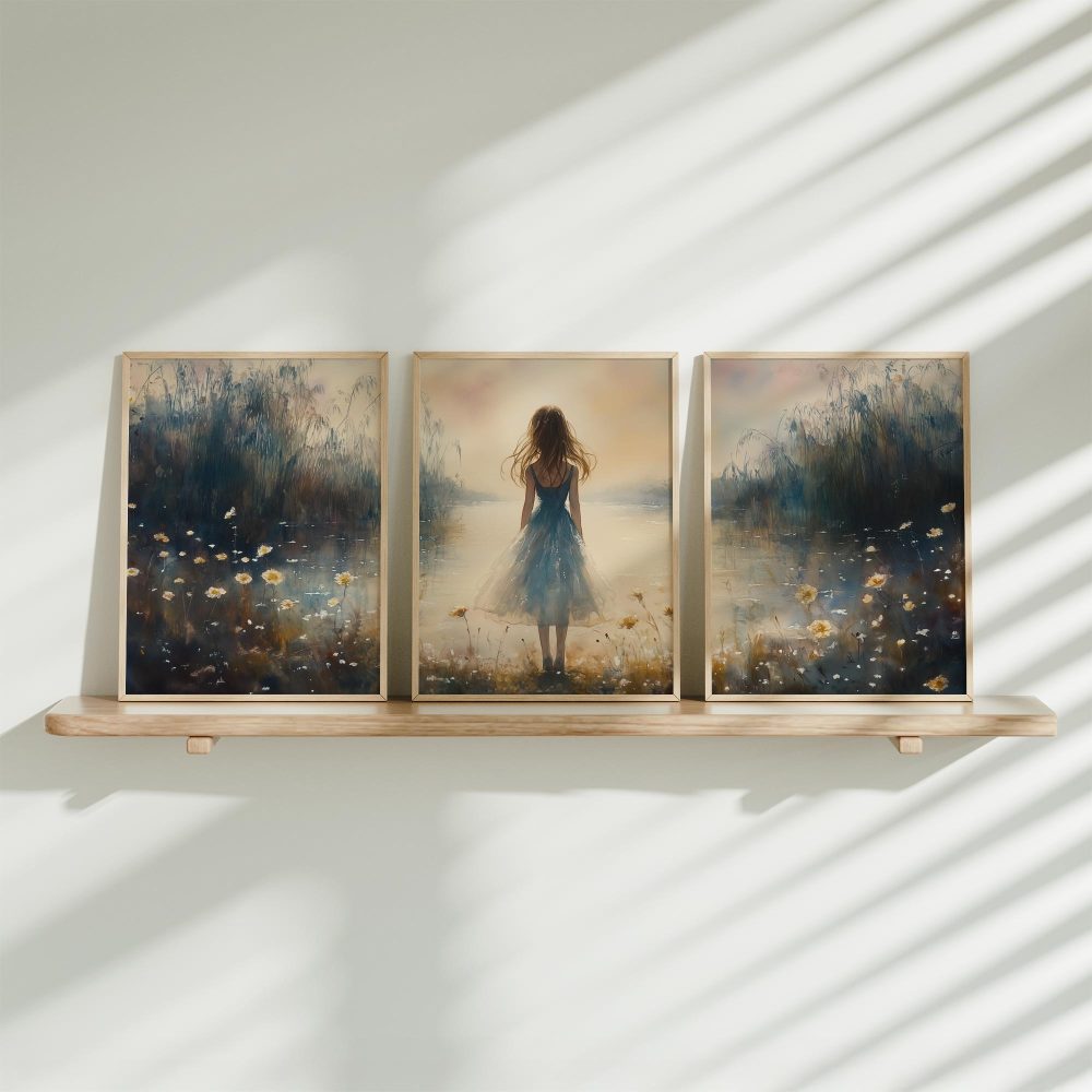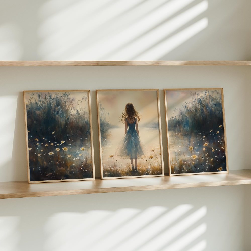 Terug naar collectie / Kinderkamer posters / Bloemen posters / Dromerig bloemenveld met vrouw in blauwe jurk