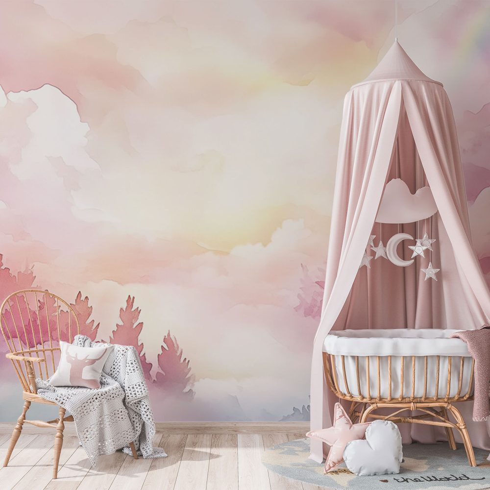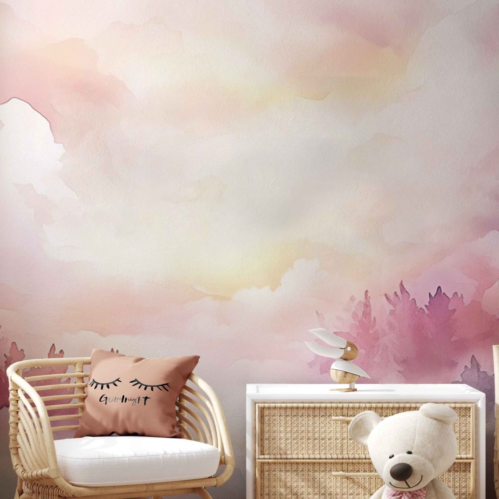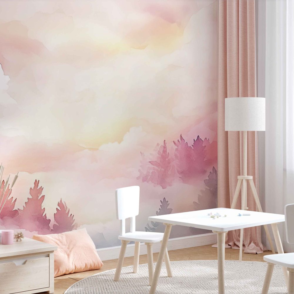 Terug naar collectie / Behang / Kinderkamer behang / Babykamer behang / Dromerig bos met pastellucht behang