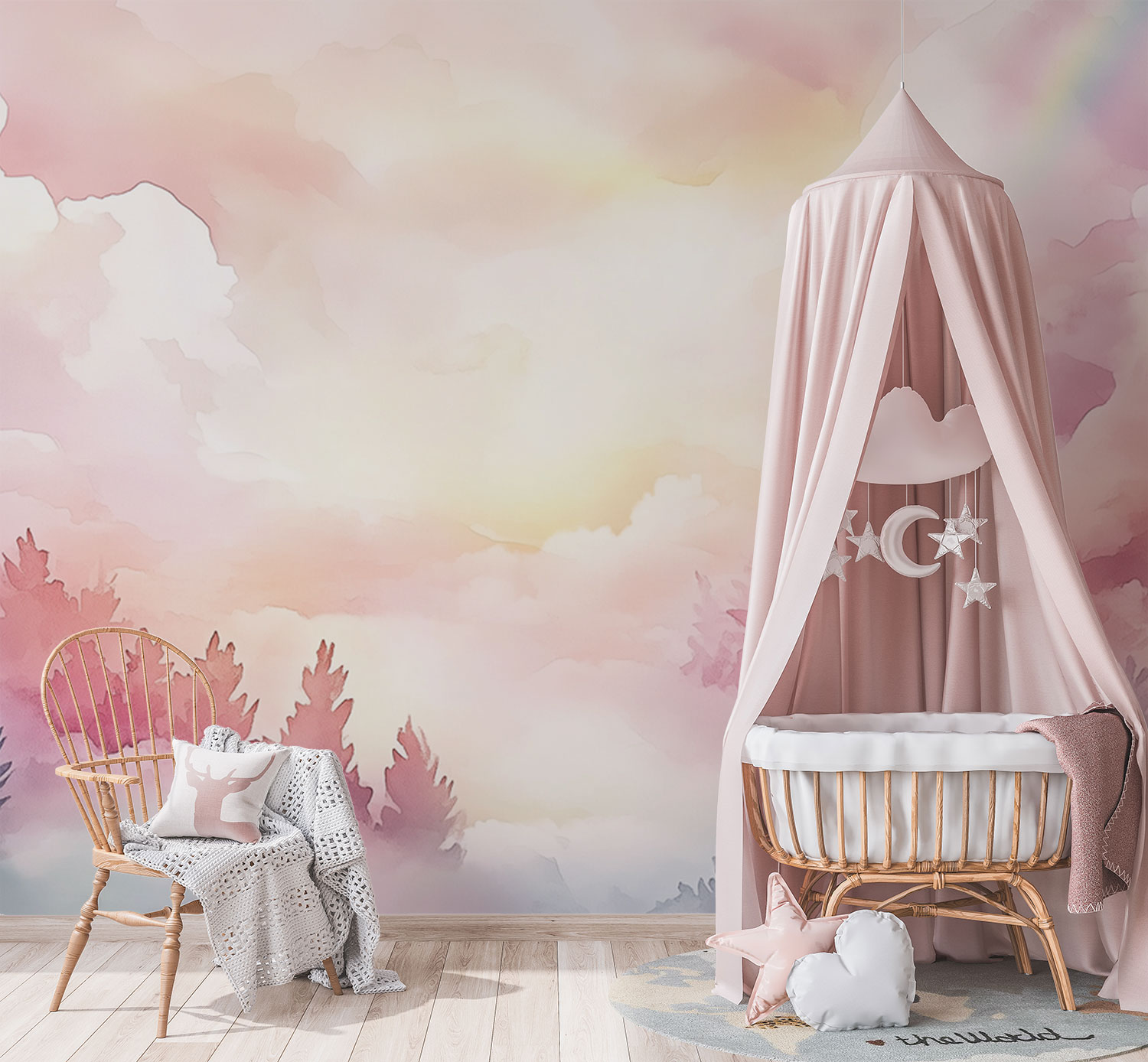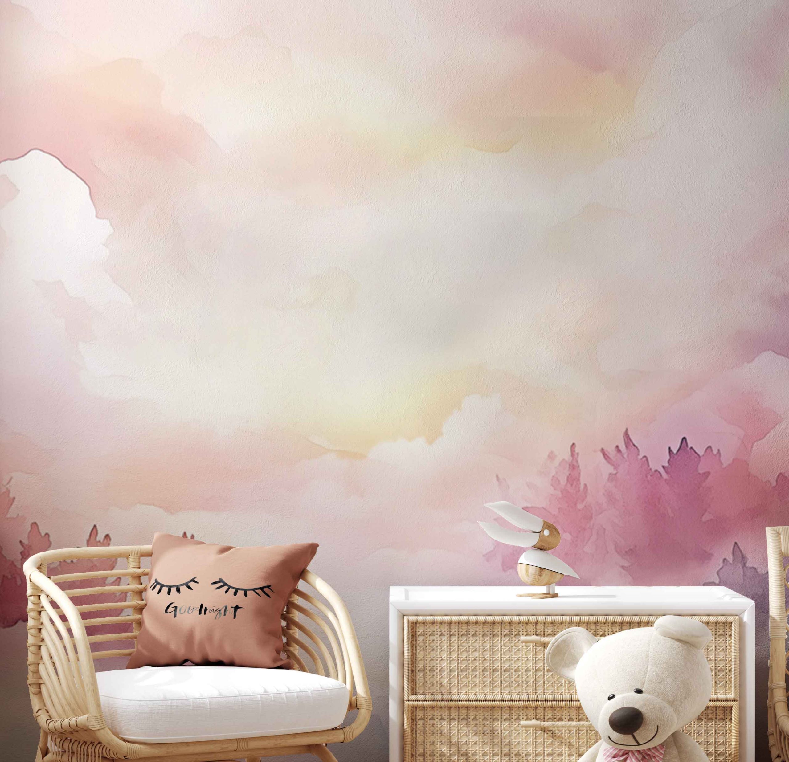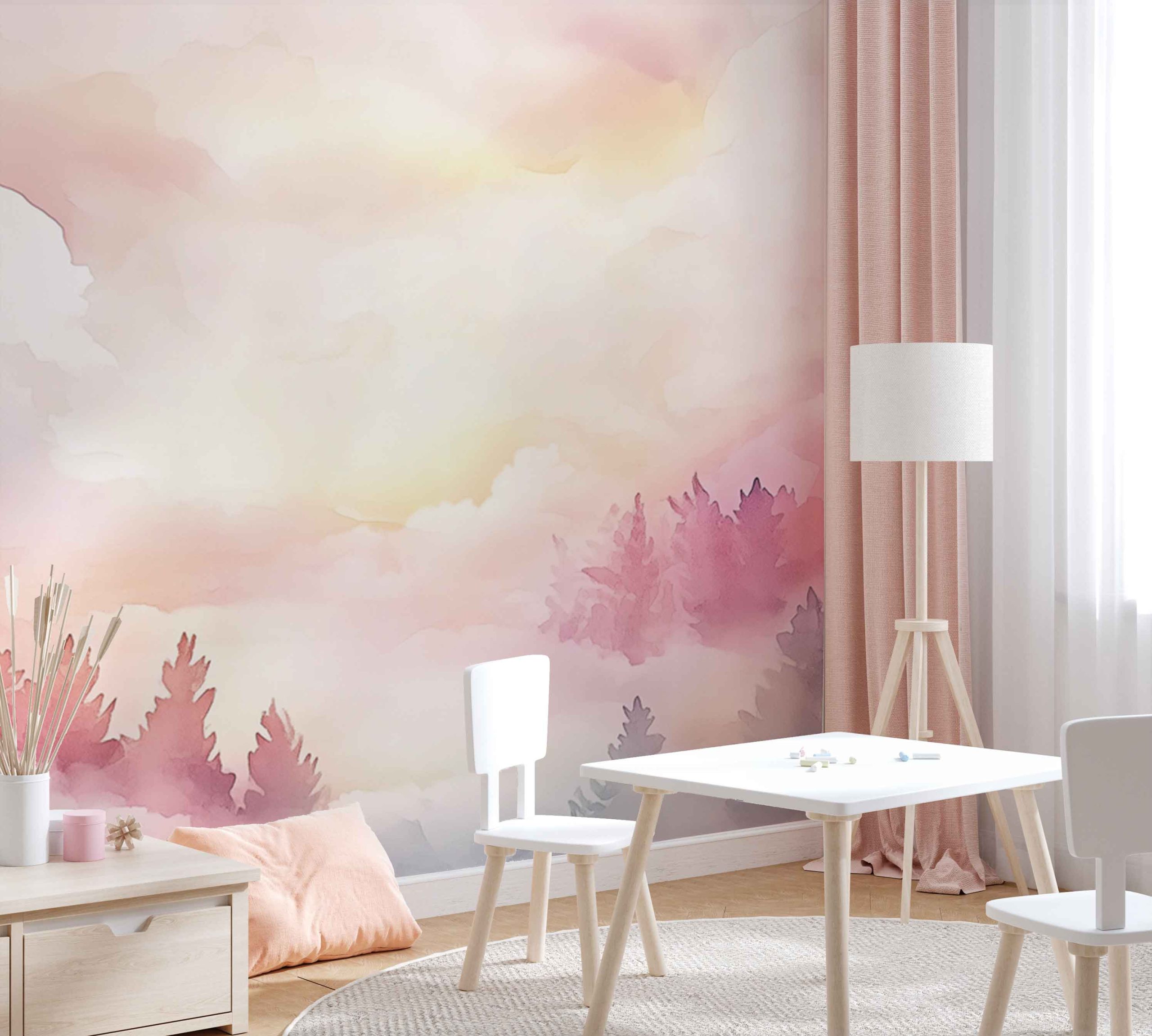 Terug naar collectie / Behang / Kinderkamer behang / Babykamer behang / Dromerig bos met pastellucht behang