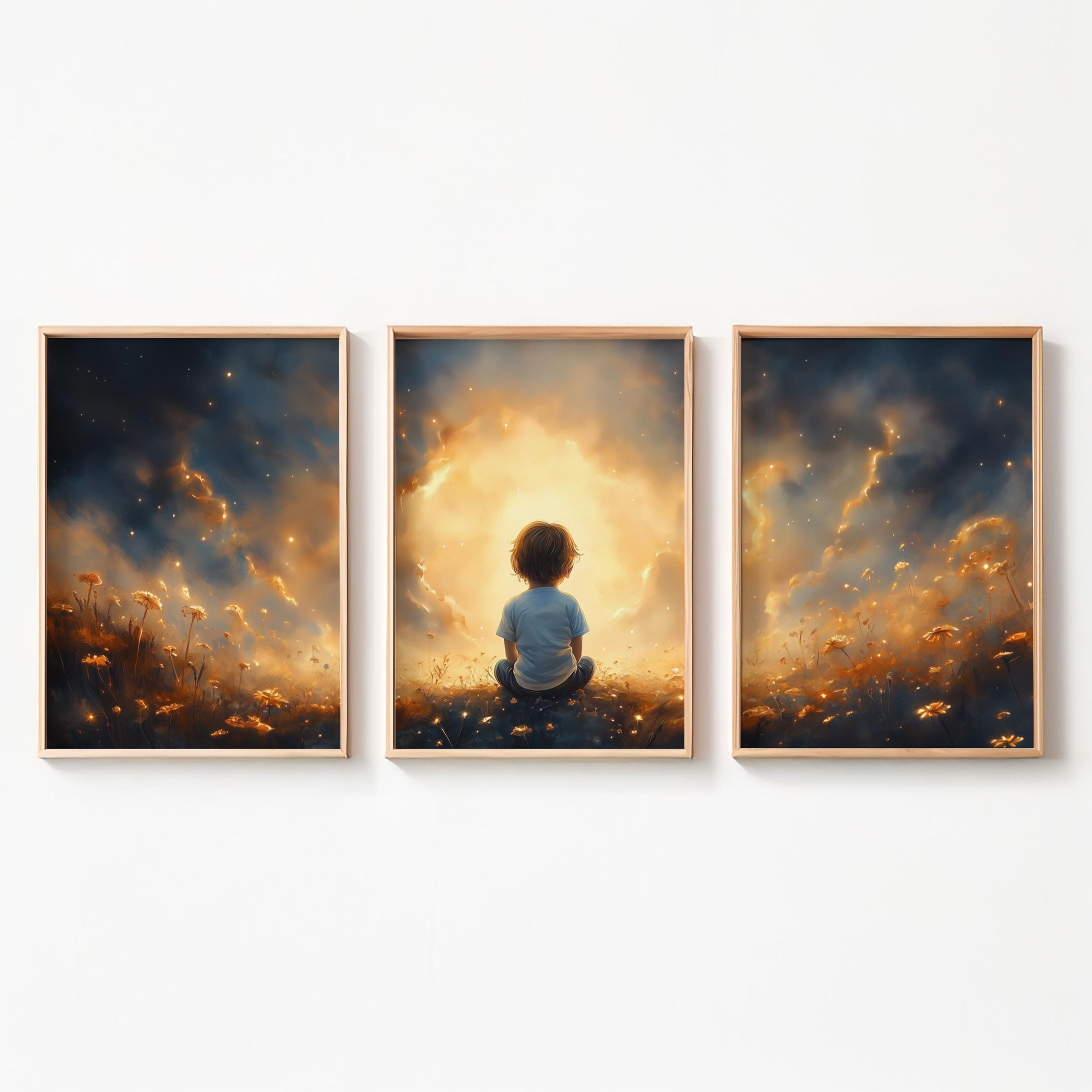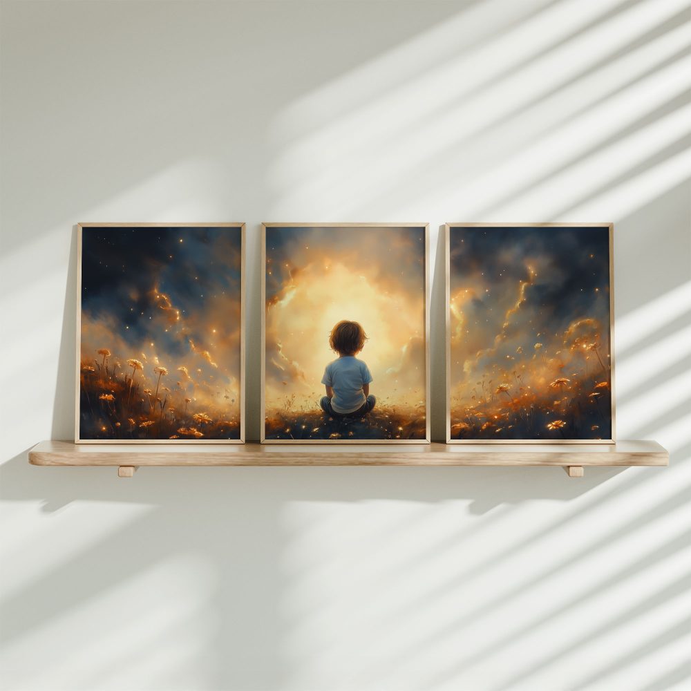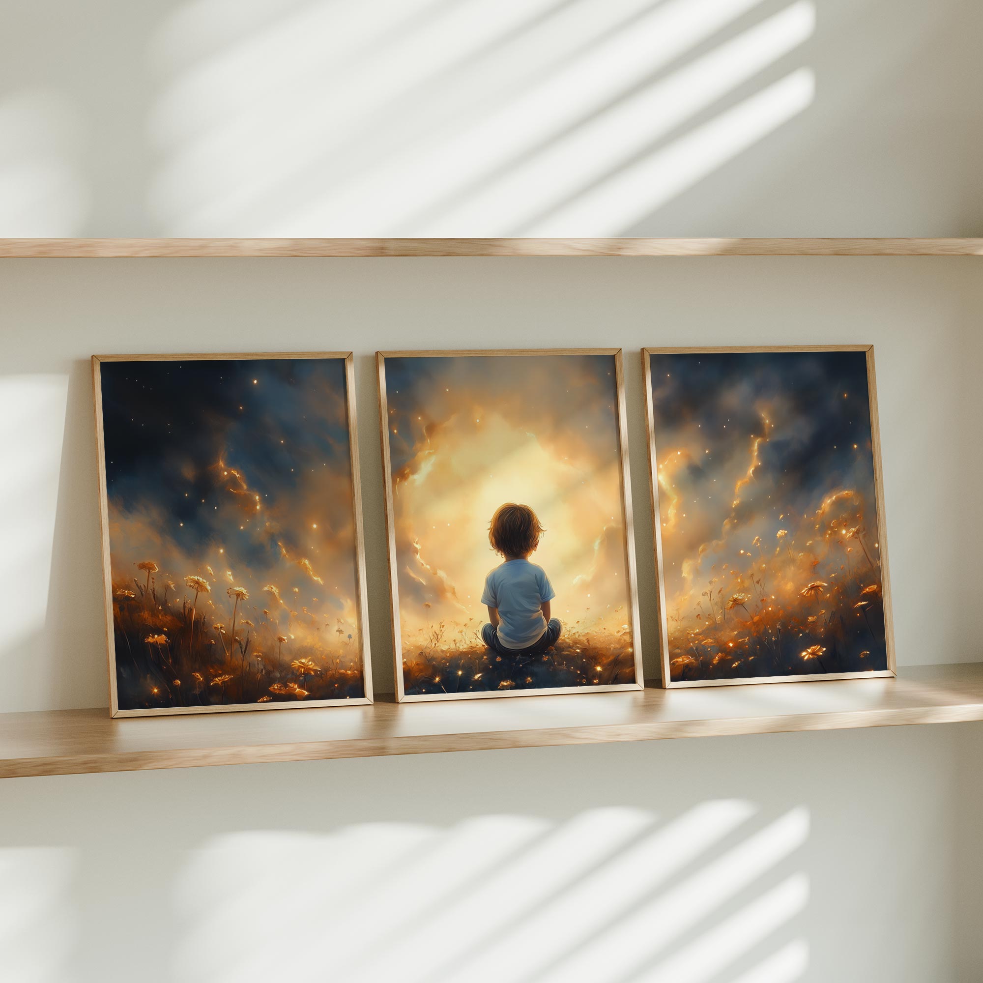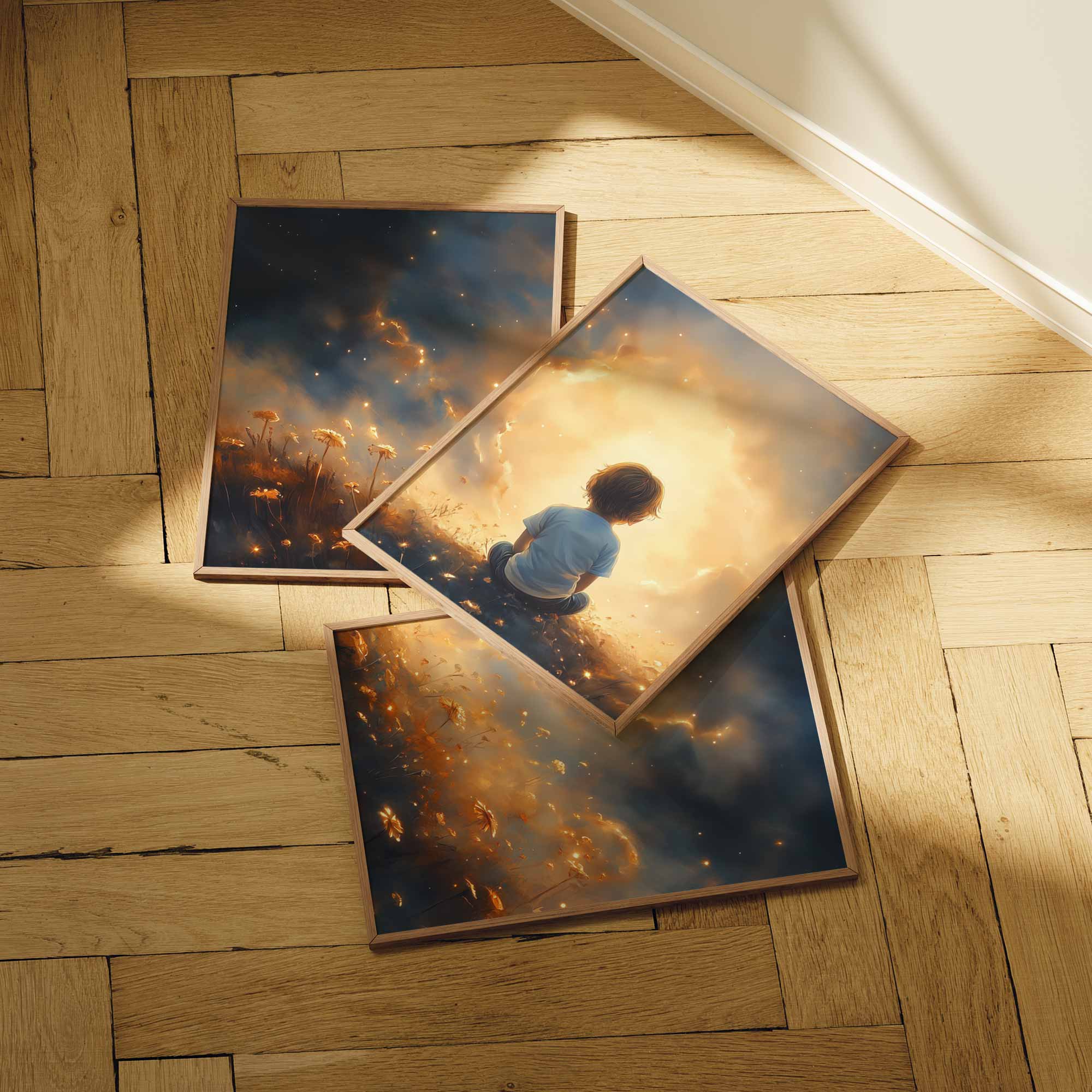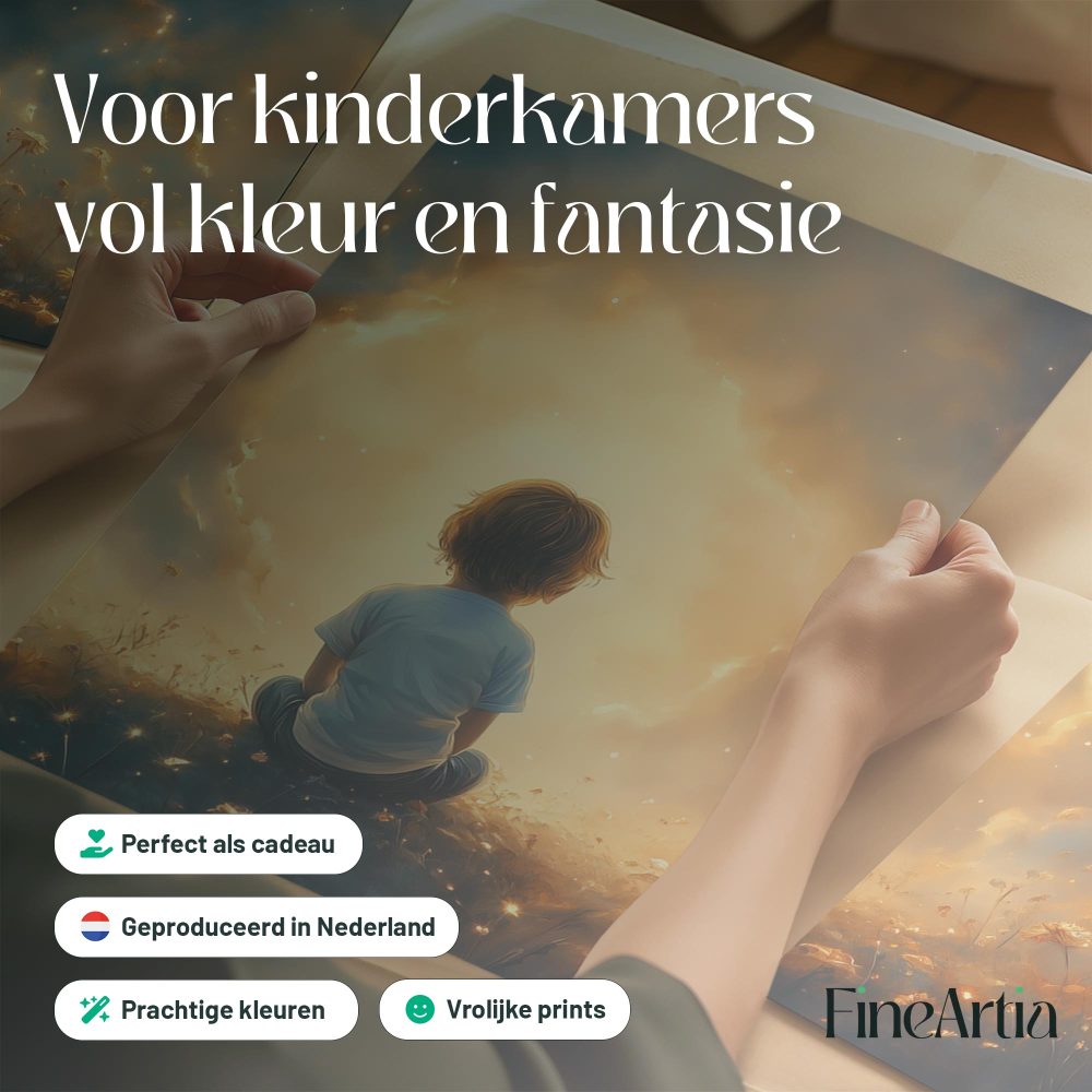 Terug naar collectie / Kinderkamer posters / Avontuurlijk posters / Dromerig jongetje in gouden bloemenveld