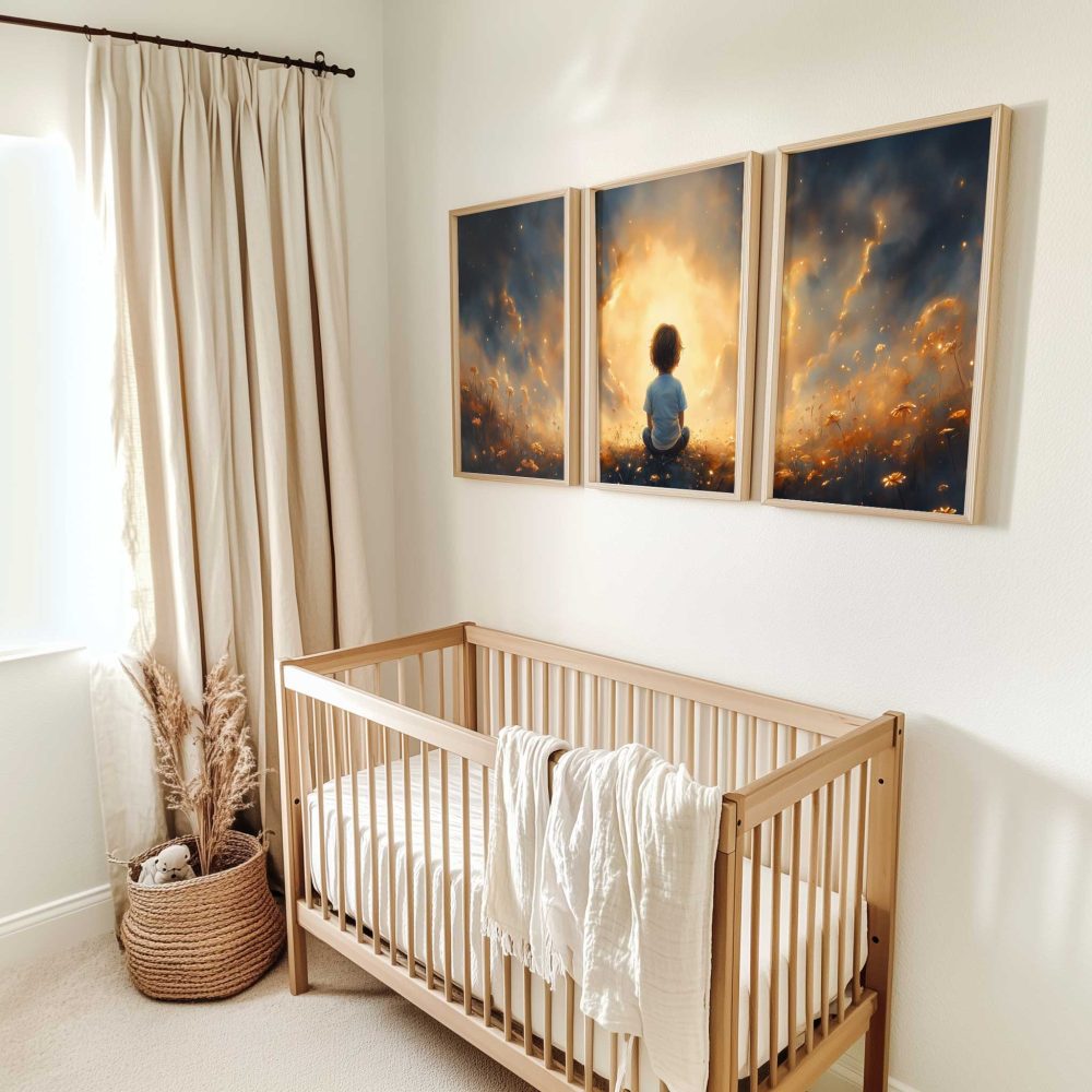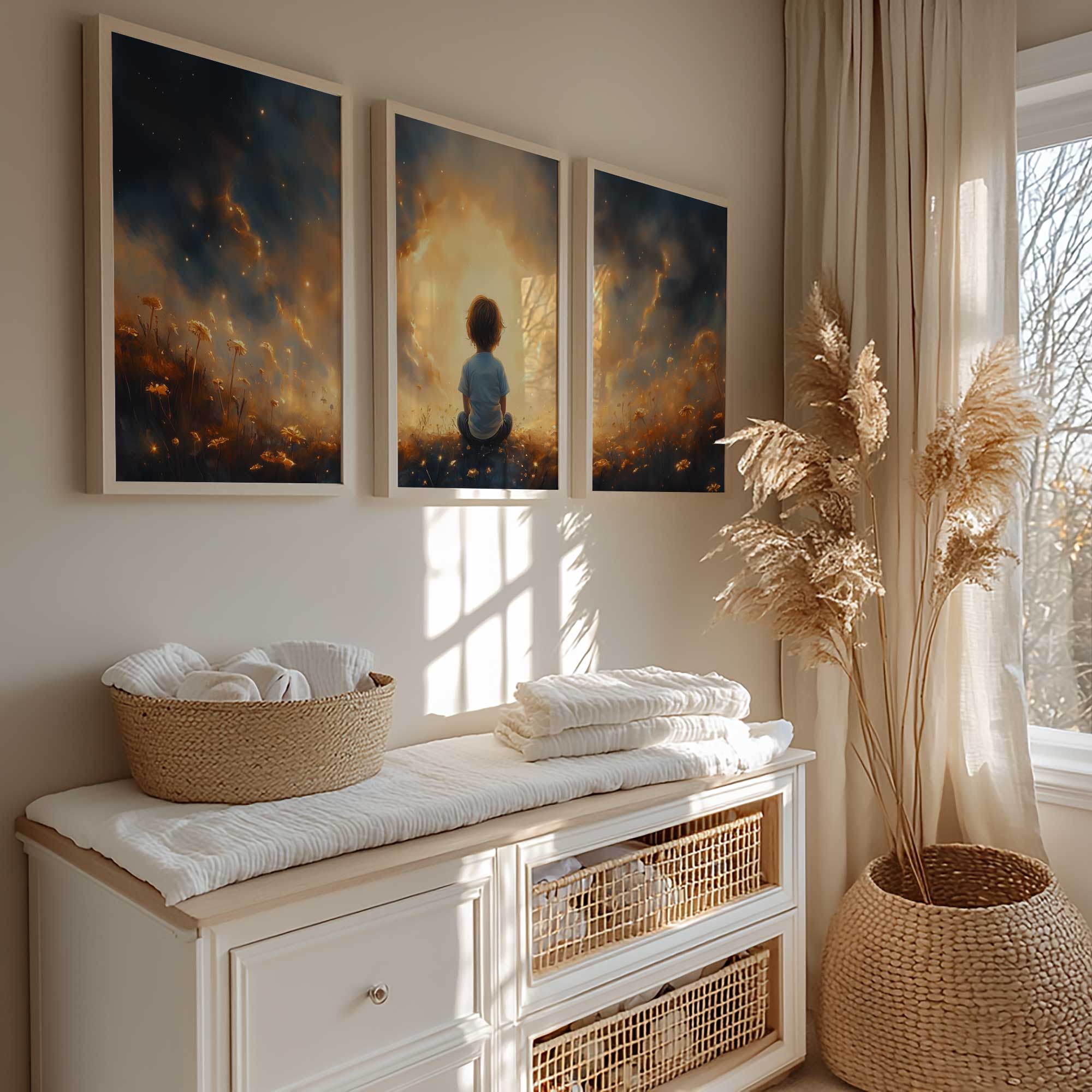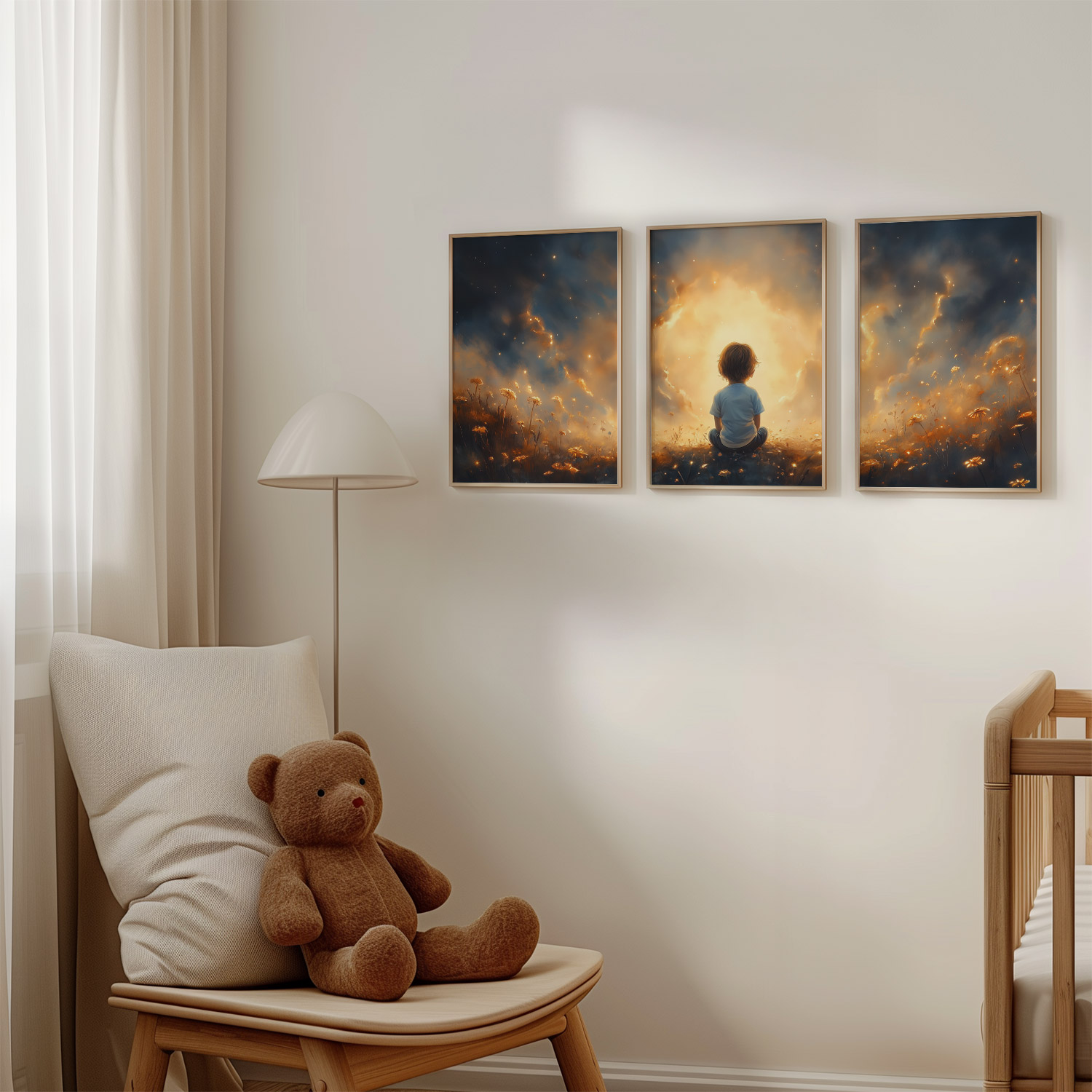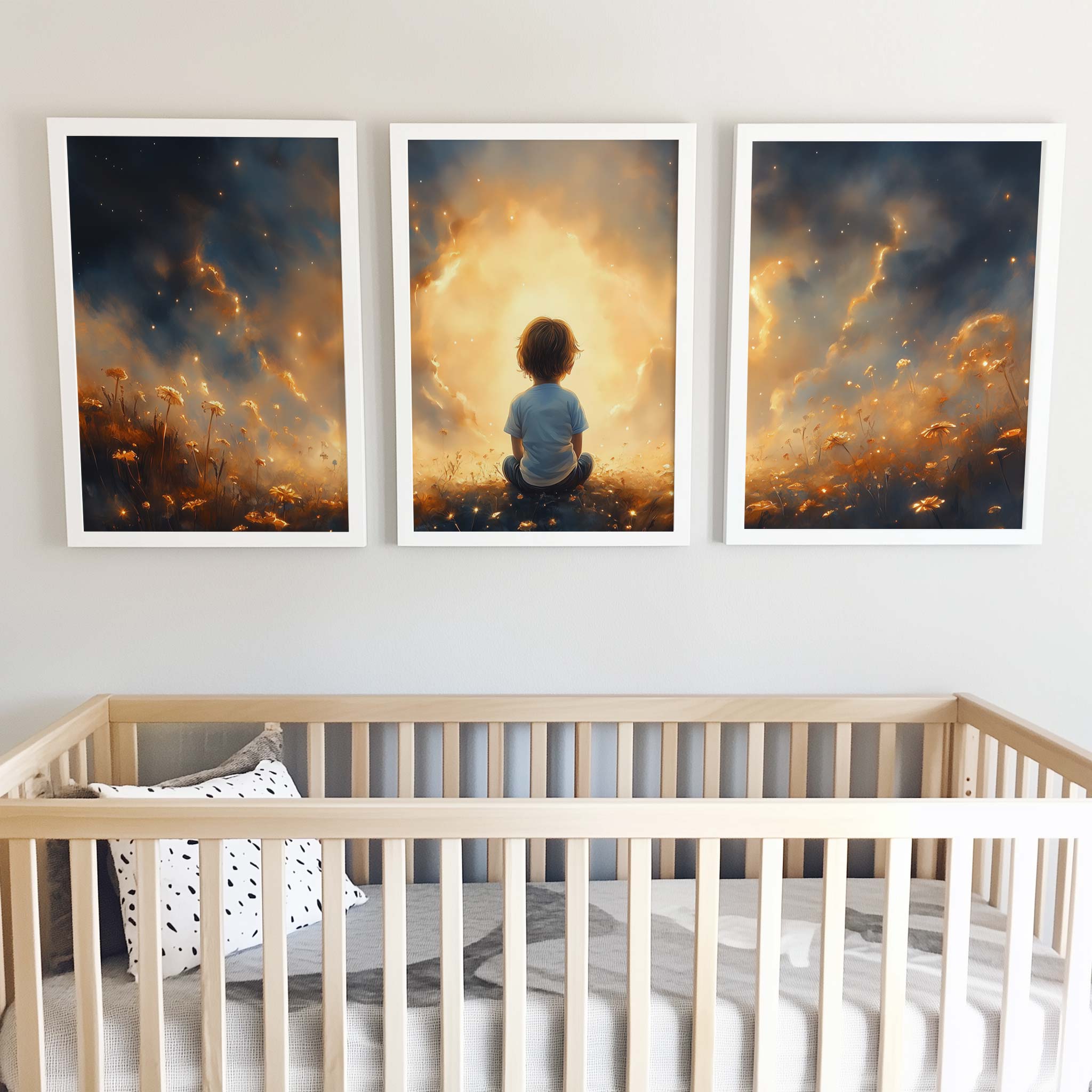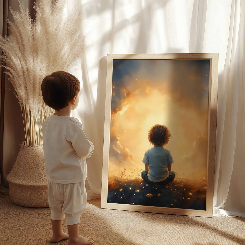 Terug naar collectie / Kinderkamer posters / Avontuurlijk posters / Dromerig jongetje in gouden bloemenveld
