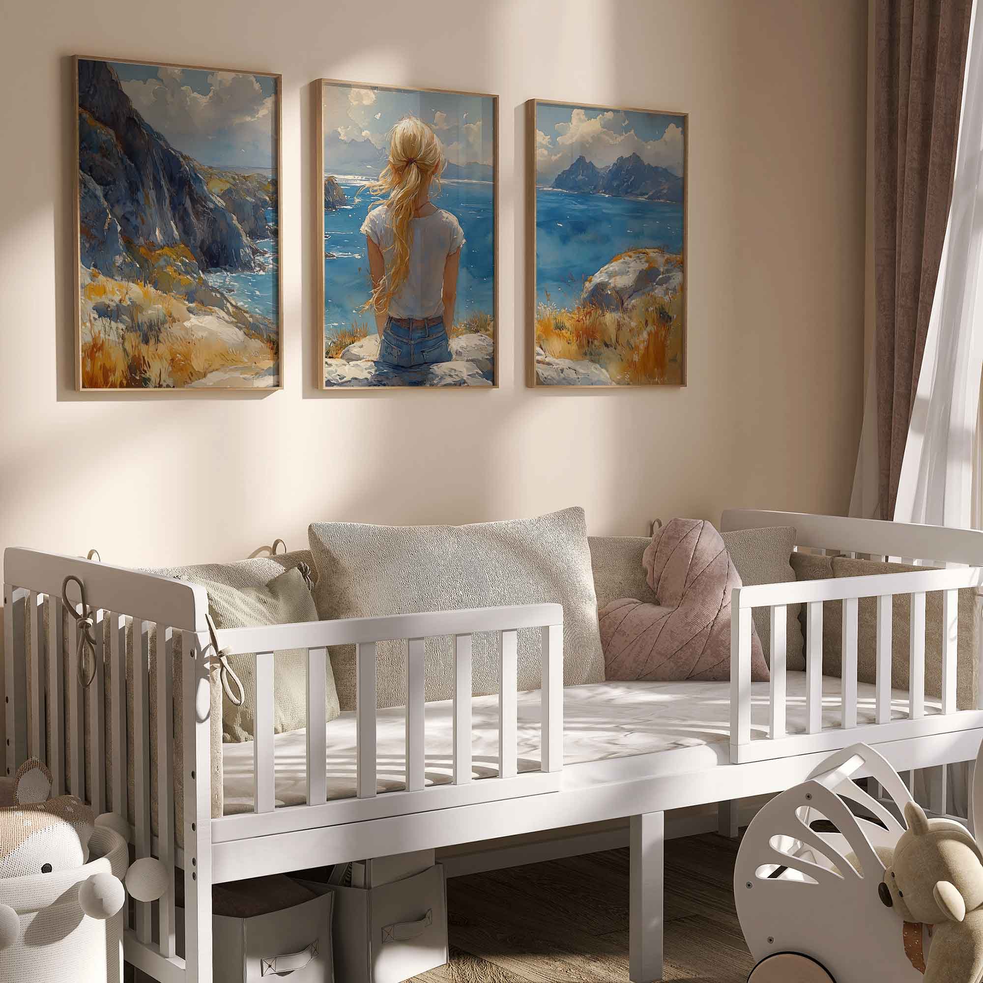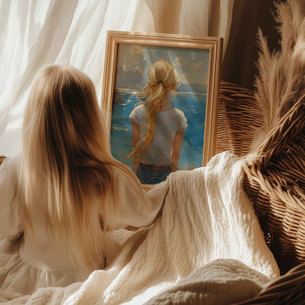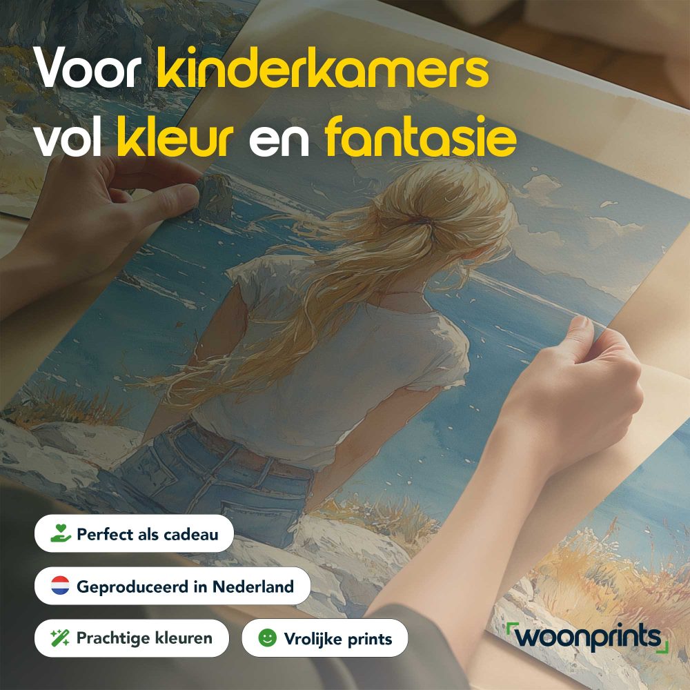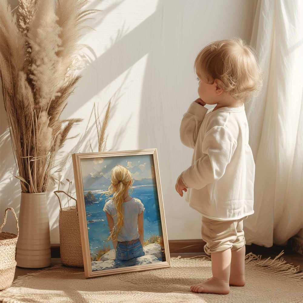 Terug naar collectie / Kinderkamer posters / Dromerig meisje aan zee – Zachte kleuren en rust