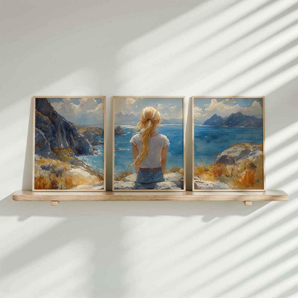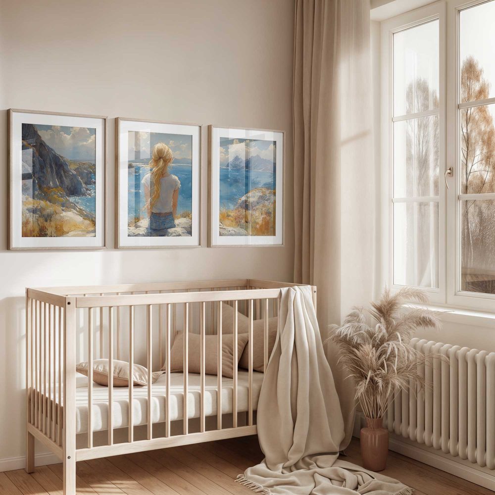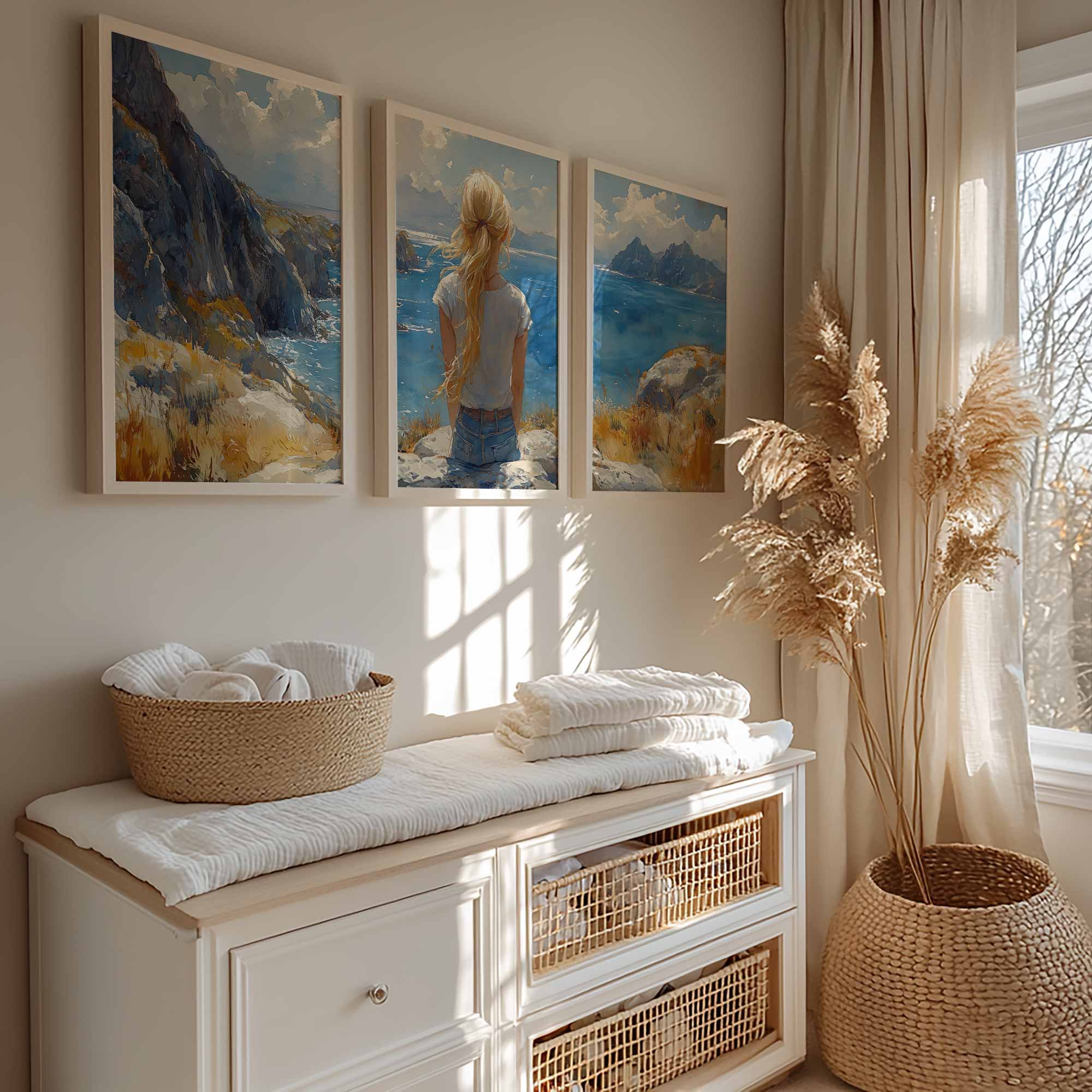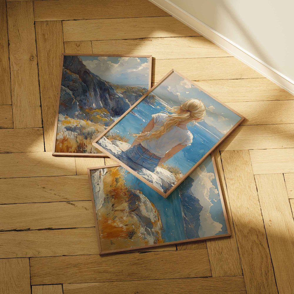 Terug naar collectie / Kinderkamer posters / Dromerig meisje aan zee – Zachte kleuren en rust