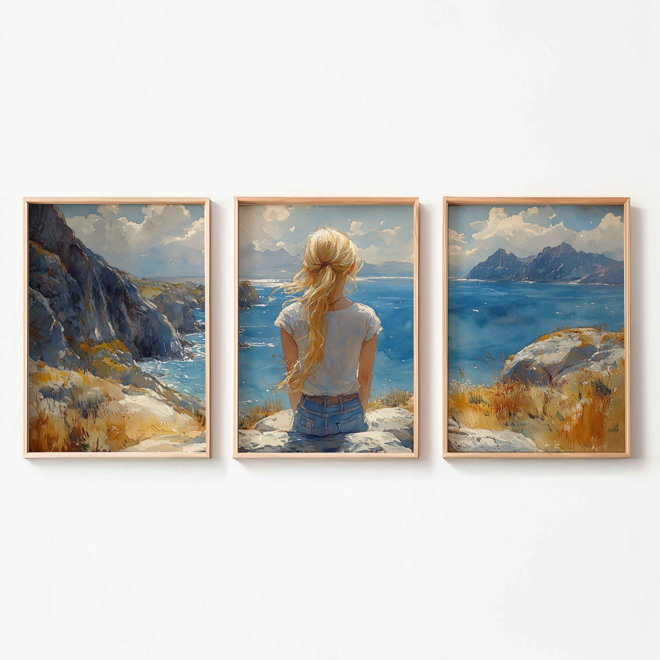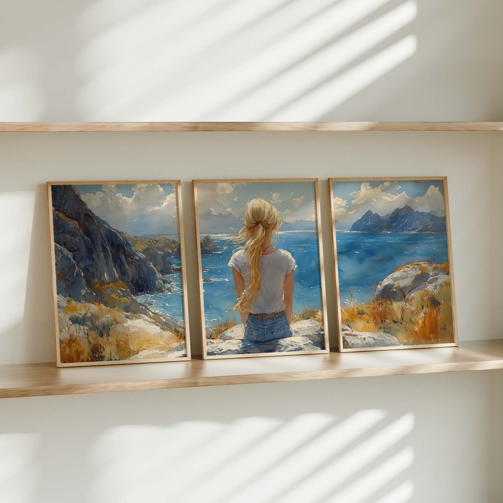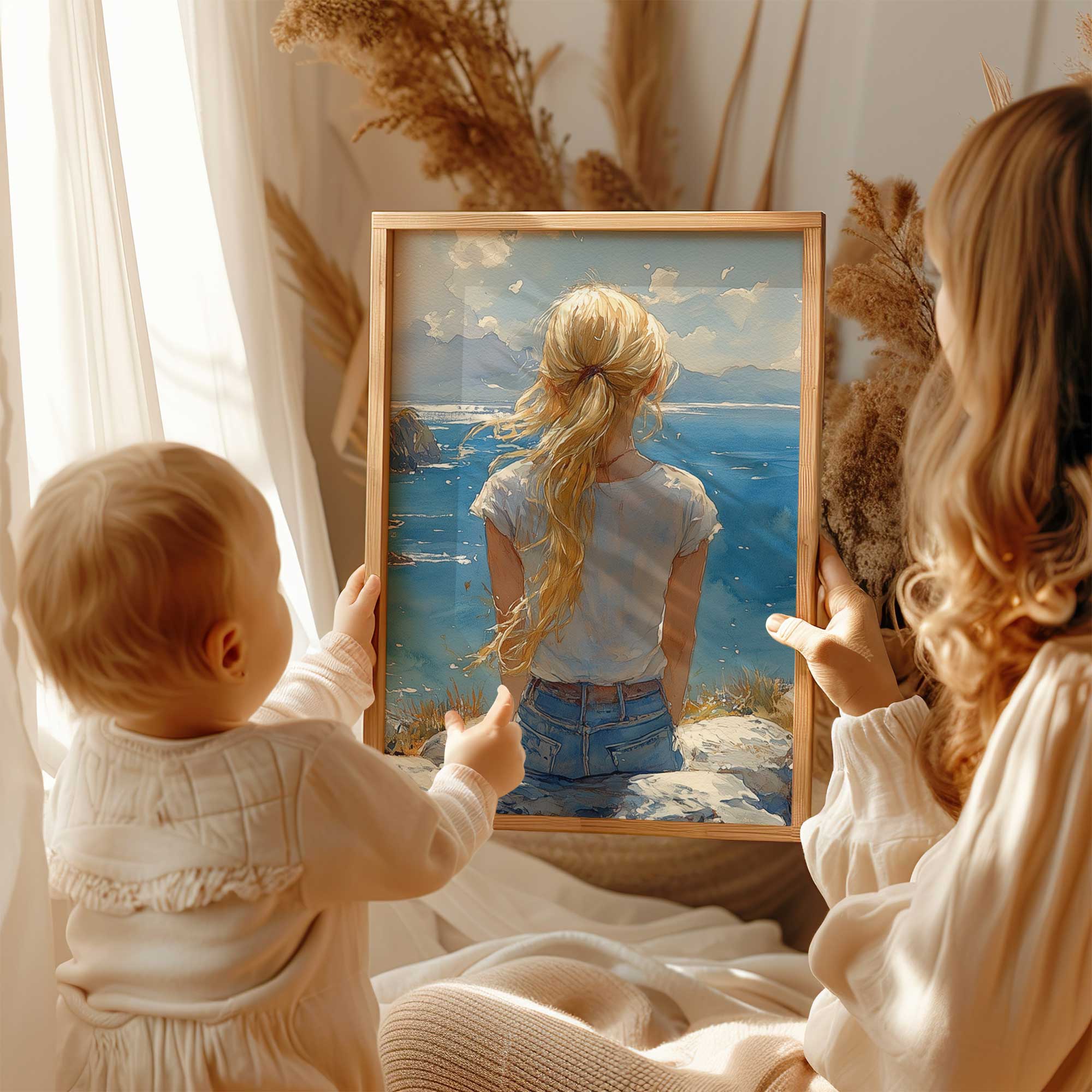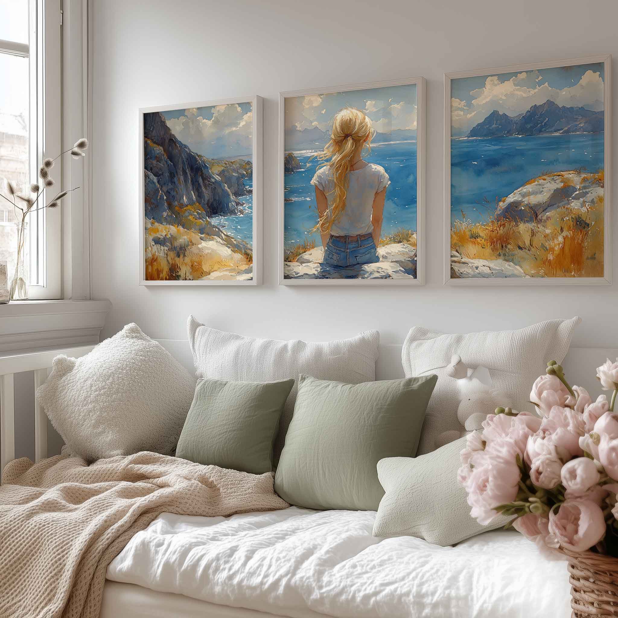 Terug naar collectie / Kinderkamer posters / Dromerig meisje aan zee – Zachte kleuren en rust