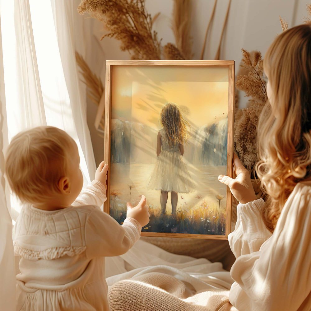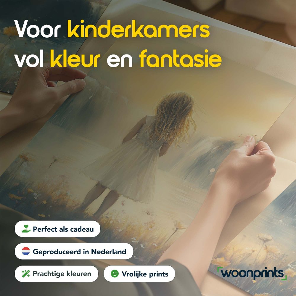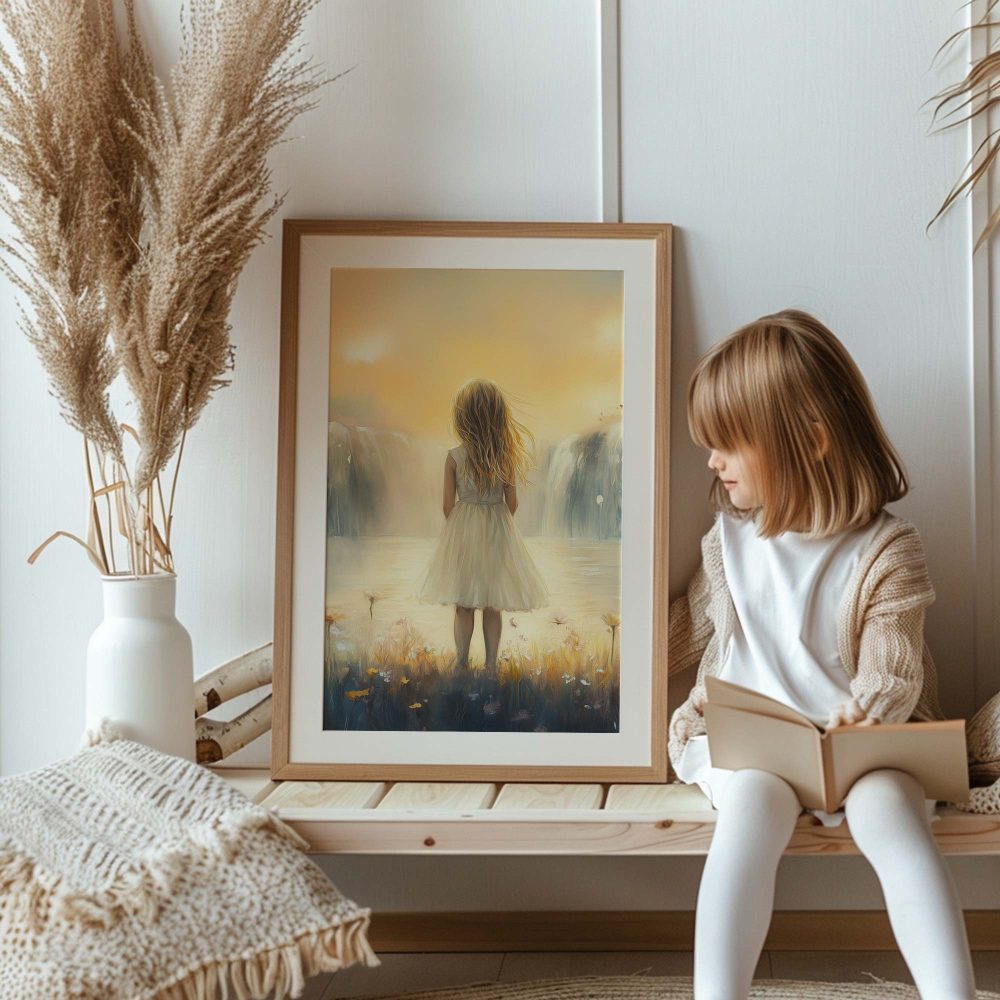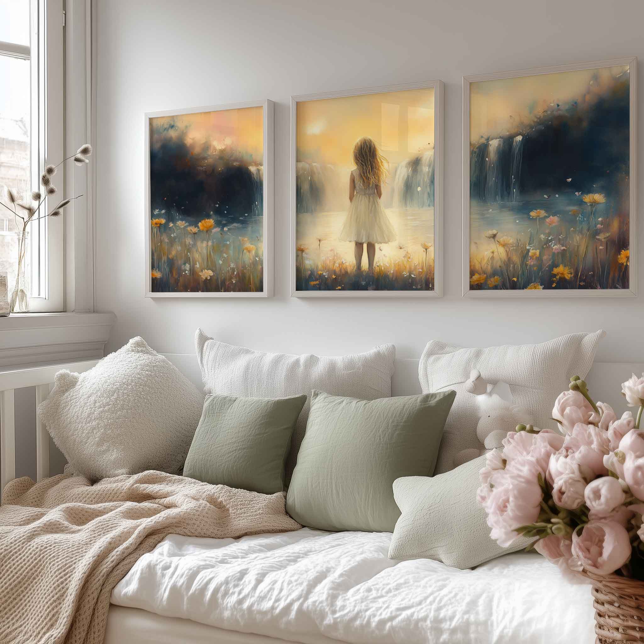 Terug naar collectie / Kinderkamer posters / Bloemen posters / Dromerig Meisje bij Betoverende Waterval en Bloemenveld