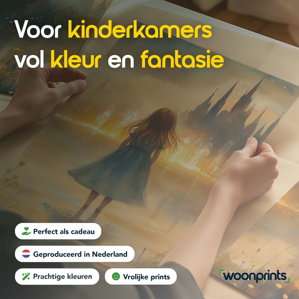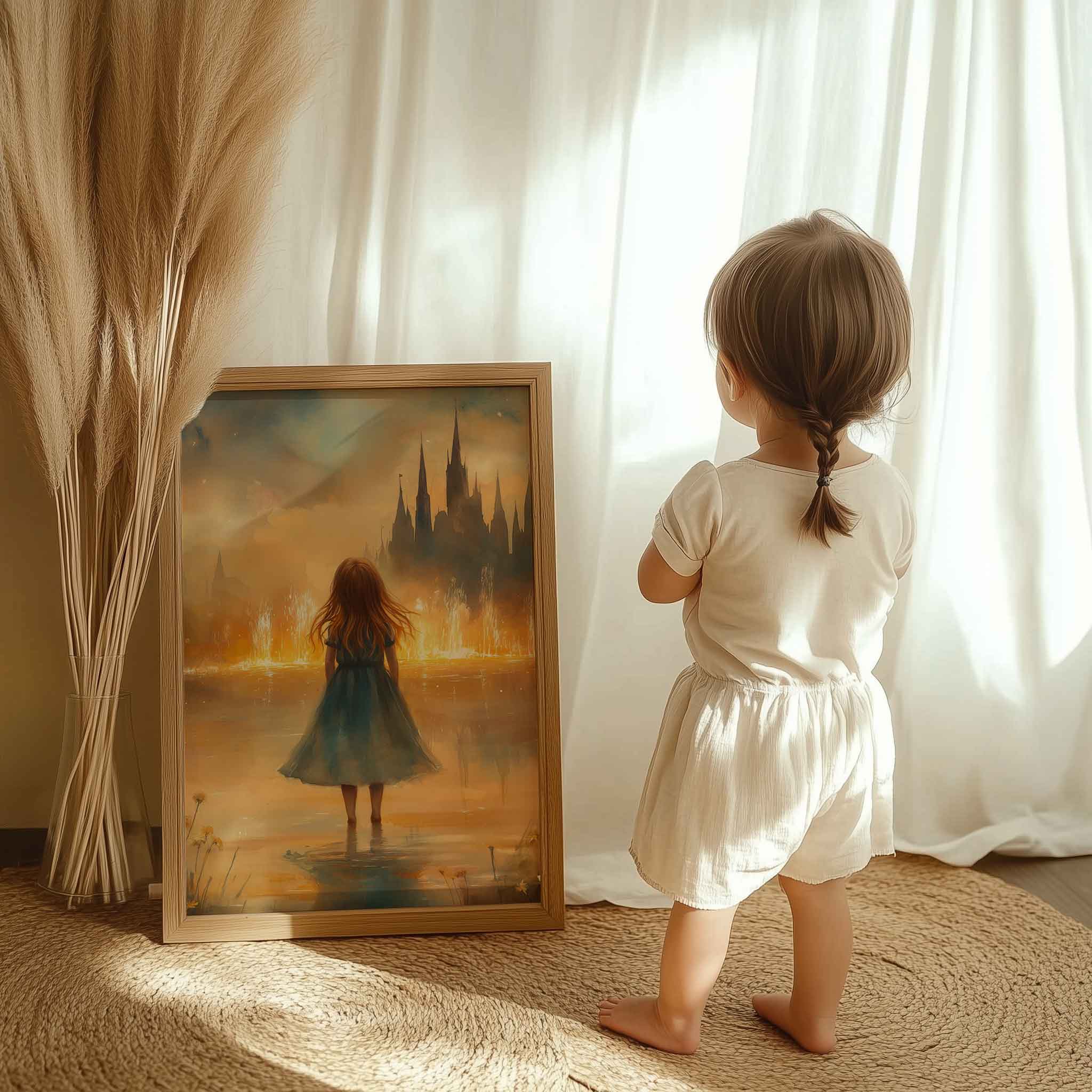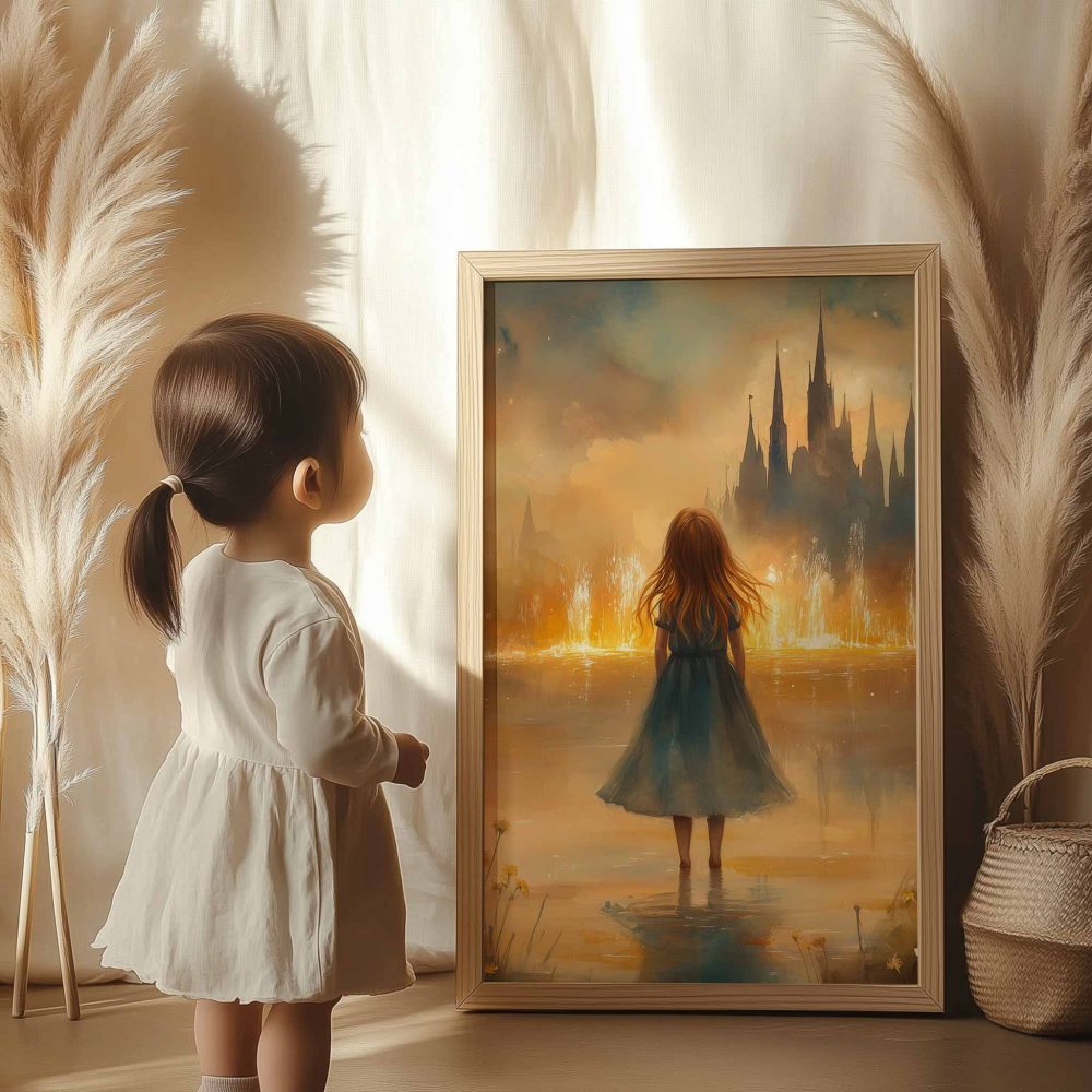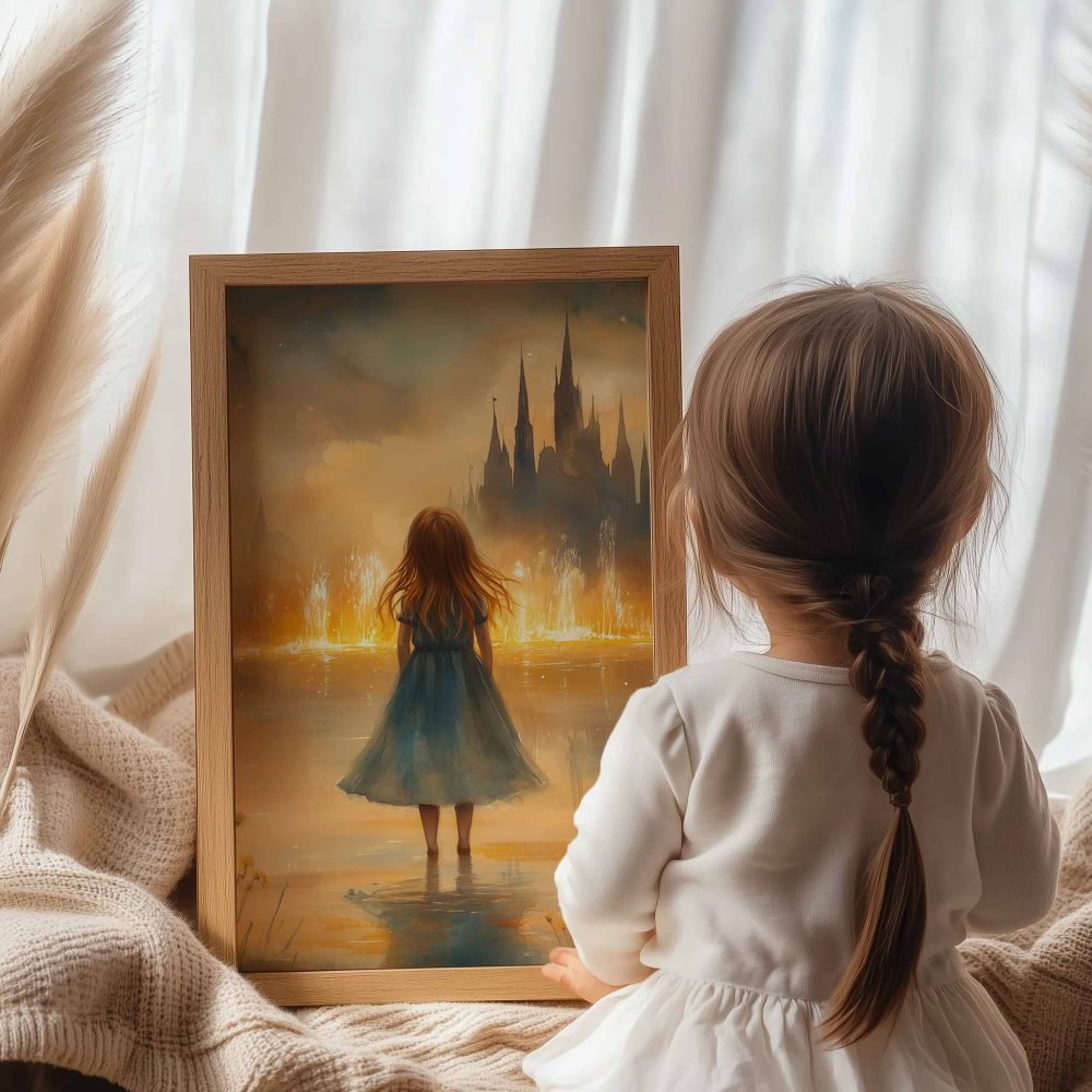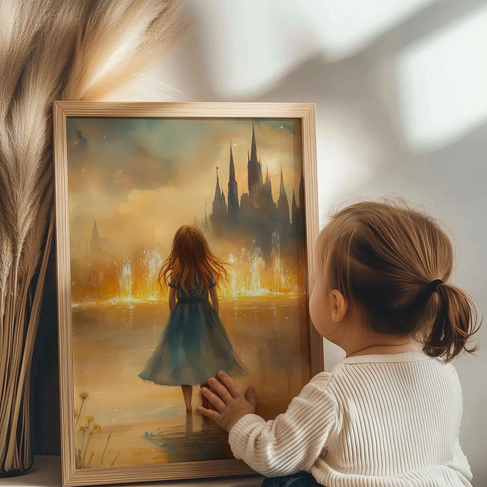 Terug naar collectie / Kinderkamer posters / Dromerig Meisje bij het Kasteel – Blauwe Jurk en Water