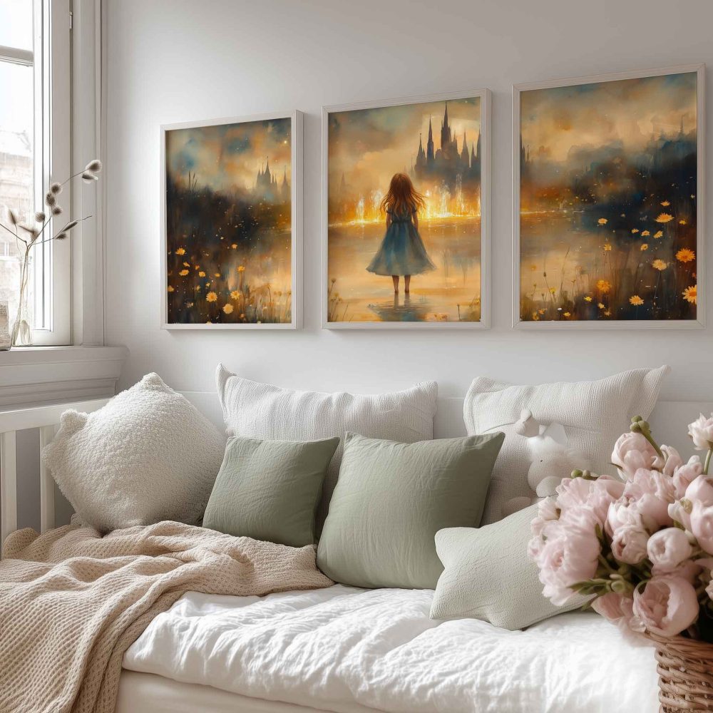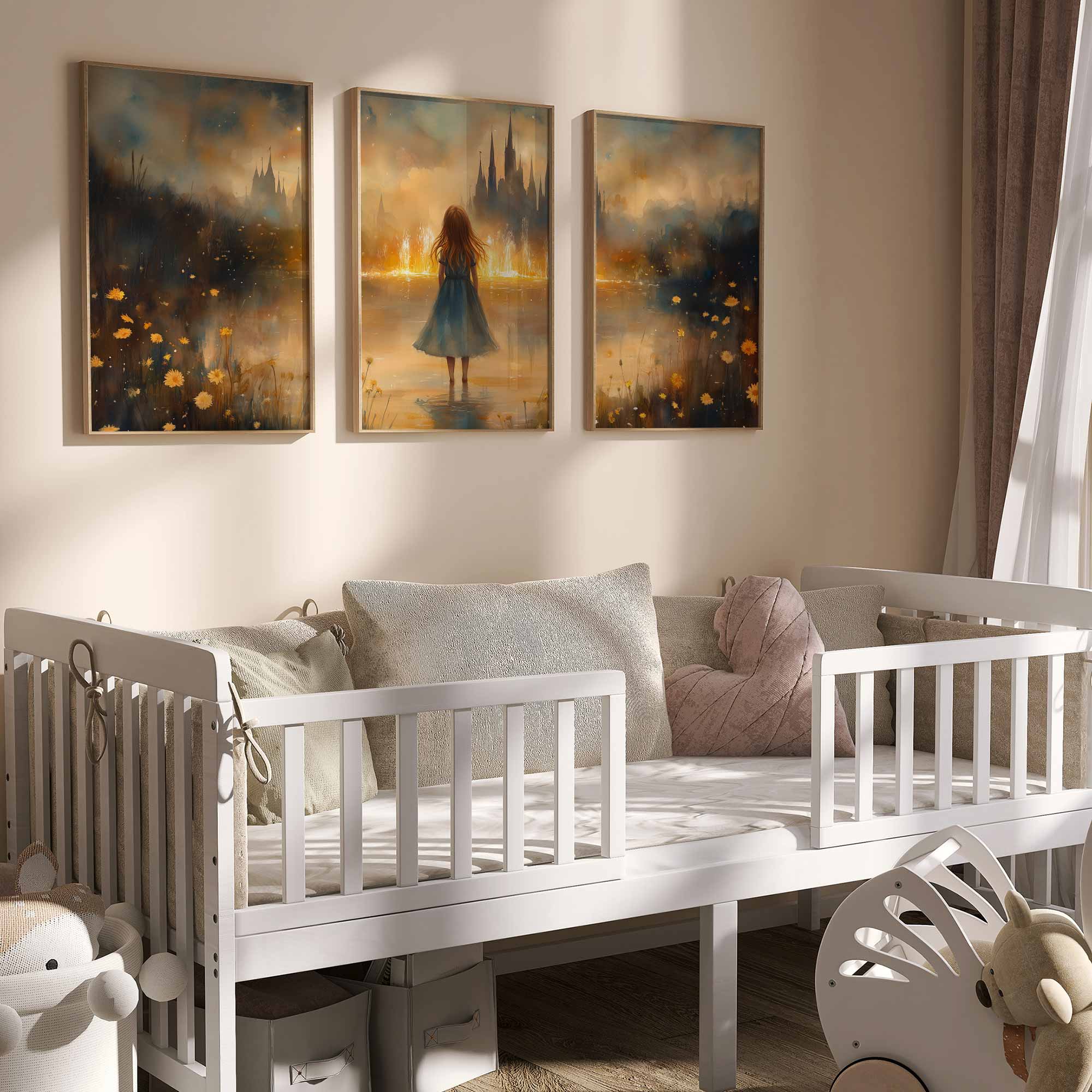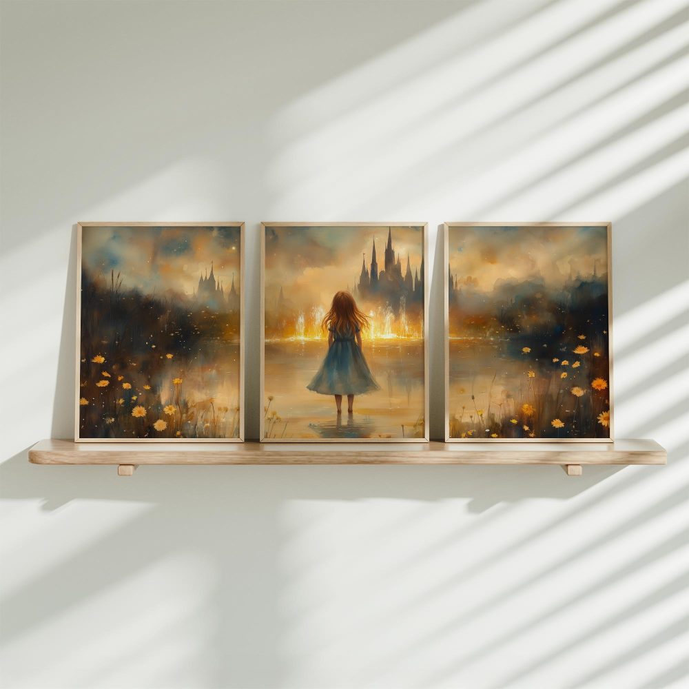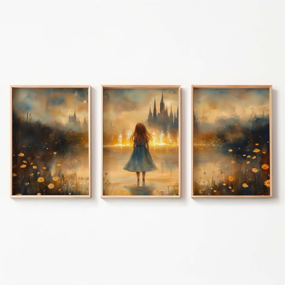 Terug naar collectie / Kinderkamer posters / Dromerig Meisje bij het Kasteel – Blauwe Jurk en Water