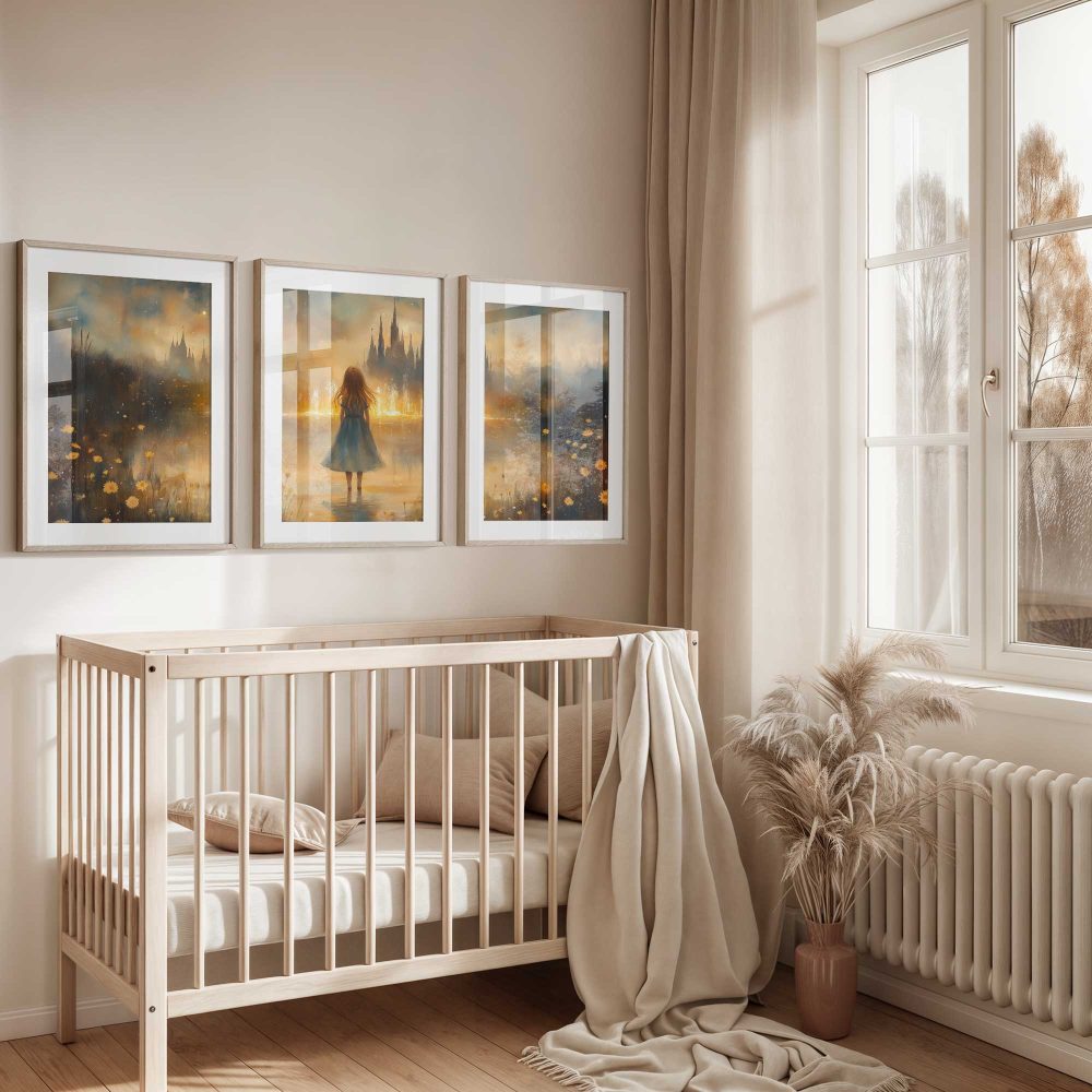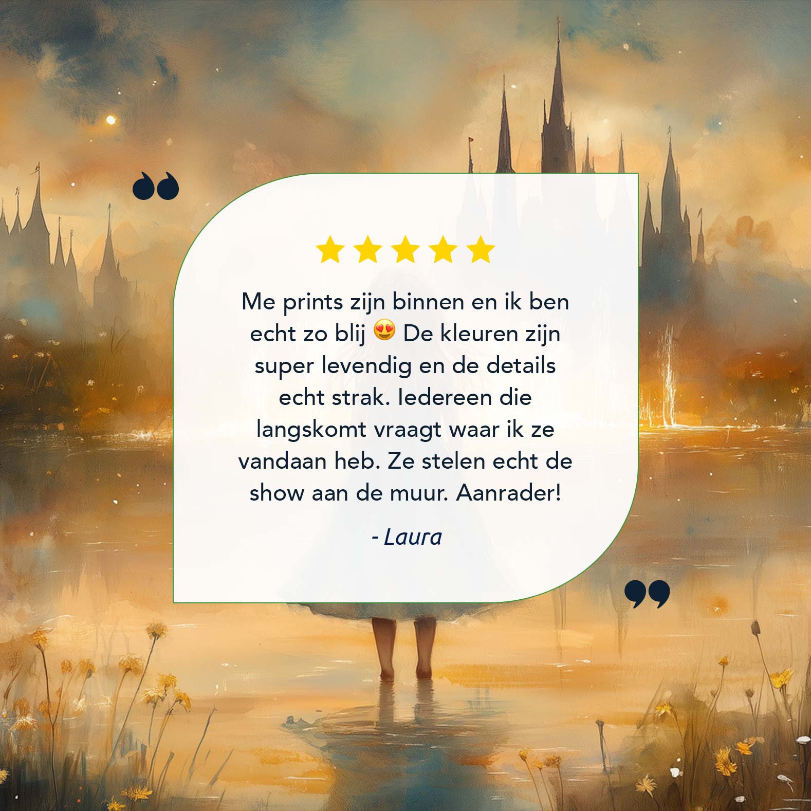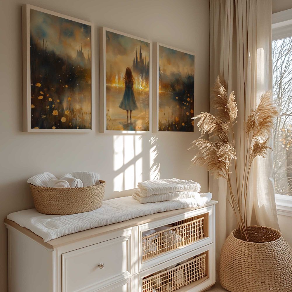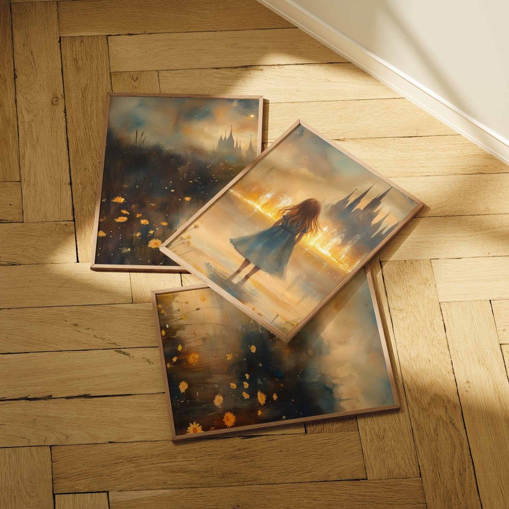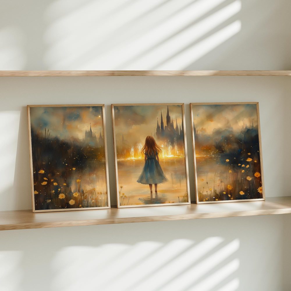 Terug naar collectie / Kinderkamer posters / Dromerig Meisje bij het Kasteel – Blauwe Jurk en Water