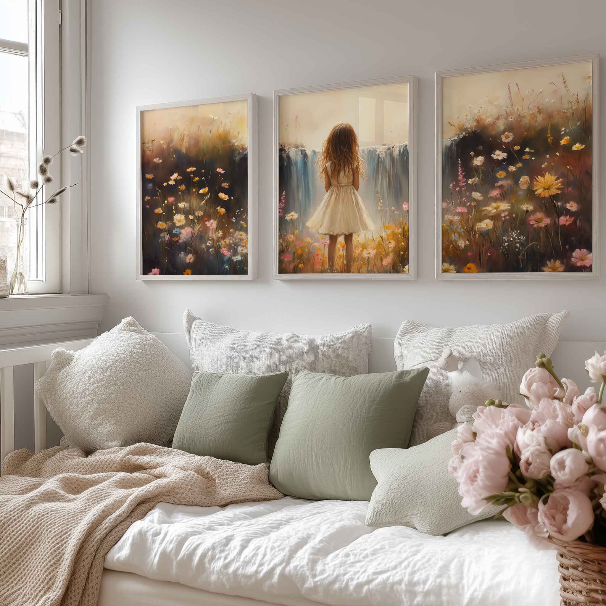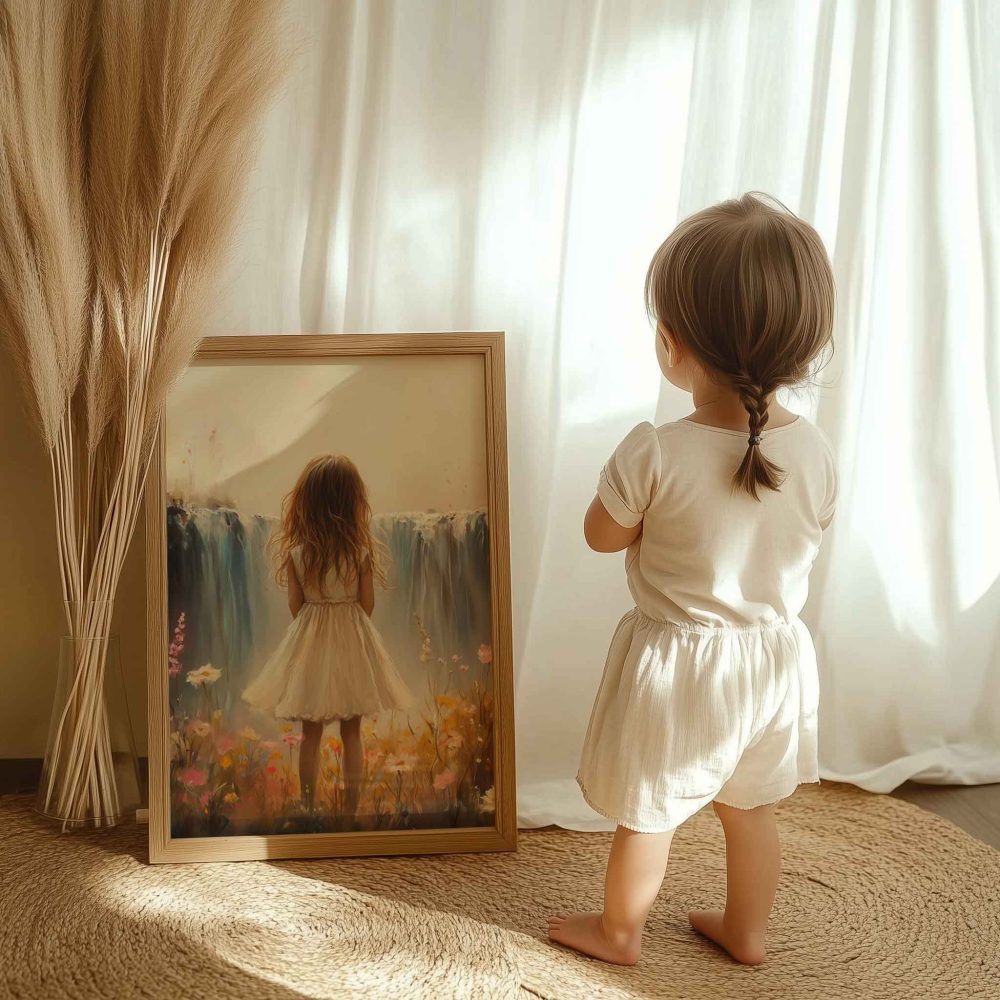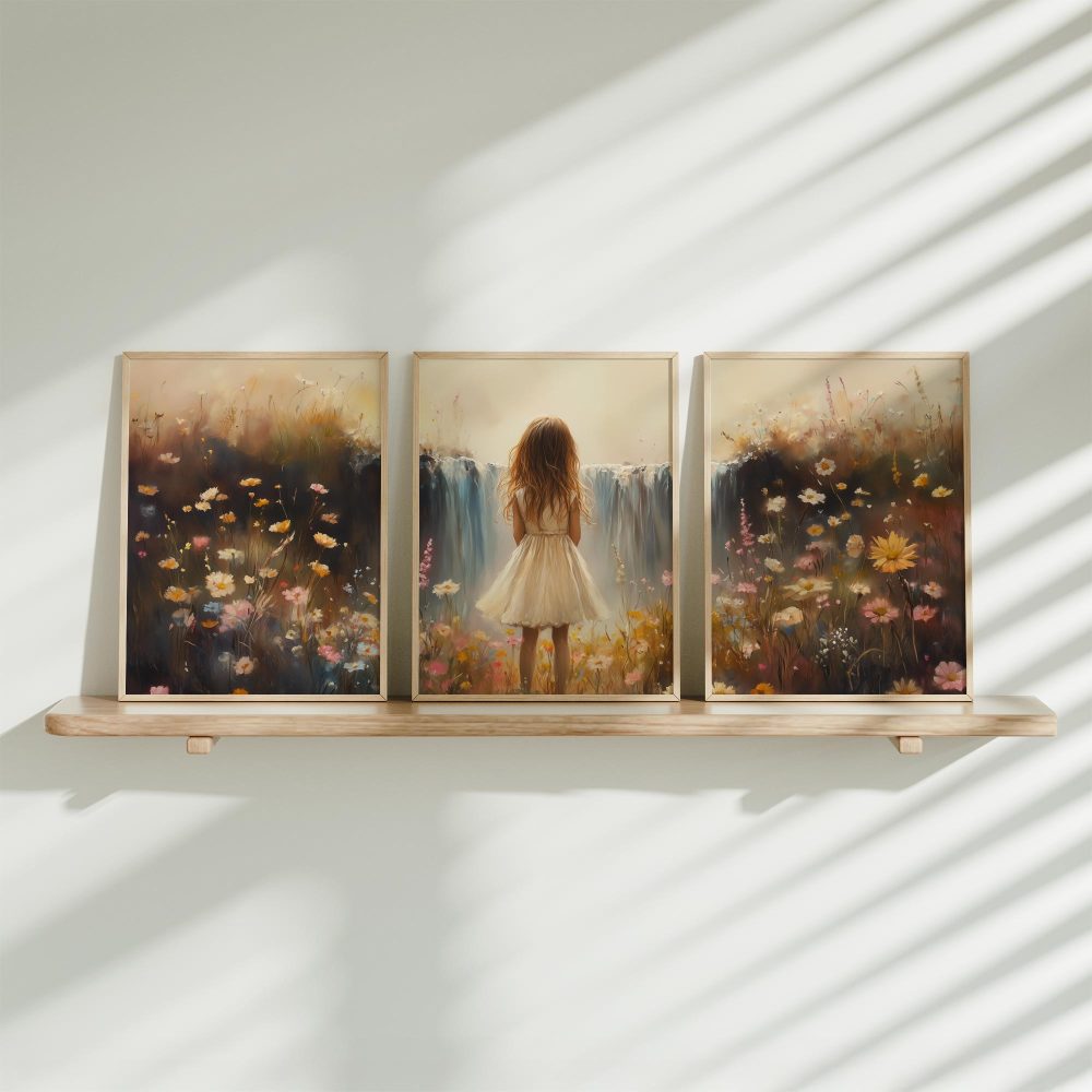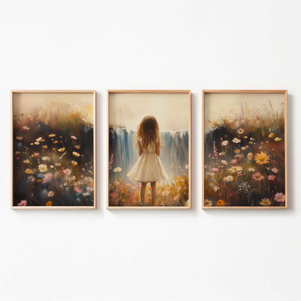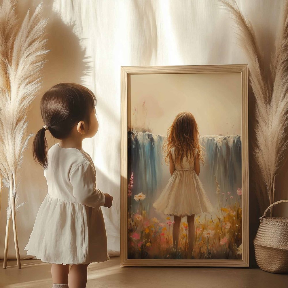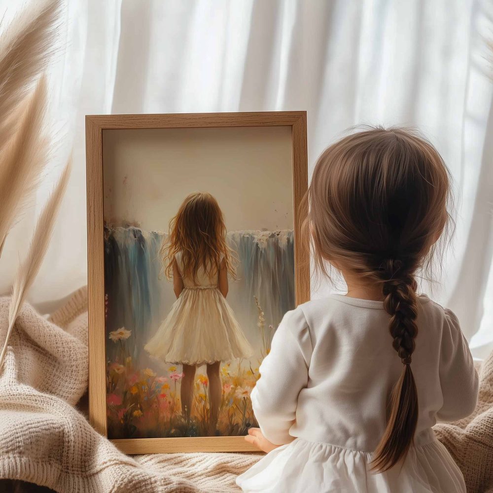 Terug naar collectie / Kinderkamer posters / Bloemen posters / Dromerig Meisje bij Pastel Waterval en Bloemenveld