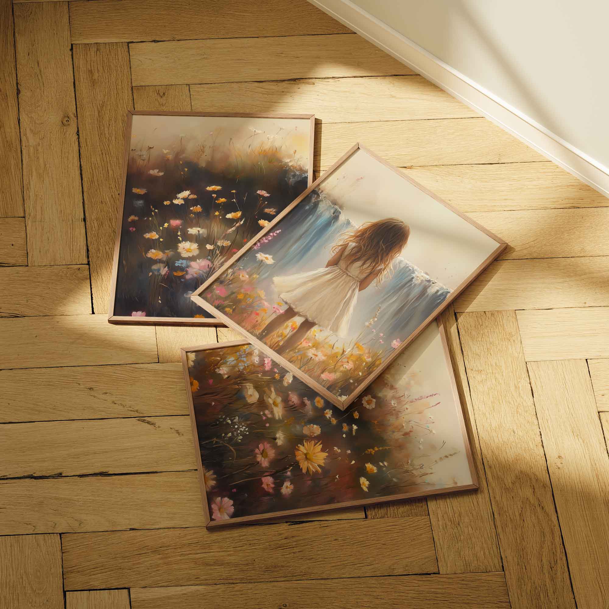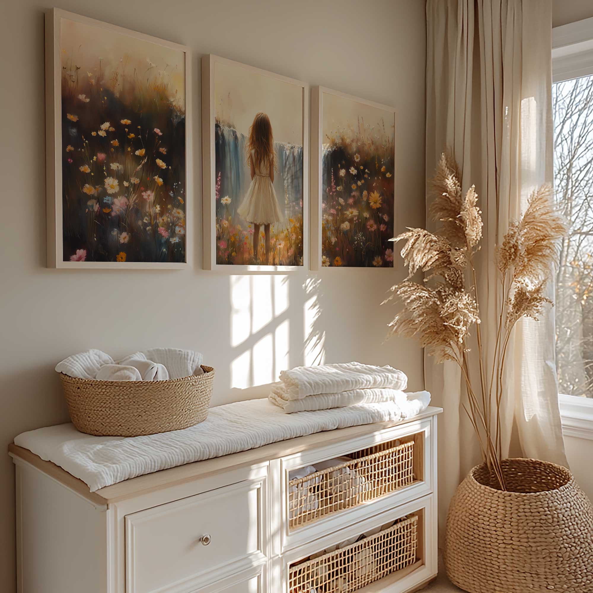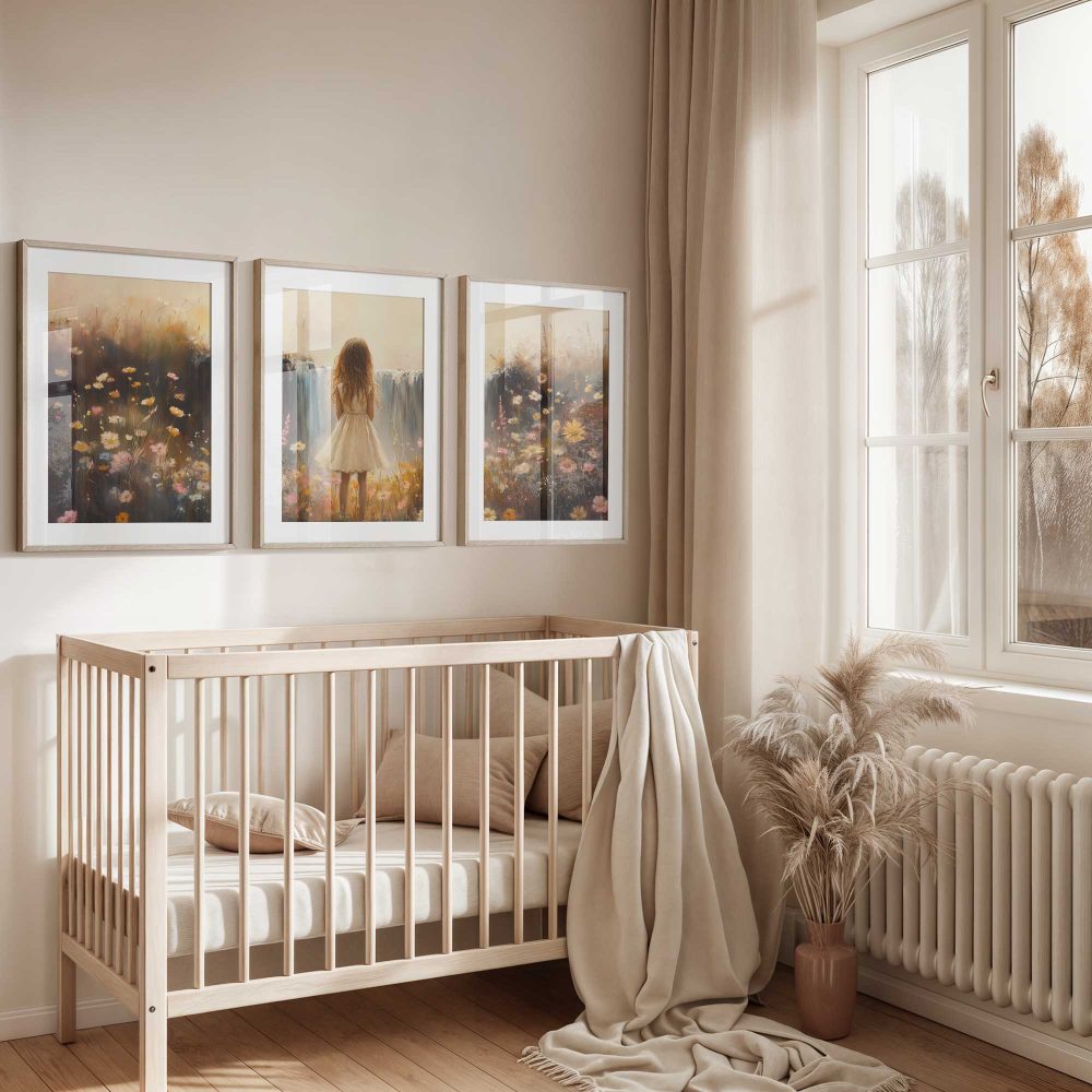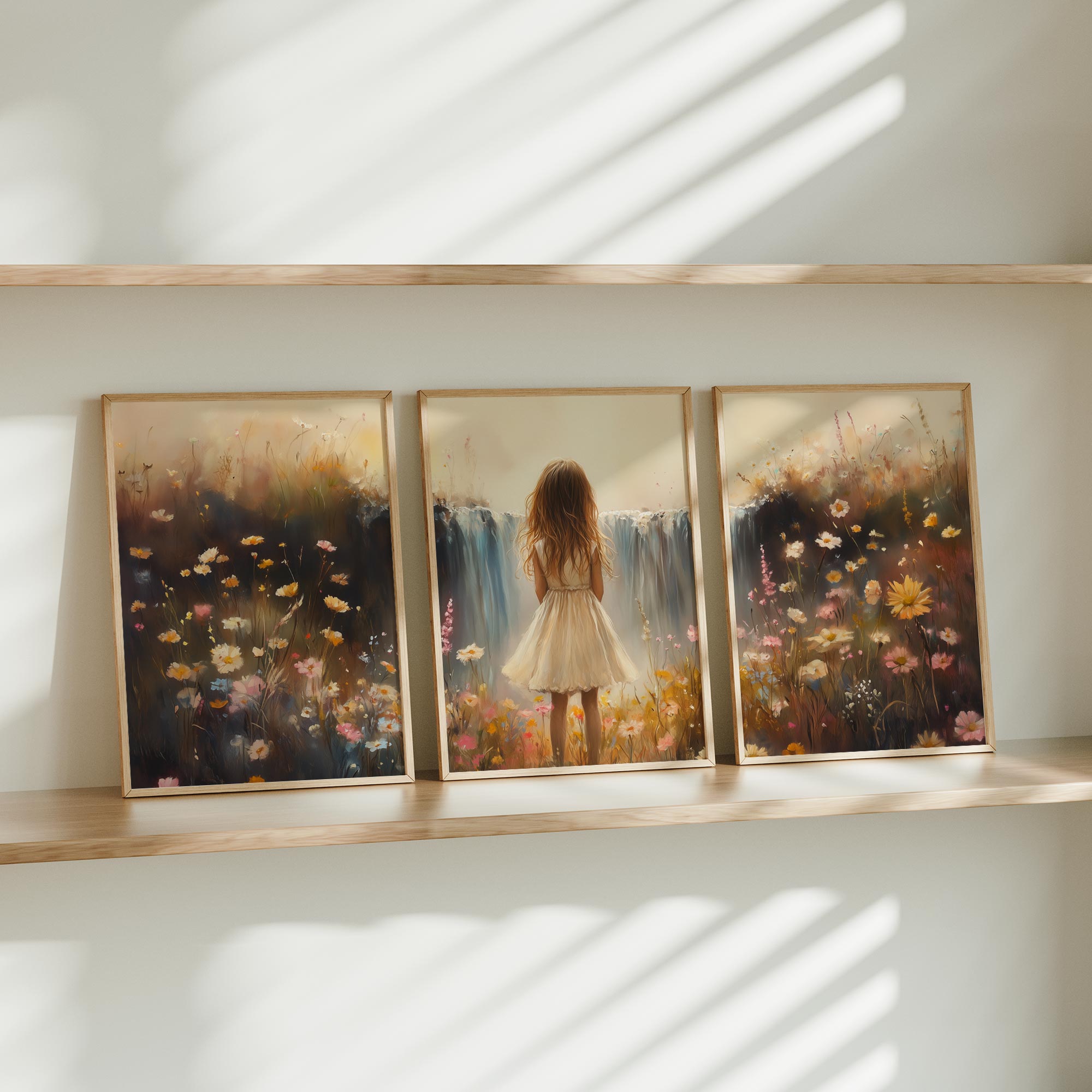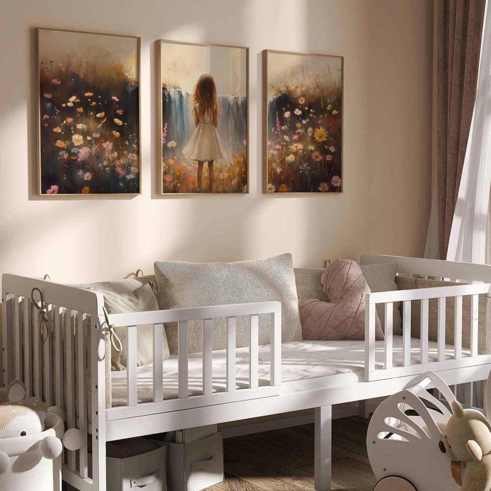 Terug naar collectie / Kinderkamer posters / Bloemen posters / Dromerig Meisje bij Pastel Waterval en Bloemenveld