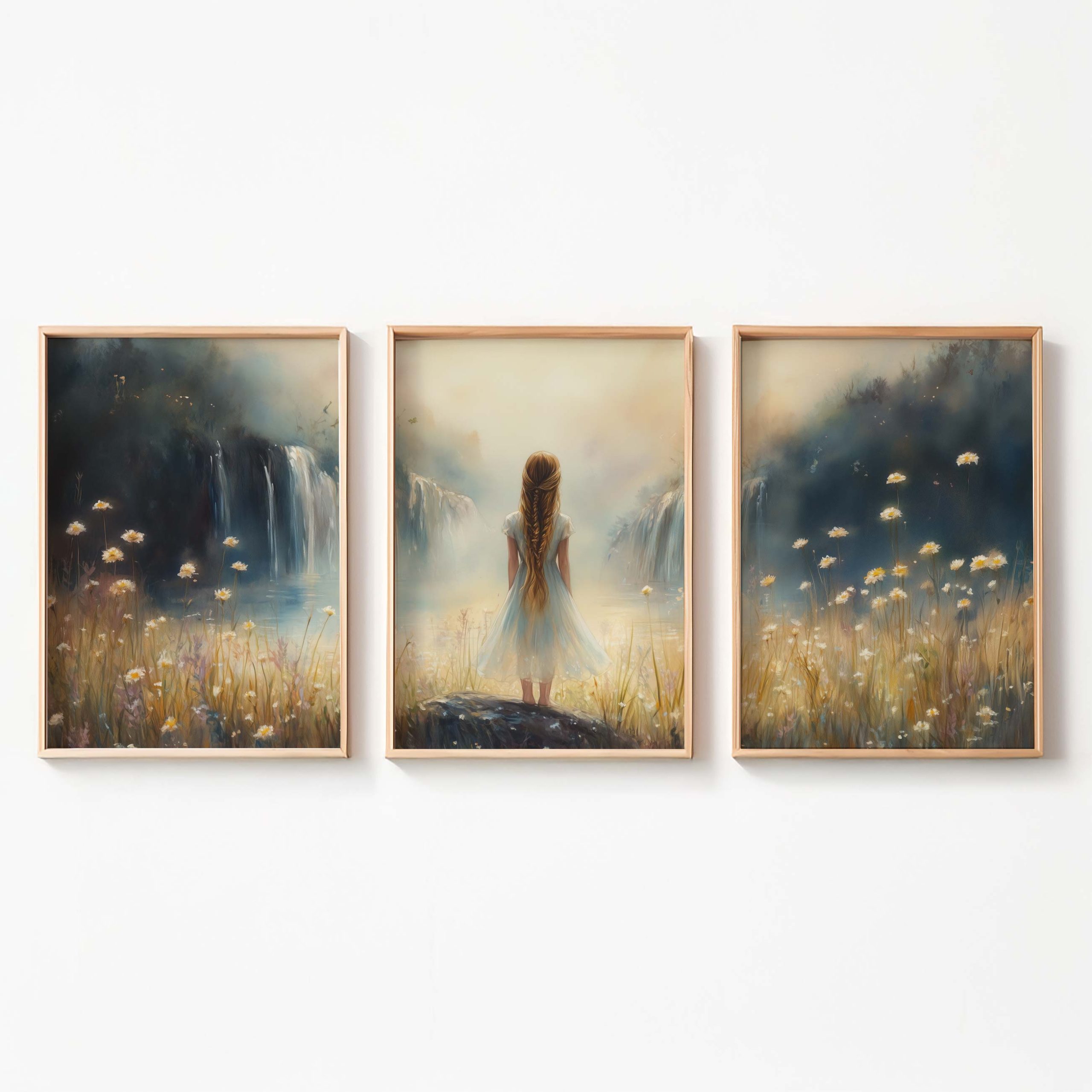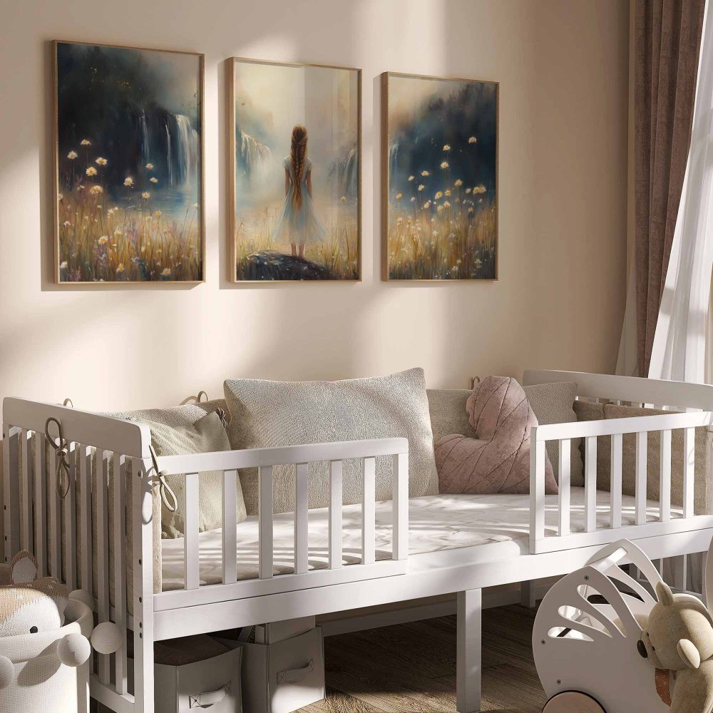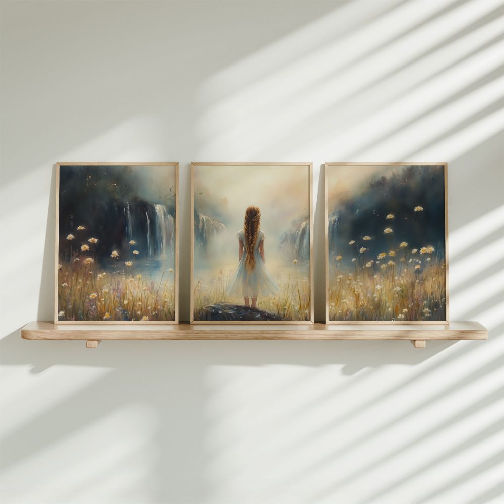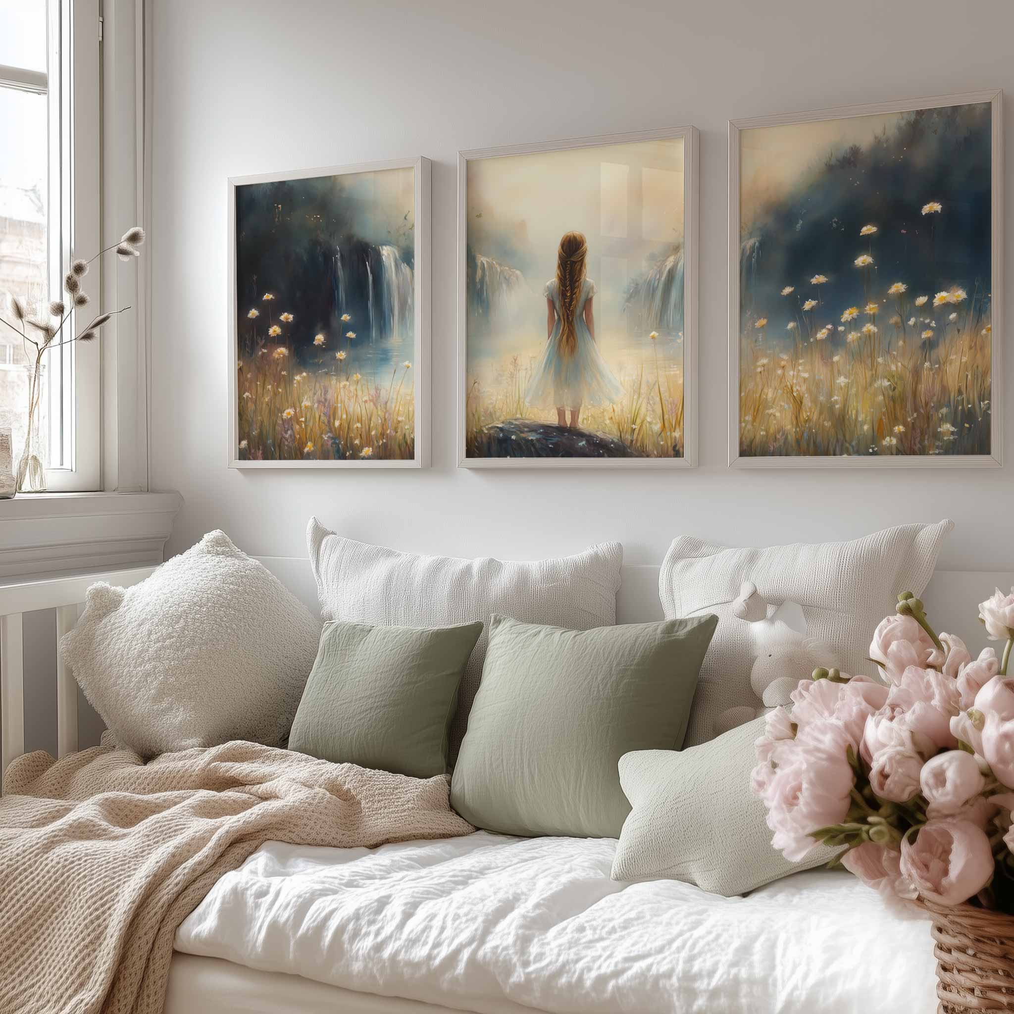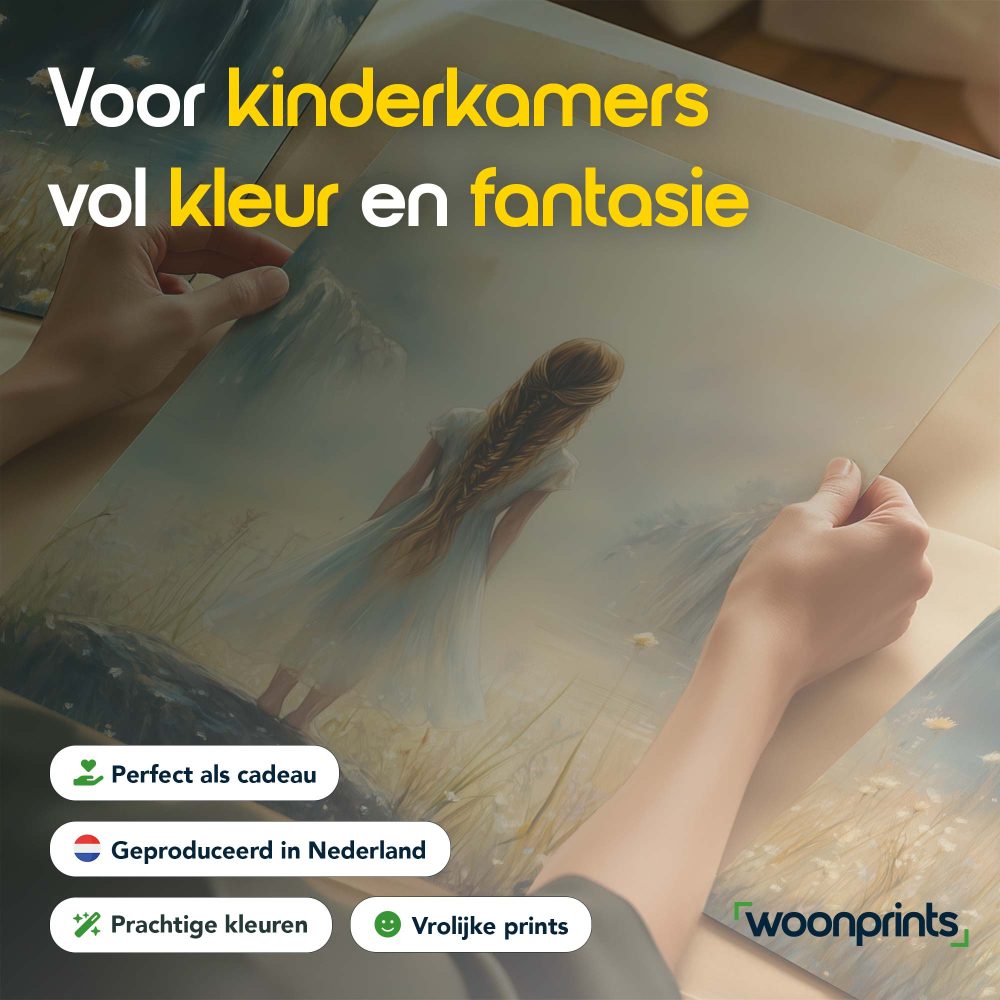 Terug naar collectie / Kinderkamer posters / Bloemen posters / Dromerig Meisje bij Waterval en Bloemenveld