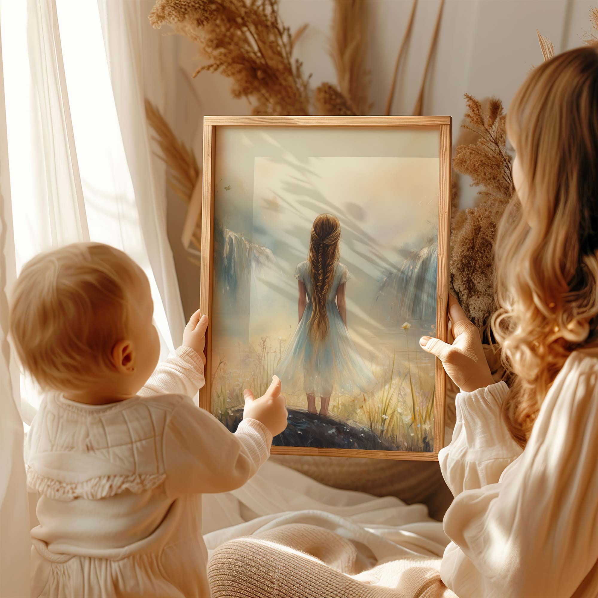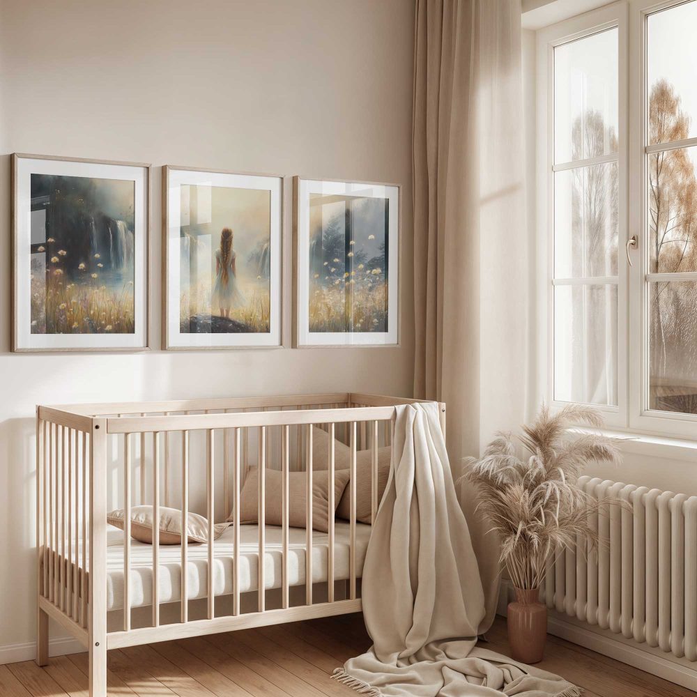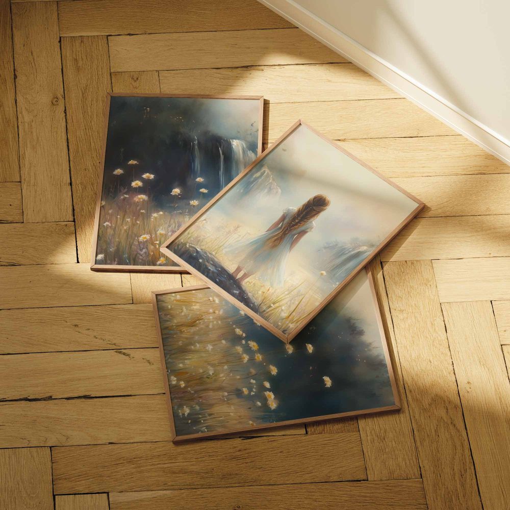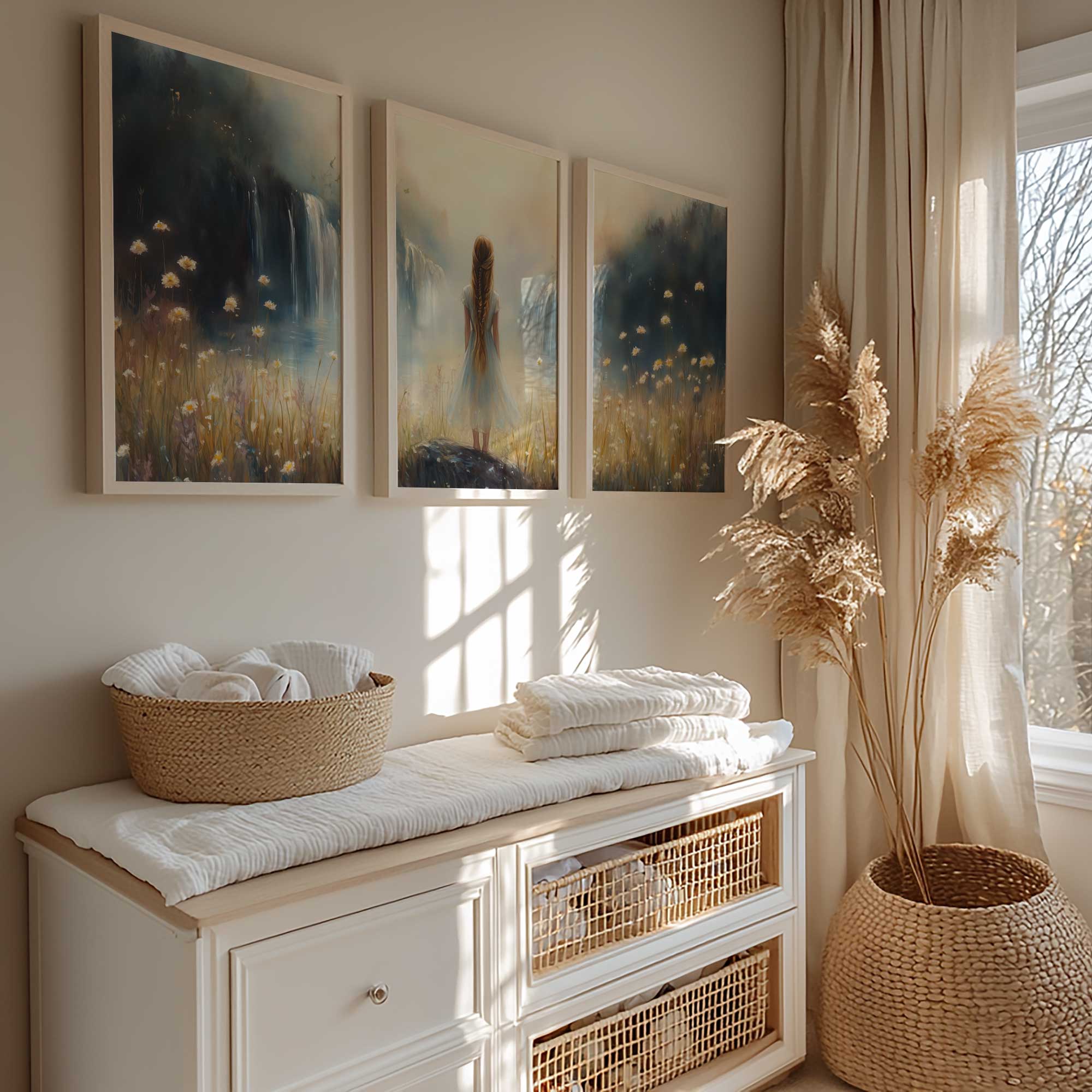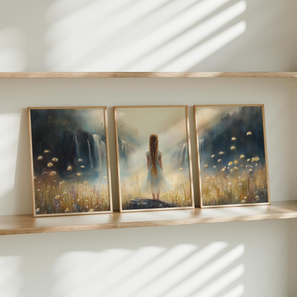 Terug naar collectie / Kinderkamer posters / Bloemen posters / Dromerig Meisje bij Waterval en Bloemenveld