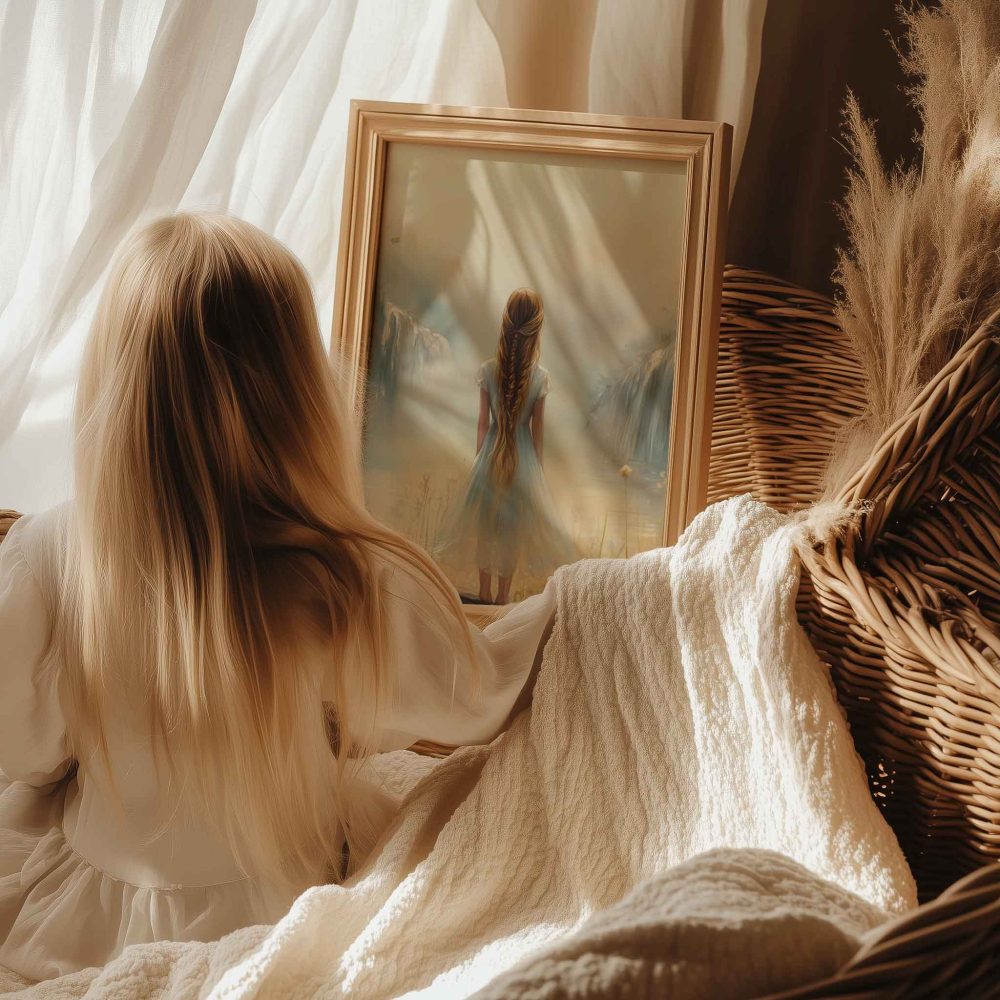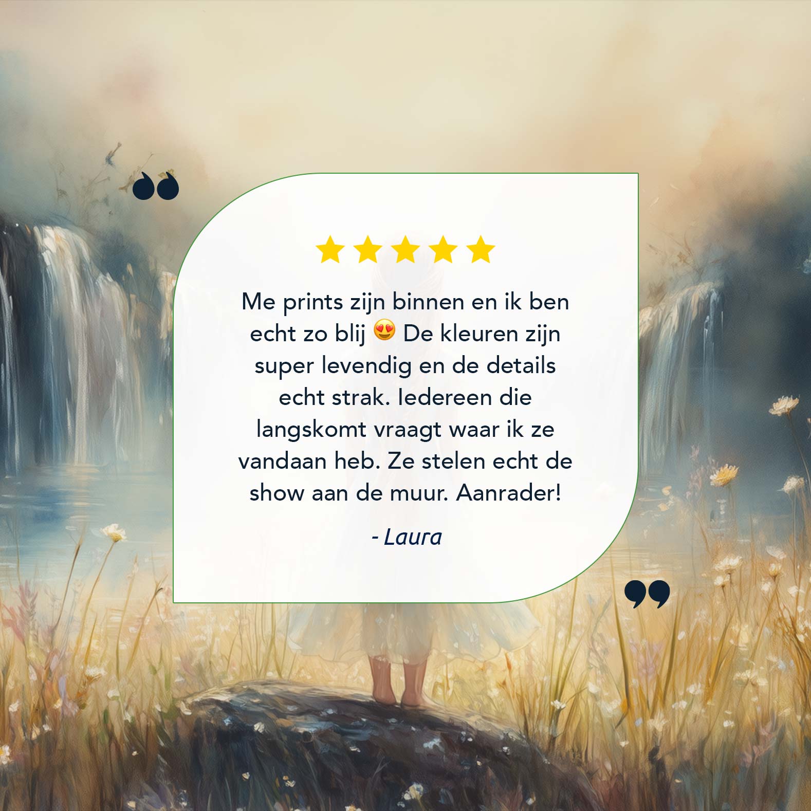 Dromerig Meisje bij Waterval en Bloemenveld