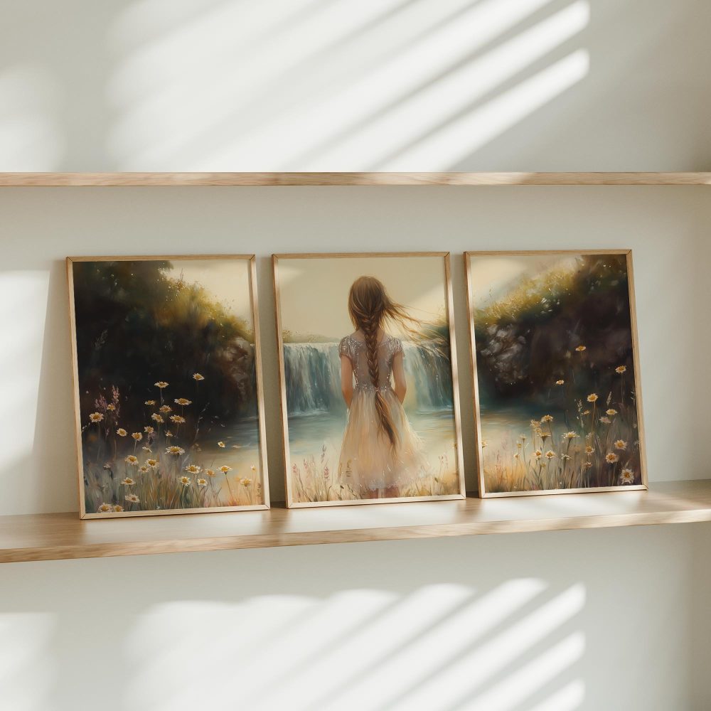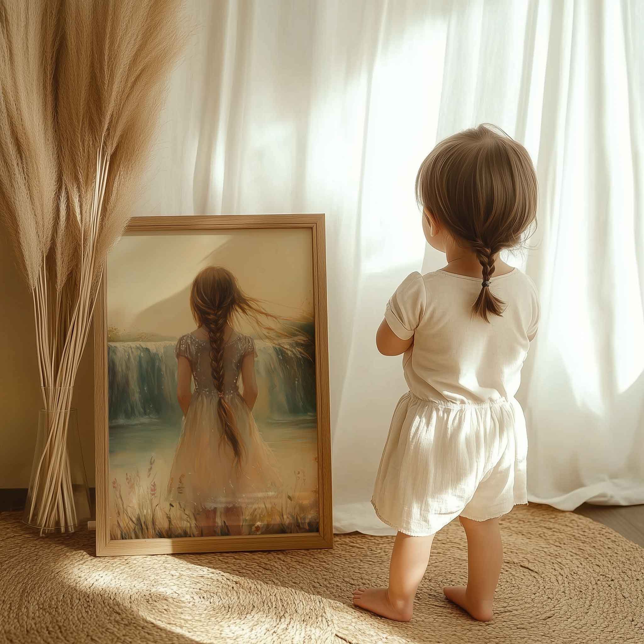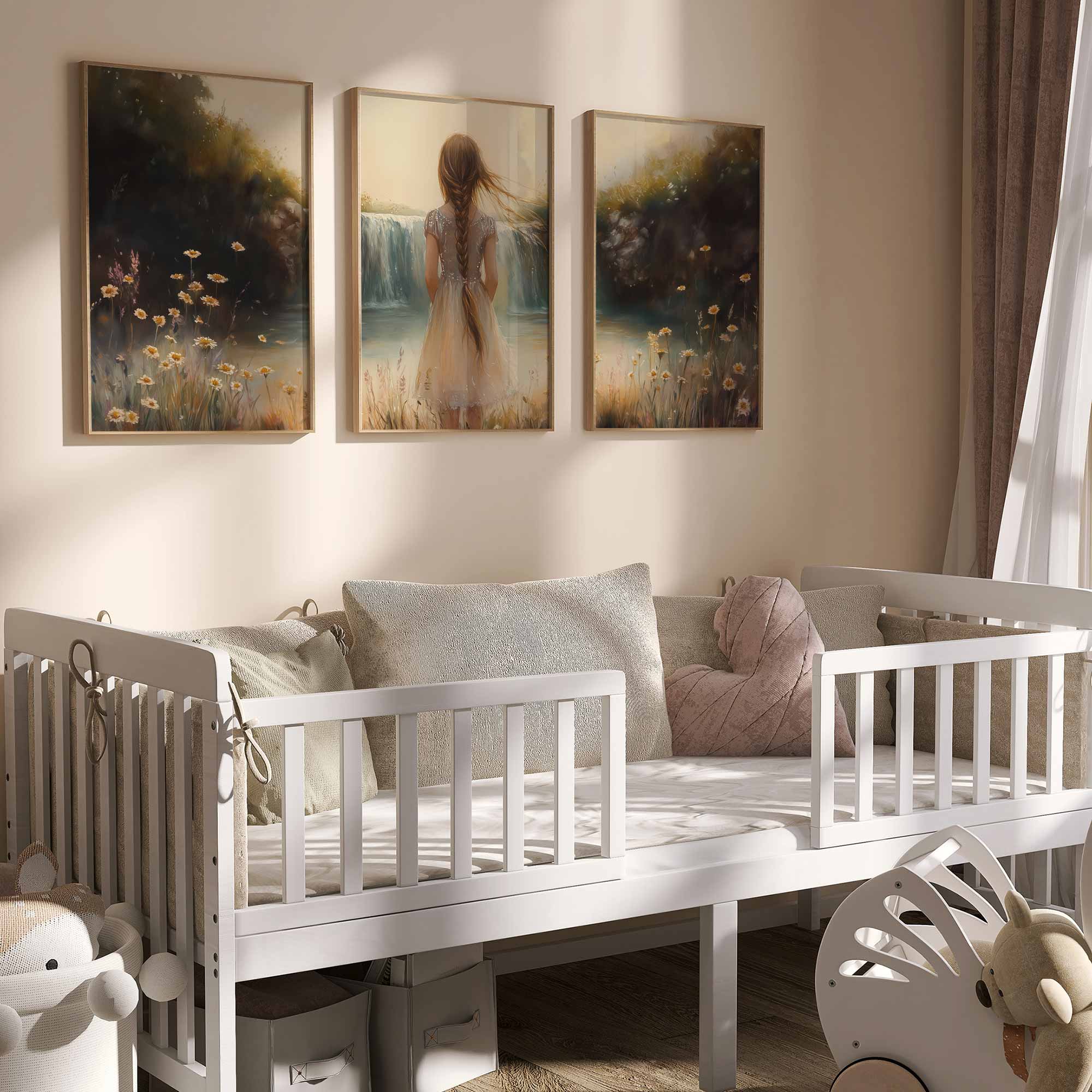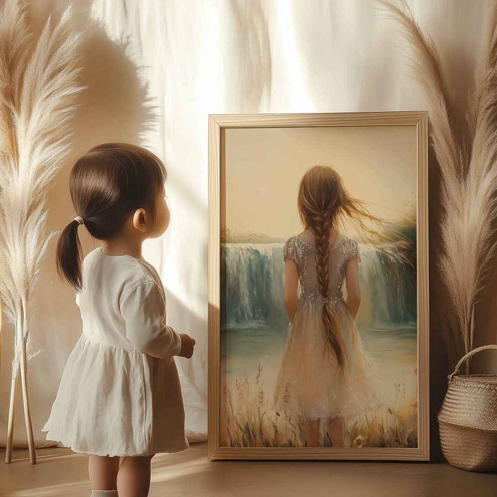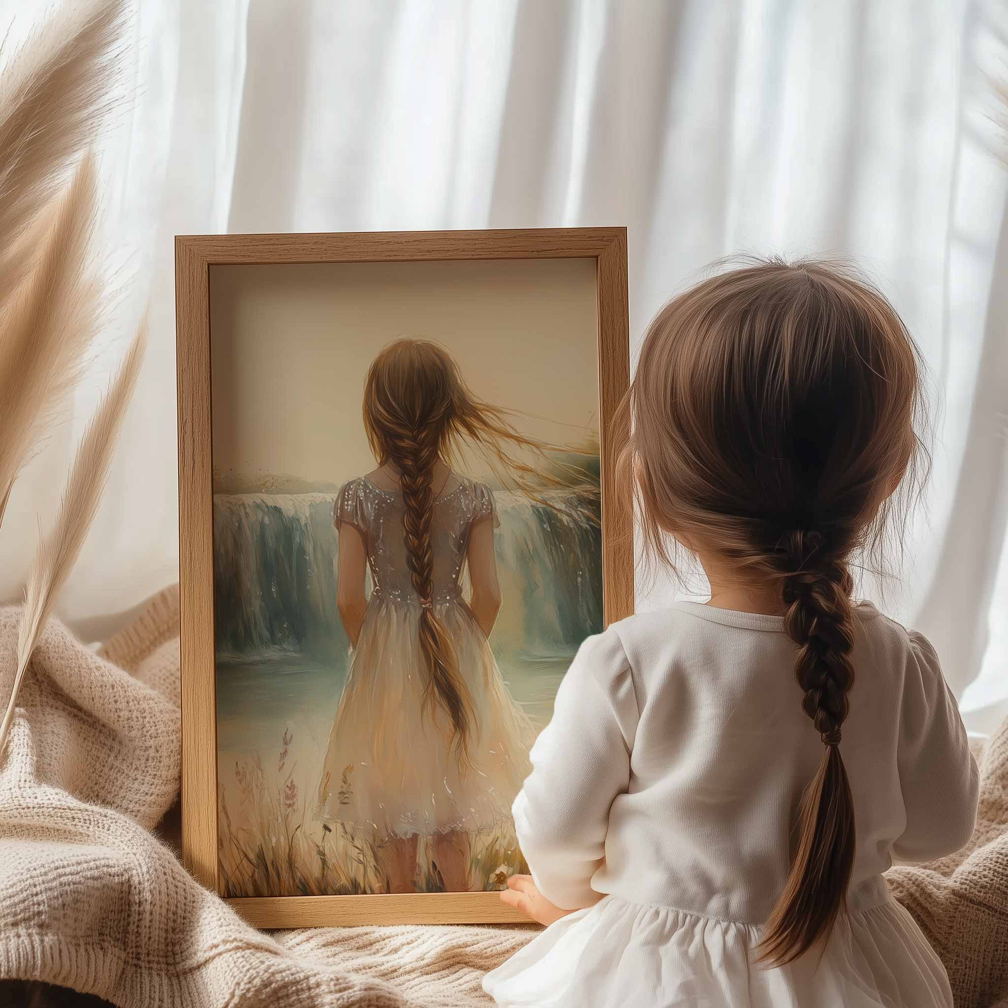 Terug naar collectie / Kinderkamer posters / Bloemen posters / Dromerig Meisje bij Waterval in Pastelkleuren
