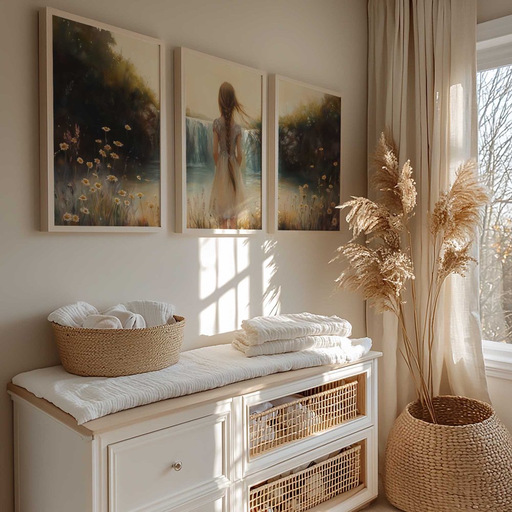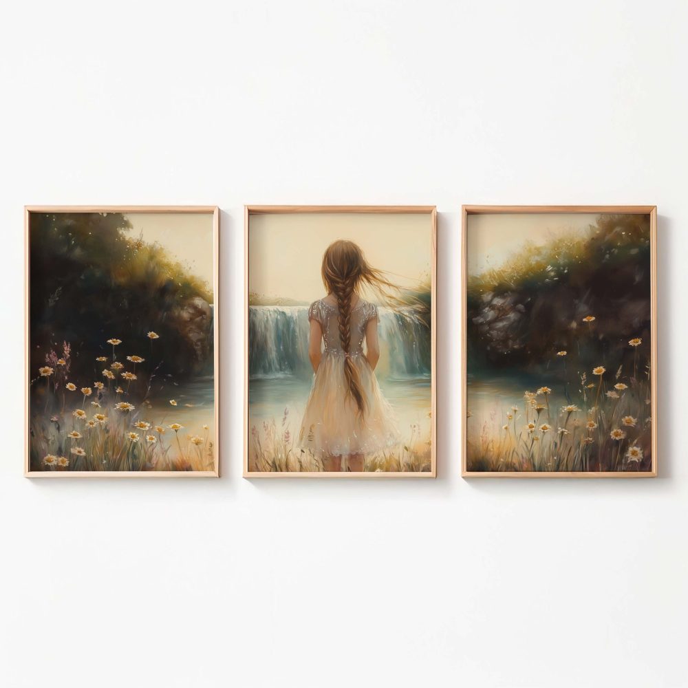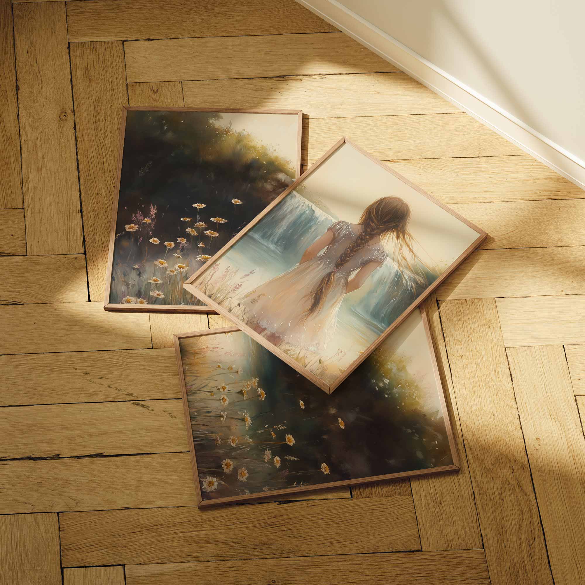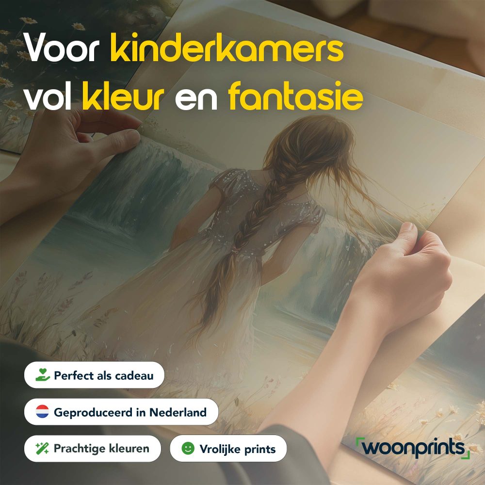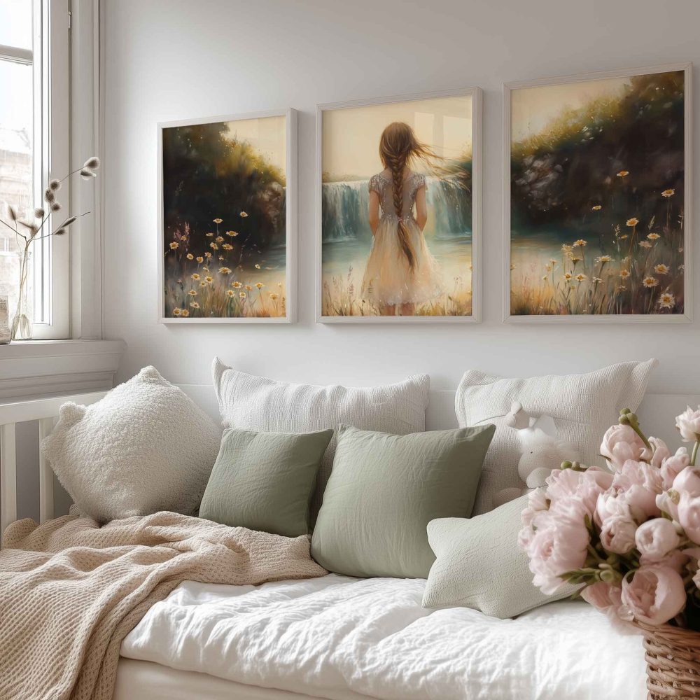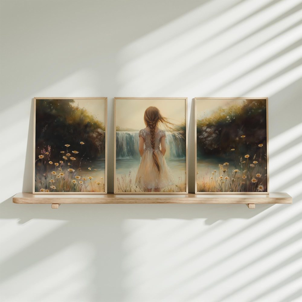 Terug naar collectie / Kinderkamer posters / Bloemen posters / Dromerig Meisje bij Waterval in Pastelkleuren