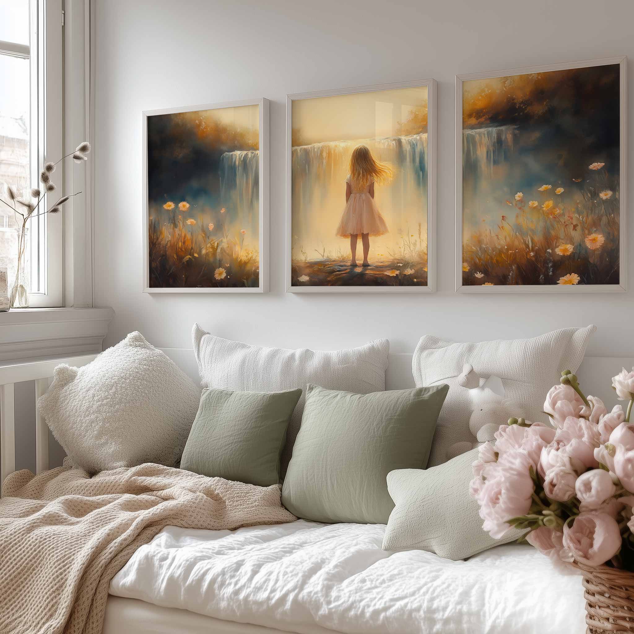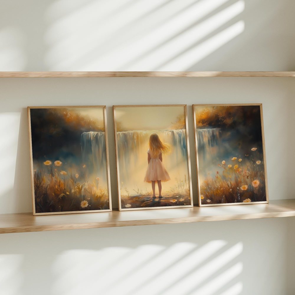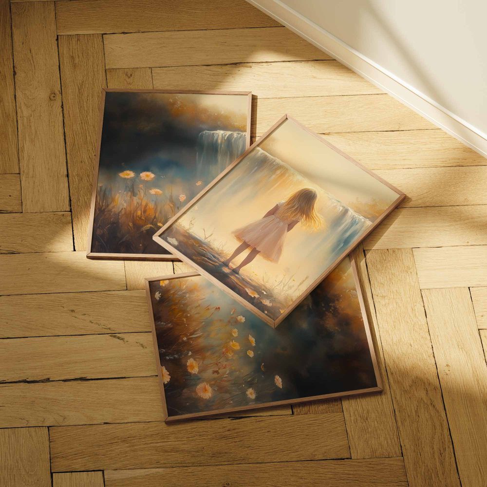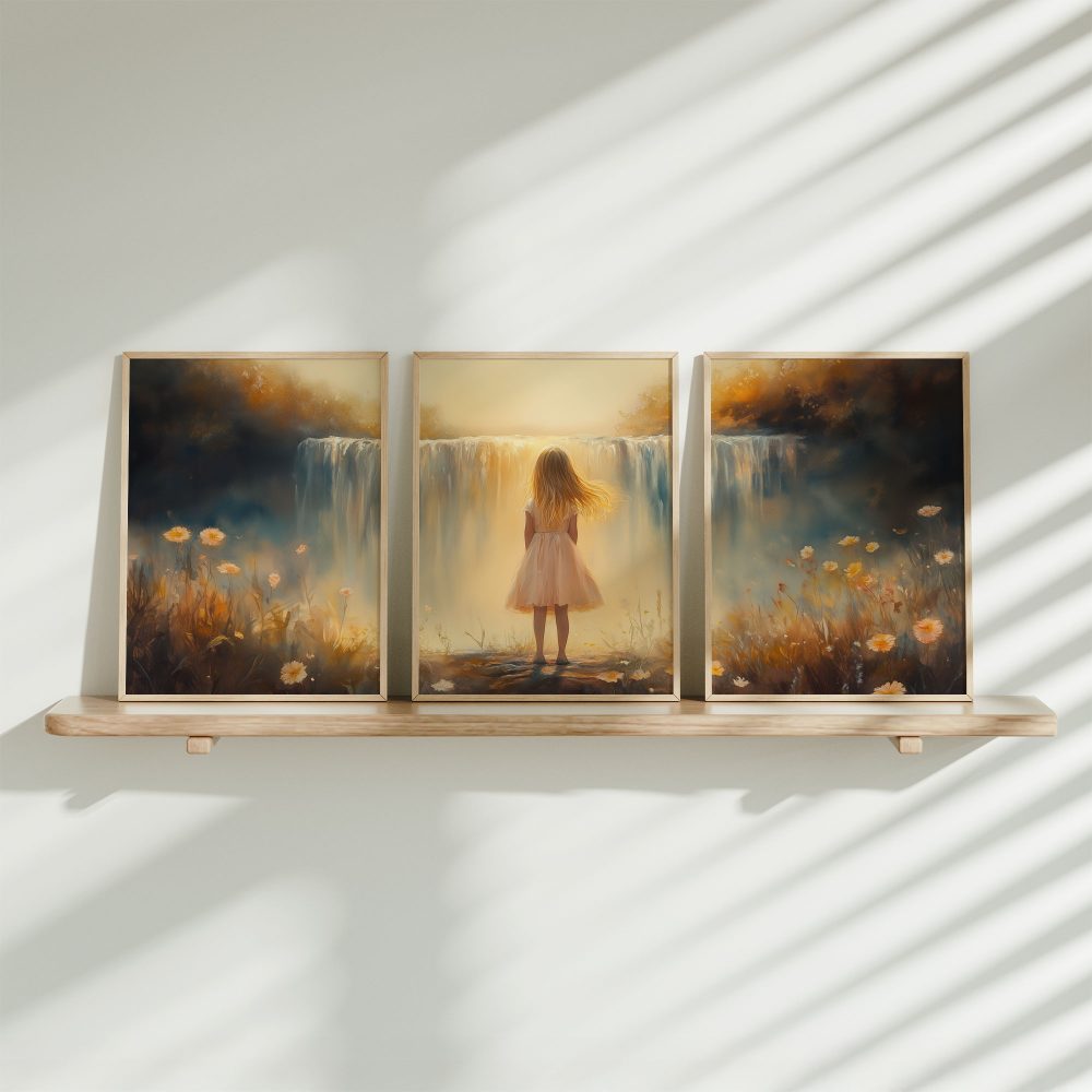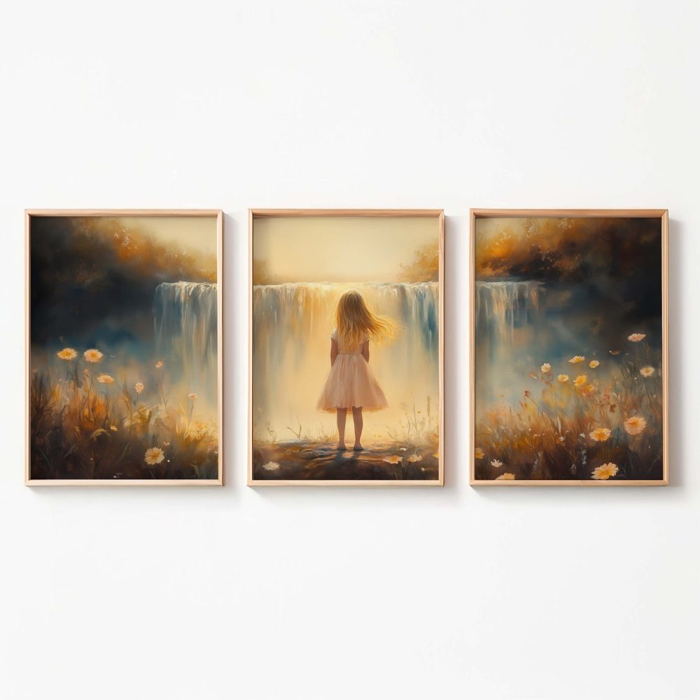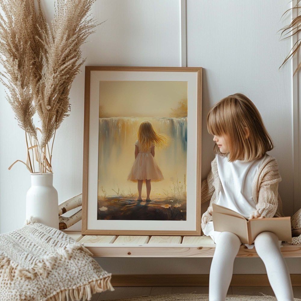 Terug naar collectie / Kinderkamer posters / Bloemen posters / Dromerig Meisje bij Waterval – Pastel Bloemen en Sereniteit